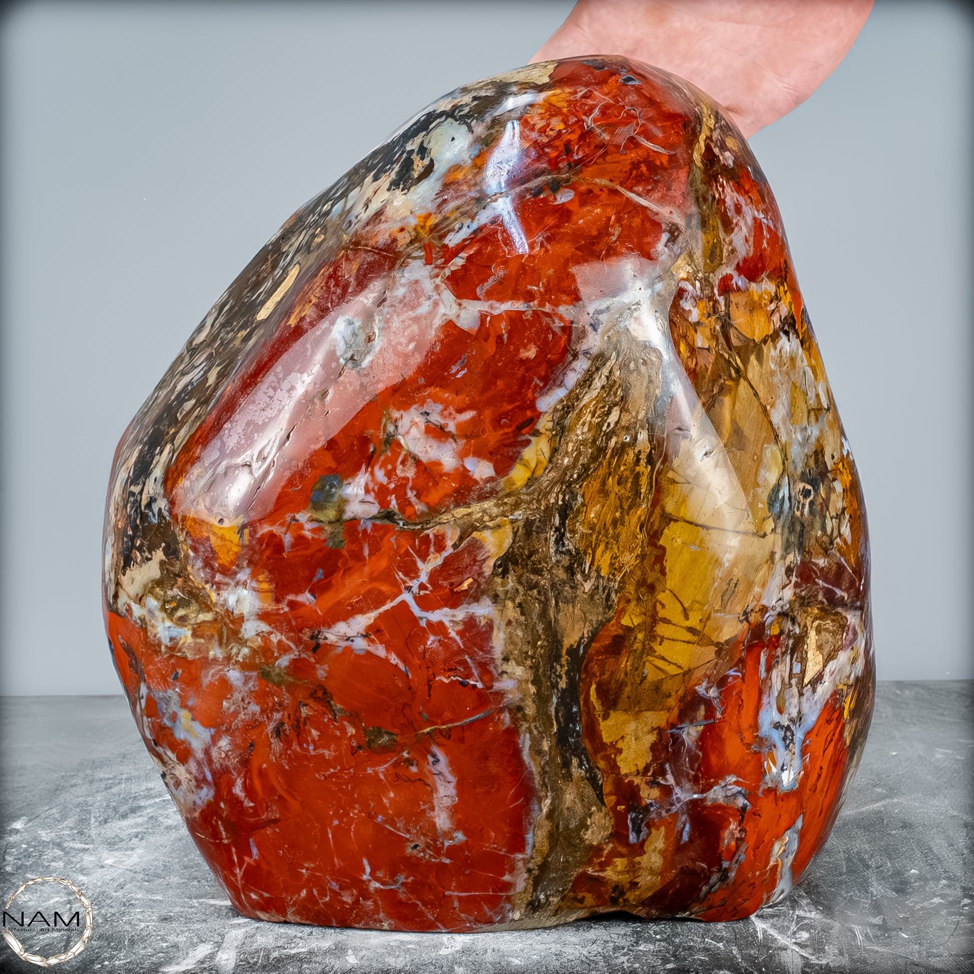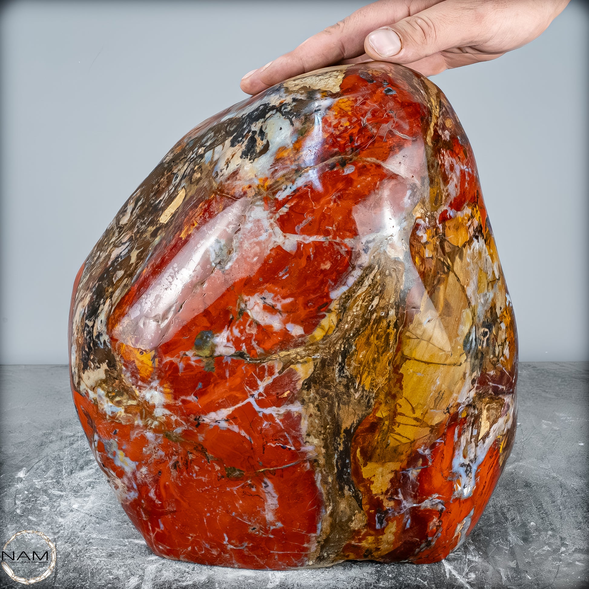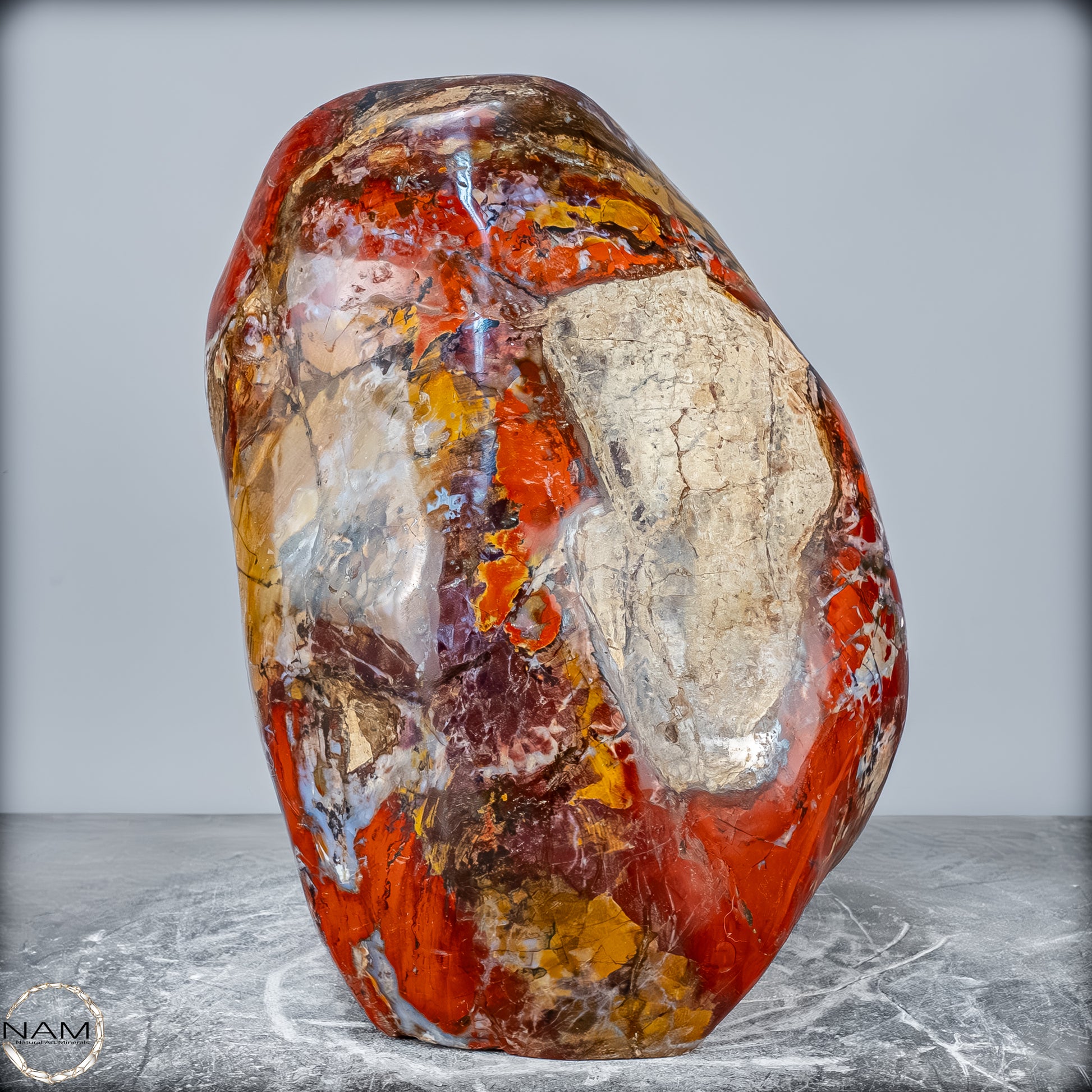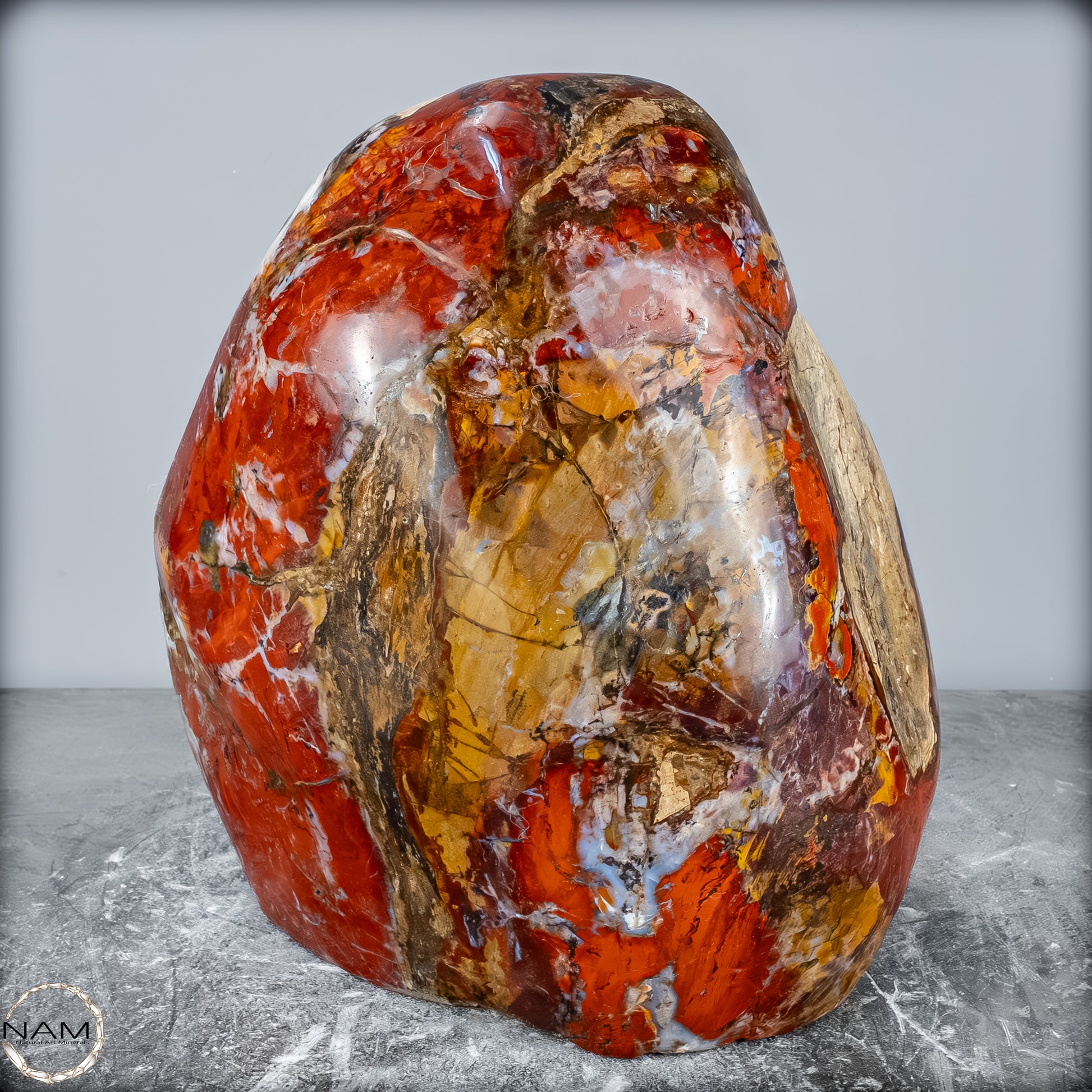 Die polierte Oberfläche bringt das vielschichtige Farbspiel besonders zur Geltung: kräftige Kontraste wechseln sich mit zarten Übergängen ab, wodurch die Freiform aus jedem Blickwinkel neue Details offenbart. Mit ihrem imposanten Gewicht von 28 kg entfaltet sie eine monumentale Präsenz und eignet sich hervorragend als zentrales Dekorationsobjekt.