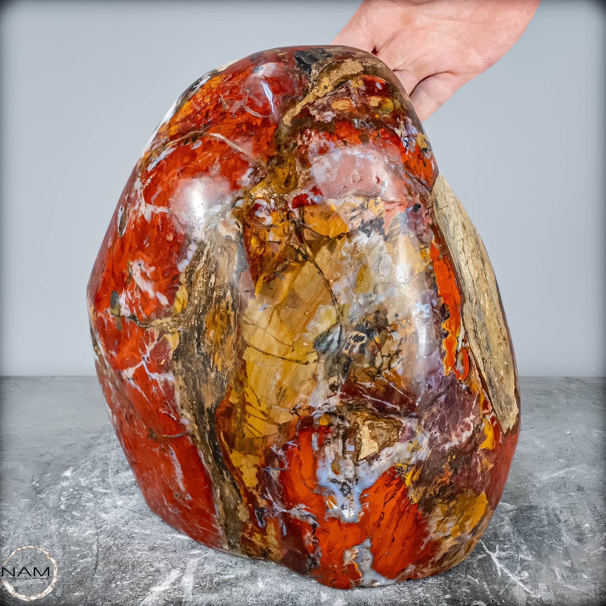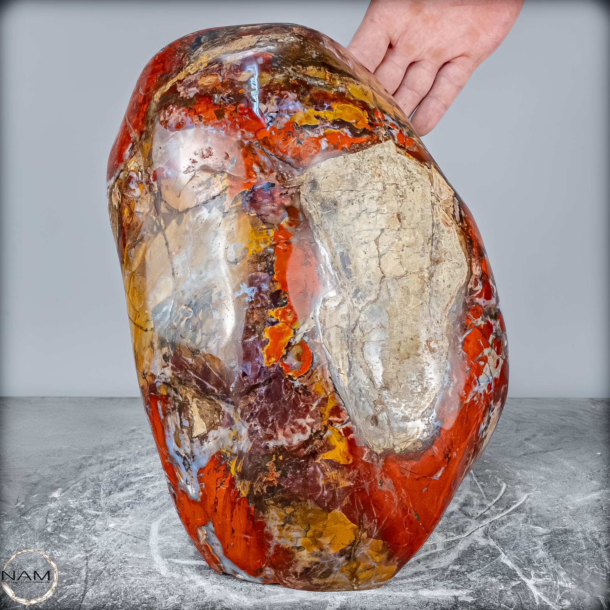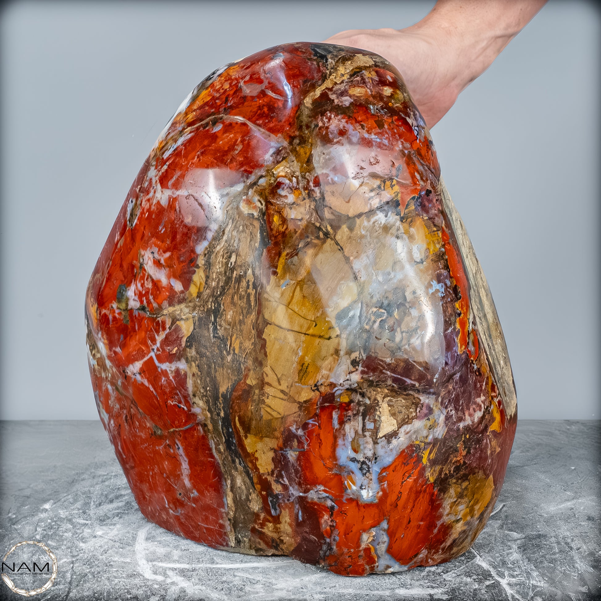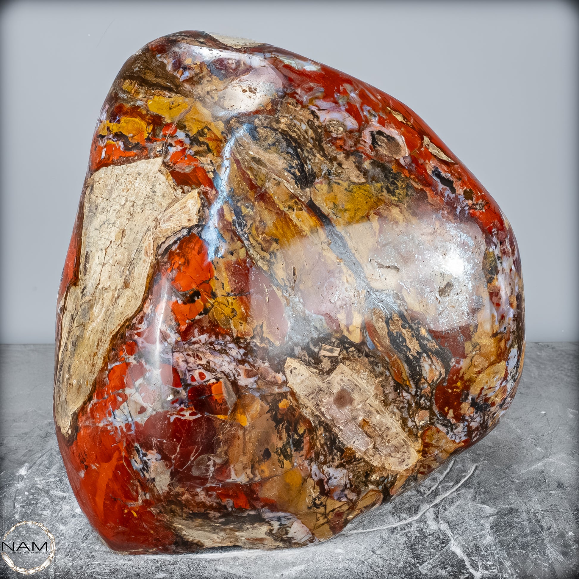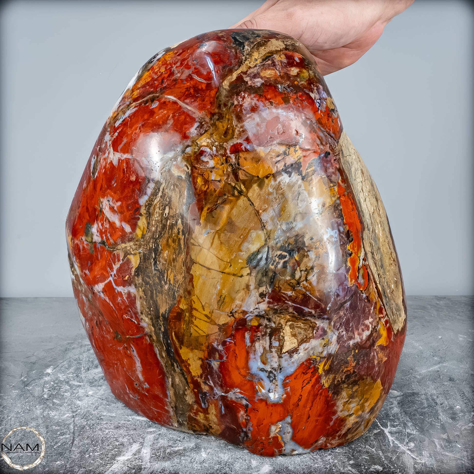 Die polierte Oberfläche bringt das vielschichtige Farbspiel besonders zur Geltung: kräftige Kontraste wechseln sich mit zarten Übergängen ab, wodurch die Freiform aus jedem Blickwinkel neue Details offenbart. Mit ihrem imposanten Gewicht von 28 kg entfaltet sie eine monumentale Präsenz und eignet sich hervorragend als zentrales Dekorationsobjekt.