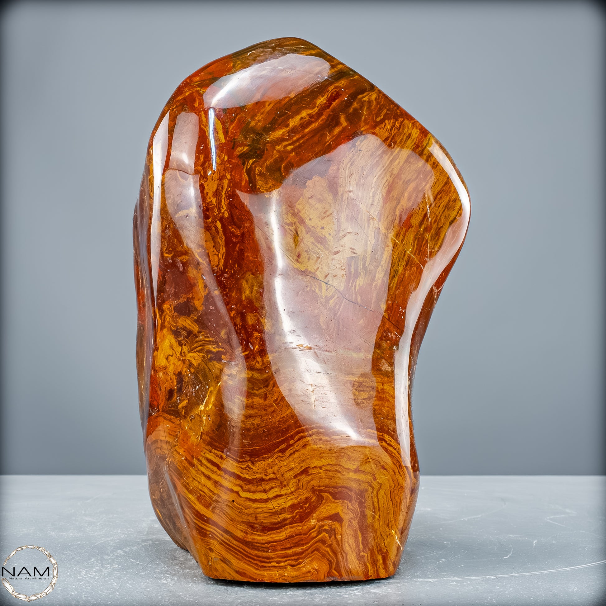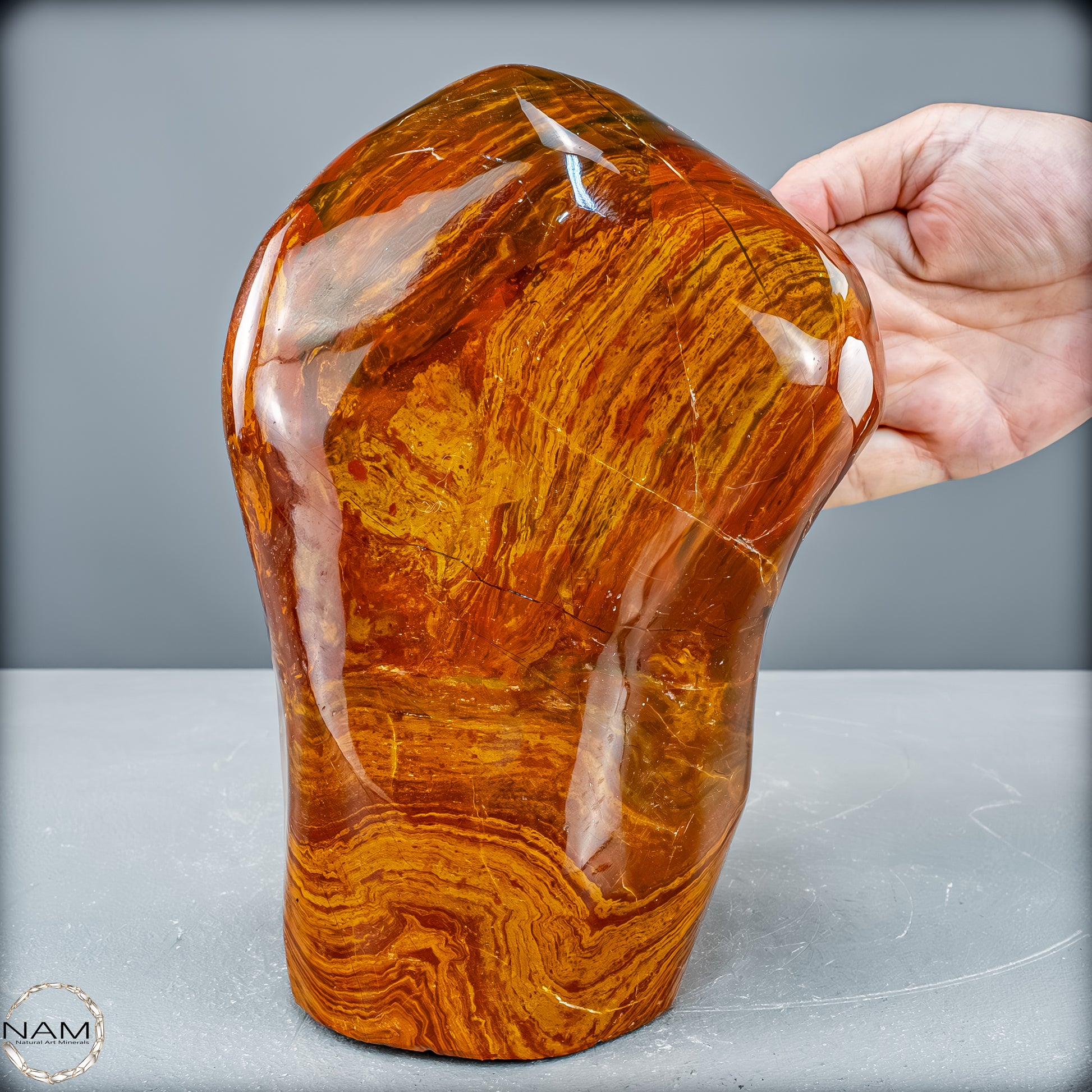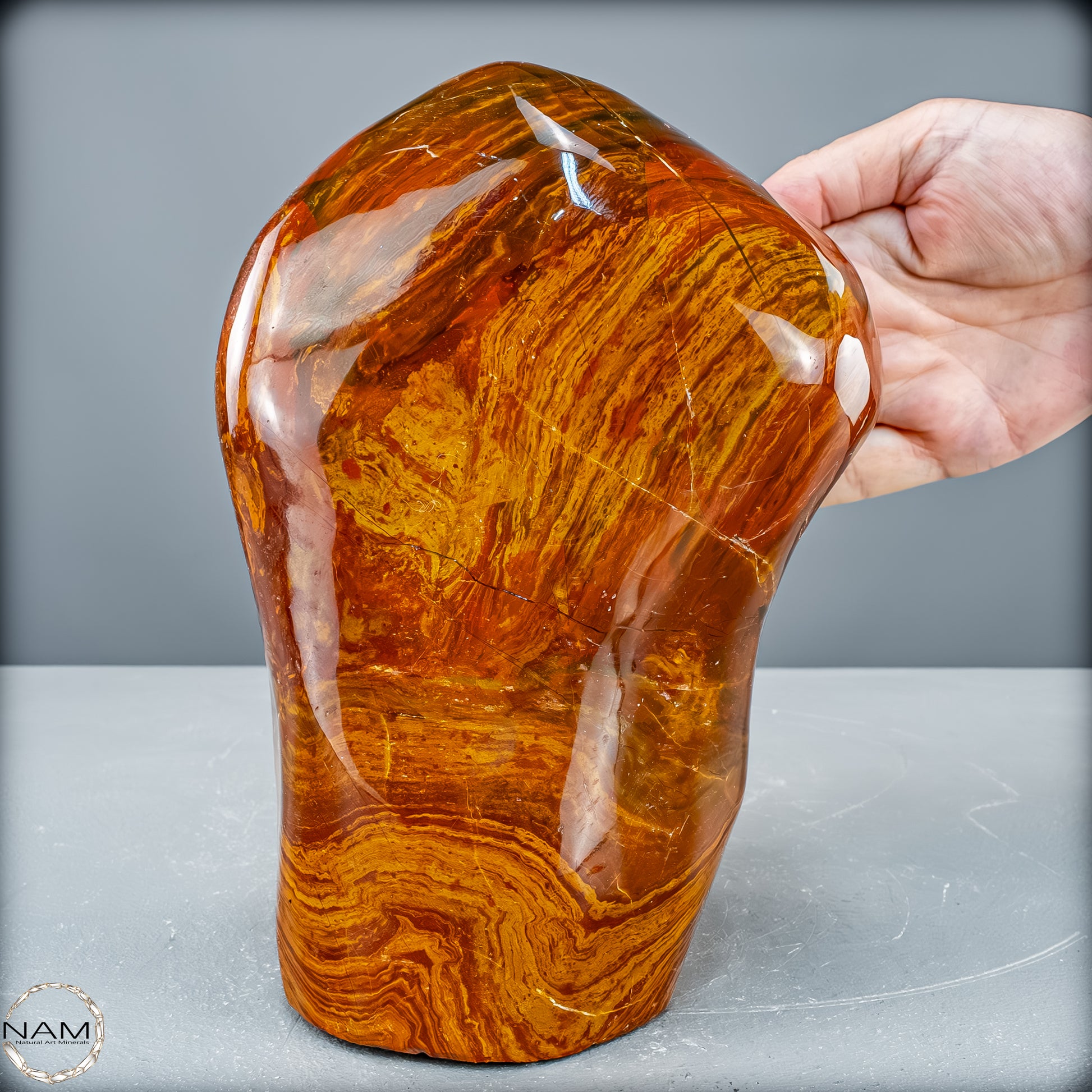 Diese Freiform aus rotem Jaspis leuchtet in sattem, erdigen Rot – durchzogen von natürlichen Maserungen, Einschlüssen und Adern, die den Stein wie ein Gemälde der Natur erscheinen lassen. Poliert auf Hochglanz, zeigt der Jaspis seine charakteristische Tiefe und Lebendigkeit: von warmen Ziegelrot-Tönen über ockerfarbene Einschlüsse bis hin zu dunklen, fast schwarzen Adern, die sich wie Lebenslinien durch das Gestein ziehen.