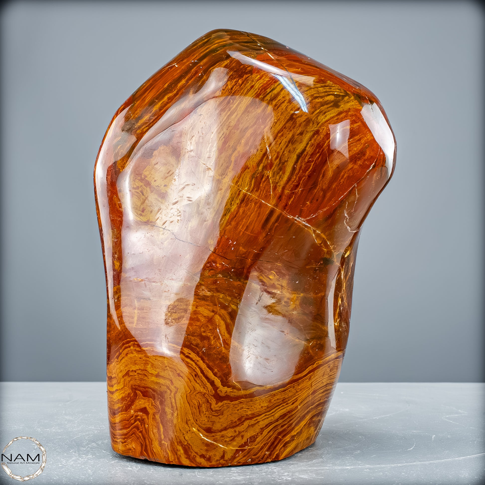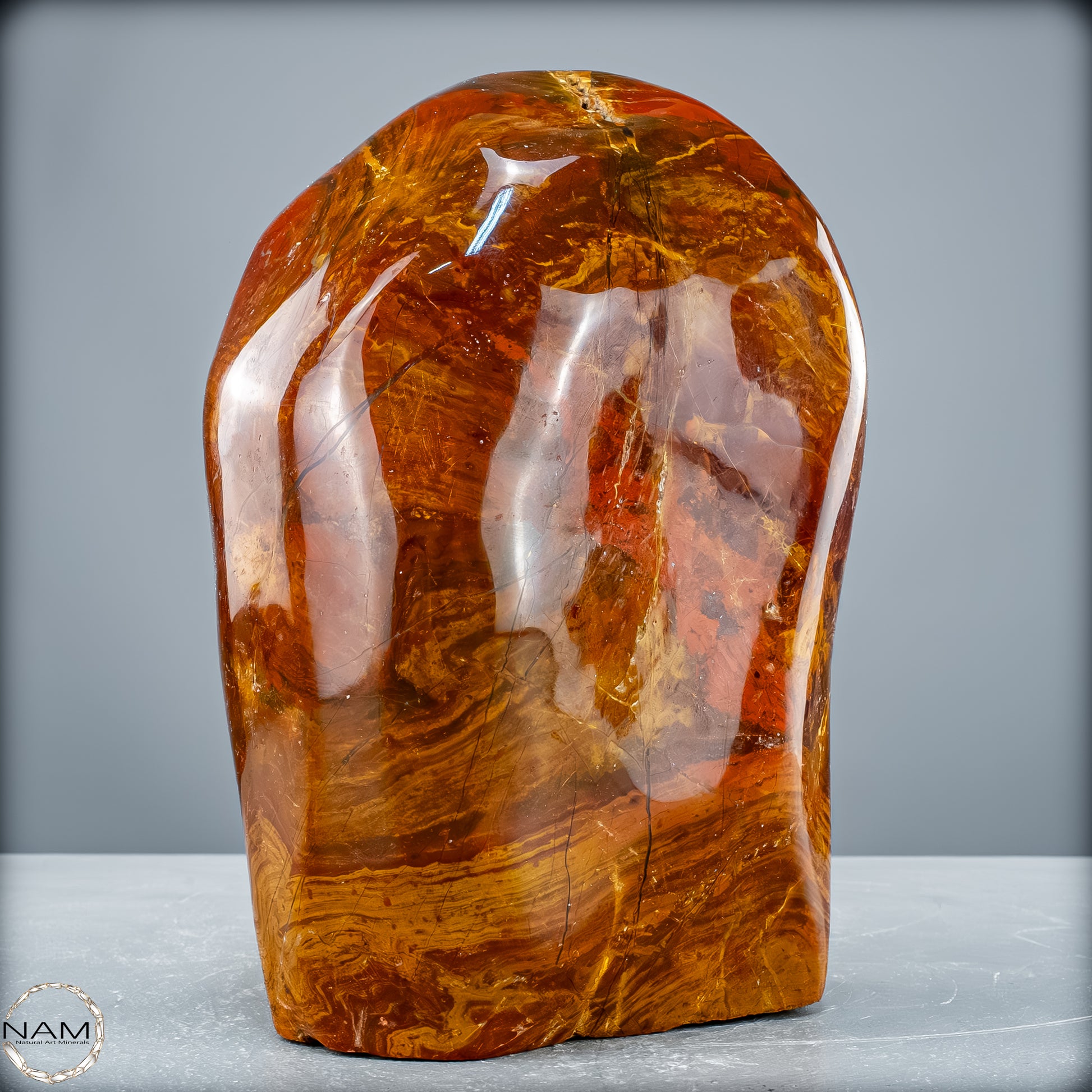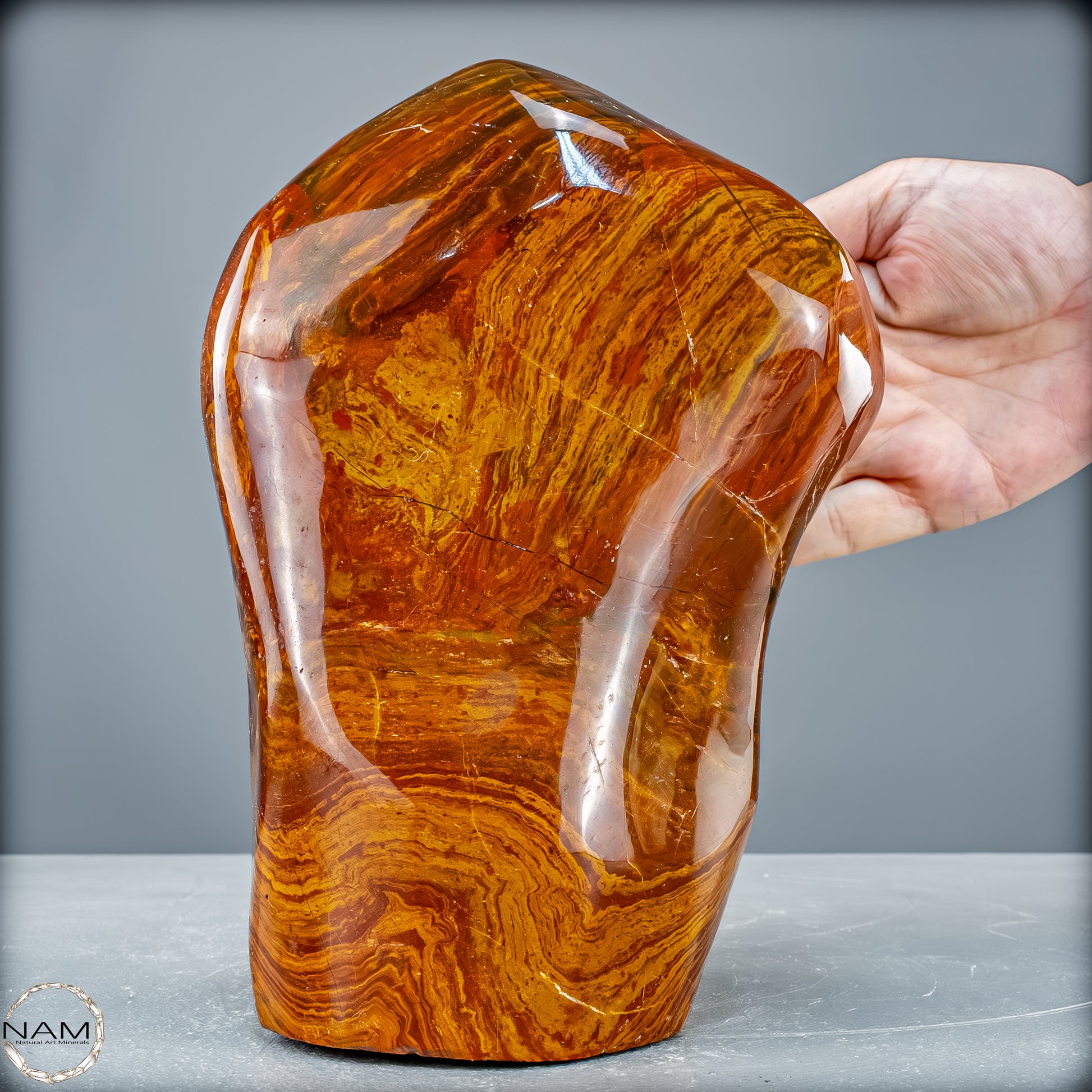 Diese Freiform aus rotem Jaspis leuchtet in sattem, erdigen Rot – durchzogen von natürlichen Maserungen, Einschlüssen und Adern, die den Stein wie ein Gemälde der Natur erscheinen lassen. Poliert auf Hochglanz, zeigt der Jaspis seine charakteristische Tiefe und Lebendigkeit: von warmen Ziegelrot-Tönen über ockerfarbene Einschlüsse bis hin zu dunklen, fast schwarzen Adern, die sich wie Lebenslinien durch das Gestein ziehen.