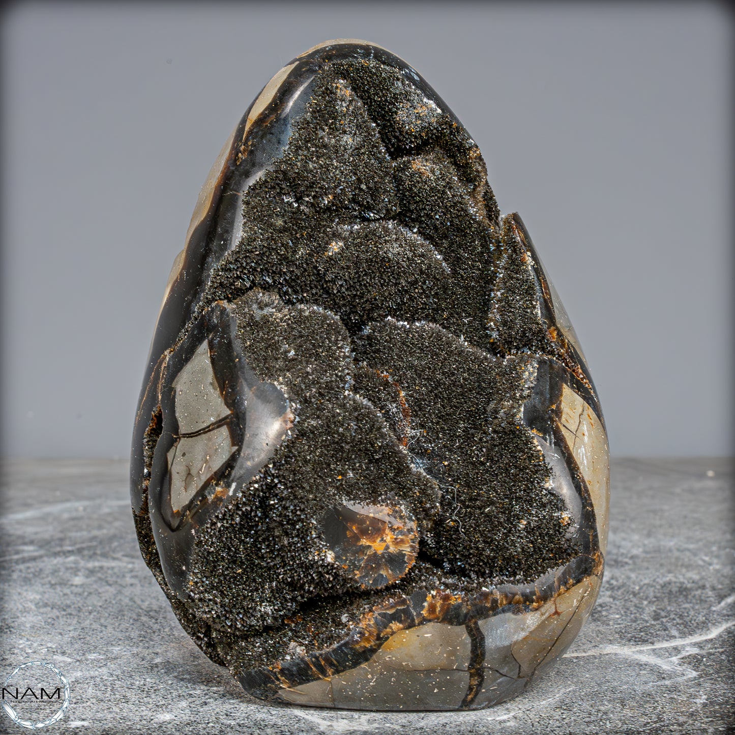 Diese außergewöhnliche Septarie-Freiform beeindruckt mit einer dramatisch geöffneten, glitzernden Druse in tiefem Schwarzbraun, durchzogen von feinen goldenen Reflexen. Die kontrastreiche Oberfläche zeigt eine faszinierende Kombination aus glatt polierten, bräunlich-gelben Außenbereichen und einer kristallinen, funkelnden Innenstruktur. Die natürliche Rissbildung, typisch für Septarien, verleiht dem Stück eine archaische und zugleich mystische Ausstrahlung.