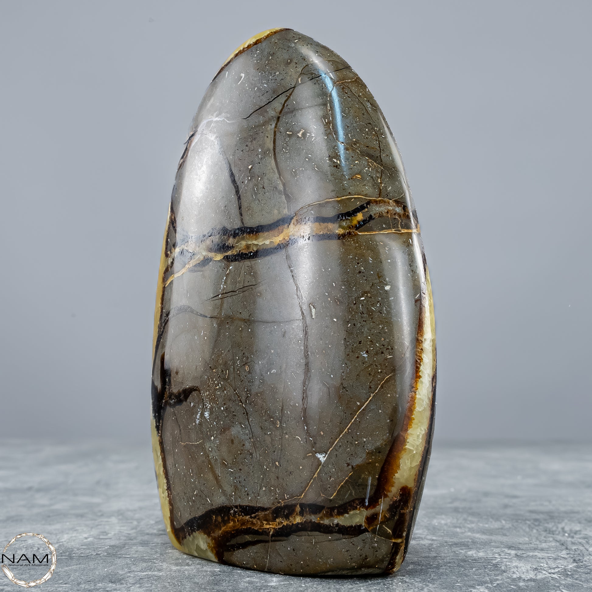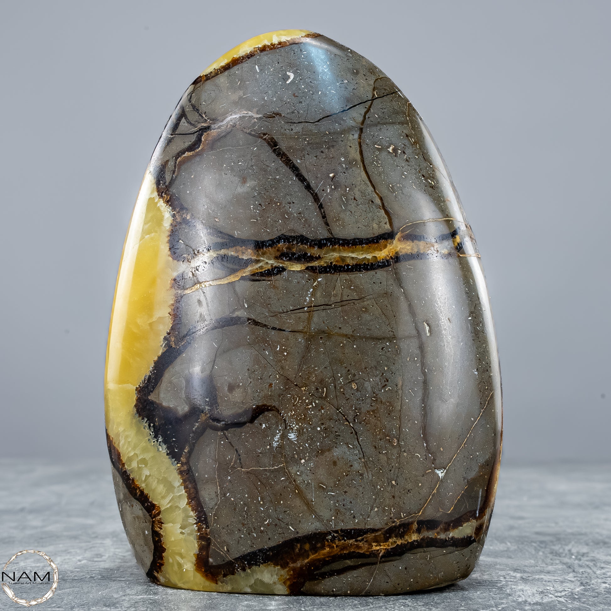 Diese beeindruckende Septarie-Freiform erinnert mit ihrer einzigartigen Musterung aus goldgelben, braunen und grauen Strukturen an ein fossiles Drachenei – ein Name, den sie nicht ohne Grund trägt. Ihre rissartige Zeichnung, die wie ein natürliches Mosaik wirkt, ist das Ergebnis eines faszinierenden geologischen Prozesses, der vor etwa 50 bis 70 Millionen Jahren begann. Die Mischung aus Lehm, Calcit, Aragonit und anderen Mineralien wurde im Laufe der Zeit in kugeligen Konkretionen verfestigt, wobei durch Schrumpfungsrisse und spätere Kristallbildung die charakteristischen Muster entstanden.