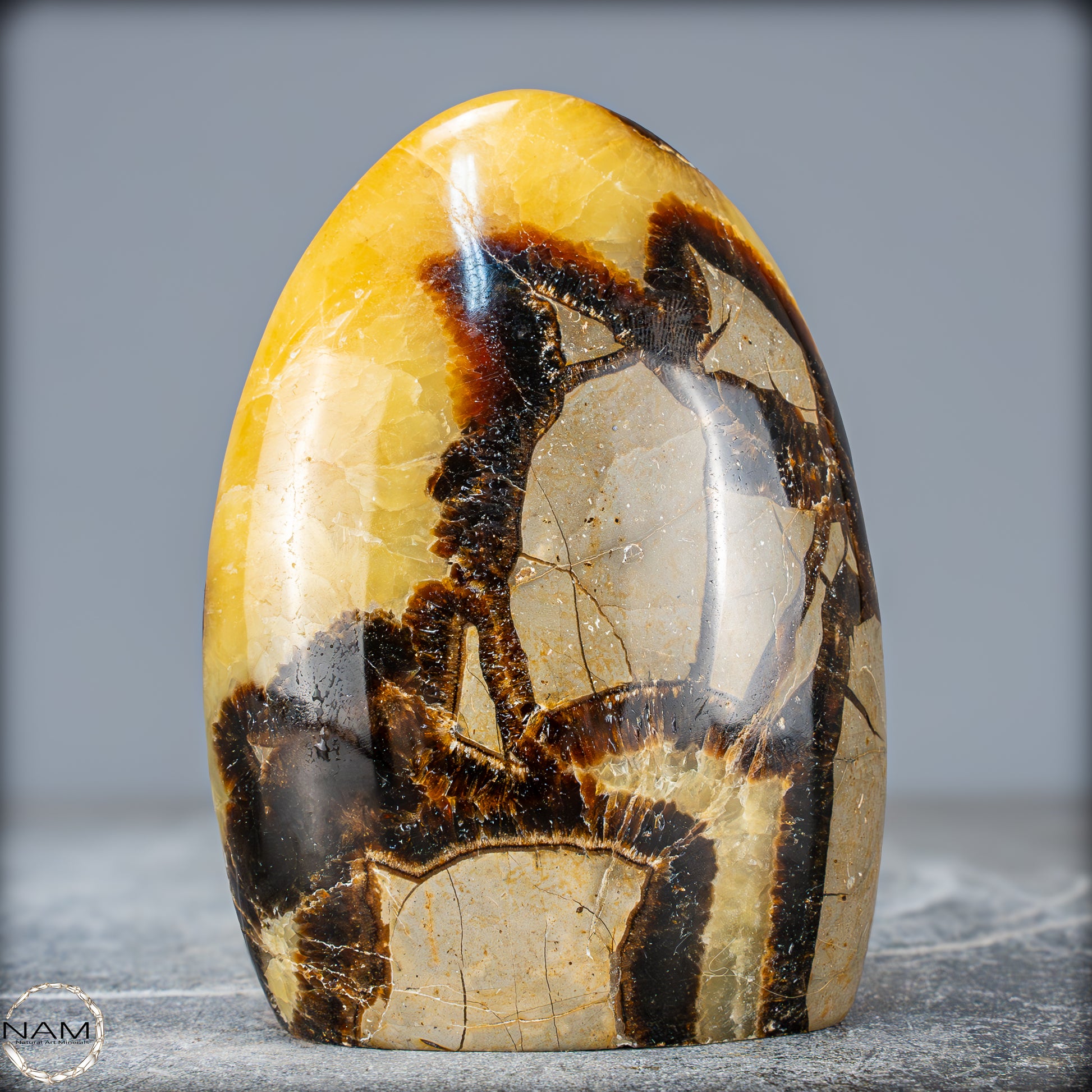 Diese beeindruckende Septarie-Freiform erinnert mit ihrer einzigartigen Musterung aus goldgelben, braunen und grauen Strukturen an ein fossiles Drachenei – ein Name, den sie nicht ohne Grund trägt. Ihre rissartige Zeichnung, die wie ein natürliches Mosaik wirkt, ist das Ergebnis eines faszinierenden geologischen Prozesses, der vor etwa 50 bis 70 Millionen Jahren begann. Die Mischung aus Lehm, Calcit, Aragonit und anderen Mineralien wurde im Laufe der Zeit in kugeligen Konkretionen verfestigt, wobei durch Schrumpfungsrisse und spätere Kristallbildung die charakteristischen Muster entstanden.