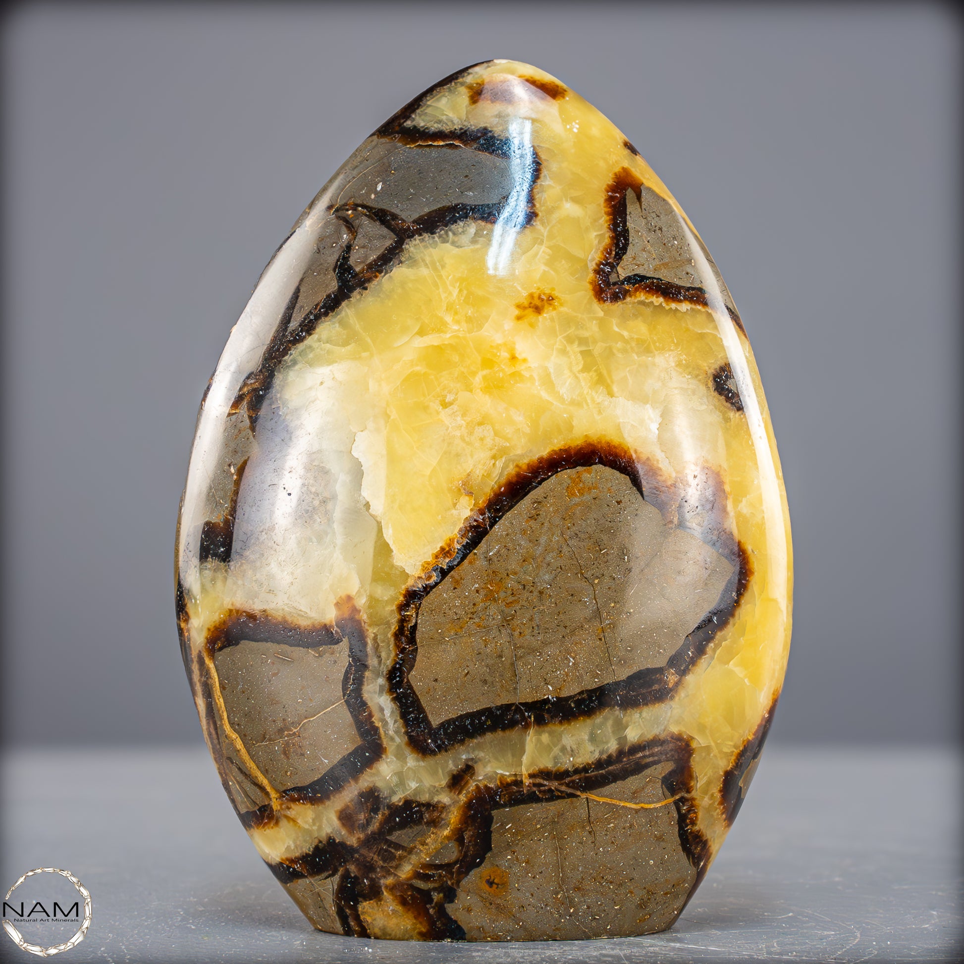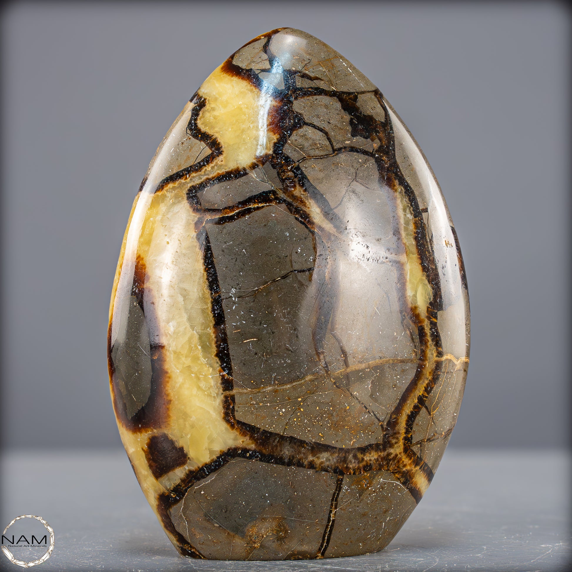 Diese beeindruckende Septarie-Freiform erinnert mit ihrer einzigartigen Musterung aus goldgelben, braunen und grauen Strukturen an ein fossiles Drachenei – ein Name, den sie nicht ohne Grund trägt. Ihre rissartige Zeichnung, die wie ein natürliches Mosaik wirkt, ist das Ergebnis eines faszinierenden geologischen Prozesses, der vor etwa 50 bis 70 Millionen Jahren begann. Die Mischung aus Lehm, Calcit, Aragonit und anderen Mineralien wurde im Laufe der Zeit in kugeligen Konkretionen verfestigt, wobei durch Schrumpfungsrisse und spätere Kristallbildung die charakteristischen Muster entstanden.