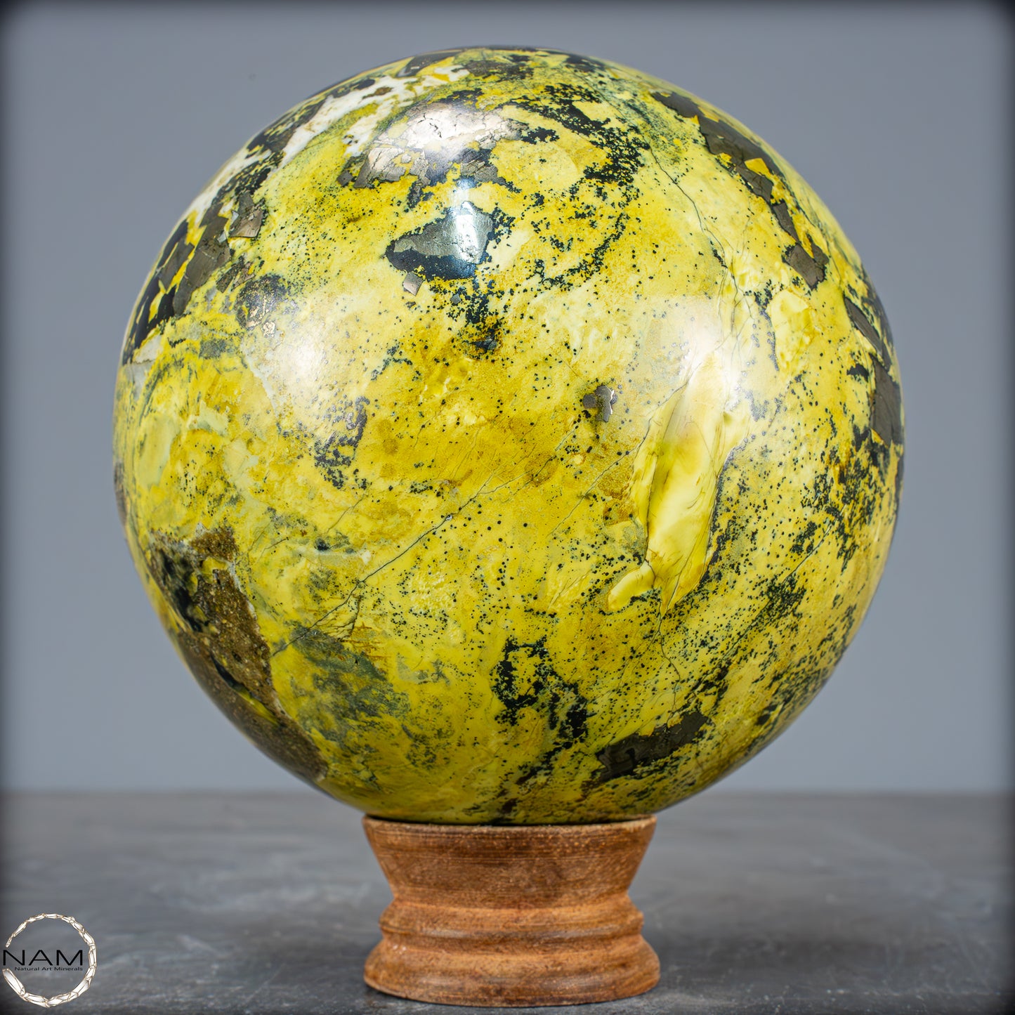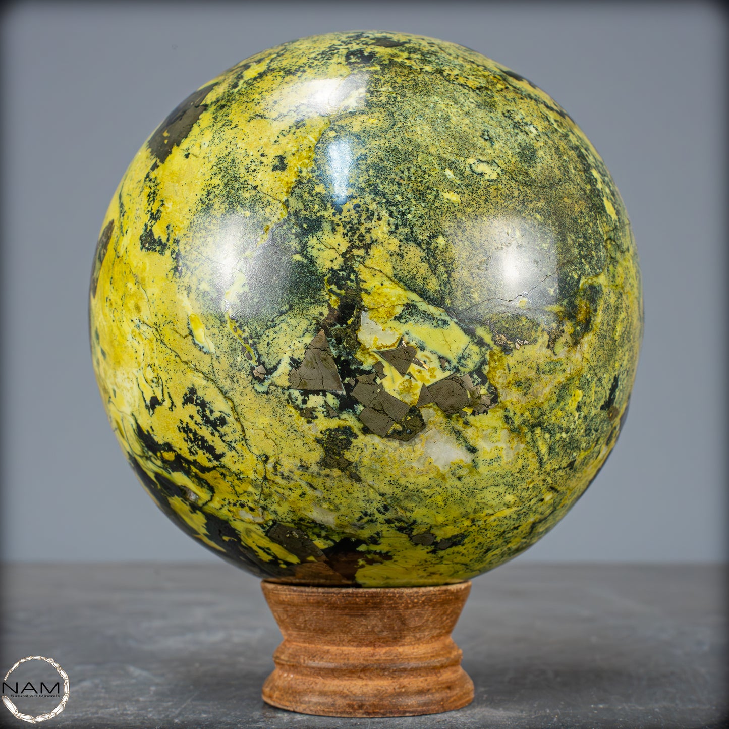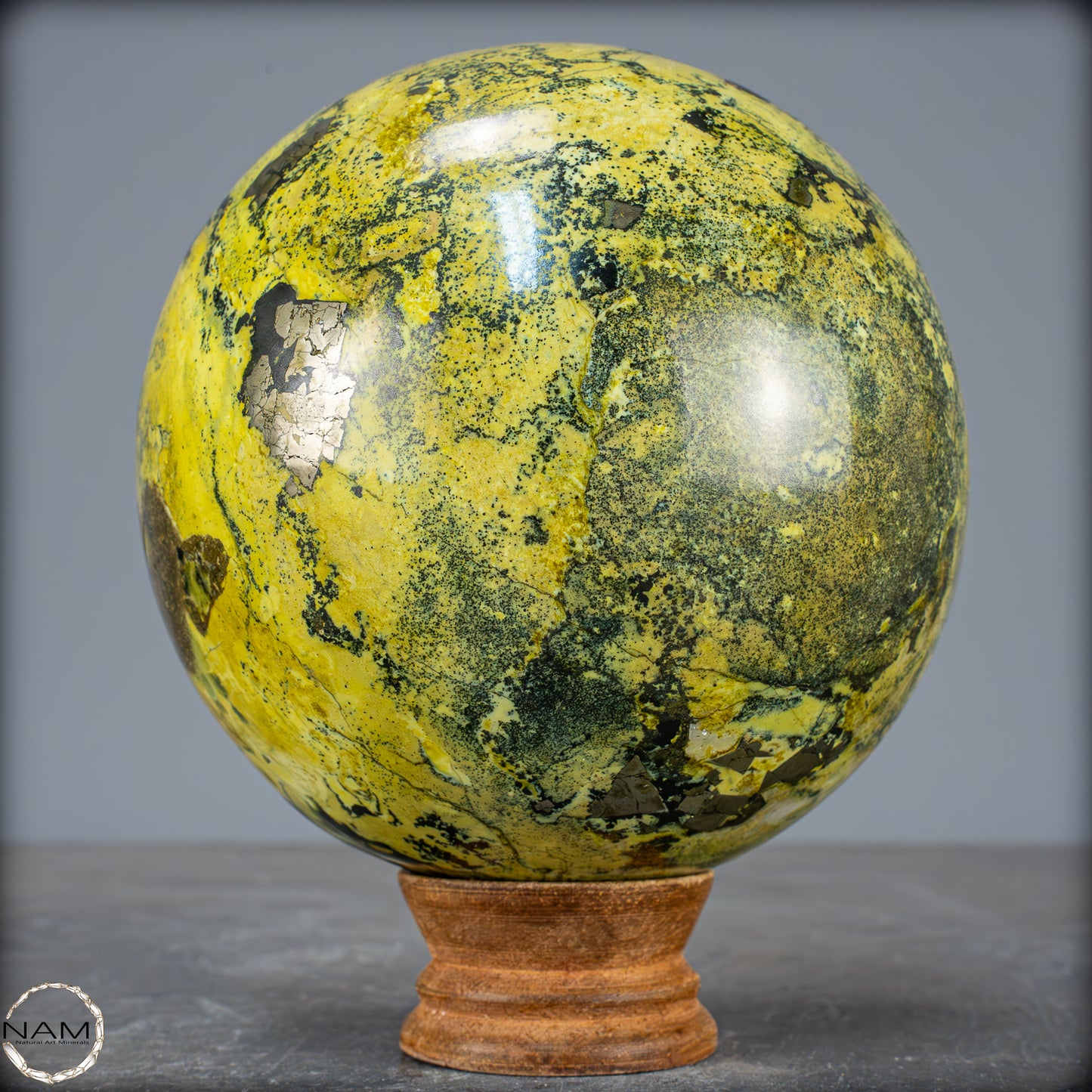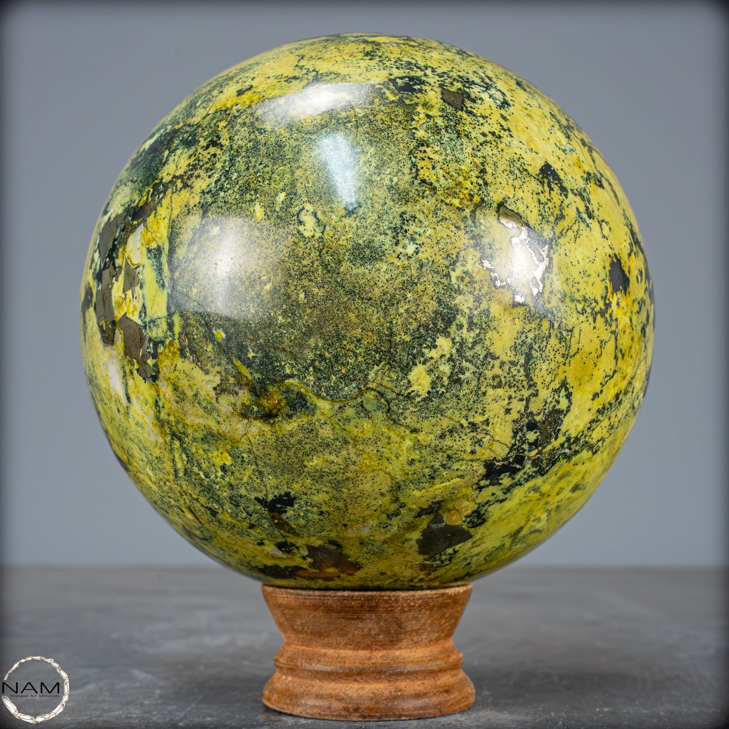 Traumhafte Serpentin-Edelsteinkugel aus Peru. Ist eine solide Ansammlung von Serpentinkristallen mit Schattierungen von Grün bis Gelb, die in einigen Bereichen mit kleinen goldenen Pyritkristallen gesprenkelt sind. Der Name Serpentin bezieht sich auf eine Gruppe überwiegend grüner Mineralien, die in Massen kleiner, ineinander verwachsener Kristalle vorkommen. Seine grüne Farbe und sein schuppiges Aussehen sind die Grundlage des Namens, der vom lateinischen „serpentinous“ stammt, was Schlangenfelsen bedeutet. Der Legende nach verwendeten die Römer diesen Stein als Schutz gegen Zauberei und dunkle Künste. In alten Zivilisationen wurde der Serpentin als Talisman verwendet. Er sollte vor dämonischen Kräften schützen und die Fruchtbarkeit fördern. In China und Indien wird er häufig in Altäre, Schnitzereien und Tempeldekorationen eingearbeitet, da er als Schutzstein gilt, der Frieden bringt.