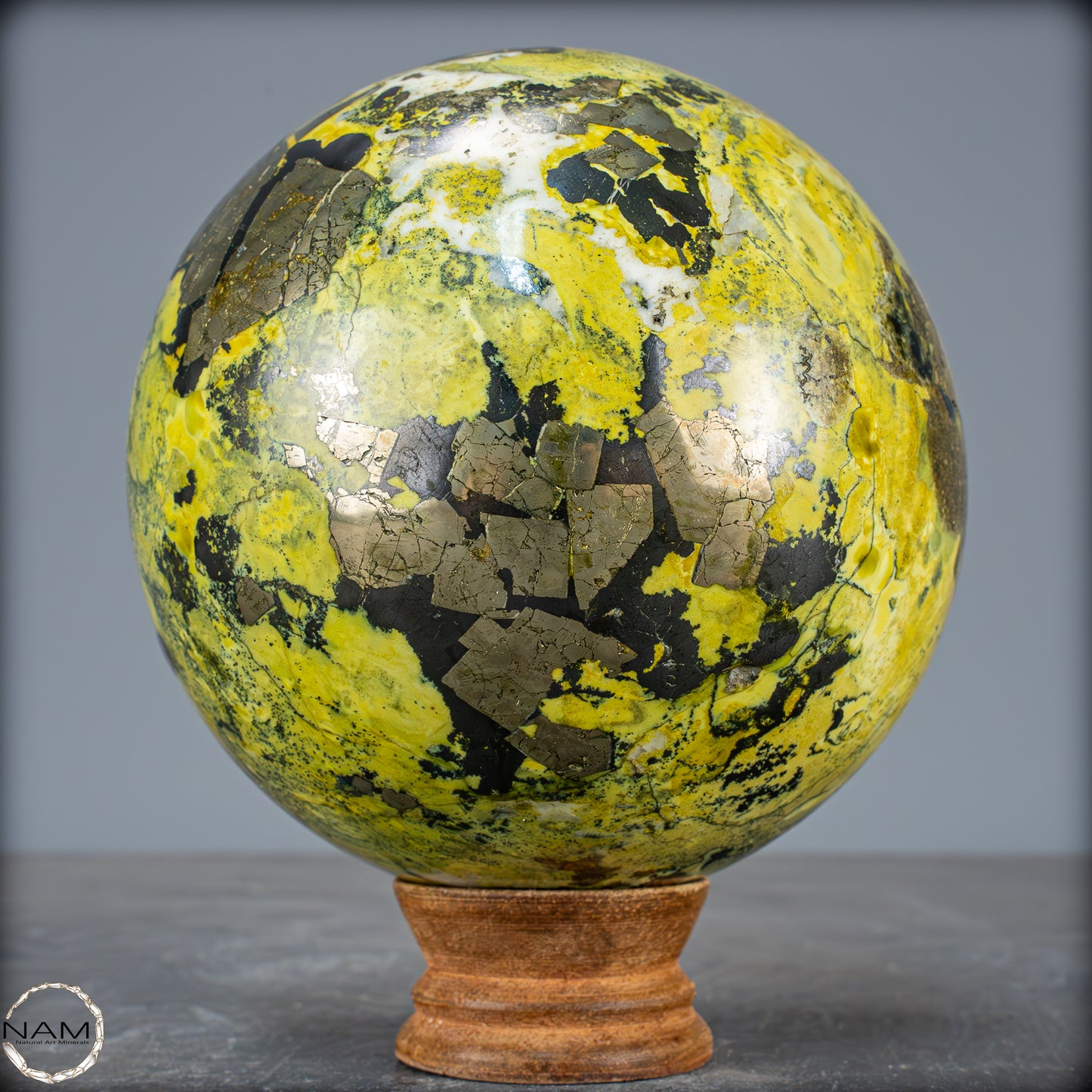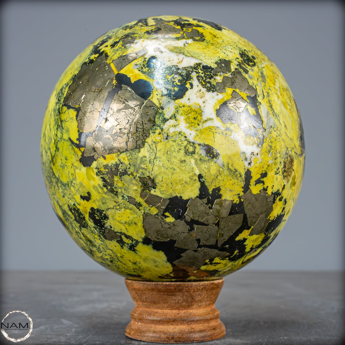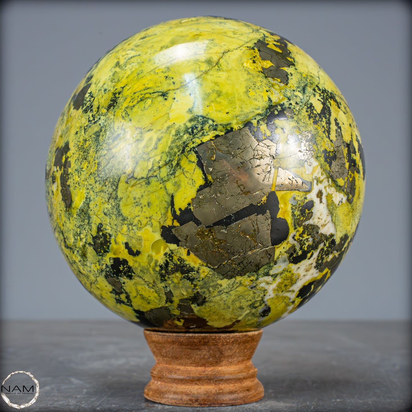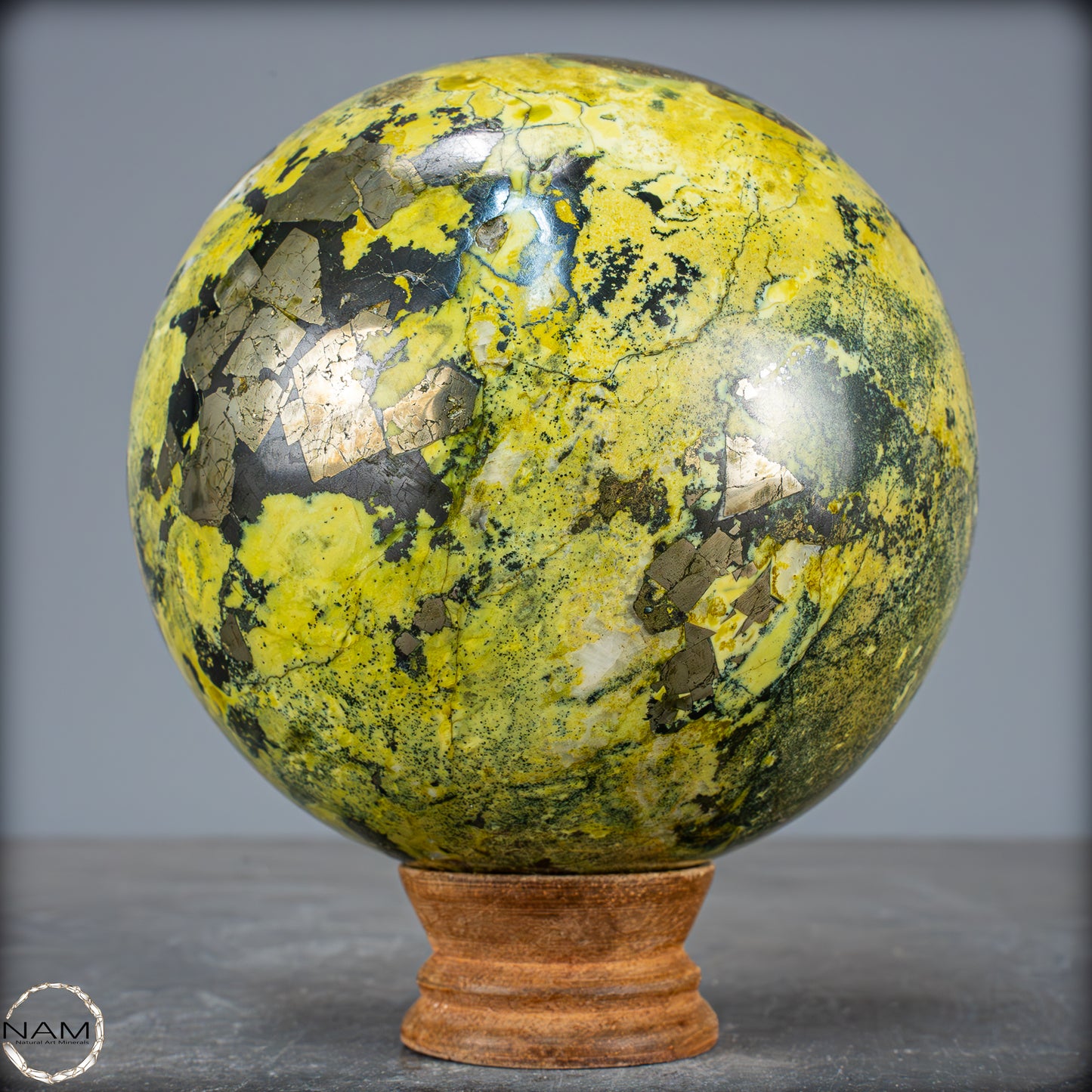 Traumhafte Serpentin-Edelsteinkugel aus Peru. Ist eine solide Ansammlung von Serpentinkristallen mit Schattierungen von Grün bis Gelb, die in einigen Bereichen mit kleinen goldenen Pyritkristallen gesprenkelt sind. Der Name Serpentin bezieht sich auf eine Gruppe überwiegend grüner Mineralien, die in Massen kleiner, ineinander verwachsener Kristalle vorkommen. Seine grüne Farbe und sein schuppiges Aussehen sind die Grundlage des Namens, der vom lateinischen „serpentinous“ stammt, was Schlangenfelsen bedeutet. Der Legende nach verwendeten die Römer diesen Stein als Schutz gegen Zauberei und dunkle Künste. In alten Zivilisationen wurde der Serpentin als Talisman verwendet. Er sollte vor dämonischen Kräften schützen und die Fruchtbarkeit fördern. In China und Indien wird er häufig in Altäre, Schnitzereien und Tempeldekorationen eingearbeitet, da er als Schutzstein gilt, der Frieden bringt.