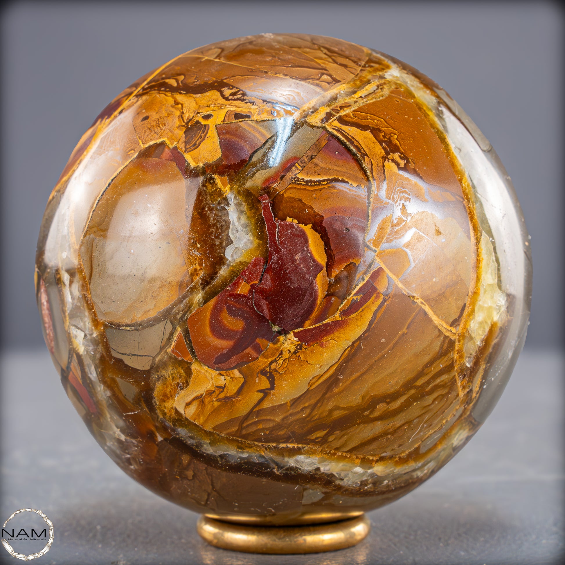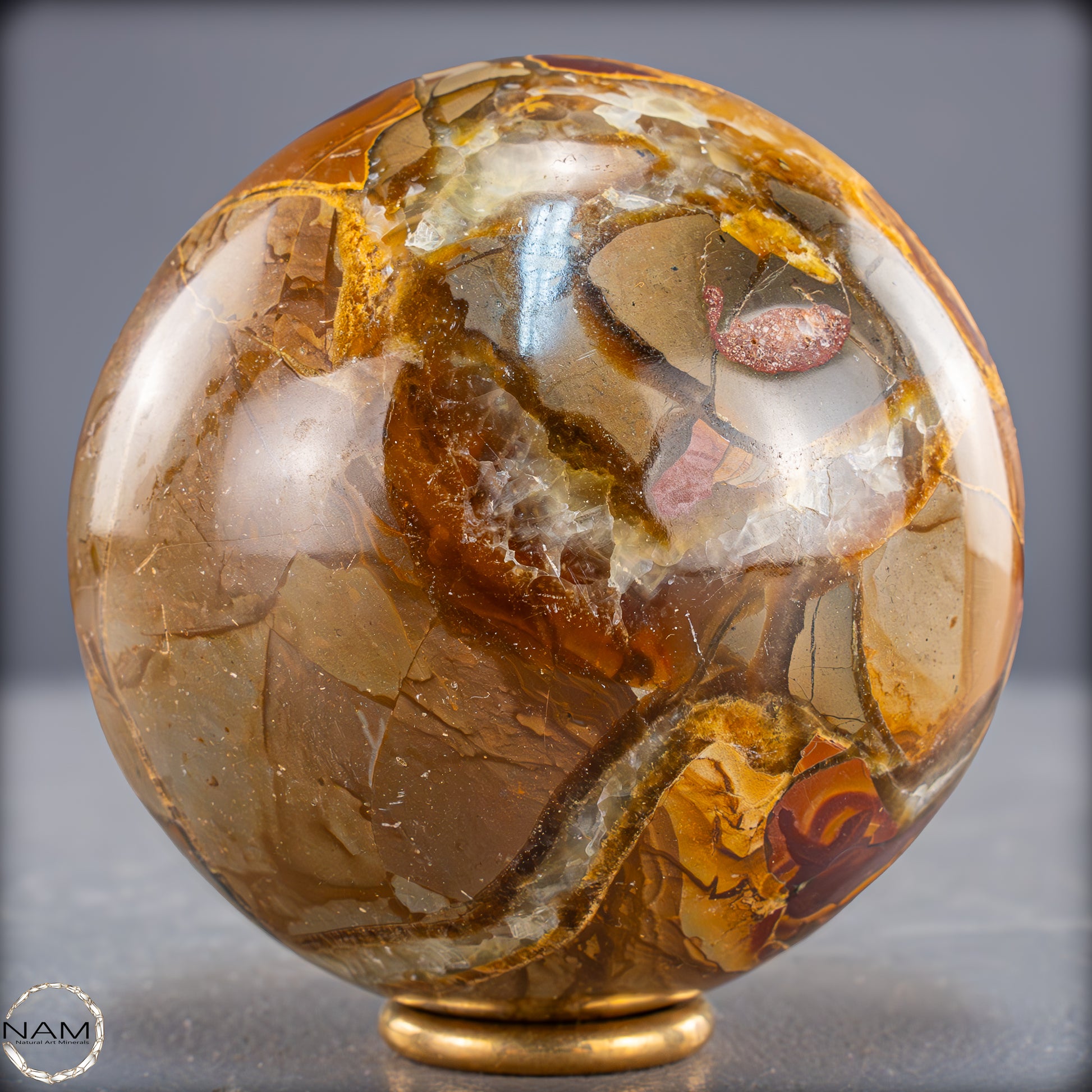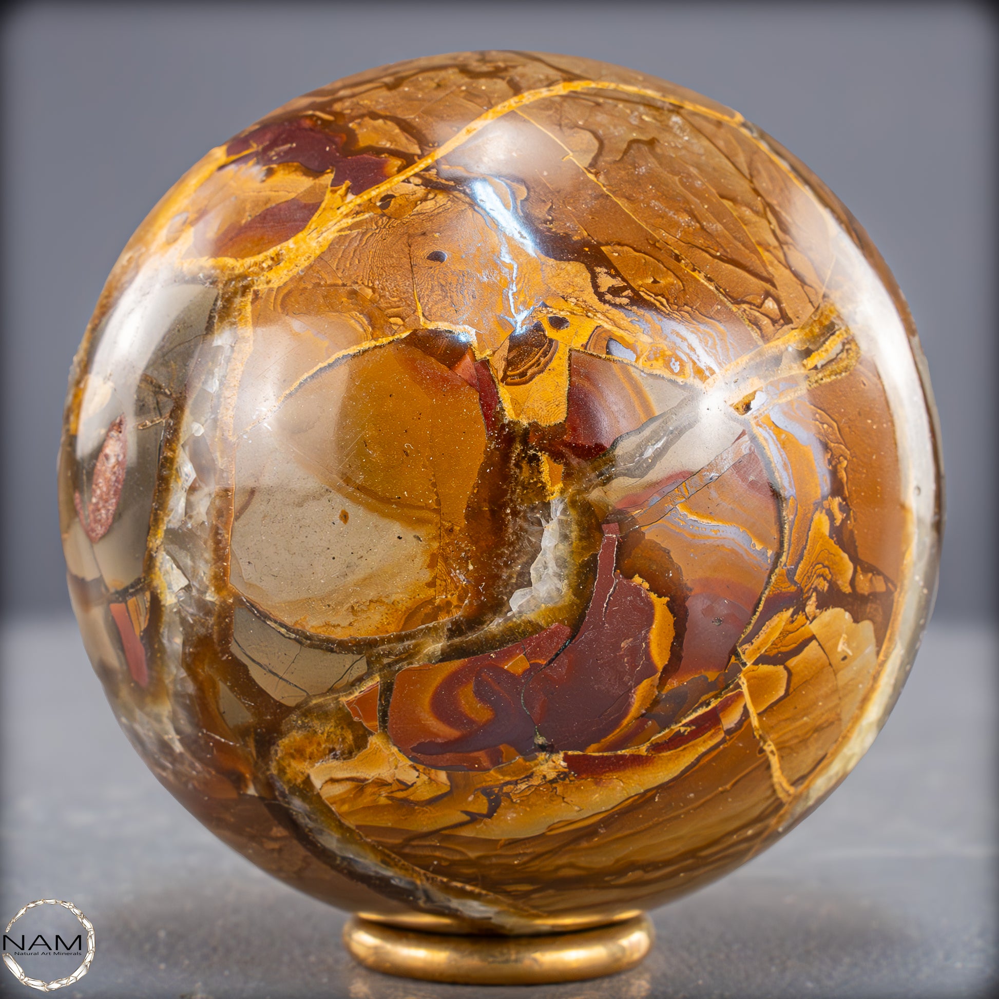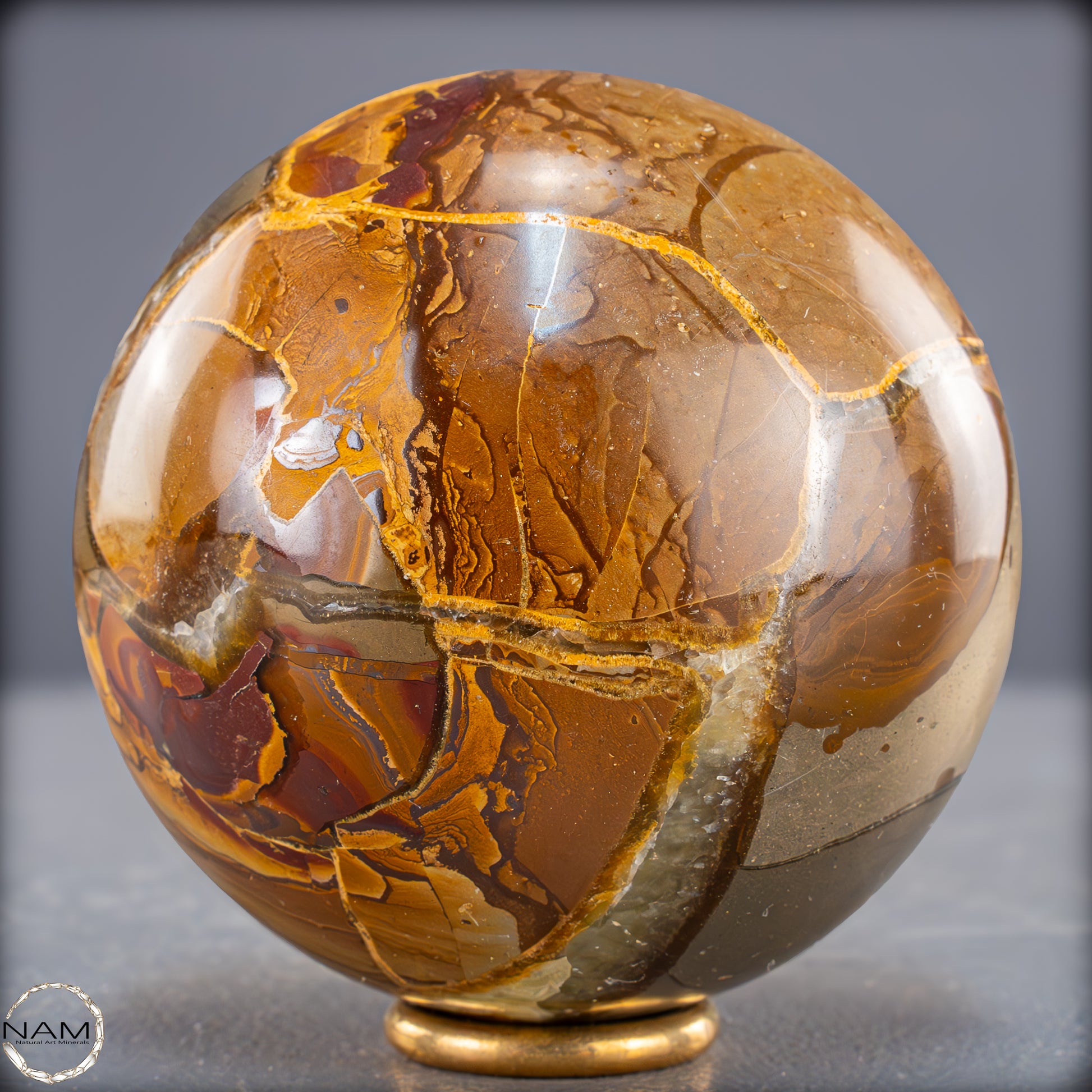In dieser Ausführung zeigt sich das Material von seiner besonders ausdrucksstarken Seite: Leuchtende Gold- und Ockertöne bilden ein spannungsreiches Spiel mit satten Rotbraunflächen und vereinzelten fast transparenten Bereichen. Die netzartigen Risse und Bruchlinien, die durch natürliche Verwitterungsprozesse entstanden und anschließend mit Calcit ausgefüllt wurden, verleihen der Kugel eine lebendige, beinahe geologische Dynamik.