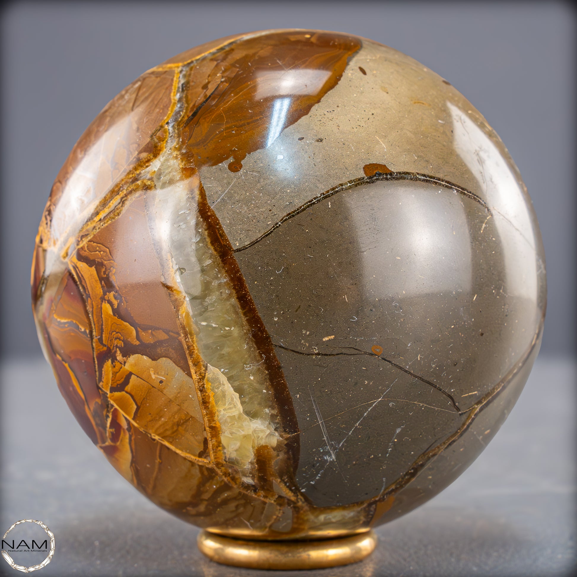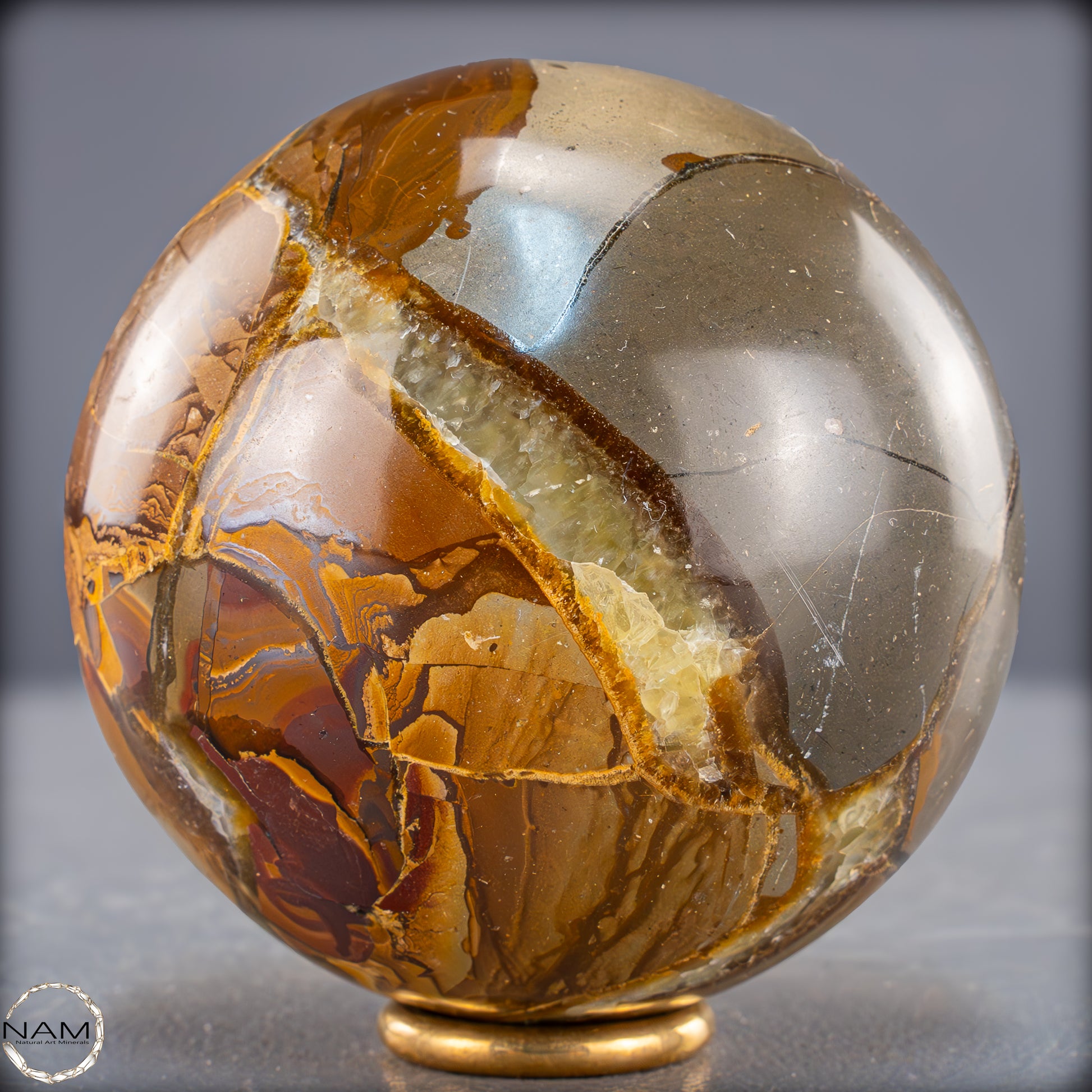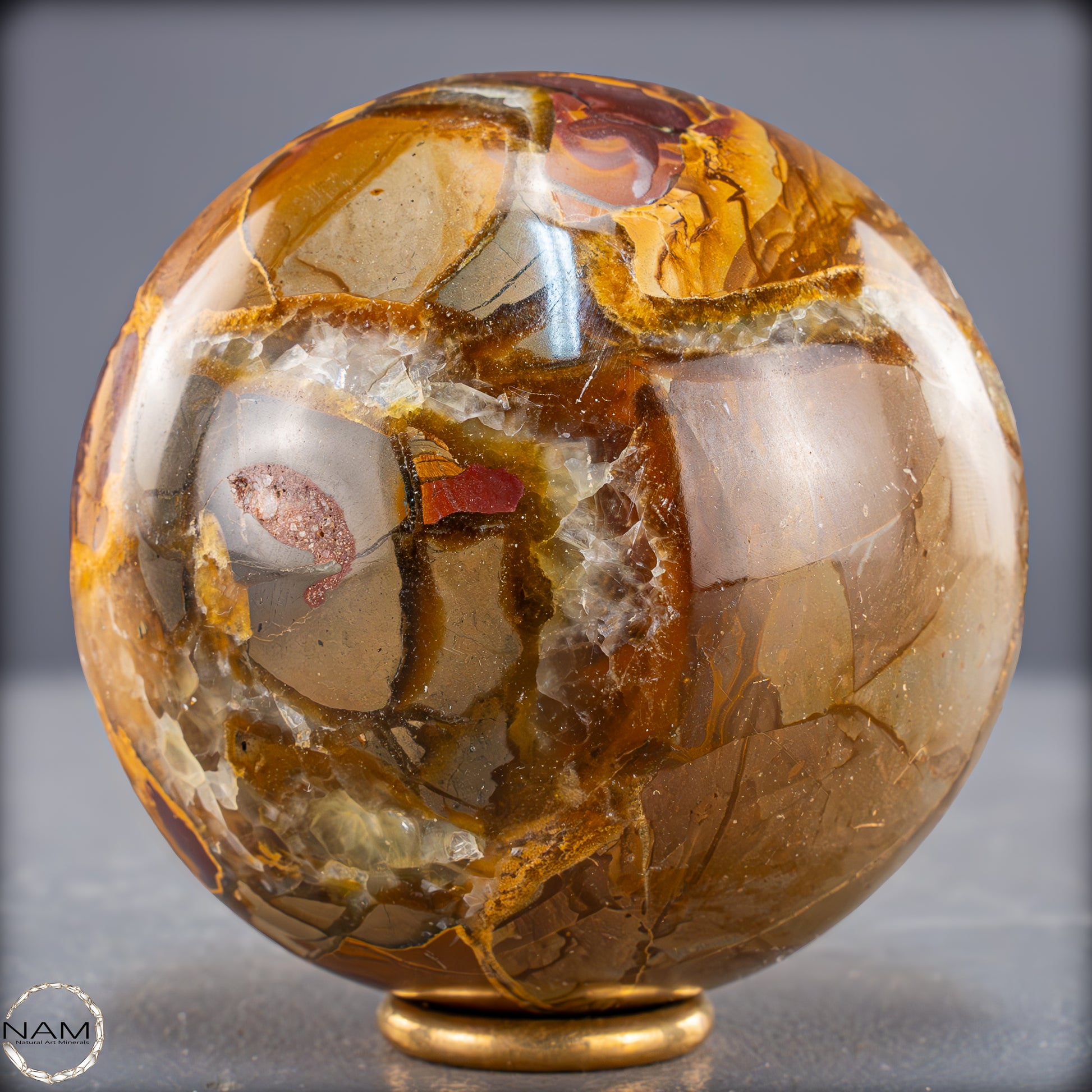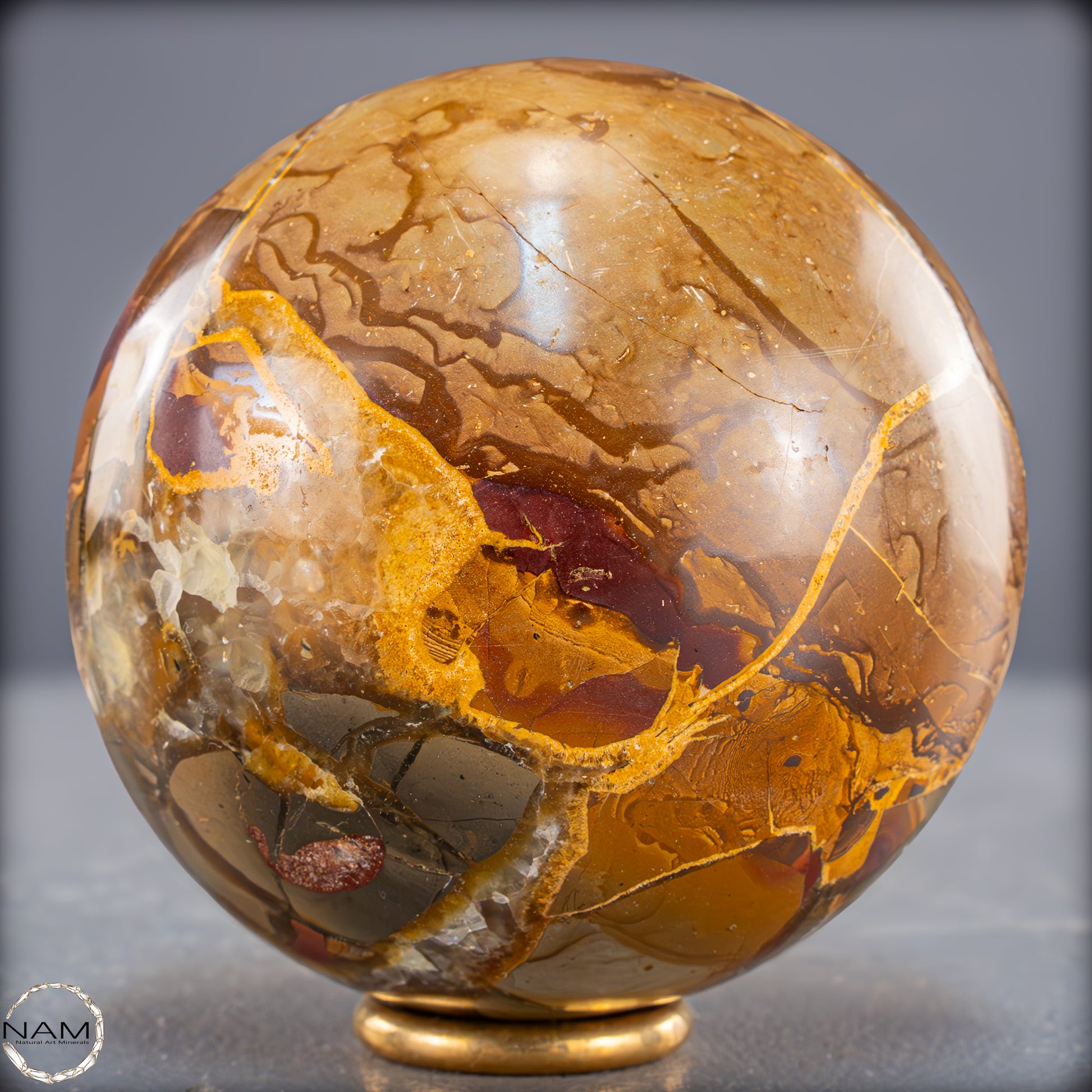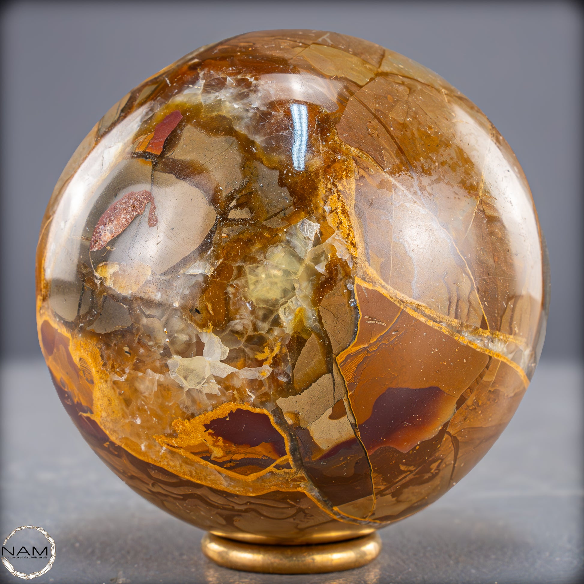 In dieser Ausführung zeigt sich das Material von seiner besonders ausdrucksstarken Seite: Leuchtende Gold- und Ockertöne bilden ein spannungsreiches Spiel mit satten Rotbraunflächen und vereinzelten fast transparenten Bereichen. Die netzartigen Risse und Bruchlinien, die durch natürliche Verwitterungsprozesse entstanden und anschließend mit Calcit ausgefüllt wurden, verleihen der Kugel eine lebendige, beinahe geologische Dynamik.