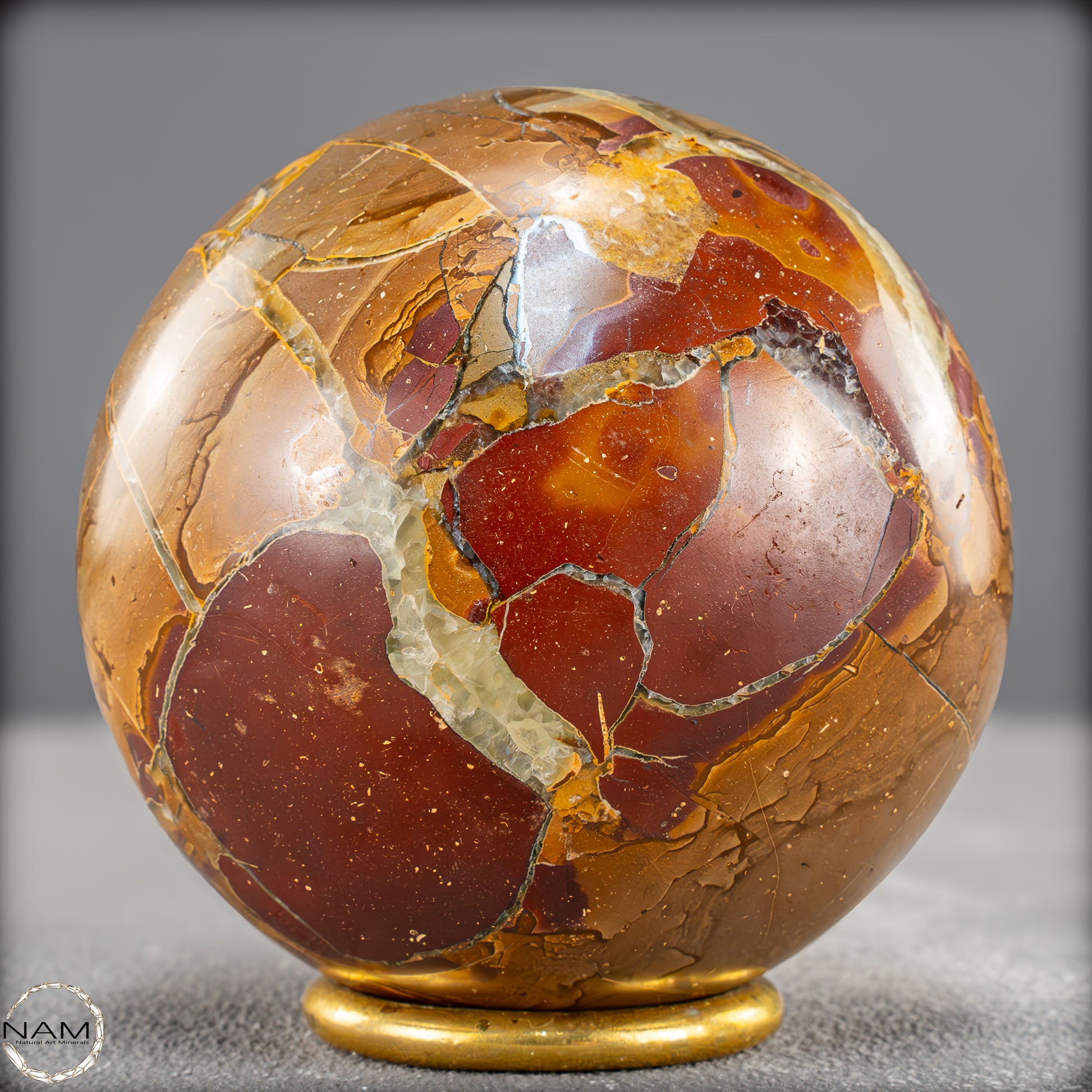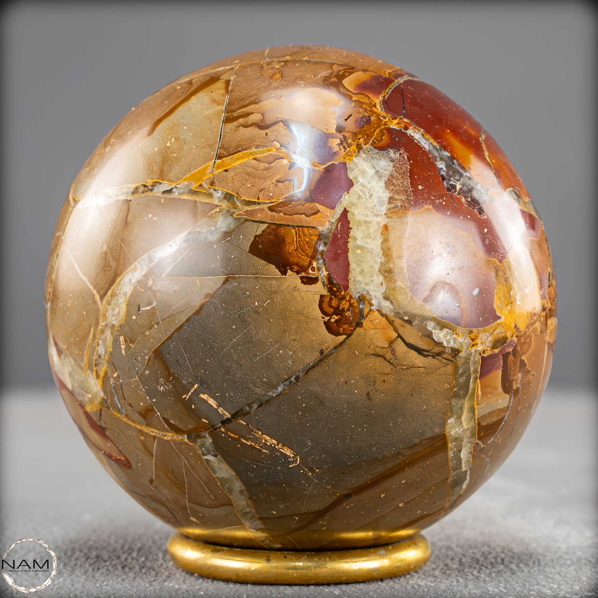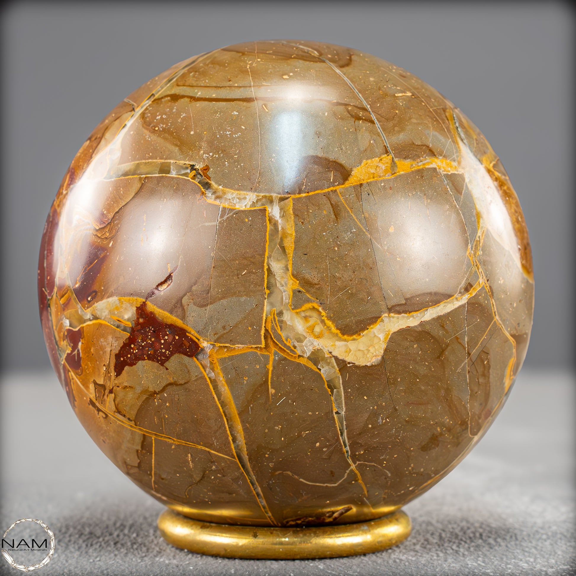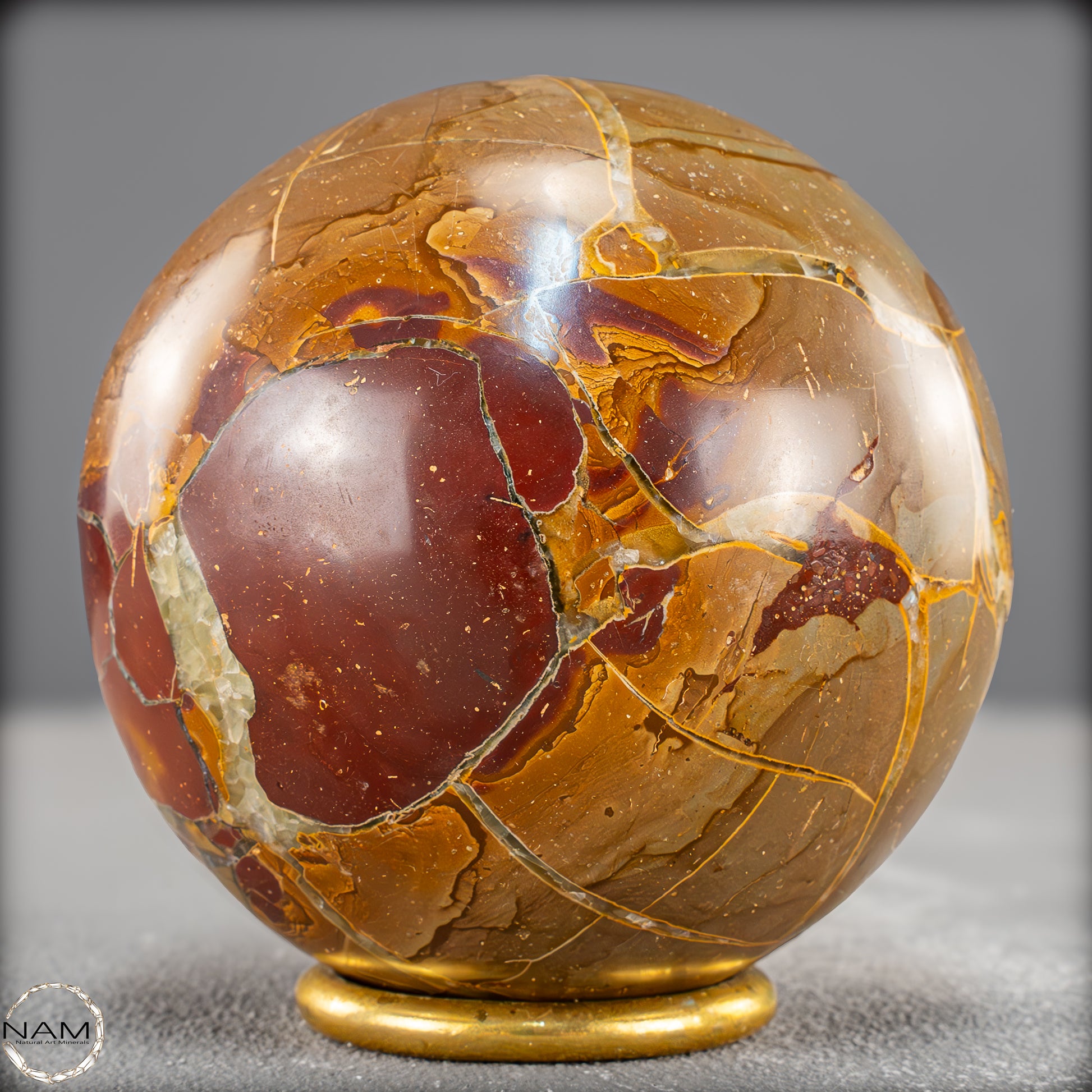 In dieser Ausführung zeigt sich das Material von seiner besonders ausdrucksstarken Seite: Leuchtende Gold- und Ockertöne bilden ein spannungsreiches Spiel mit satten Rotbraunflächen und vereinzelten fast transparenten Bereichen. Die netzartigen Risse und Bruchlinien, die durch natürliche Verwitterungsprozesse entstanden und anschließend mit Calcit ausgefüllt wurden, verleihen der Kugel eine lebendige, beinahe geologische Dynamik.