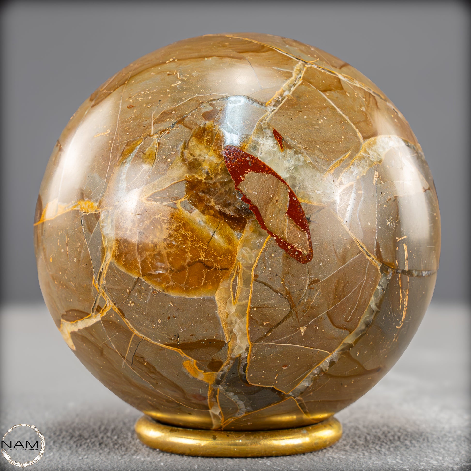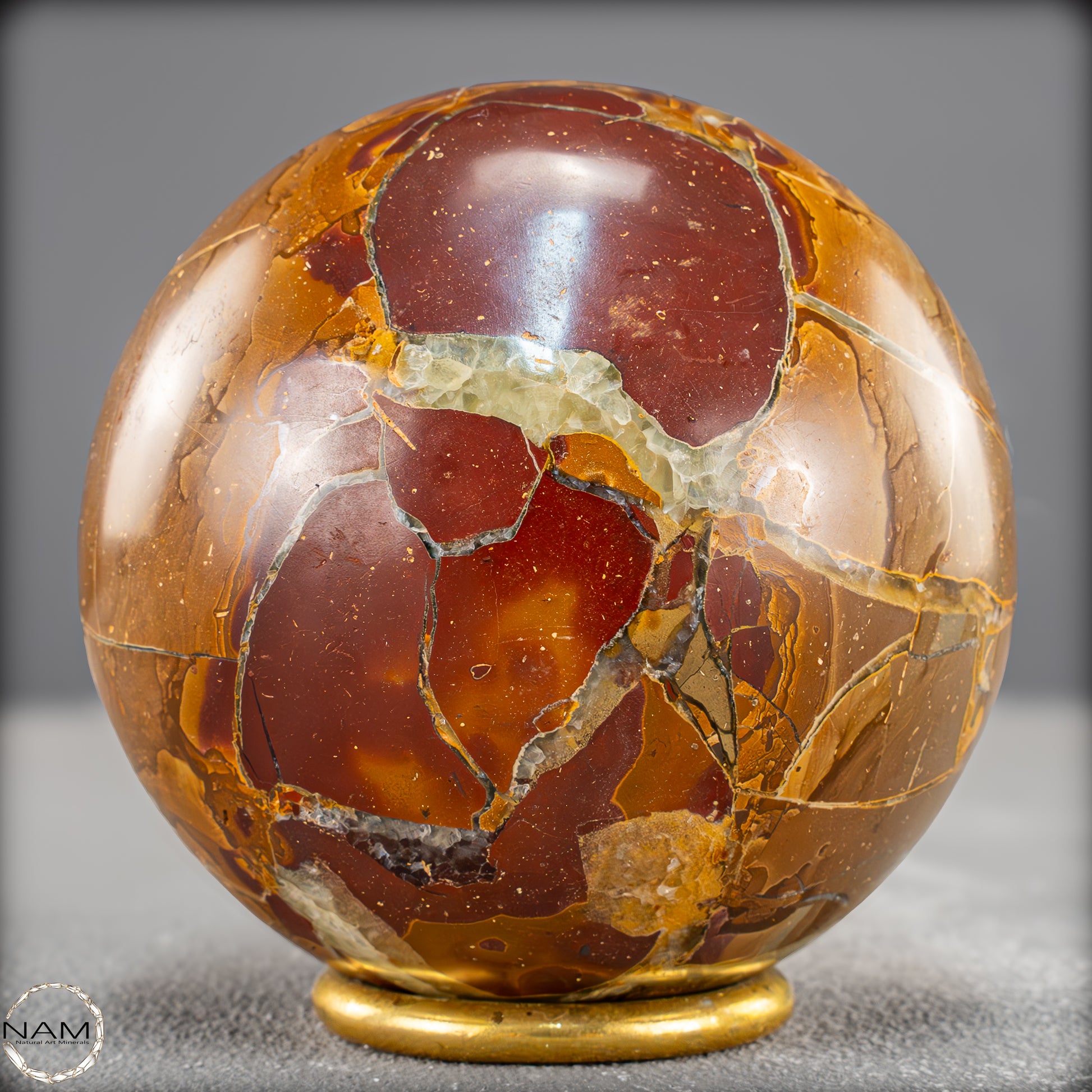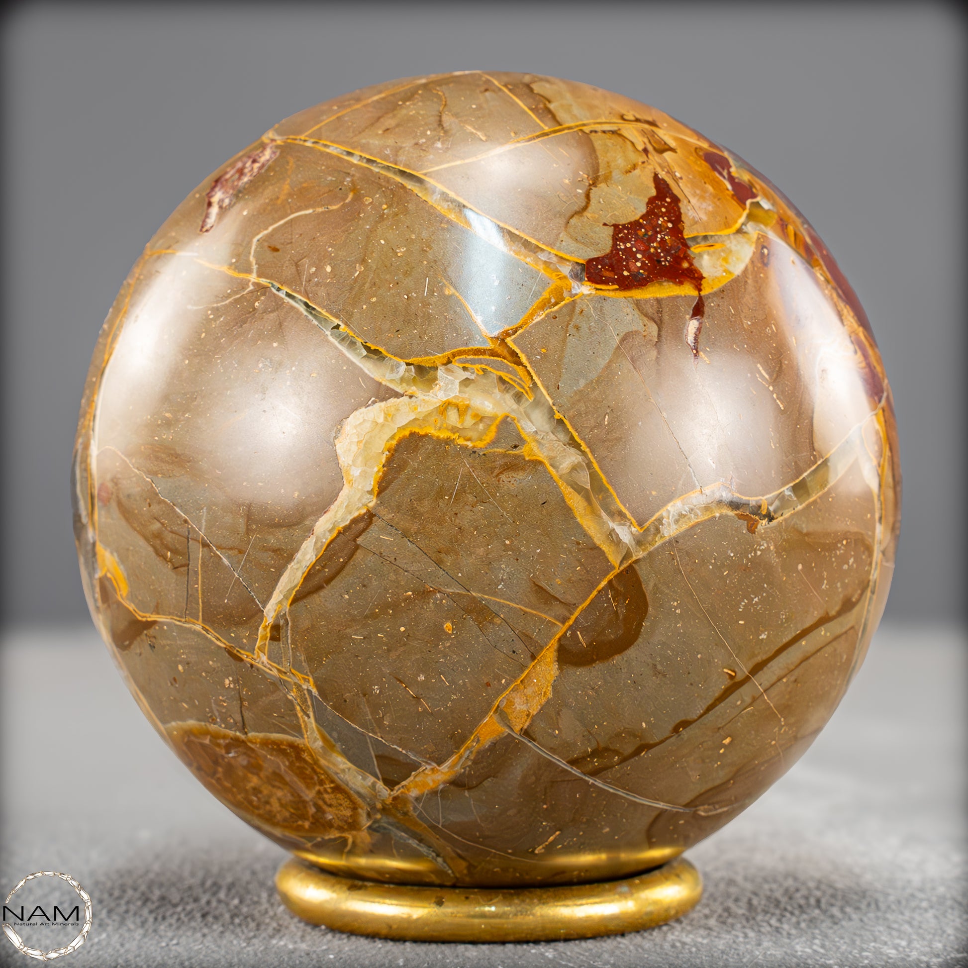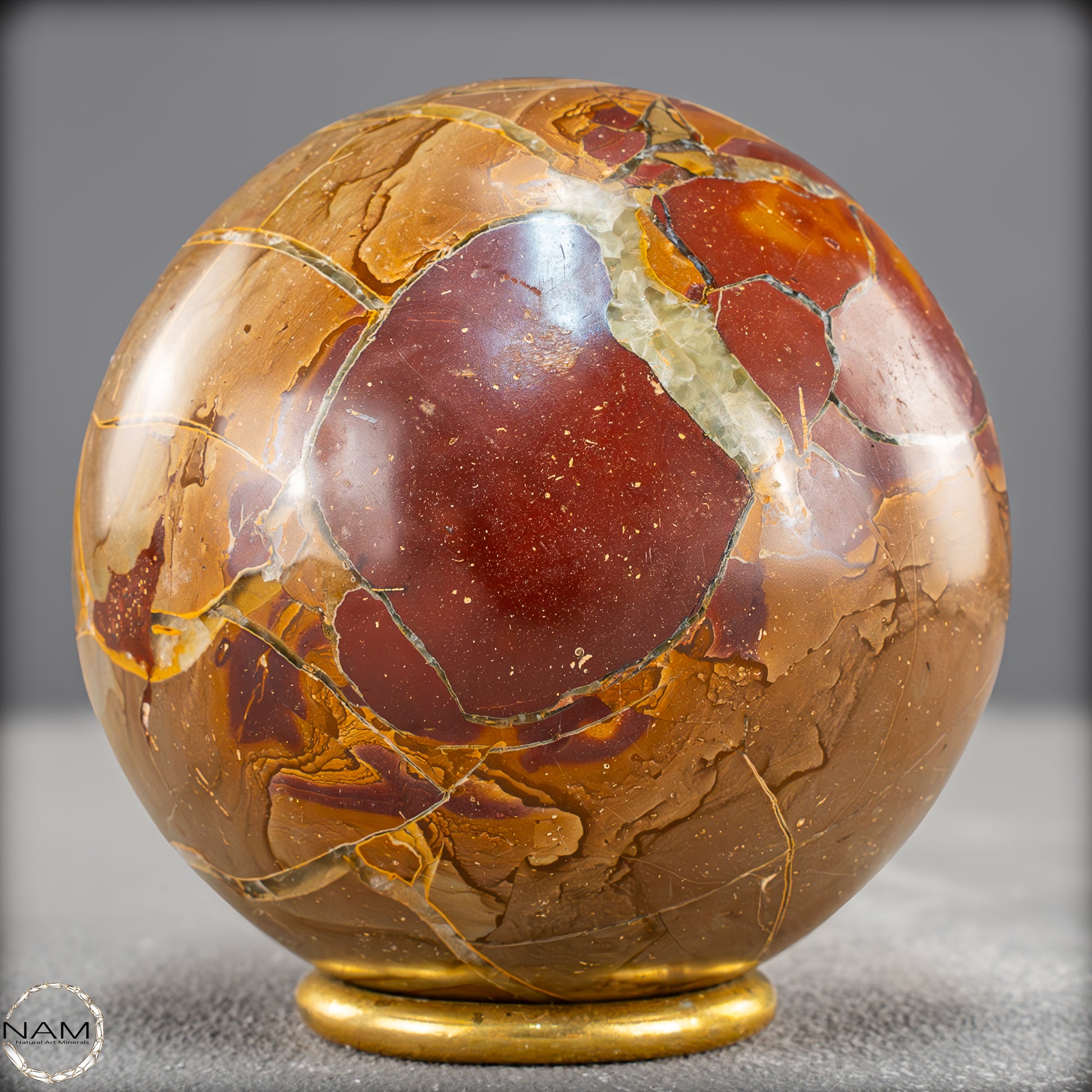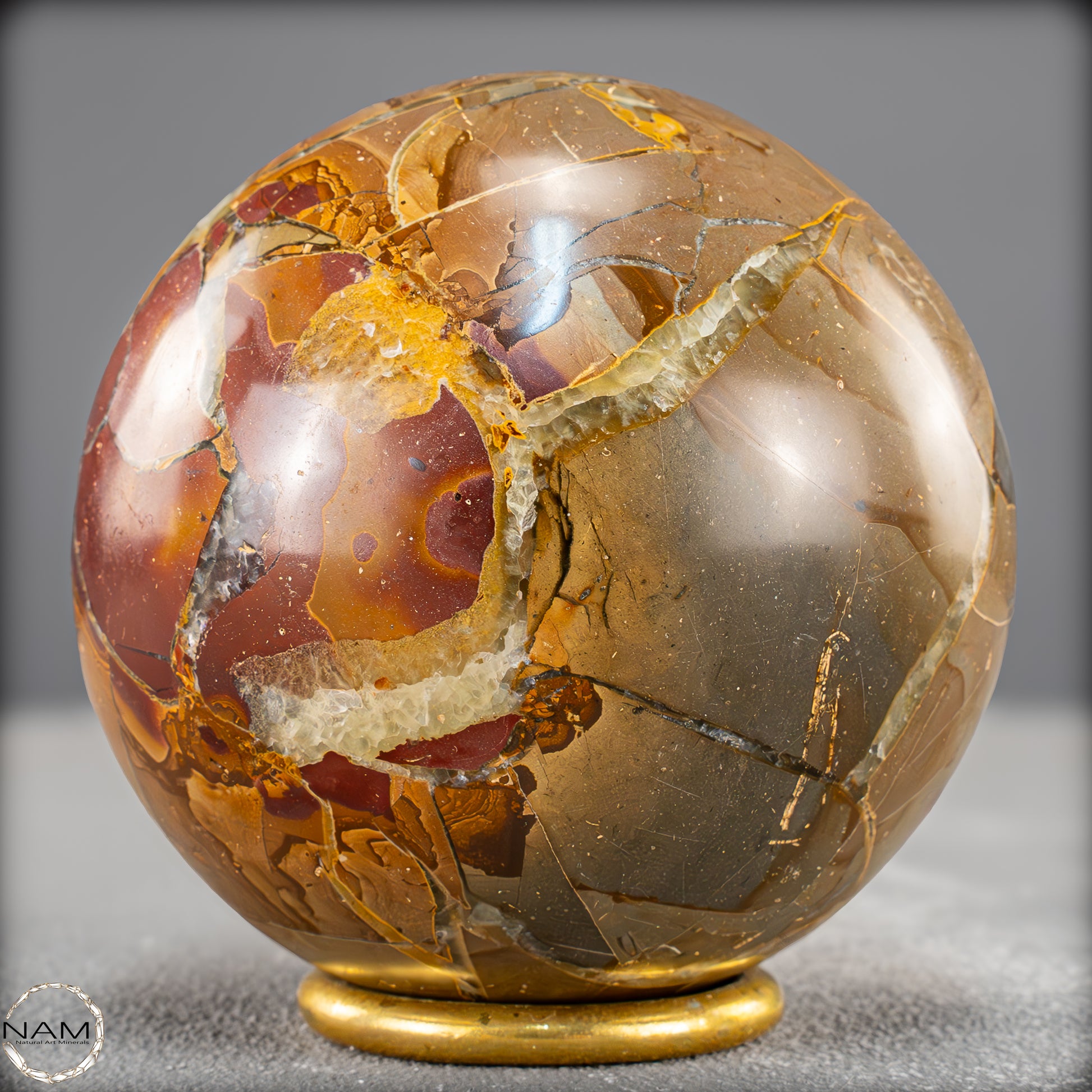 In dieser Ausführung zeigt sich das Material von seiner besonders ausdrucksstarken Seite: Leuchtende Gold- und Ockertöne bilden ein spannungsreiches Spiel mit satten Rotbraunflächen und vereinzelten fast transparenten Bereichen. Die netzartigen Risse und Bruchlinien, die durch natürliche Verwitterungsprozesse entstanden und anschließend mit Calcit ausgefüllt wurden, verleihen der Kugel eine lebendige, beinahe geologische Dynamik.