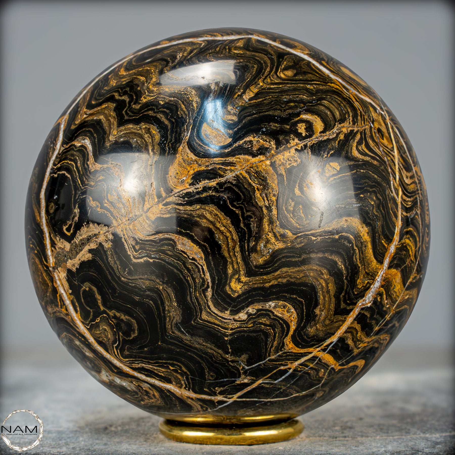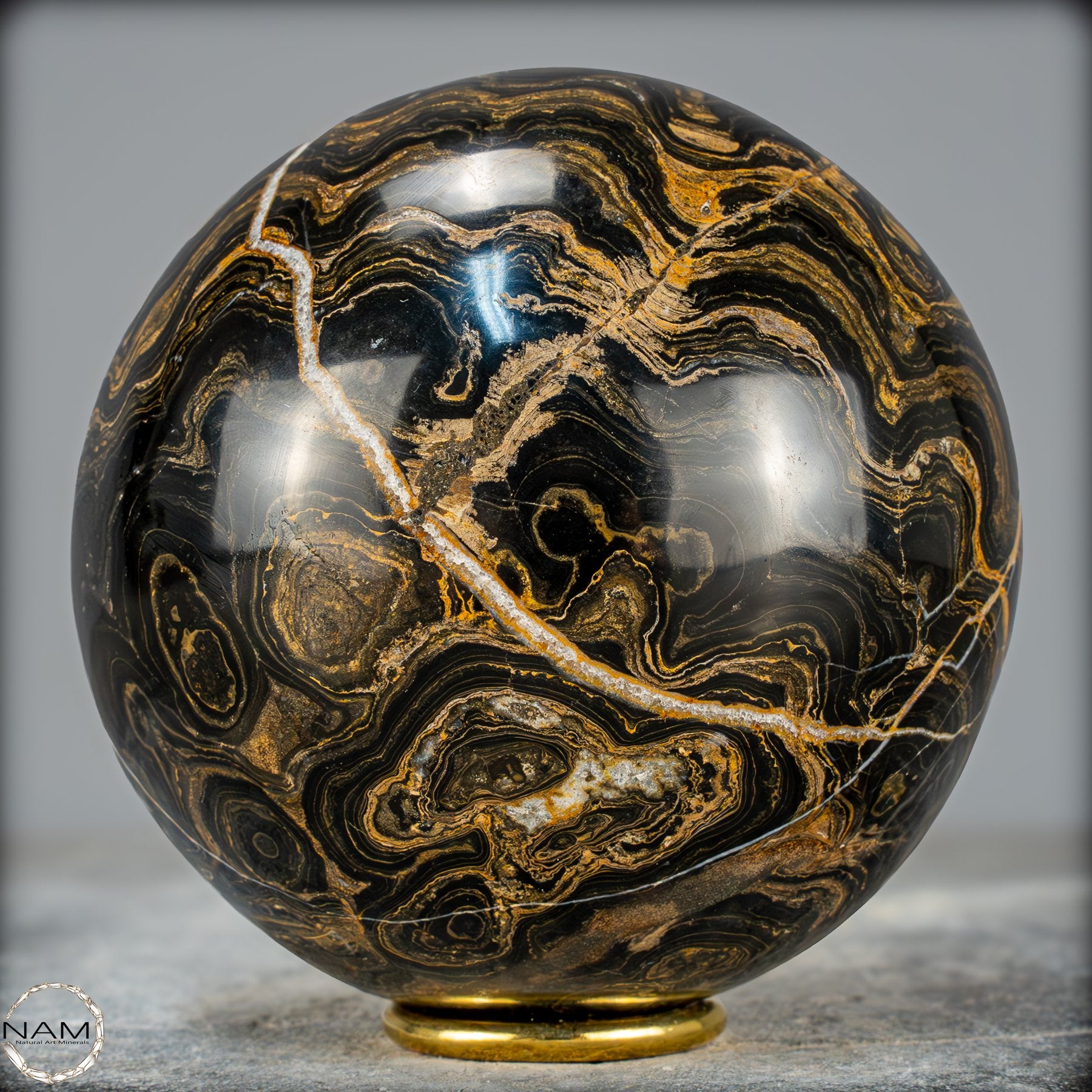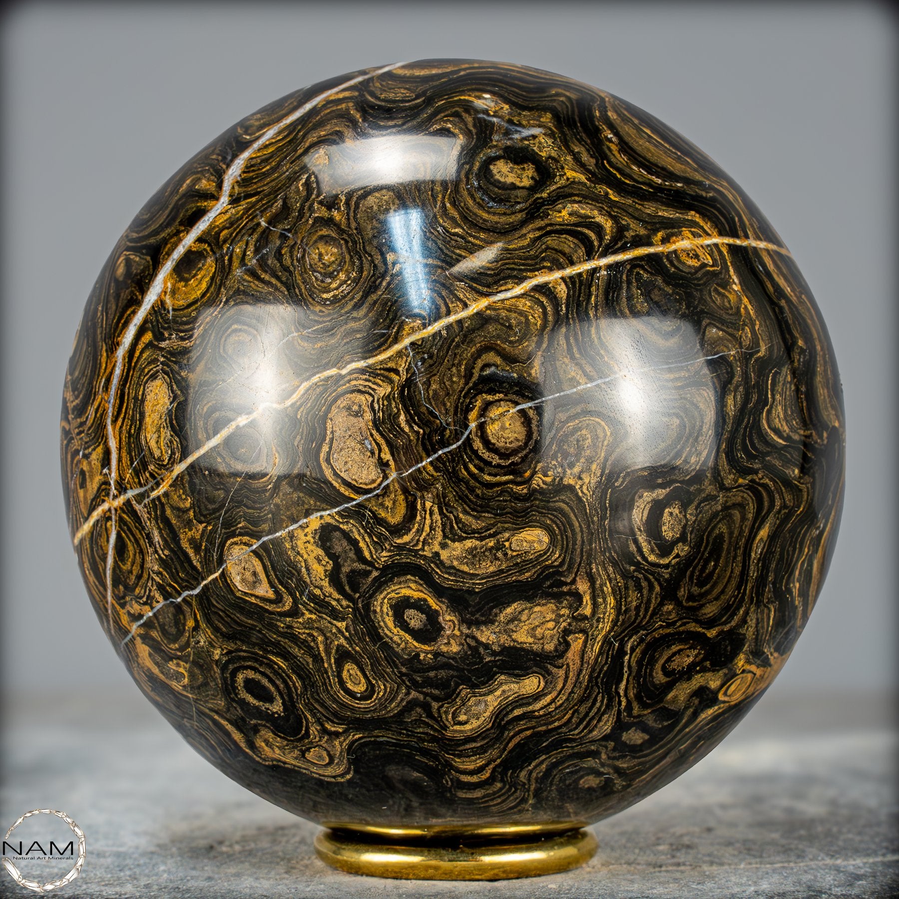 Zum Verkauf steht eine beeindruckende Strombolith-Kugel. Diese einzigartige Kugel zeigt die charakteristischen geschichteten Muster und wellenförmigen Strukturen, die durch die Ablagerungen von Mikroorganismen über Millionen von Jahren entstanden sind. Die Kugel wurde sorgfältig poliert, um die natürlichen Farben und Schichten des Gesteins hervorzuheben.