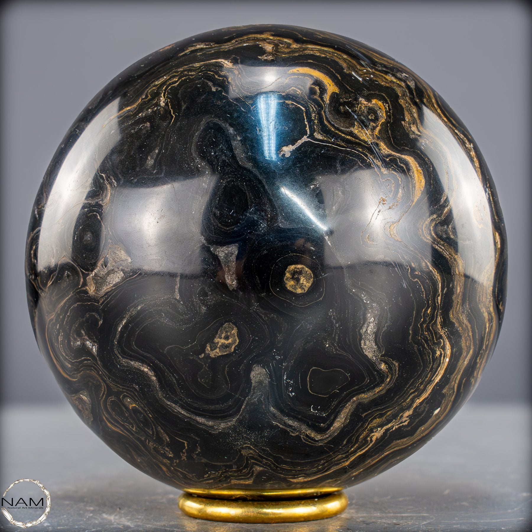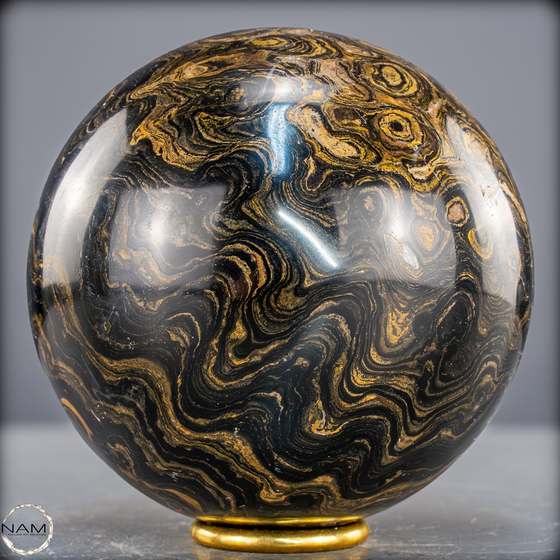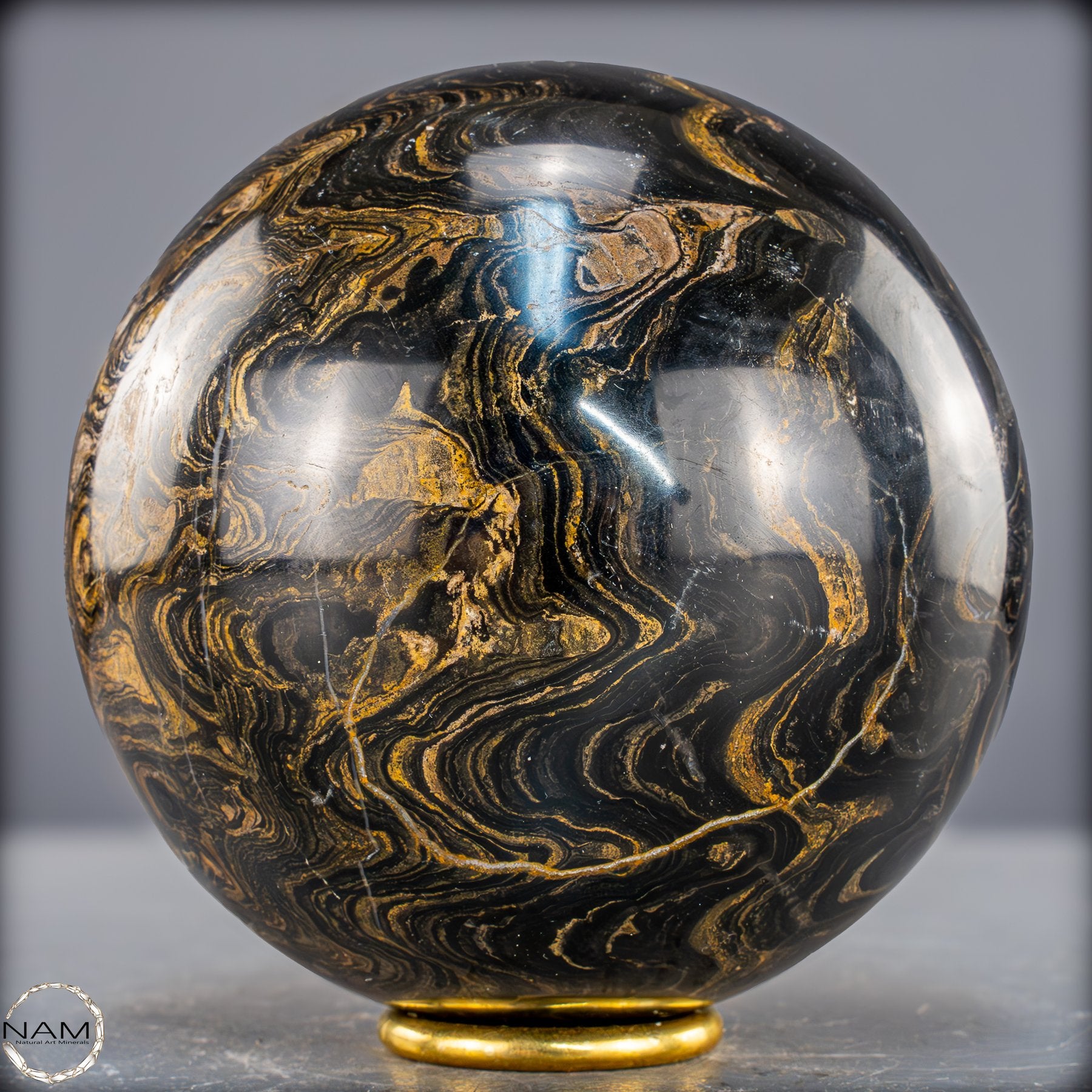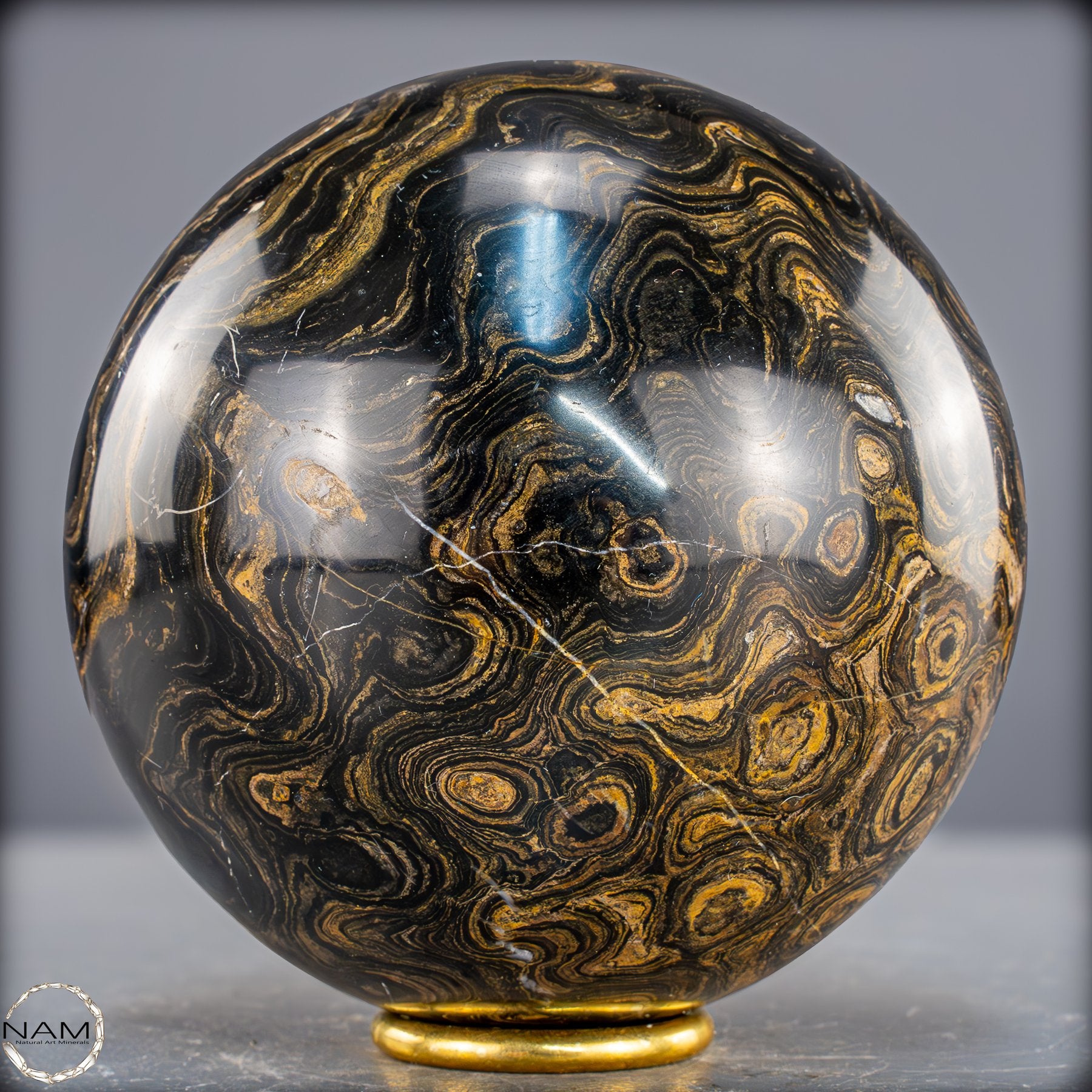 Zum Verkauf steht eine beeindruckende Strombolith-Kugel. Diese einzigartige Kugel zeigt die charakteristischen geschichteten Muster und wellenförmigen Strukturen, die durch die Ablagerungen von Mikroorganismen über Millionen von Jahren entstanden sind. Die Kugel wurde sorgfältig poliert, um die natürlichen Farben und Schichten des Gesteins hervorzuheben.