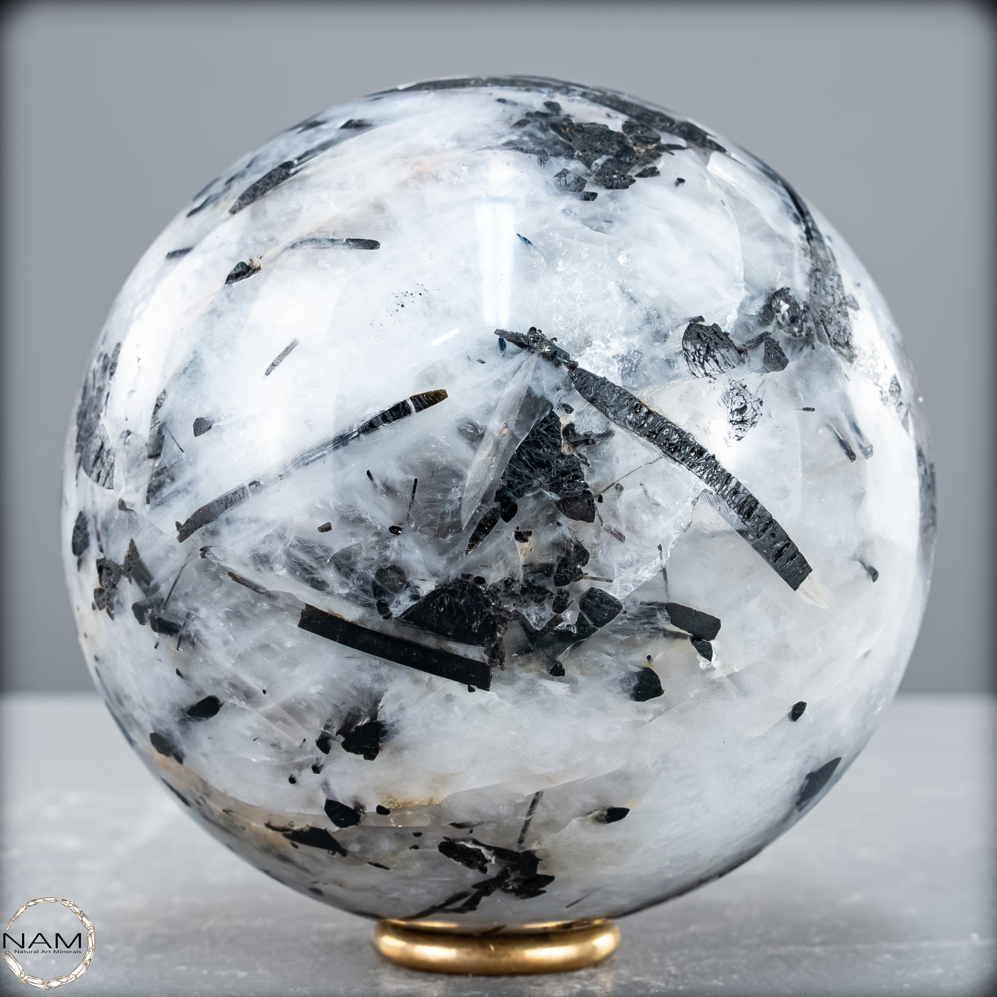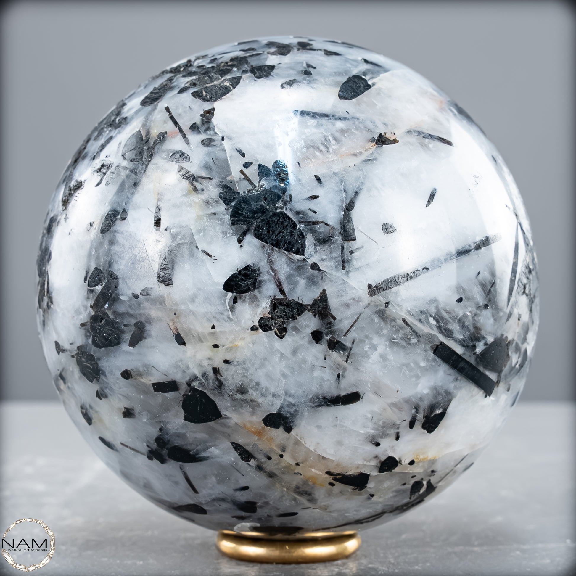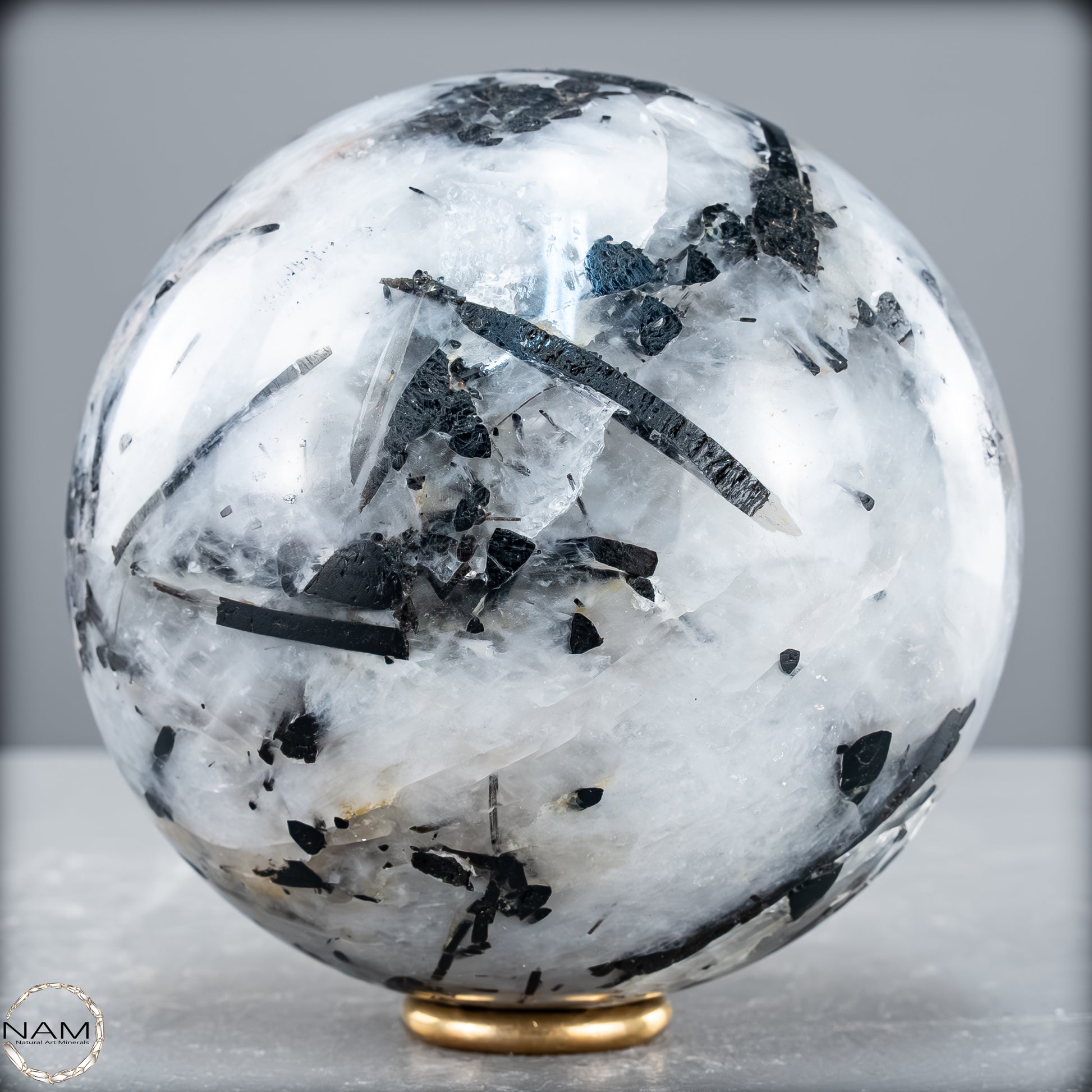 Diese Kugel aus Turmalinquarz zeigt ein kraftvolles Spiel aus Licht und Schatten: Klare, teils wolkig strukturierte Quarzmatrix durchzieht ein kontrastreiches Geflecht aus nadeligen und tafelförmigen schwarzen Turmalin-Einschlüssen (Schorl). Besonders eindrucksvoll sind die langen, parallel verlaufenden Kristalle, die wie eingefrorene Bewegung im Kristall erscheinen – ein faszinierendes Zusammenspiel aus Transparenz und Struktur.