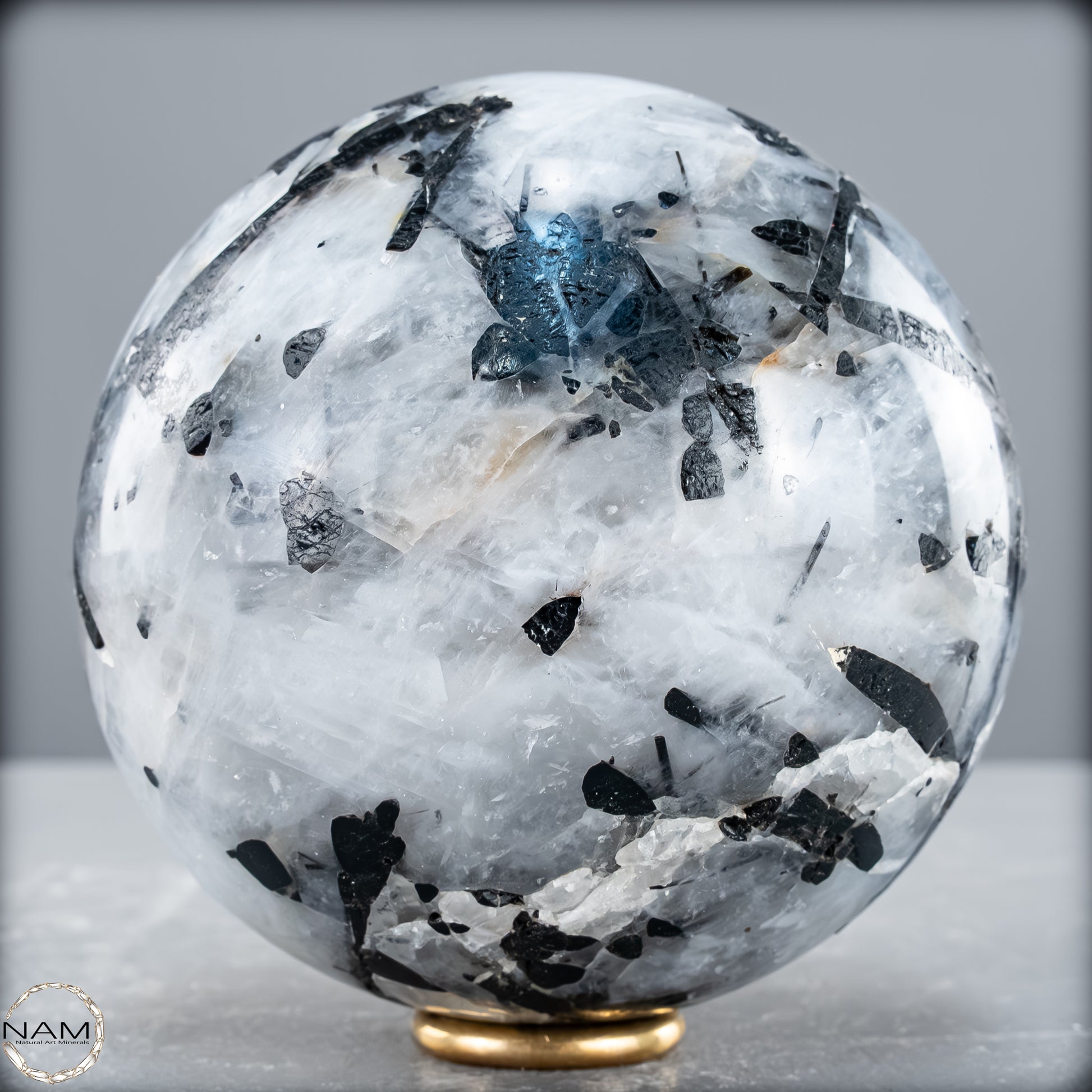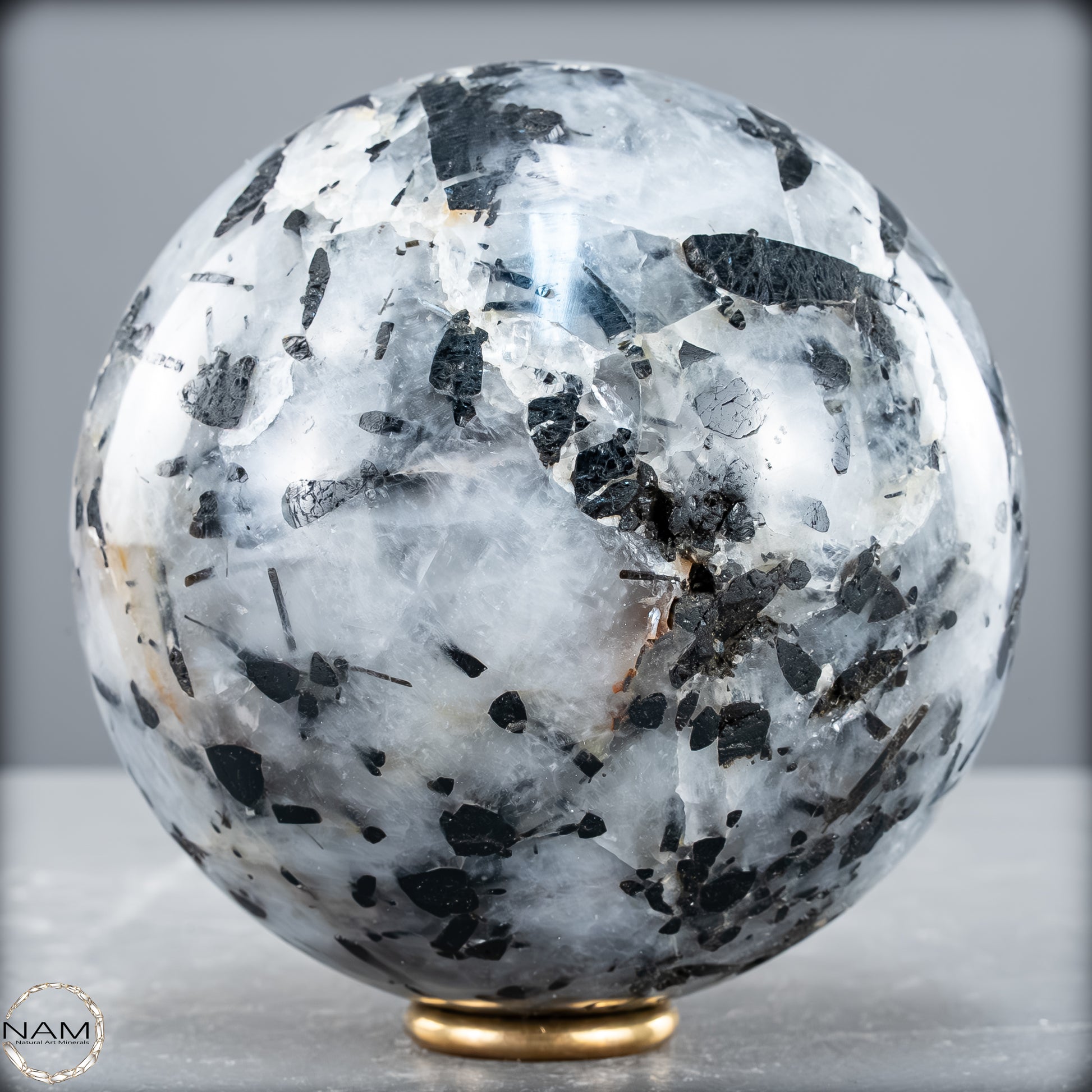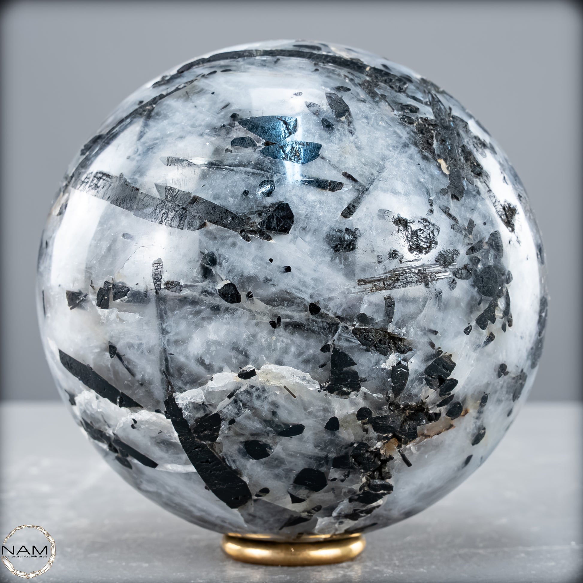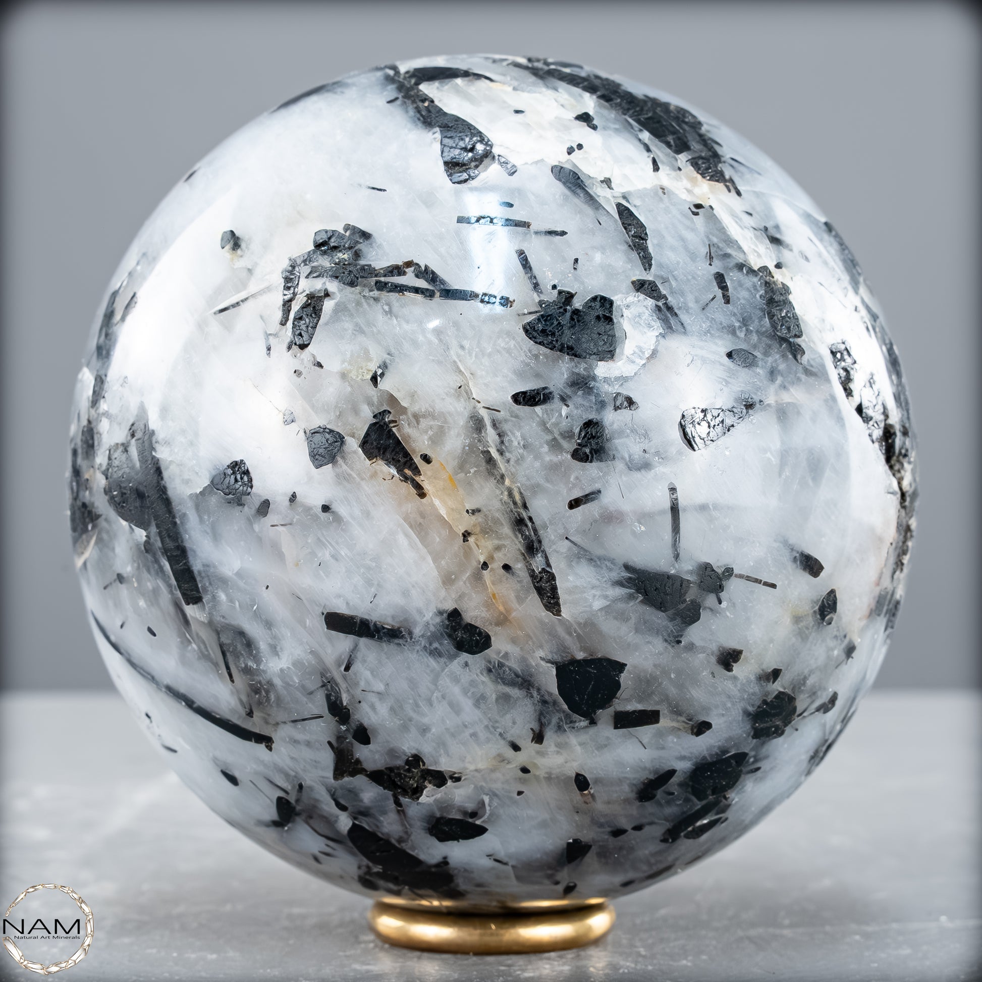 Diese Kugel aus Turmalinquarz zeigt ein kraftvolles Spiel aus Licht und Schatten: Klare, teils wolkig strukturierte Quarzmatrix durchzieht ein kontrastreiches Geflecht aus nadeligen und tafelförmigen schwarzen Turmalin-Einschlüssen (Schorl). Besonders eindrucksvoll sind die langen, parallel verlaufenden Kristalle, die wie eingefrorene Bewegung im Kristall erscheinen – ein faszinierendes Zusammenspiel aus Transparenz und Struktur.