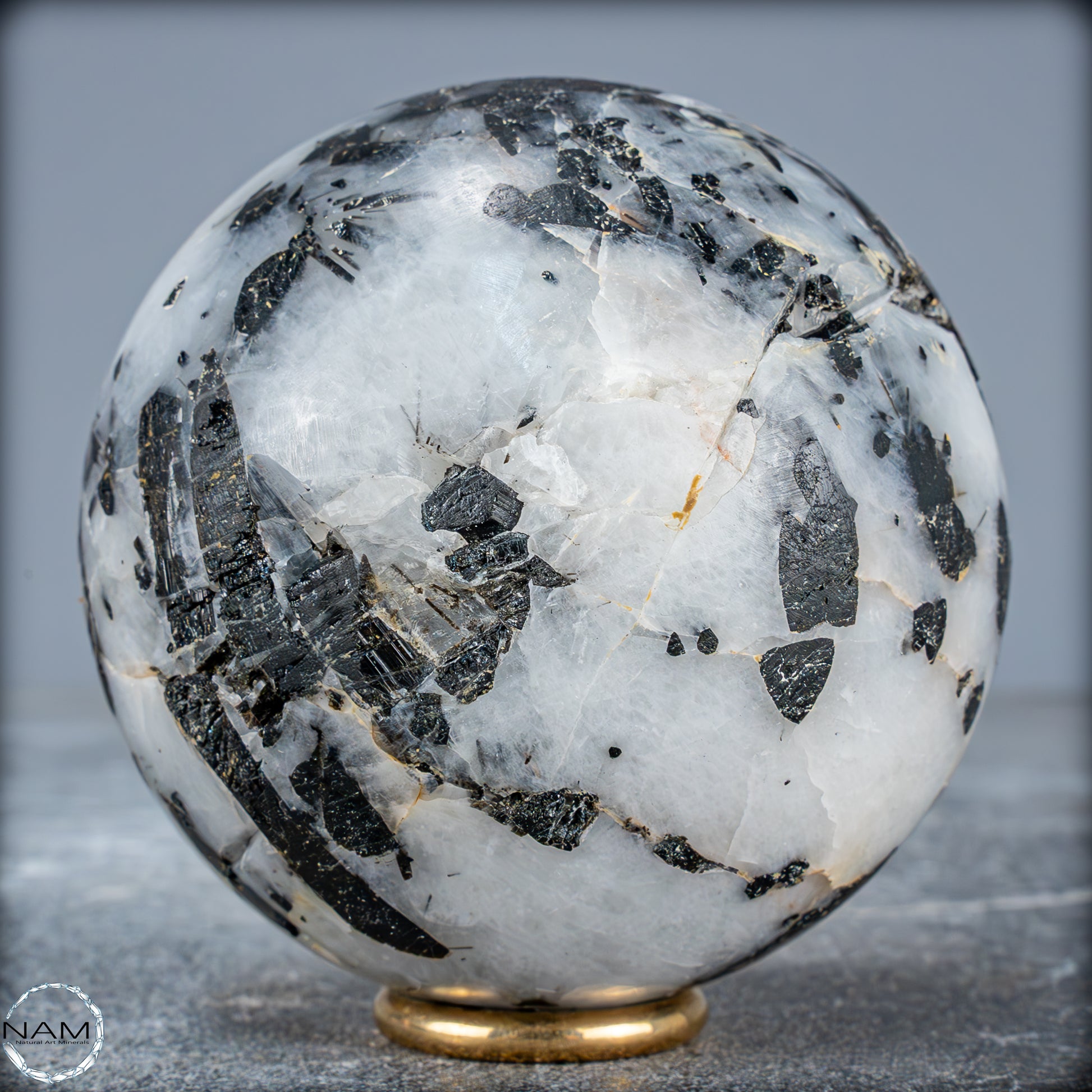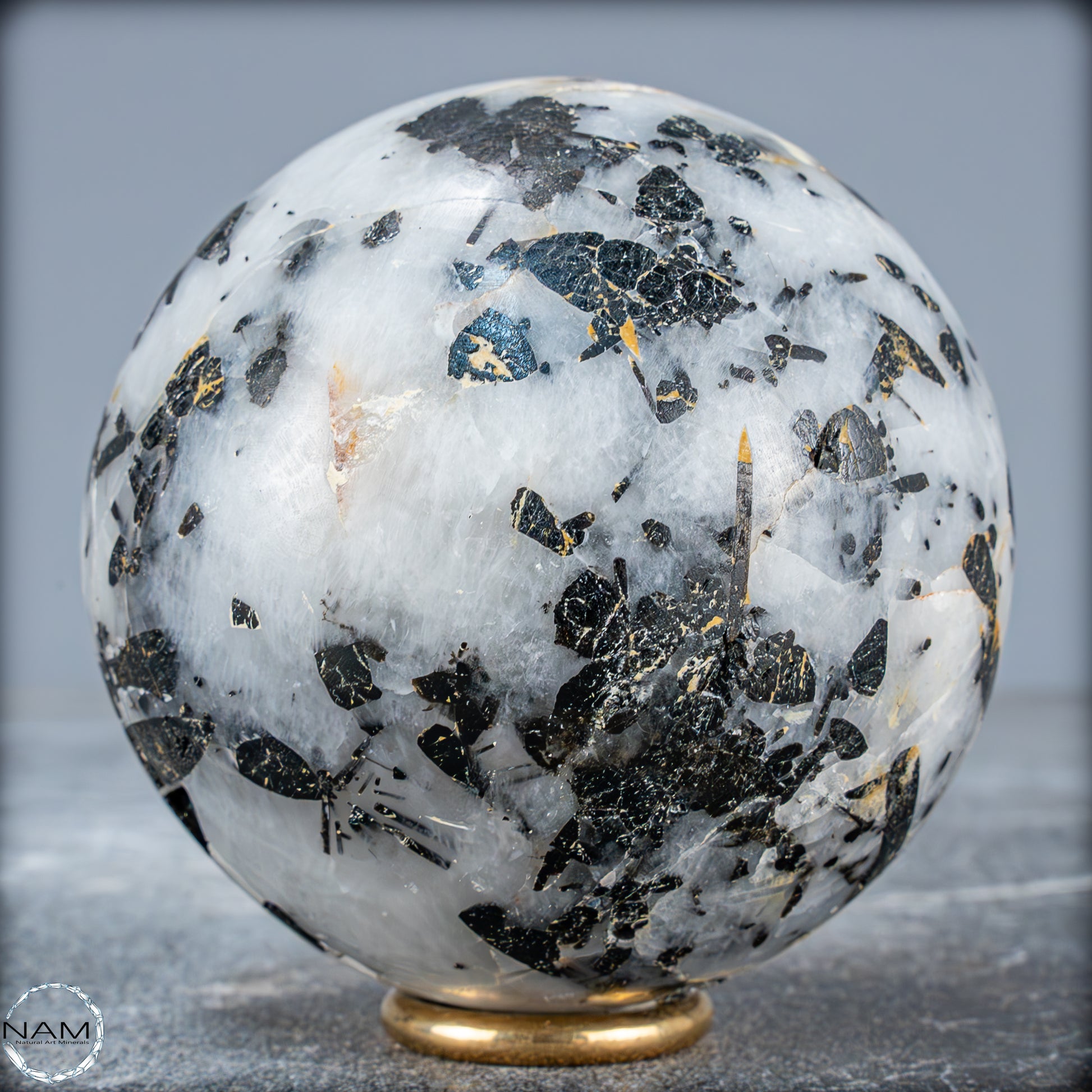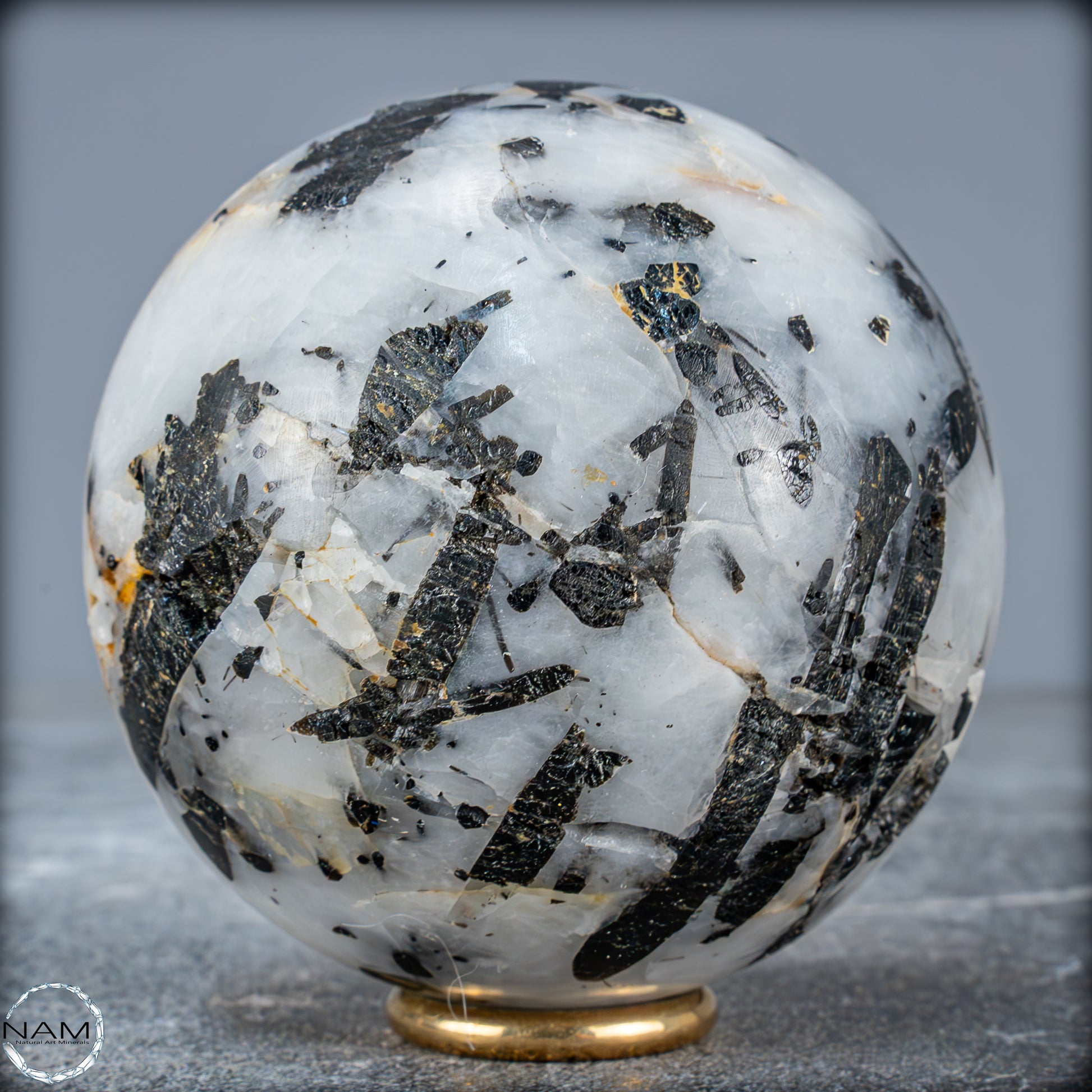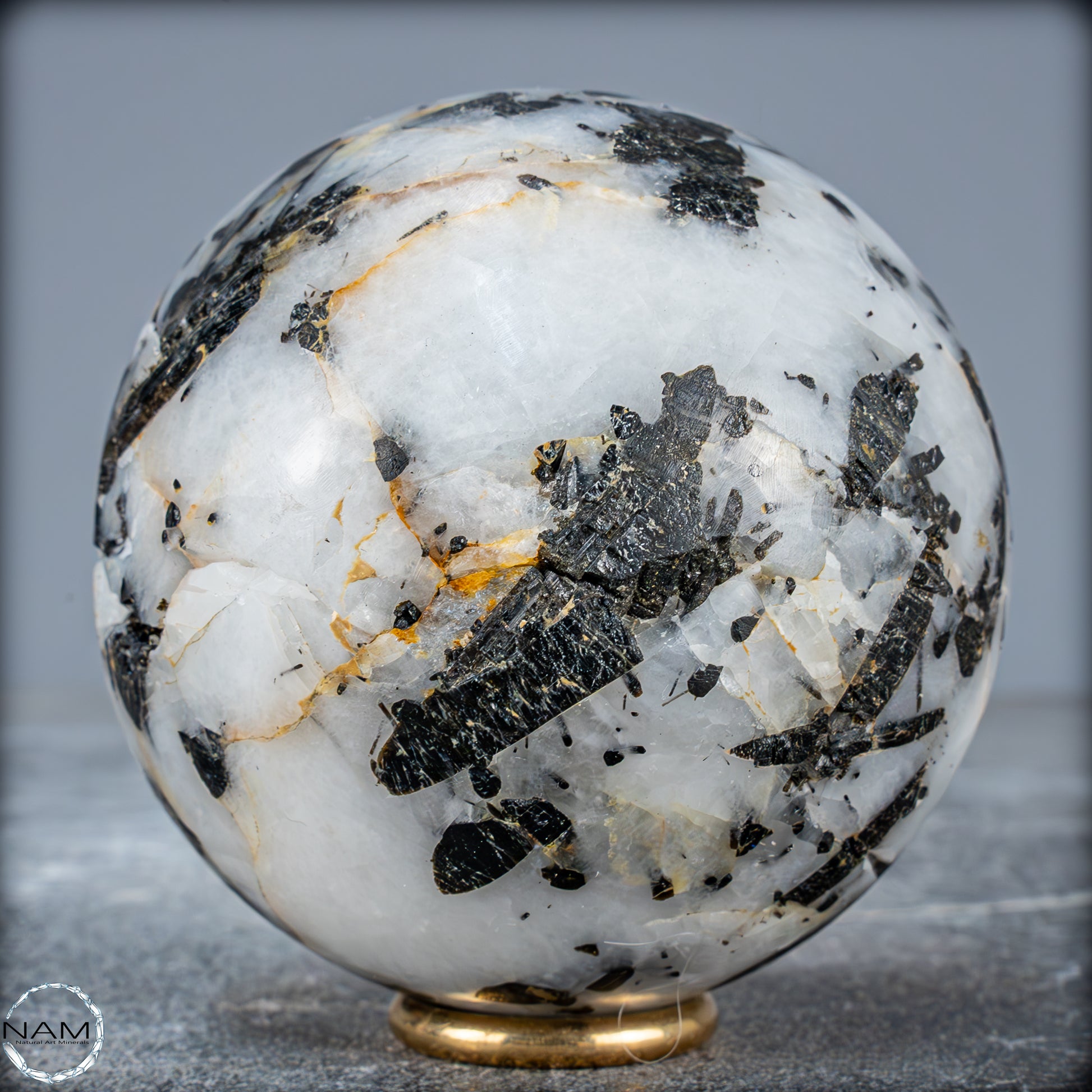 Diese Kugel aus Turmalinquarz zeigt ein kraftvolles Spiel aus Licht und Schatten: Klare, teils wolkig strukturierte Quarzmatrix durchzieht ein kontrastreiches Geflecht aus nadeligen und tafelförmigen schwarzen Turmalin-Einschlüssen (Schorl). Besonders eindrucksvoll sind die langen, parallel verlaufenden Kristalle, die wie eingefrorene Bewegung im Kristall erscheinen – ein faszinierendes Zusammenspiel aus Transparenz und Struktur.
