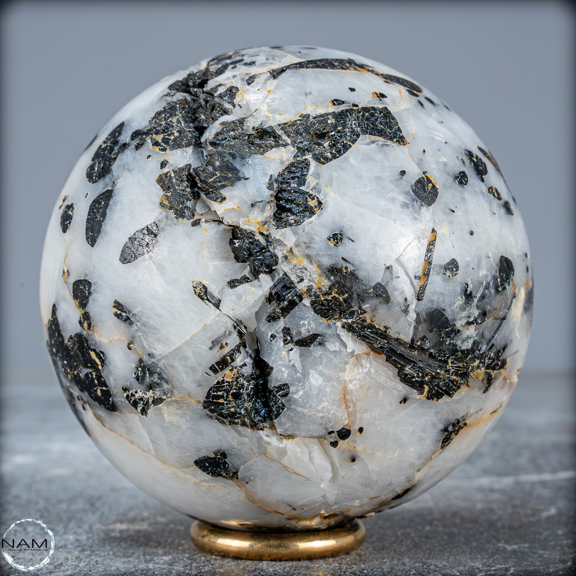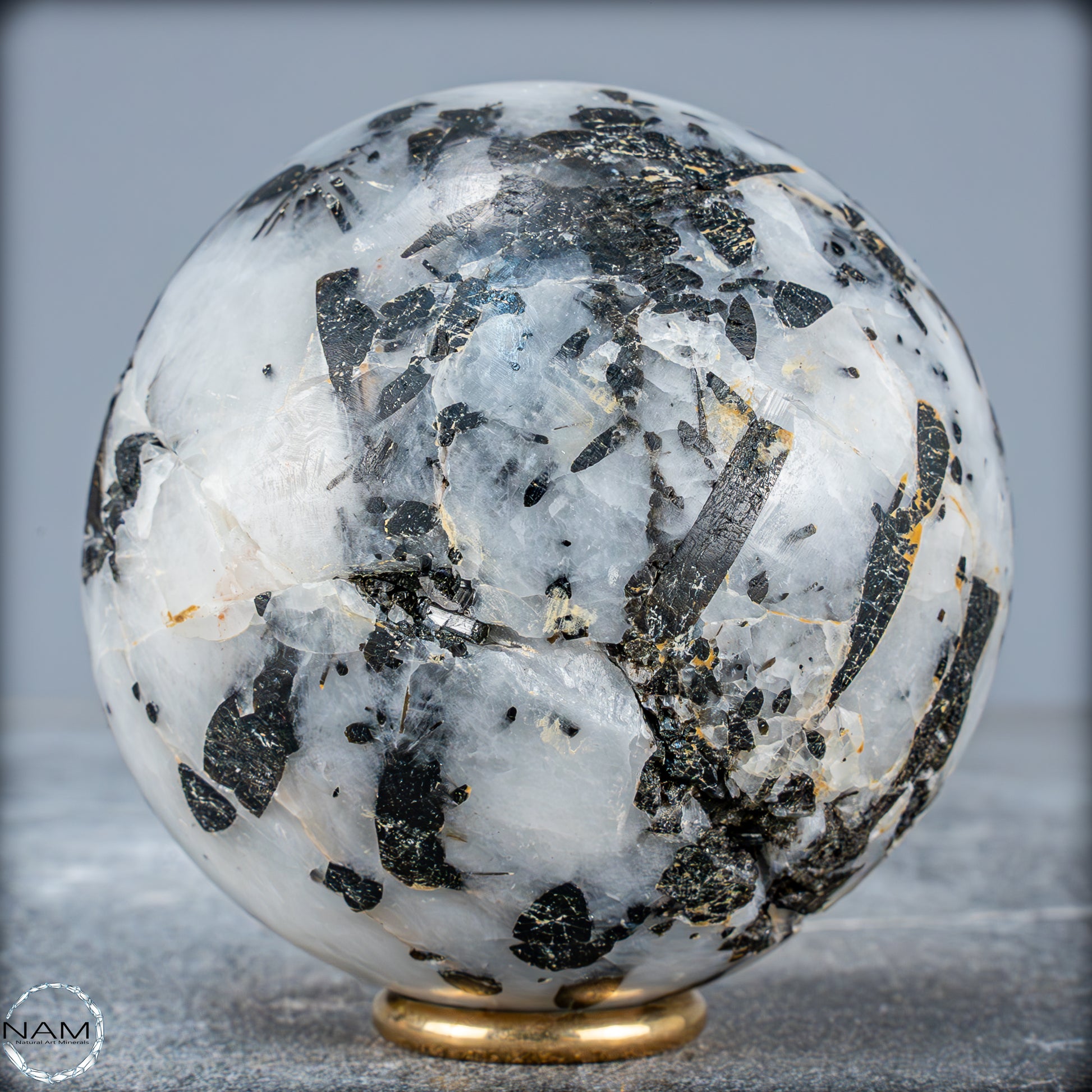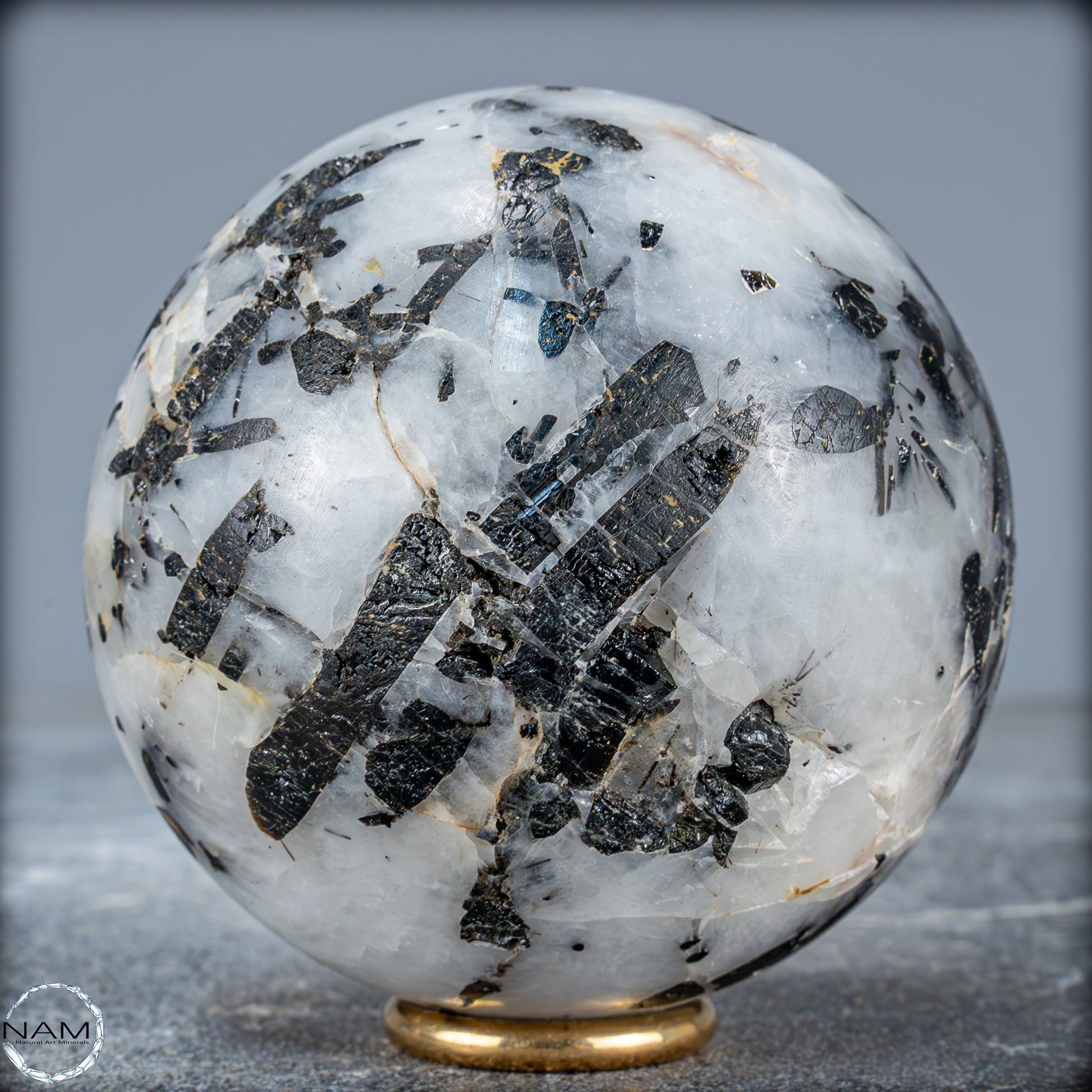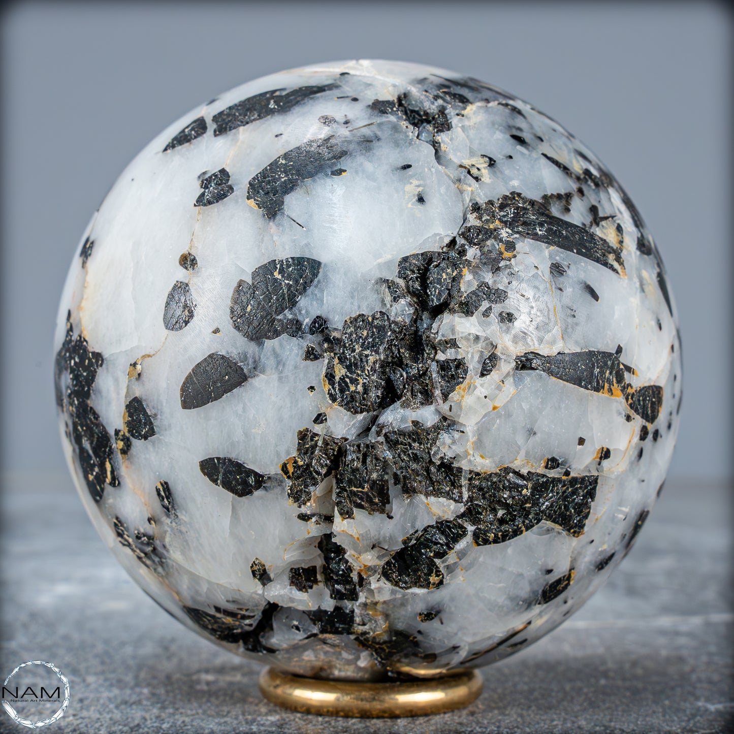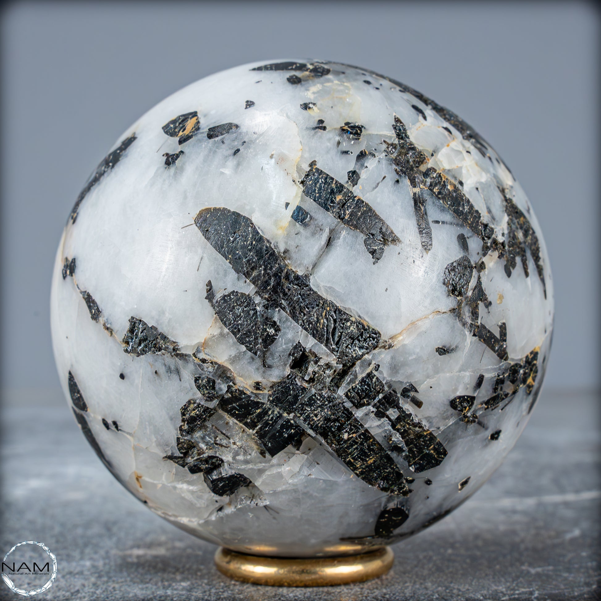 Diese Kugel aus Turmalinquarz zeigt ein kraftvolles Spiel aus Licht und Schatten: Klare, teils wolkig strukturierte Quarzmatrix durchzieht ein kontrastreiches Geflecht aus nadeligen und tafelförmigen schwarzen Turmalin-Einschlüssen (Schorl). Besonders eindrucksvoll sind die langen, parallel verlaufenden Kristalle, die wie eingefrorene Bewegung im Kristall erscheinen – ein faszinierendes Zusammenspiel aus Transparenz und Struktur.