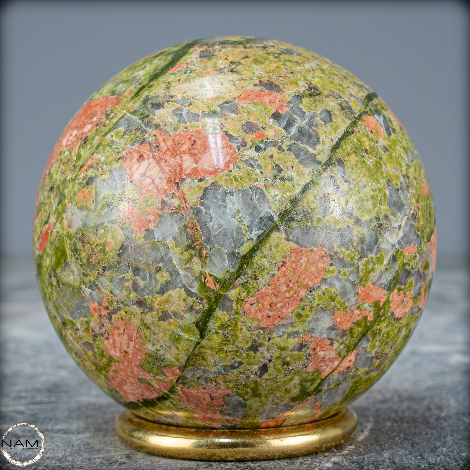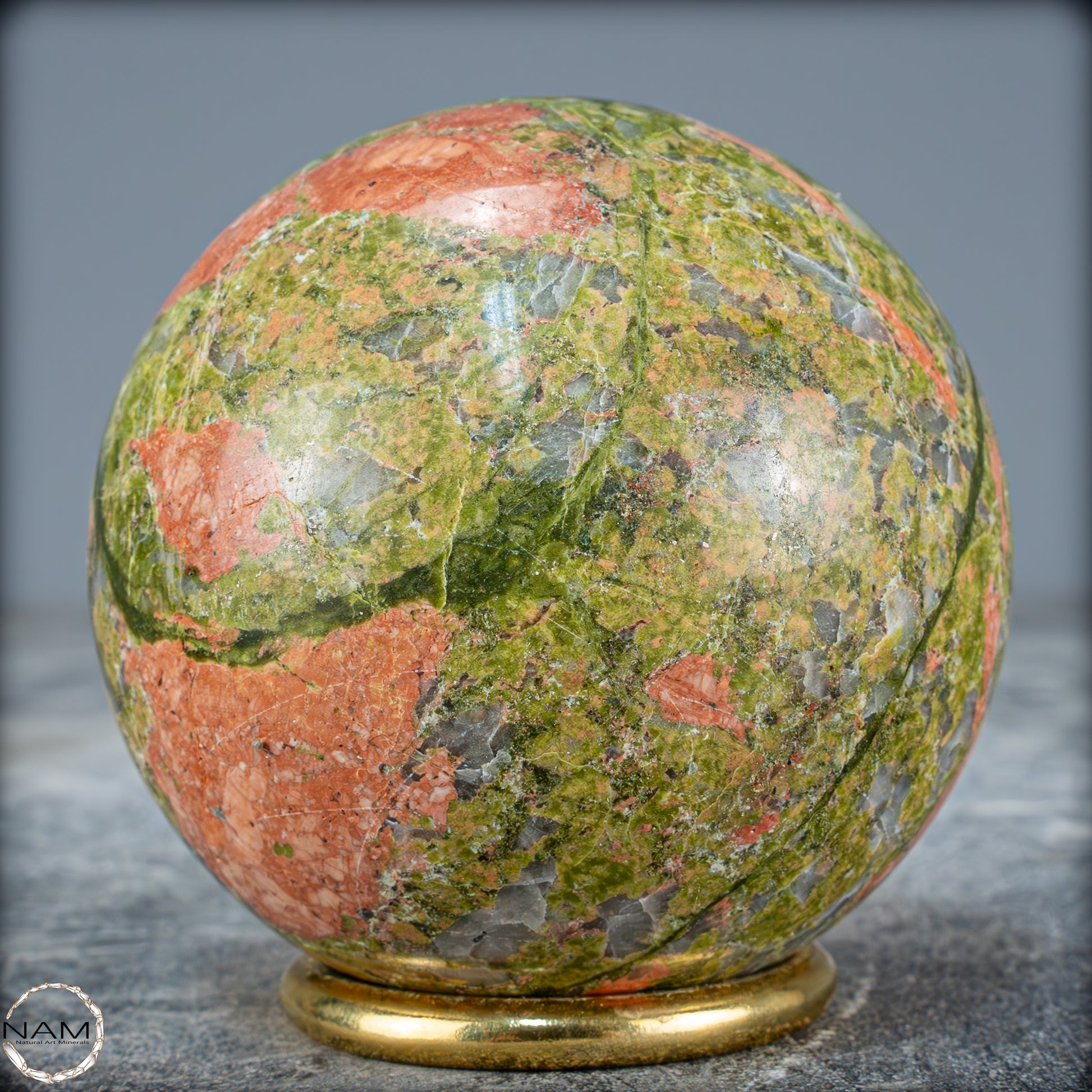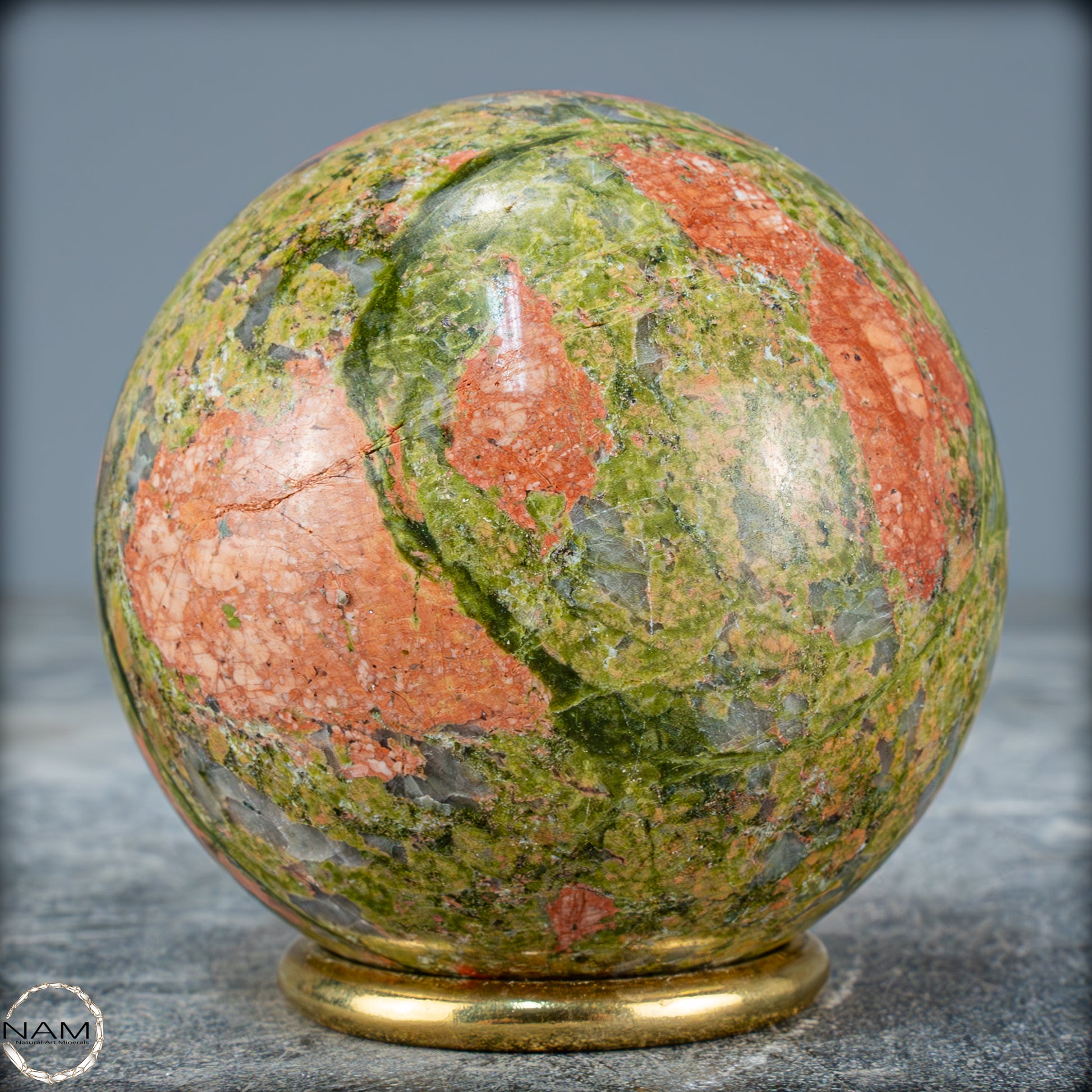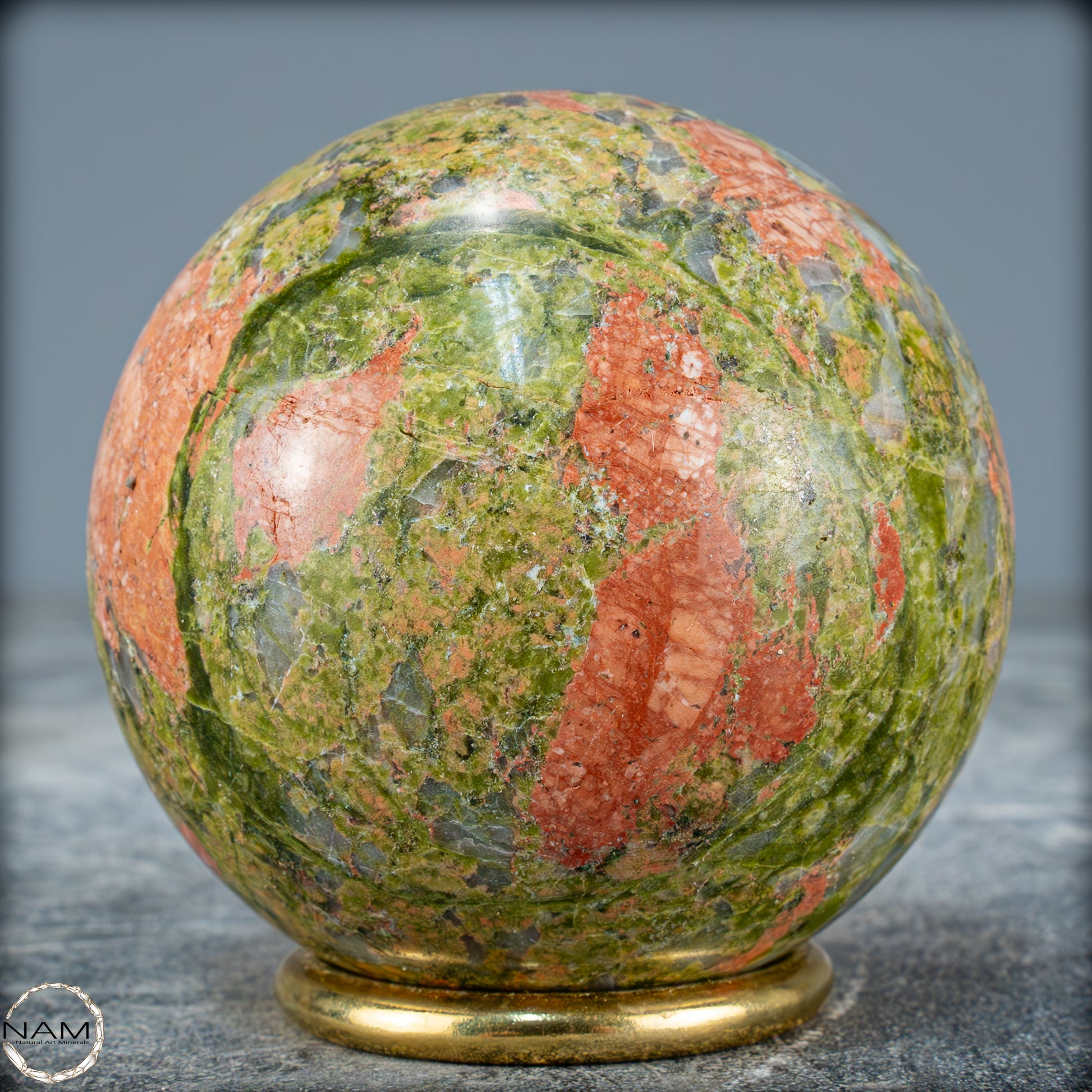 Diese farbenfrohe Kugel aus Unakit zeigt ein lebendiges Zusammenspiel aus olivgrünem Epidot, rosafarbenem bis ziegelrotem Feldspat und klaren bis gräulichen Quarzanteilen. Die natürliche Textur ist geprägt von unregelmäßigen Farbflächen und feinen Maserungen, die dem Stein eine organische, beinahe malerische Erscheinung verleihen. Besonders reizvoll ist der Kontrast zwischen dem erdigen Grün und den warmen Rottönen, die sich harmonisch ineinanderfügen.
