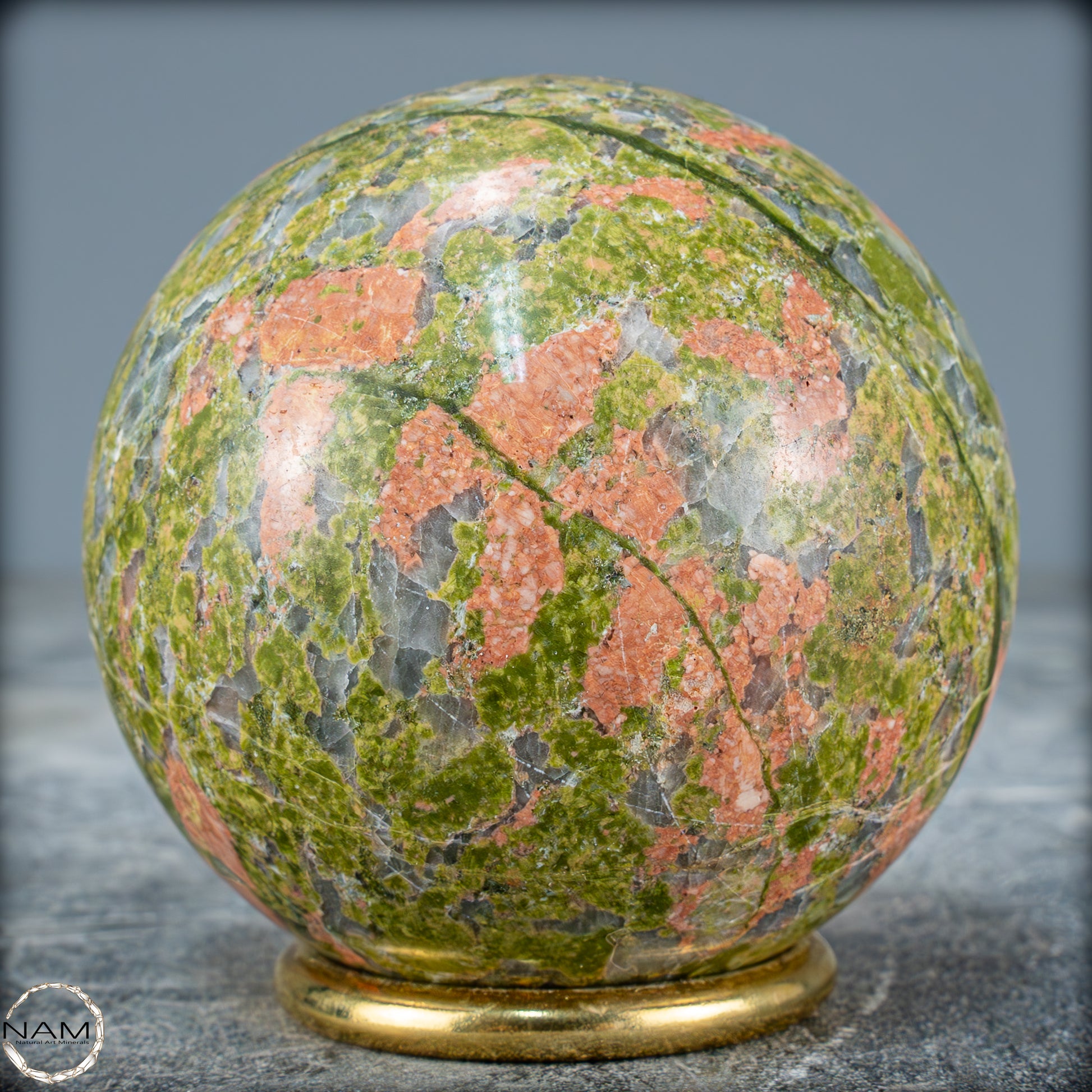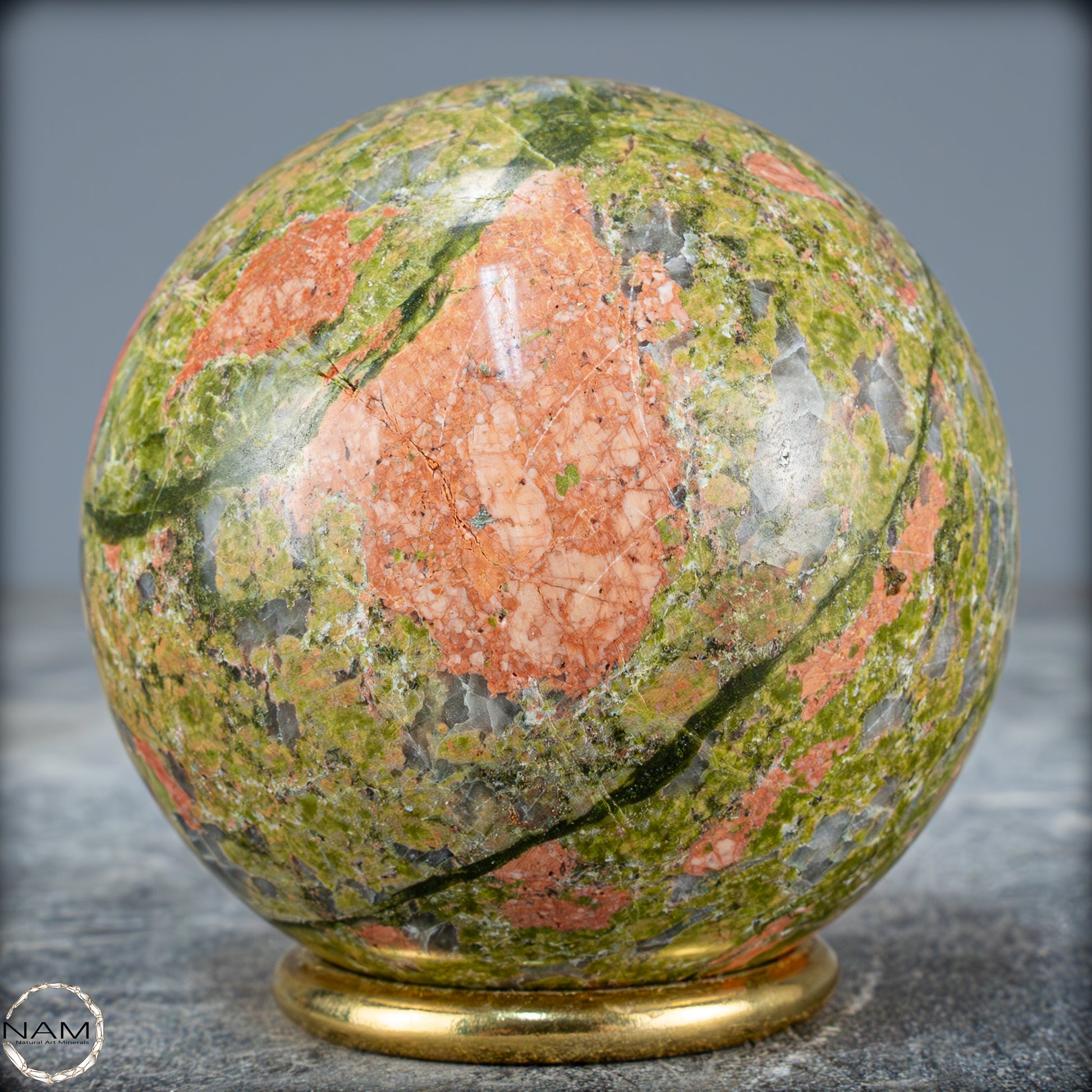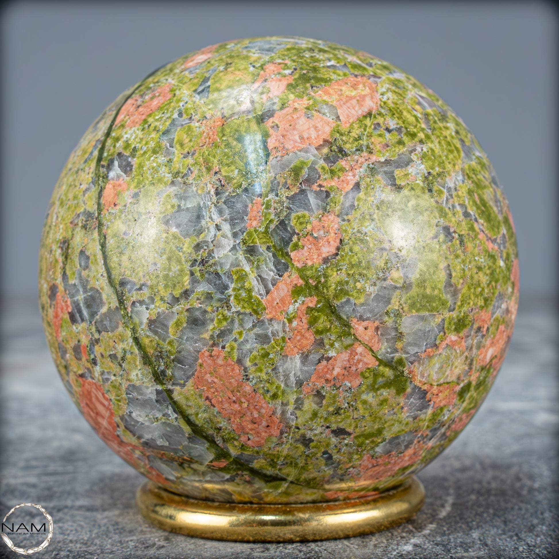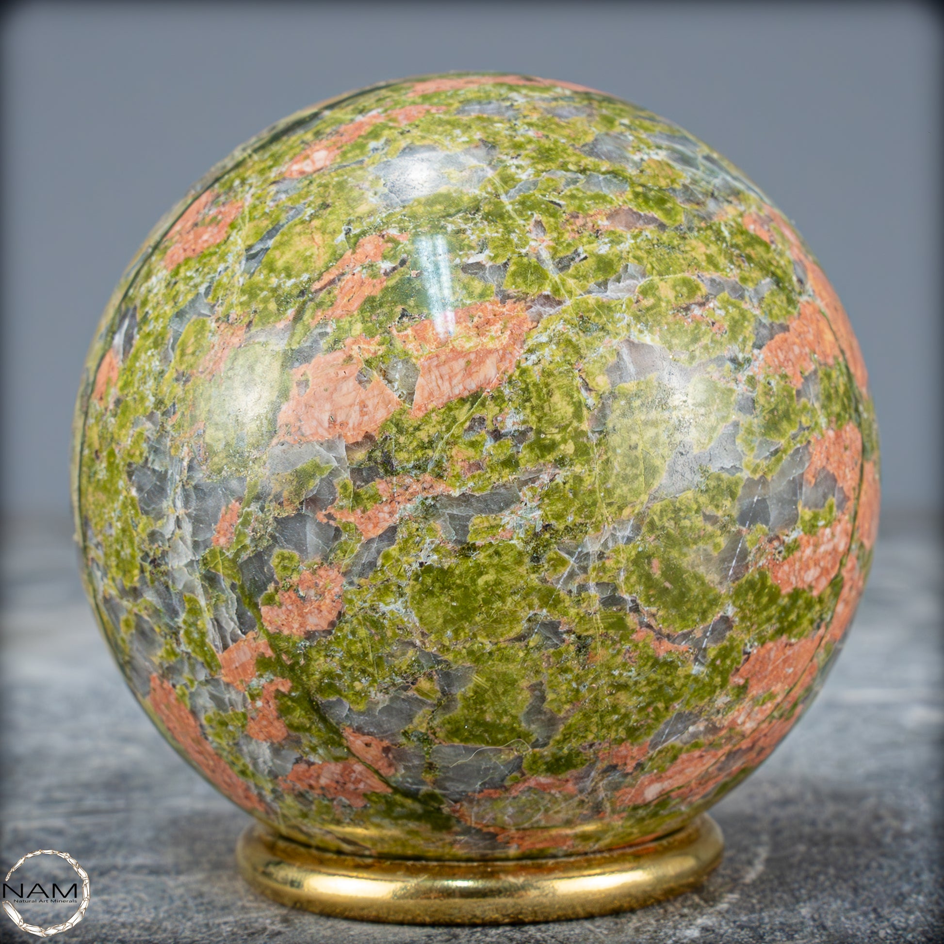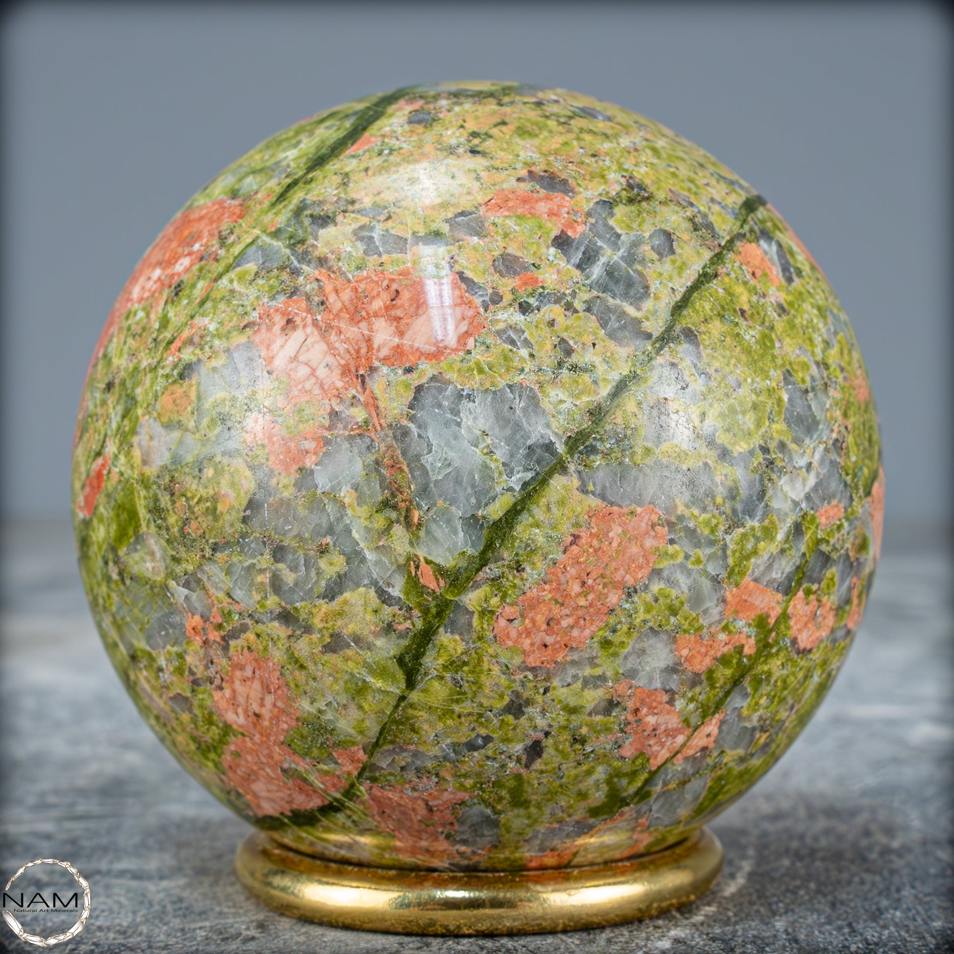 Diese farbenfrohe Kugel aus Unakit zeigt ein lebendiges Zusammenspiel aus olivgrünem Epidot, rosafarbenem bis ziegelrotem Feldspat und klaren bis gräulichen Quarzanteilen. Die natürliche Textur ist geprägt von unregelmäßigen Farbflächen und feinen Maserungen, die dem Stein eine organische, beinahe malerische Erscheinung verleihen. Besonders reizvoll ist der Kontrast zwischen dem erdigen Grün und den warmen Rottönen, die sich harmonisch ineinanderfügen.