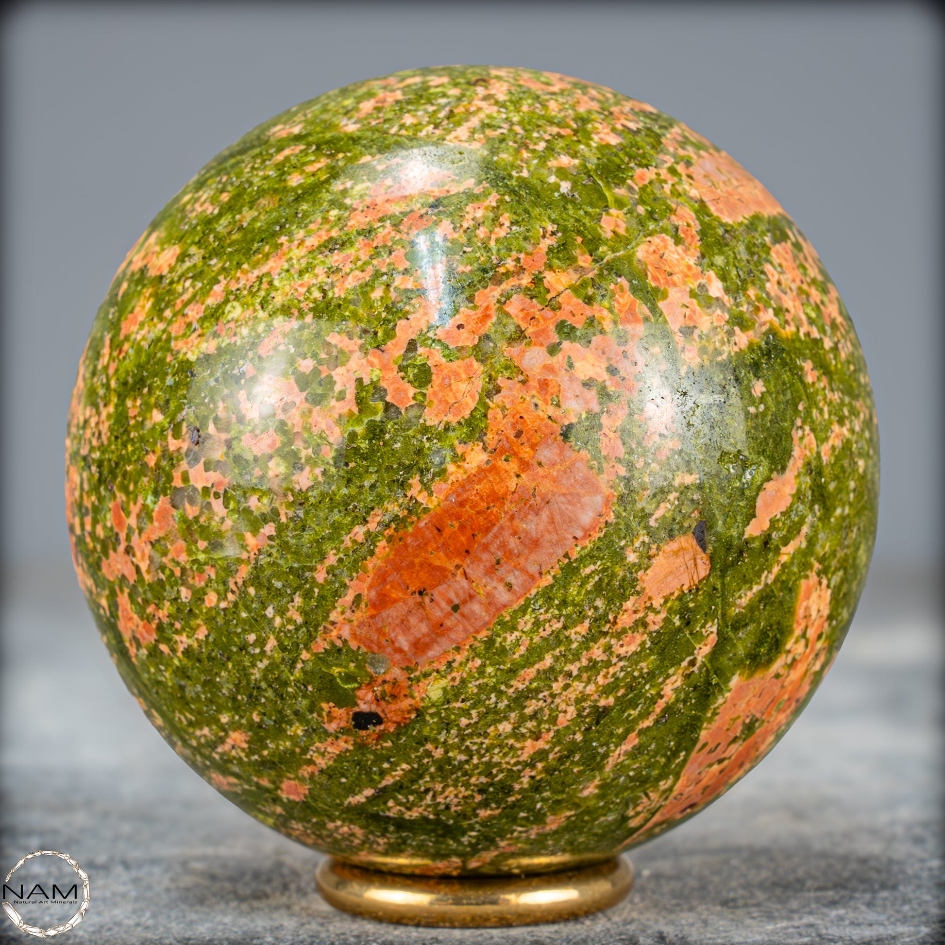 Diese farbenfrohe Kugel aus Unakit zeigt ein lebendiges Zusammenspiel aus olivgrünem Epidot, rosafarbenem bis ziegelrotem Feldspat und klaren bis gräulichen Quarzanteilen. Die natürliche Textur ist geprägt von unregelmäßigen Farbflächen und feinen Maserungen, die dem Stein eine organische, beinahe malerische Erscheinung verleihen. Besonders reizvoll ist der Kontrast zwischen dem erdigen Grün und den warmen Rottönen, die sich harmonisch ineinanderfügen.