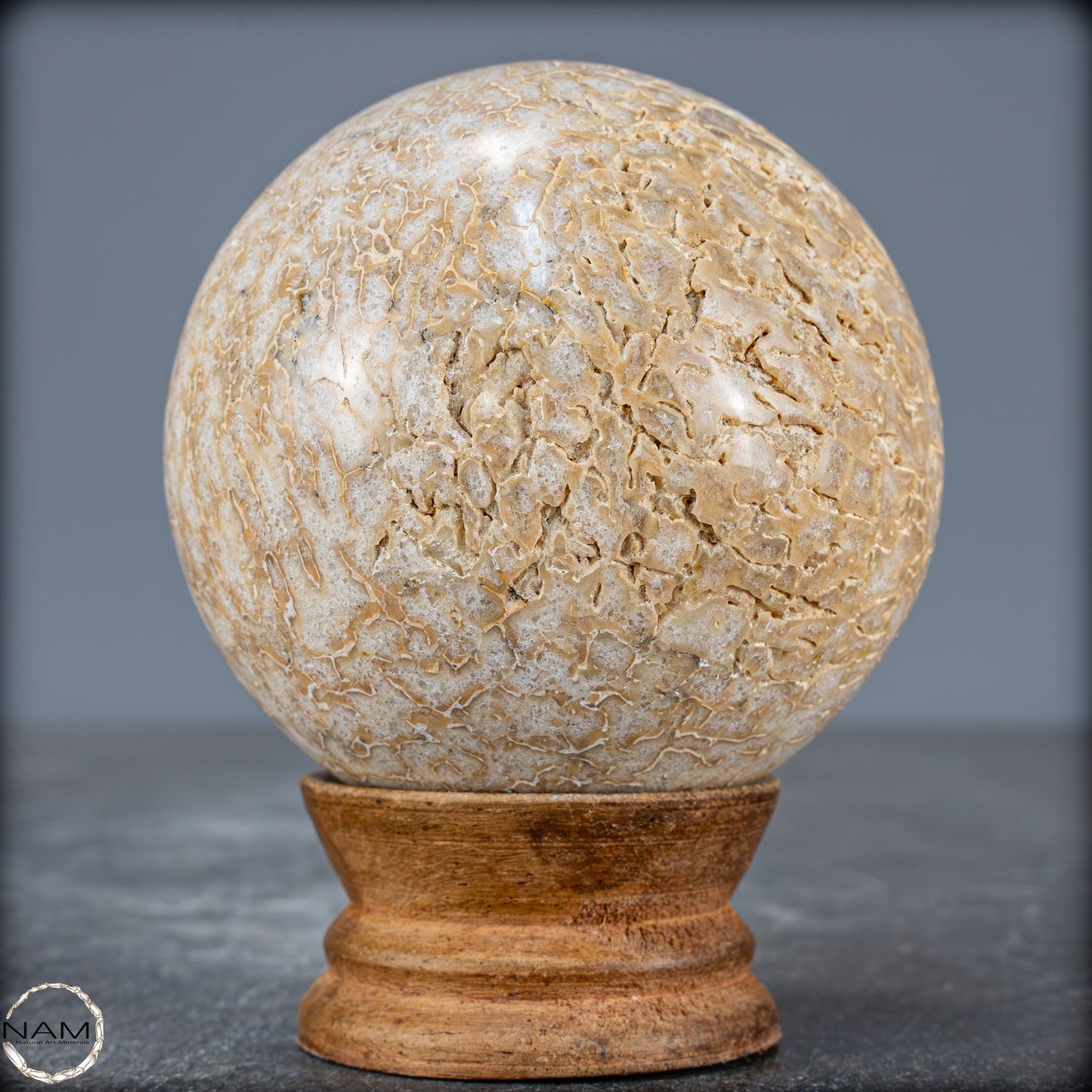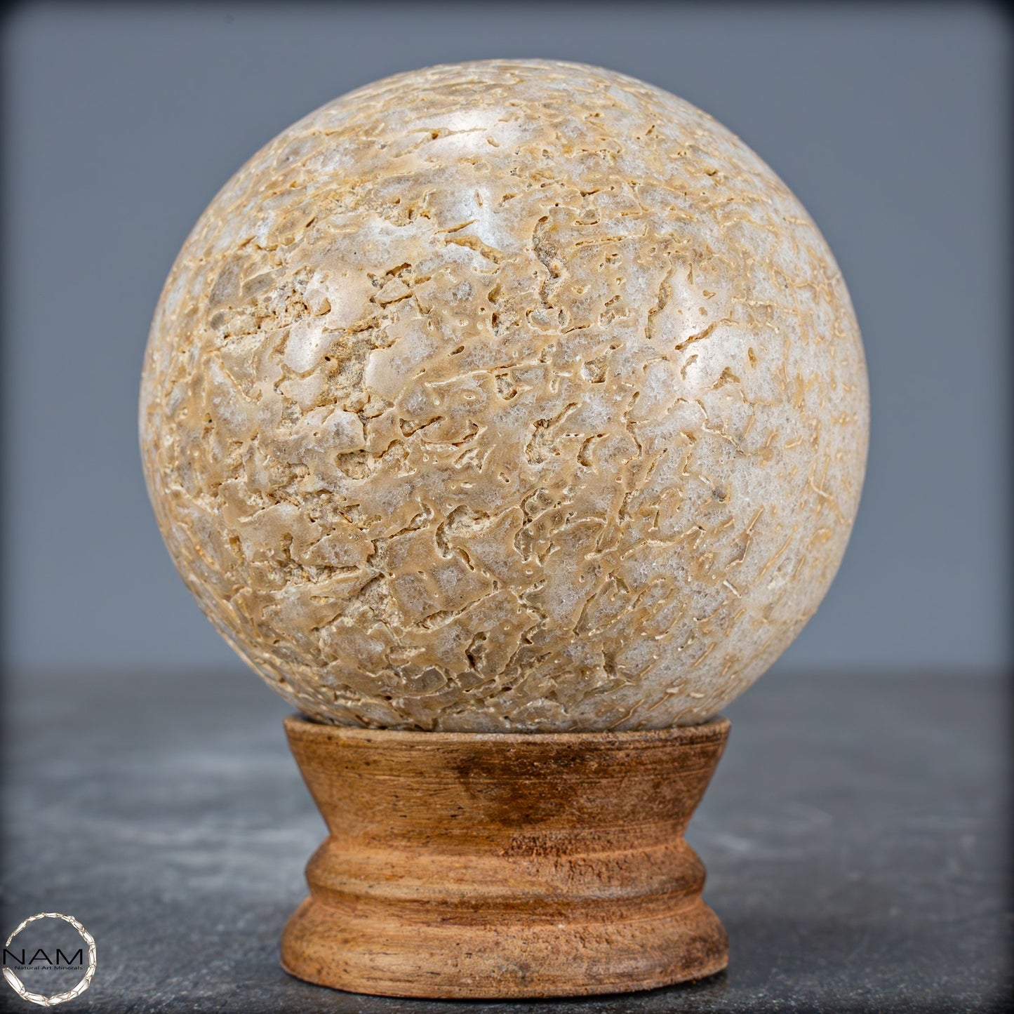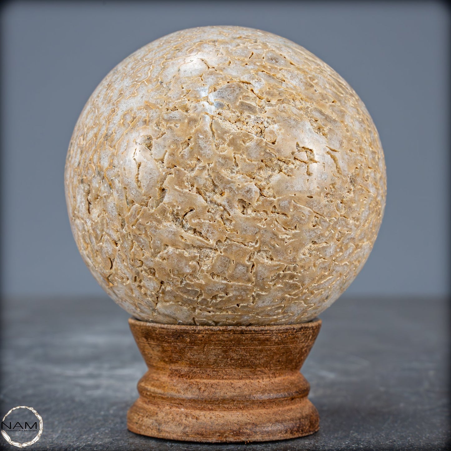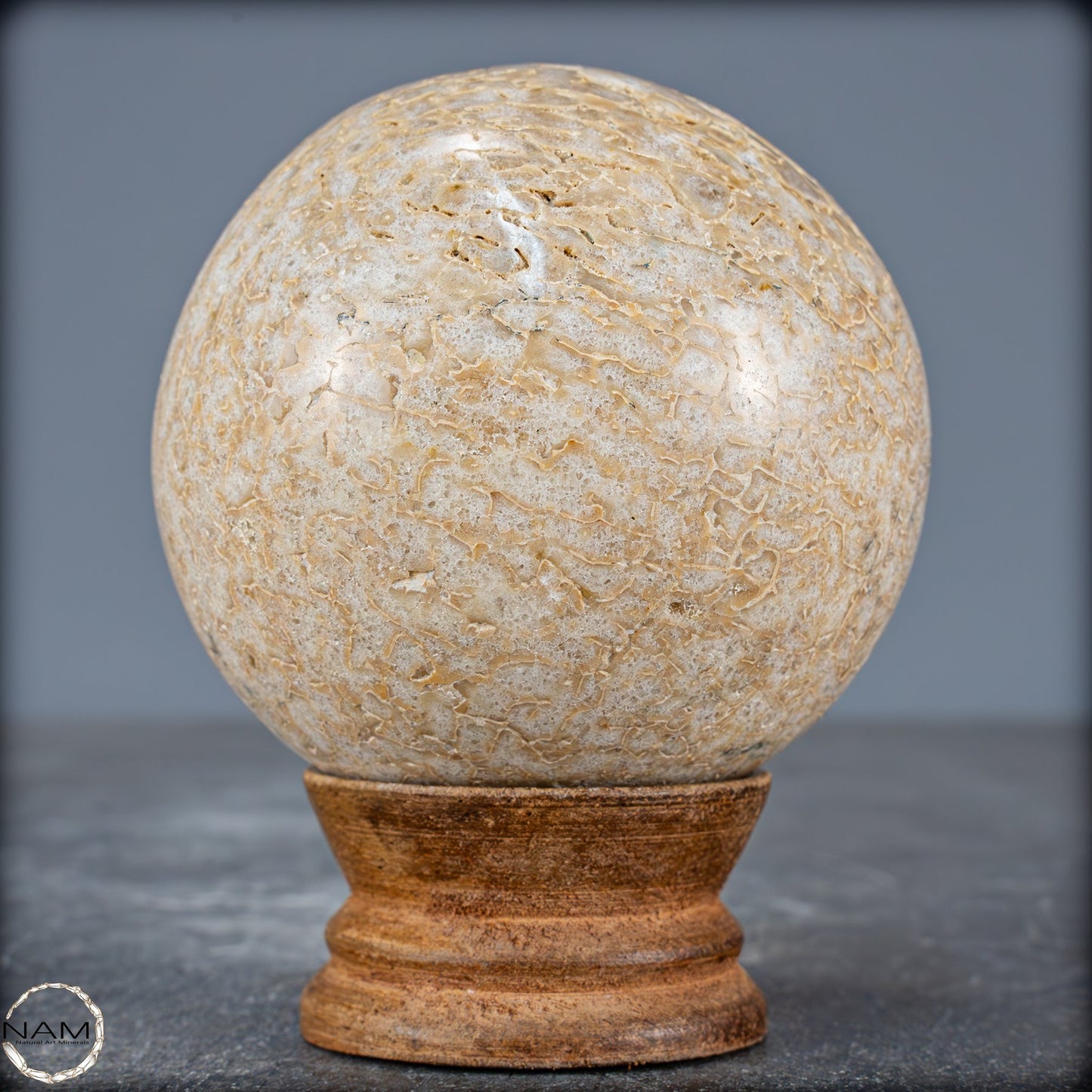 Diese faszinierende Kugel aus fossilem Dinosaurierknochen ist ein einzigartiges Stück aus prähistorischen Zeiten. Die natürliche Textur und die feinen Details der versteinerten Knochenstruktur sind gut erhalten und zeigen ein beeindruckendes Muster, das die ursprüngliche biologische Beschaffenheit widerspiegelt. Die warmen, erdigen Farbtöne verleihen der Kugel eine besondere Ästhetik, während sie gleichzeitig die Geschichte einer längst vergangenen Ära zum Leben erweckt. Ein außergewöhnliches Sammlerstück für Liebhaber der Paläontologie und ein beeindruckendes Dekorationsobjekt, das in jedem Raum einen Hauch von Geschichte verleihtung und Beständigkeit und wird oft mit Themen wie dem Verständnis der eigenen Wurzeln und dem Respekt vor der Zeit assoziiert. Fossile Knochen sollen helfen, Weisheit und Einsicht zu fördern, indem sie den Träger daran erinnern, dass alles Teil eines großen evolutionären Kreislaufs ist. Diese fossile Kugel ist ein wahrhaft faszinierendes Artefakt, das sowohl ästhetisch ansprechend als auch historisch bedeutsam ist.