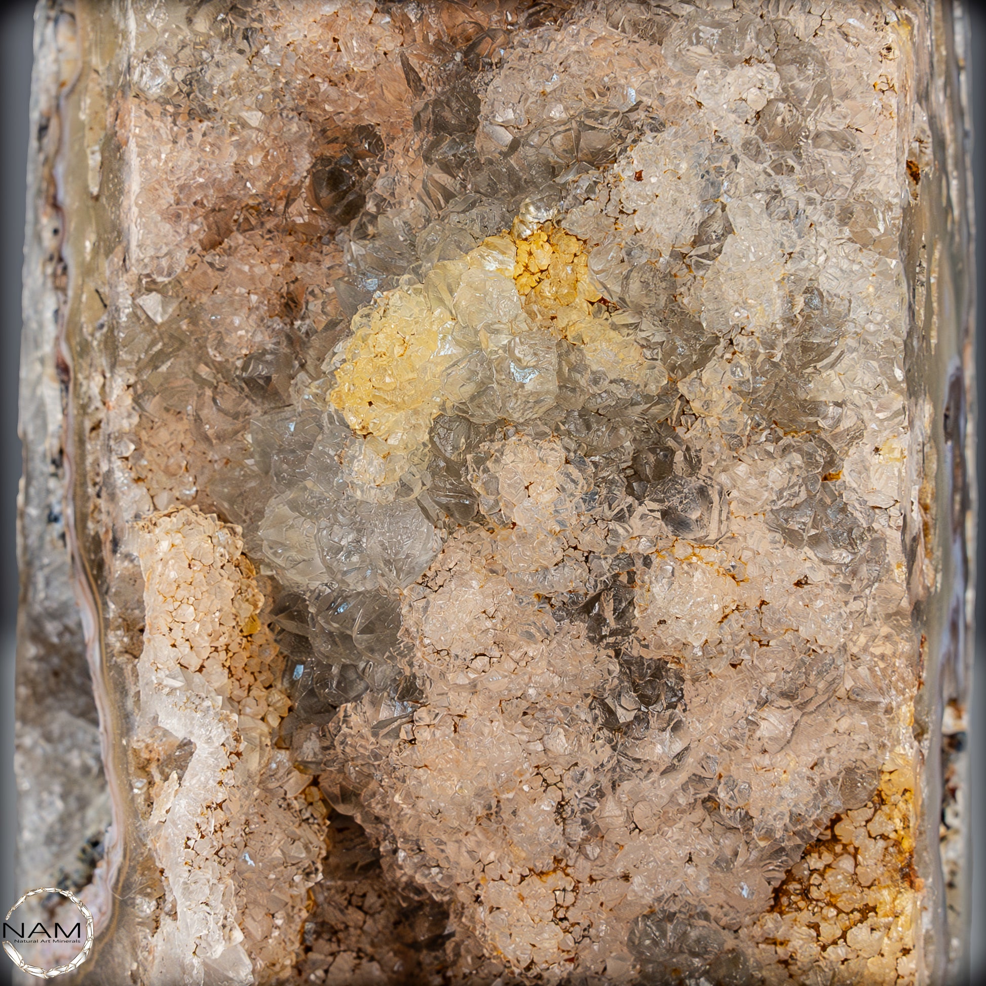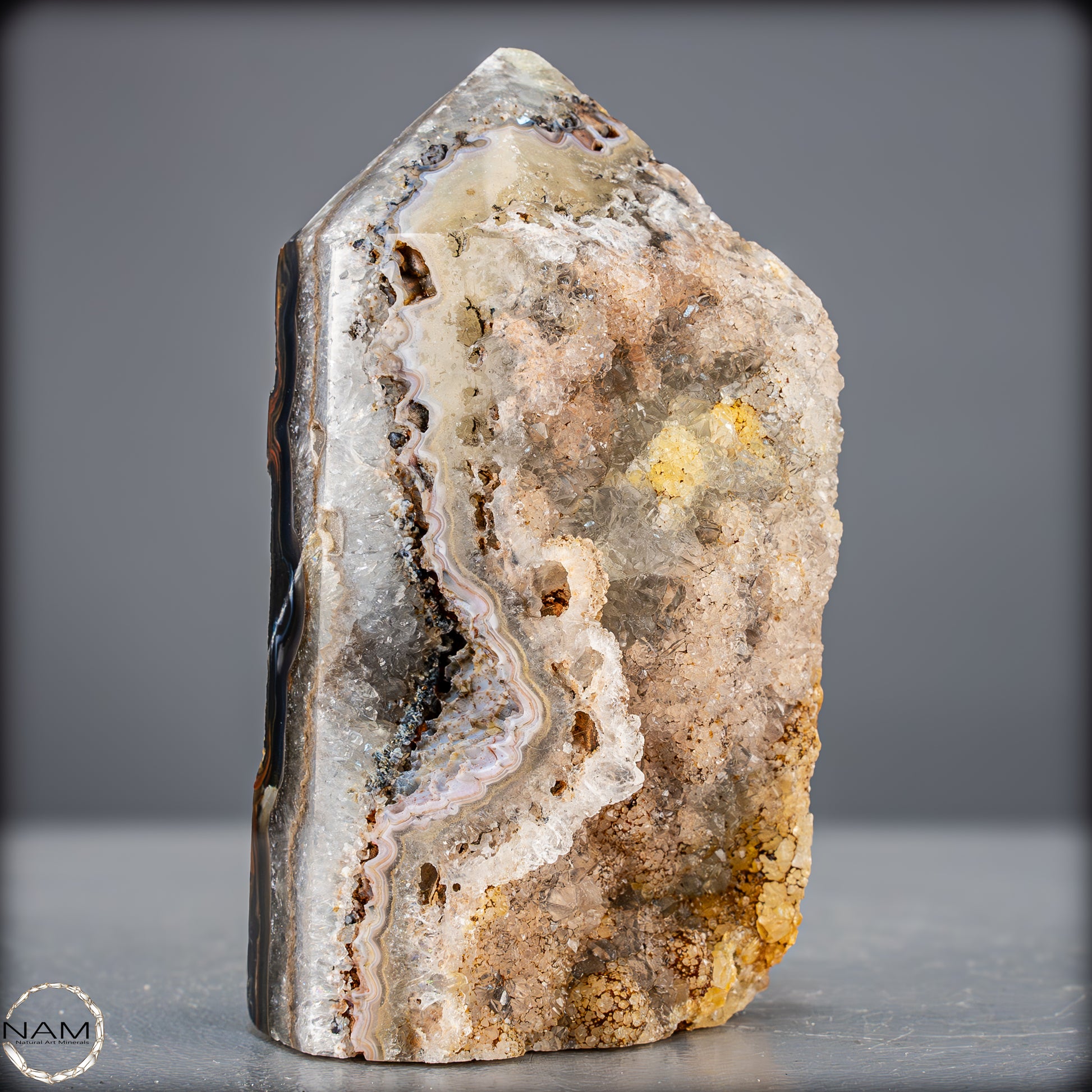 Dieser außergewöhnliche Achat-Obelisk vereint zwei faszinierende Gesichter in einem Stück: Eine Seite zeigt eine offene Kristalldruse mit feinen Quarzstrukturen in sanften Beige- und Gelbtönen, während die Rückseite durch tiefdunkle, fast schwarze Achatbänder mit bernsteinfarbenen Einschlüssen und feinen Mustern beeindruckt.
