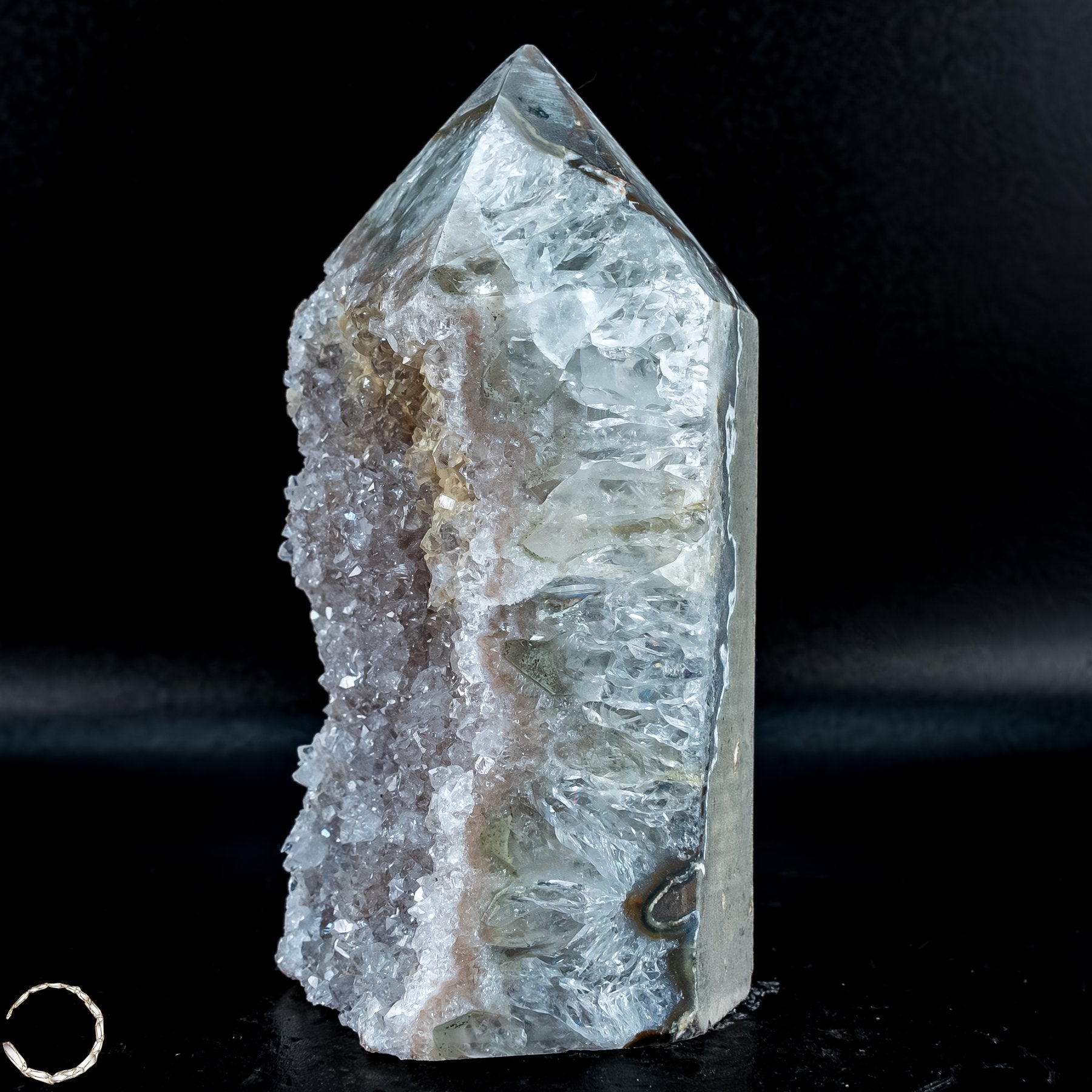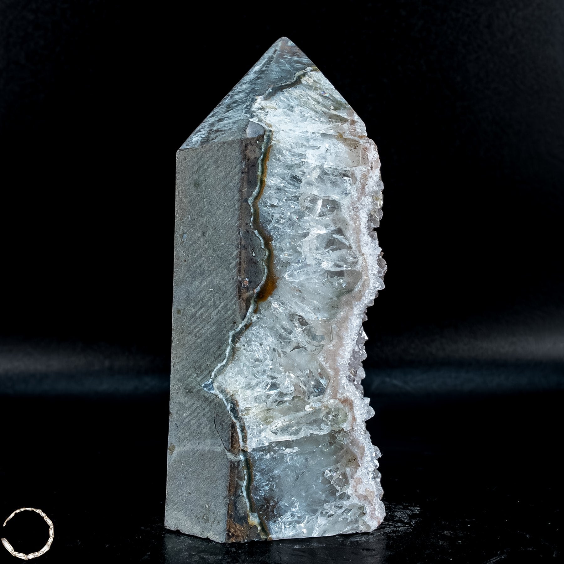 Die Obeliskform verstärkt die kraftvolle Präsenz des Stückes. Seit Jahrtausenden gilt der Obelisk als Symbol für Energie, Stärke und die Verbindung von Himmel und Erde. In Kombination mit der lebendigen Kristallhöhle wird dieser Achatdrusen-Obelisk zu einem Sinnbild für Stabilität und innere Strahlkraft – außen ruhige Stärke, innen funkelnde Vielfalt.