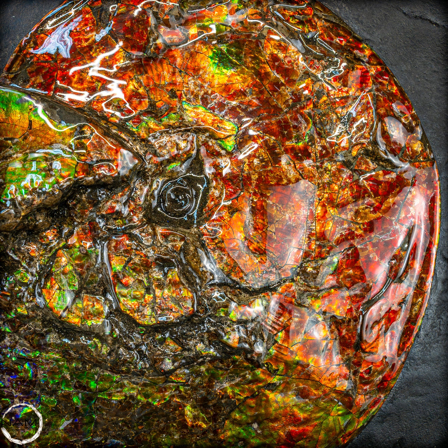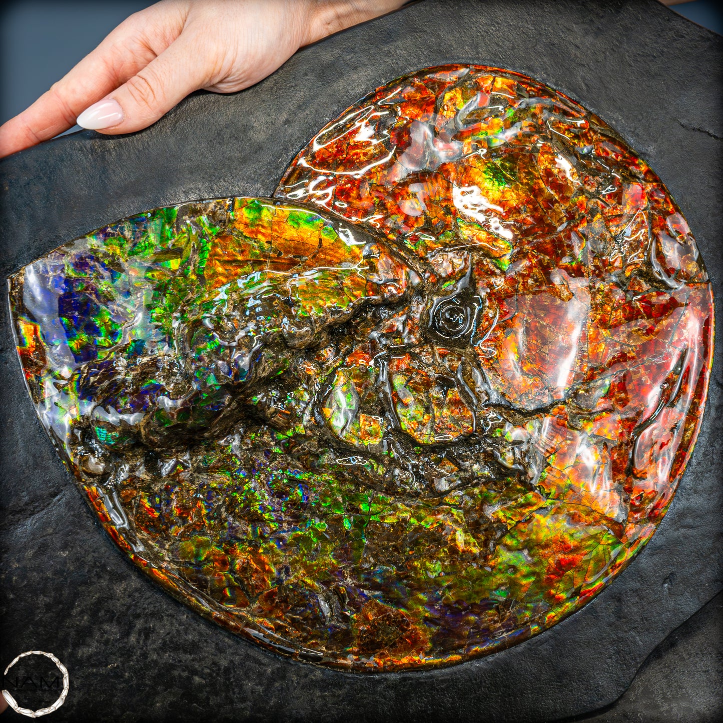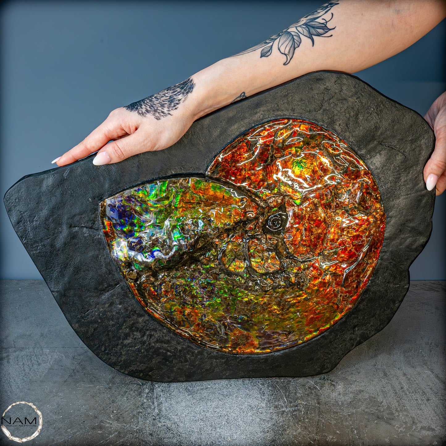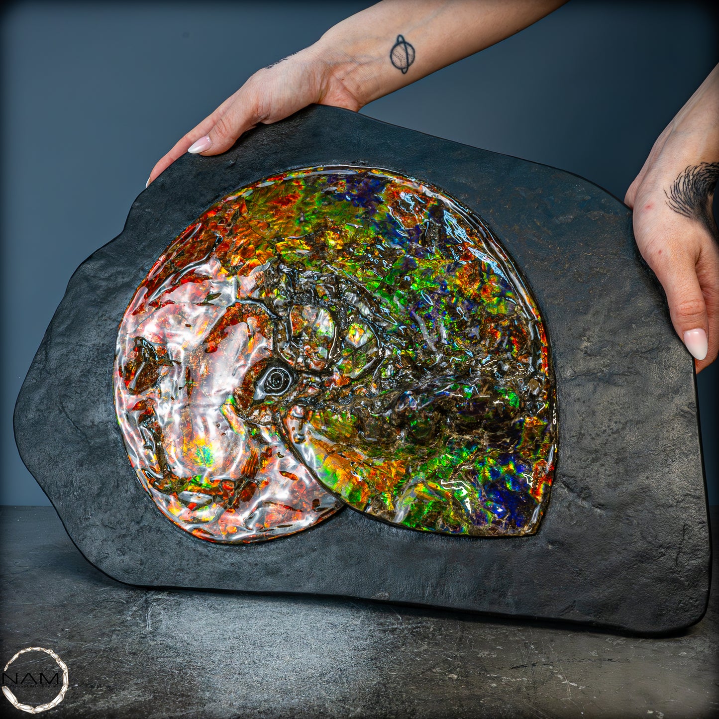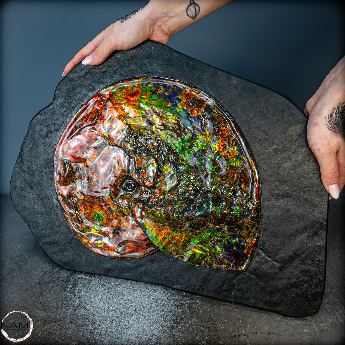 Dieser wunderschöne, opalisierende Ammonit stammt aus Kanada und ist ein außergewöhnlich seltenes Fundstück. Eingebettet in schieferähnliches Gestein, zeigt dieser Ammonit die einzigartigen und lebendigen Farben eines opalisierenden Steins, die durch die natürliche Chemie und die Alterung über Millionen von Jahren entstanden sind. Die Farben reichen von tiefem Rot, Grün und Blau bis hin zu goldenen und violetten Tönen, die das Stück zu einem wahren Meisterwerk der Natur machen.