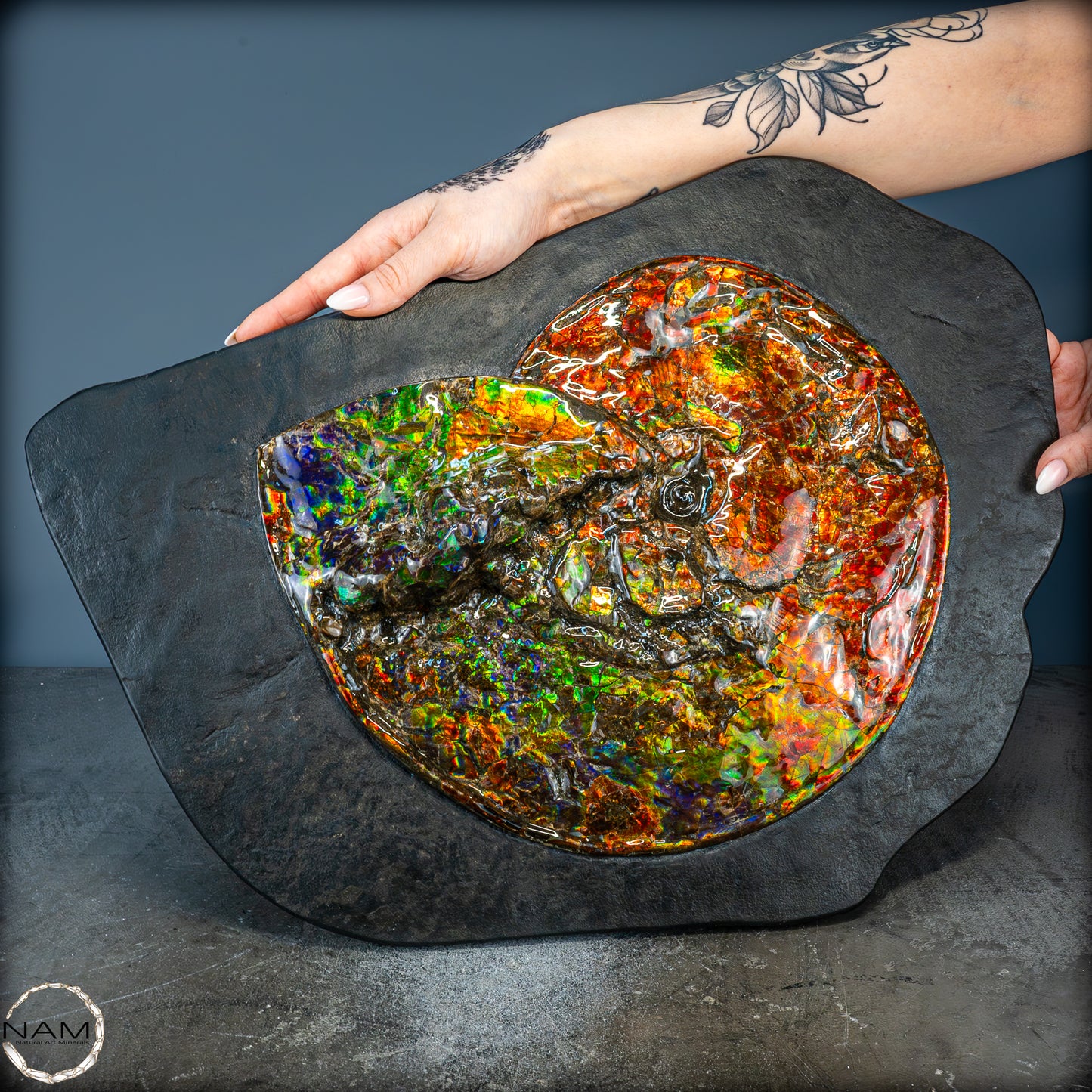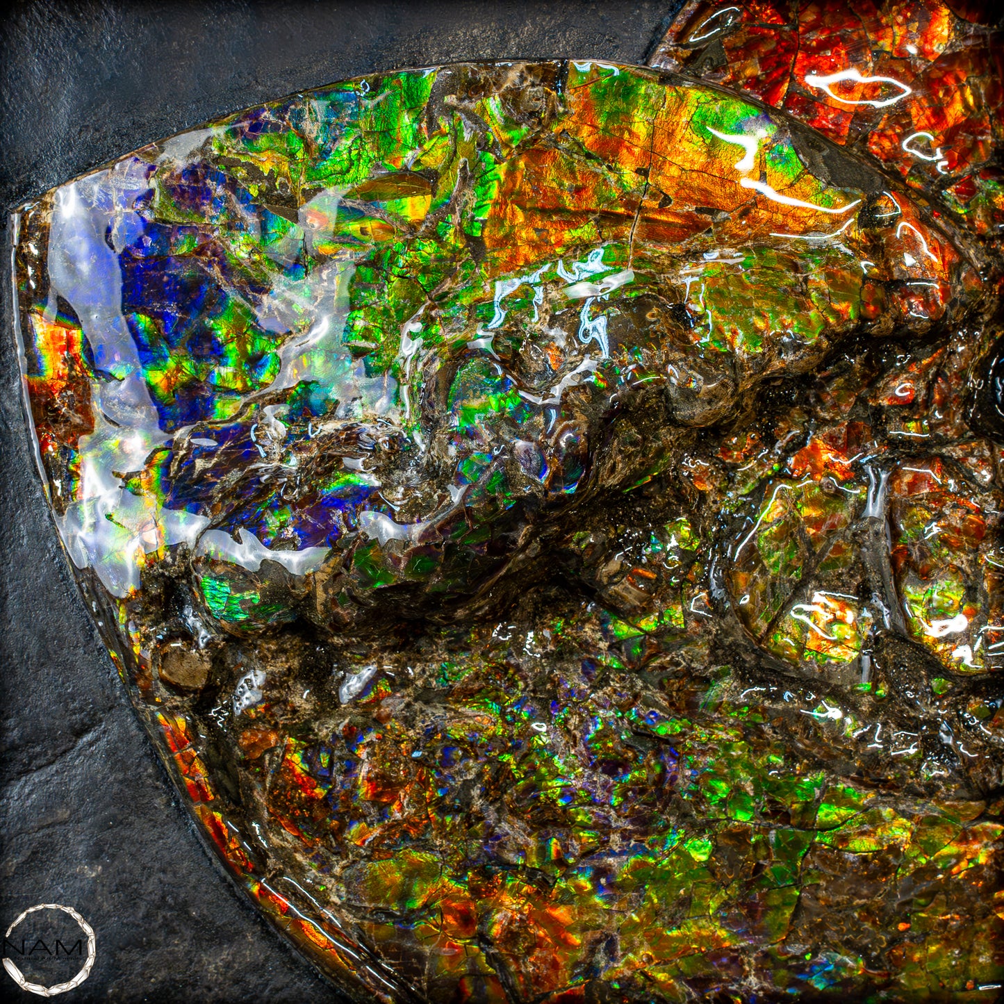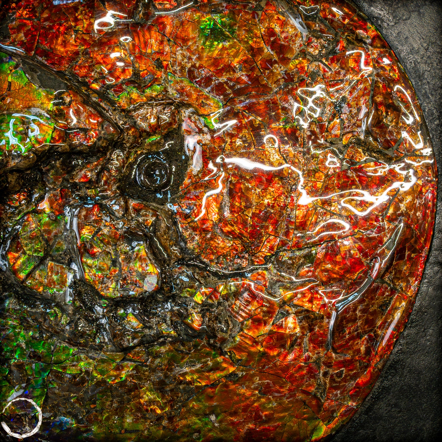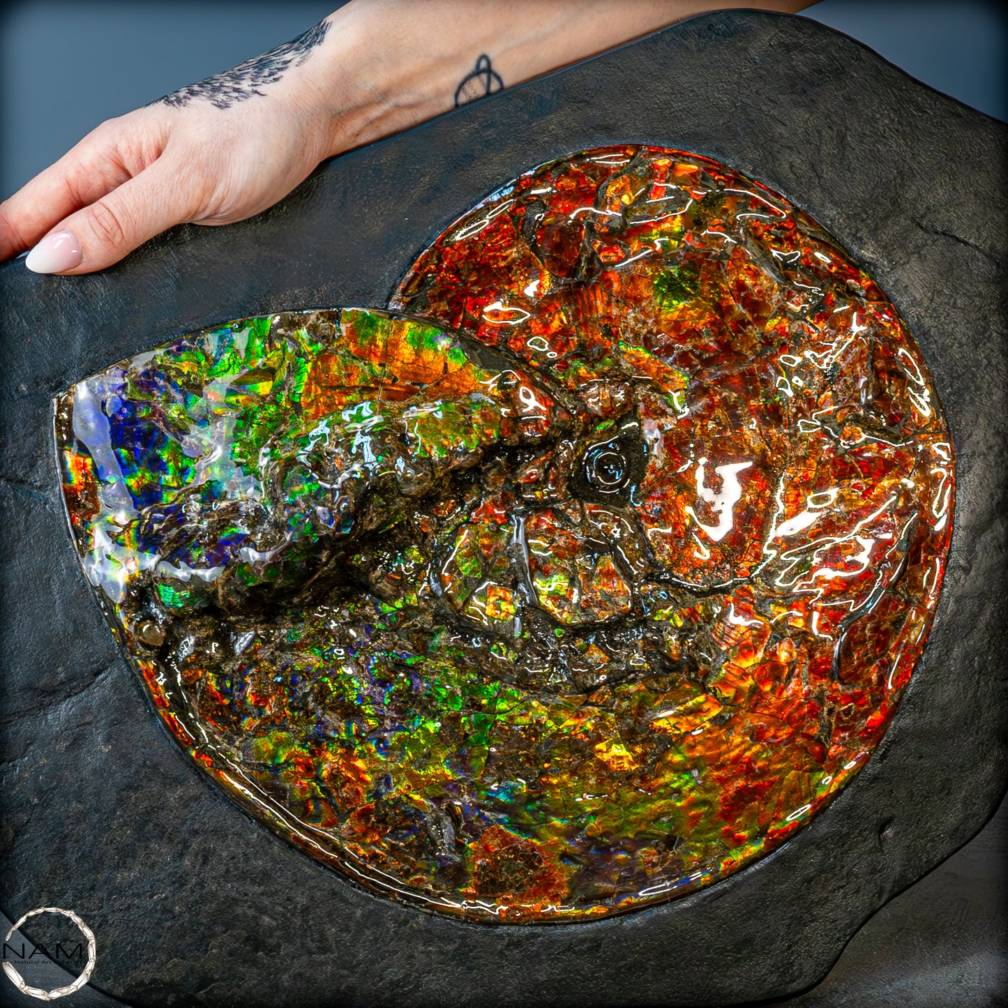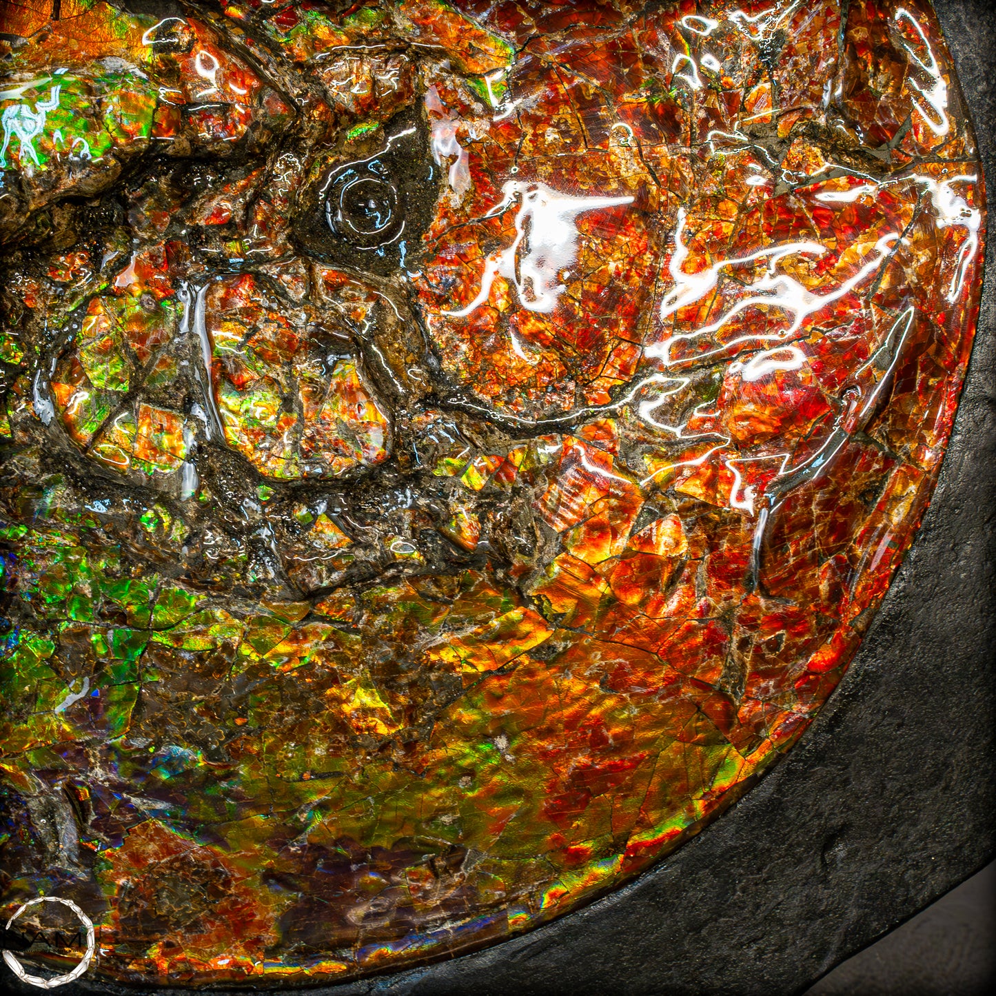 Dieser wunderschöne, opalisierende Ammonit stammt aus Kanada und ist ein außergewöhnlich seltenes Fundstück. Eingebettet in schieferähnliches Gestein, zeigt dieser Ammonit die einzigartigen und lebendigen Farben eines opalisierenden Steins, die durch die natürliche Chemie und die Alterung über Millionen von Jahren entstanden sind. Die Farben reichen von tiefem Rot, Grün und Blau bis hin zu goldenen und violetten Tönen, die das Stück zu einem wahren Meisterwerk der Natur machen.