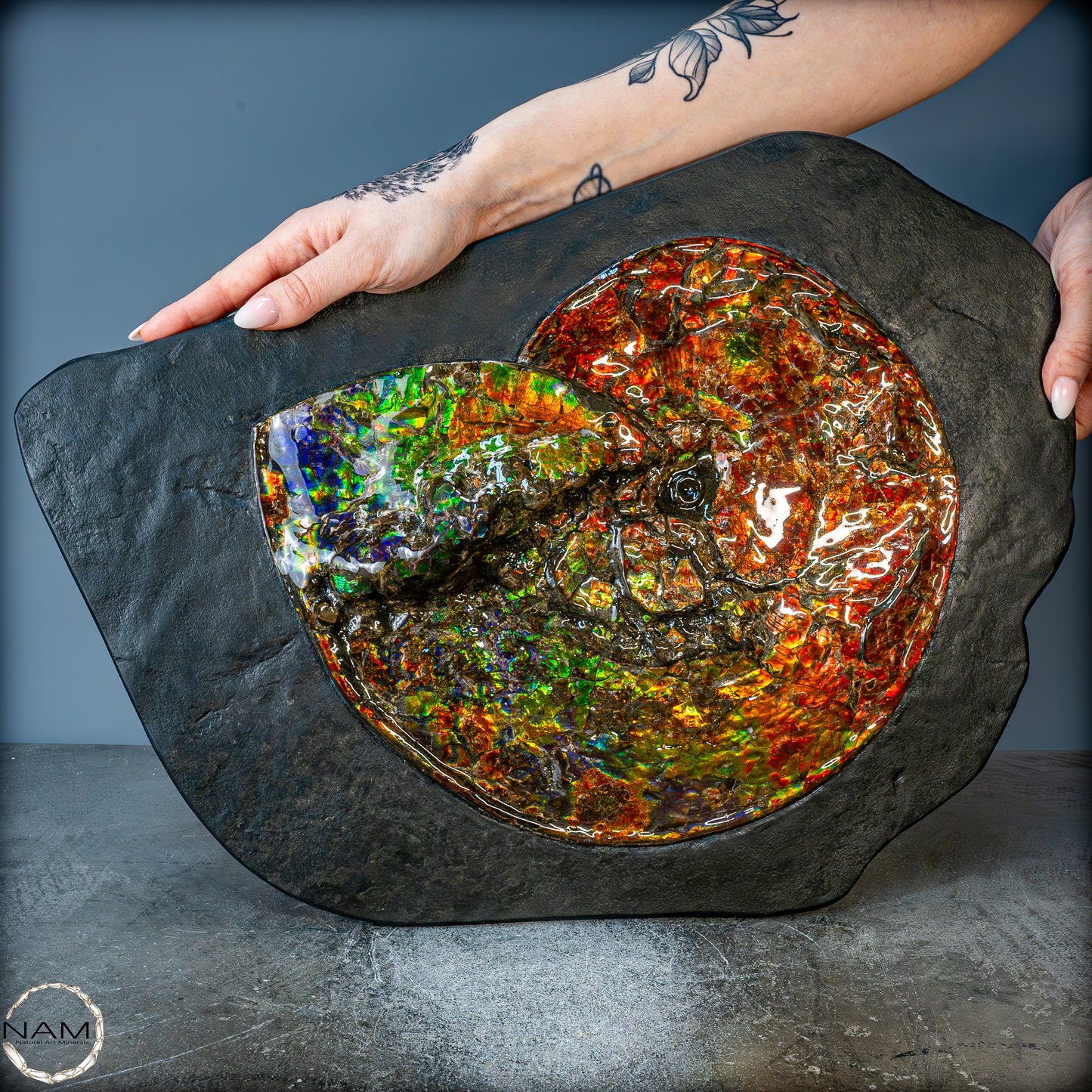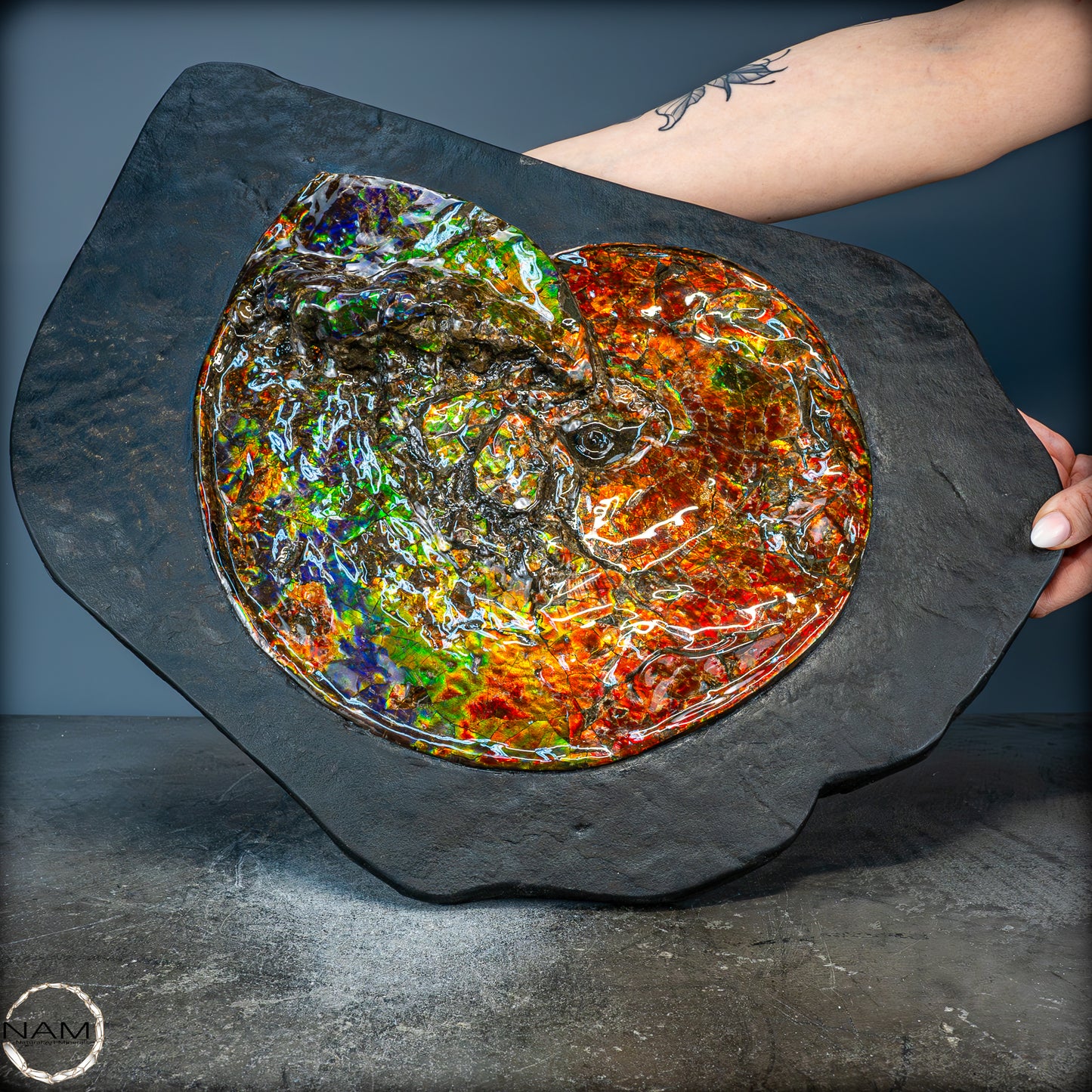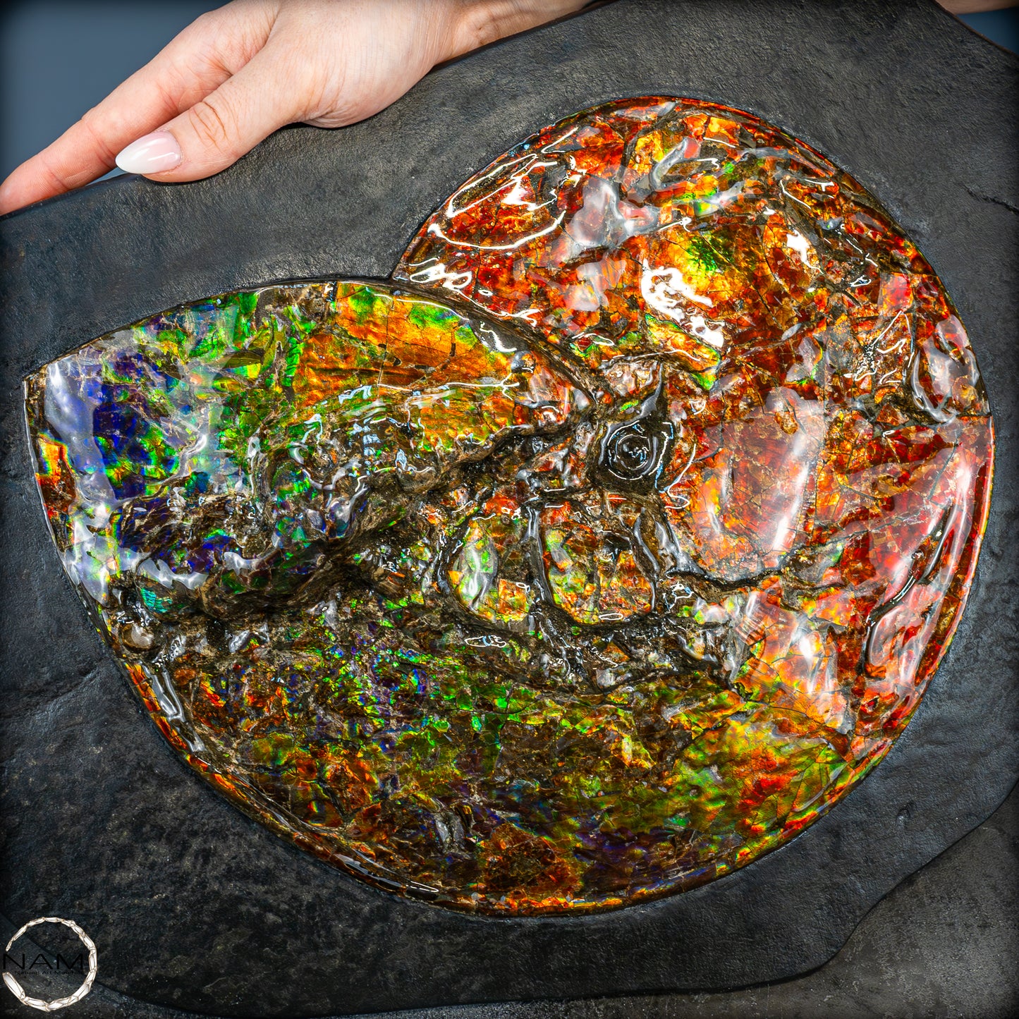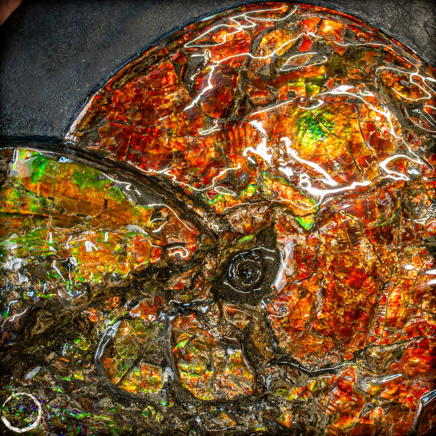 Dieser wunderschöne, opalisierende Ammonit stammt aus Kanada und ist ein außergewöhnlich seltenes Fundstück. Eingebettet in schieferähnliches Gestein, zeigt dieser Ammonit die einzigartigen und lebendigen Farben eines opalisierenden Steins, die durch die natürliche Chemie und die Alterung über Millionen von Jahren entstanden sind. Die Farben reichen von tiefem Rot, Grün und Blau bis hin zu goldenen und violetten Tönen, die das Stück zu einem wahren Meisterwerk der Natur machen.