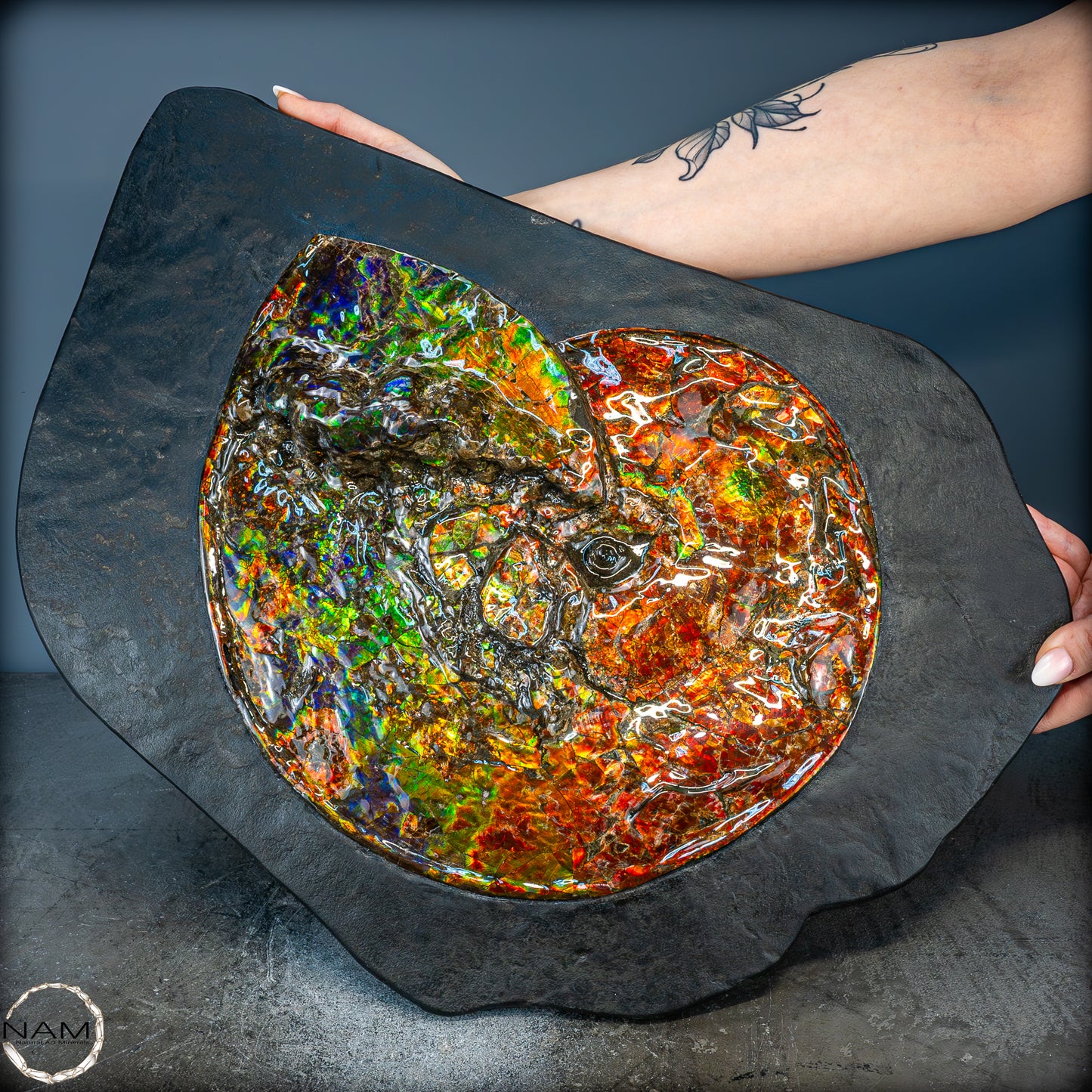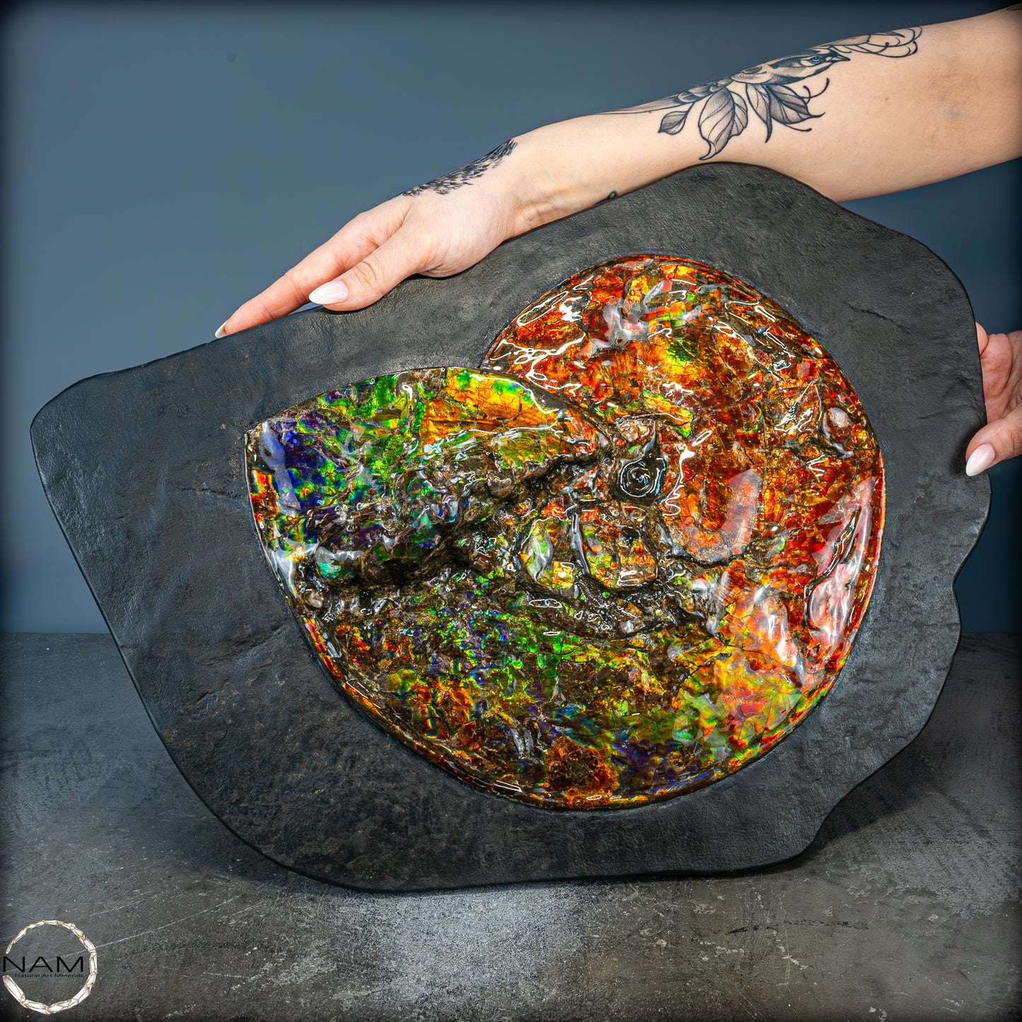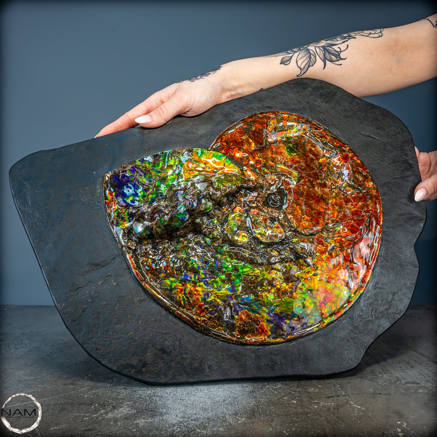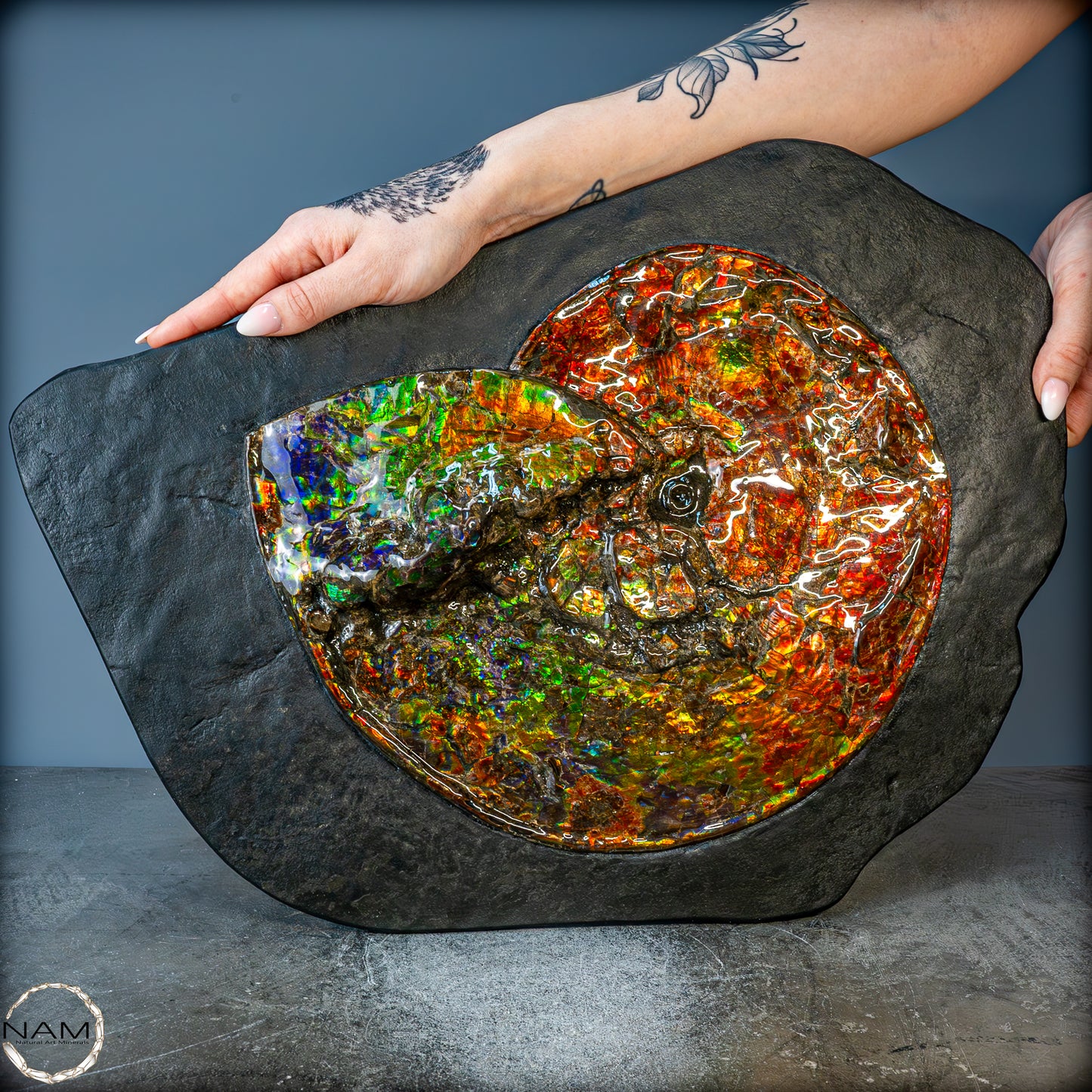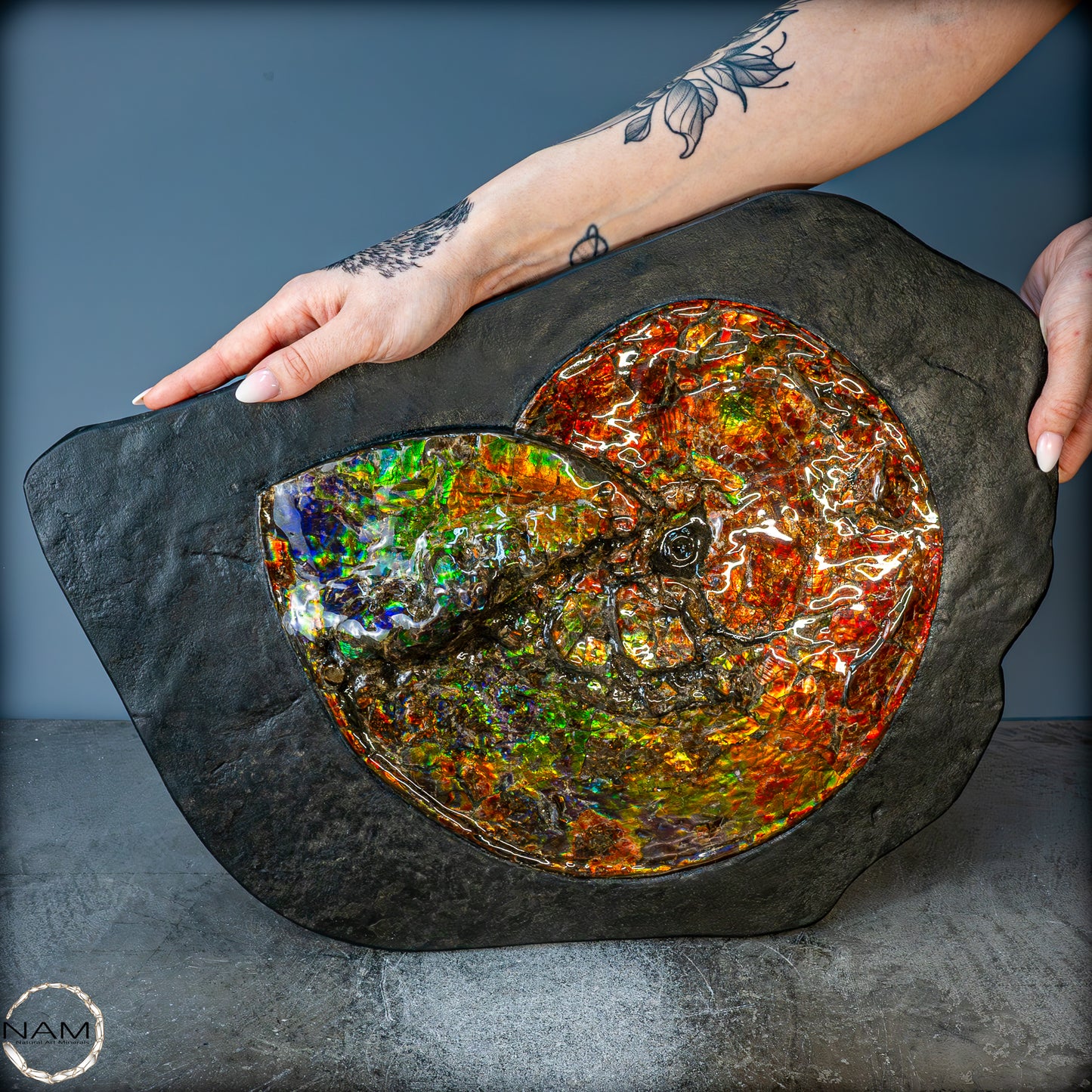 Dieser wunderschöne, opalisierende Ammonit stammt aus Kanada und ist ein außergewöhnlich seltenes Fundstück. Eingebettet in schieferähnliches Gestein, zeigt dieser Ammonit die einzigartigen und lebendigen Farben eines opalisierenden Steins, die durch die natürliche Chemie und die Alterung über Millionen von Jahren entstanden sind. Die Farben reichen von tiefem Rot, Grün und Blau bis hin zu goldenen und violetten Tönen, die das Stück zu einem wahren Meisterwerk der Natur machen.