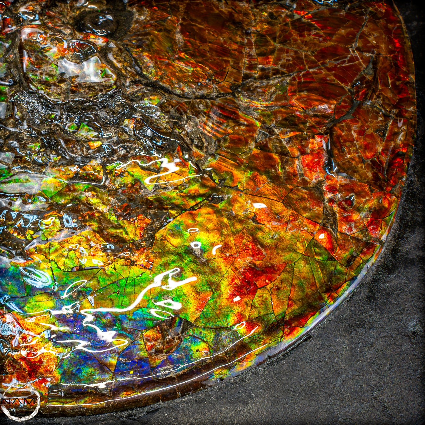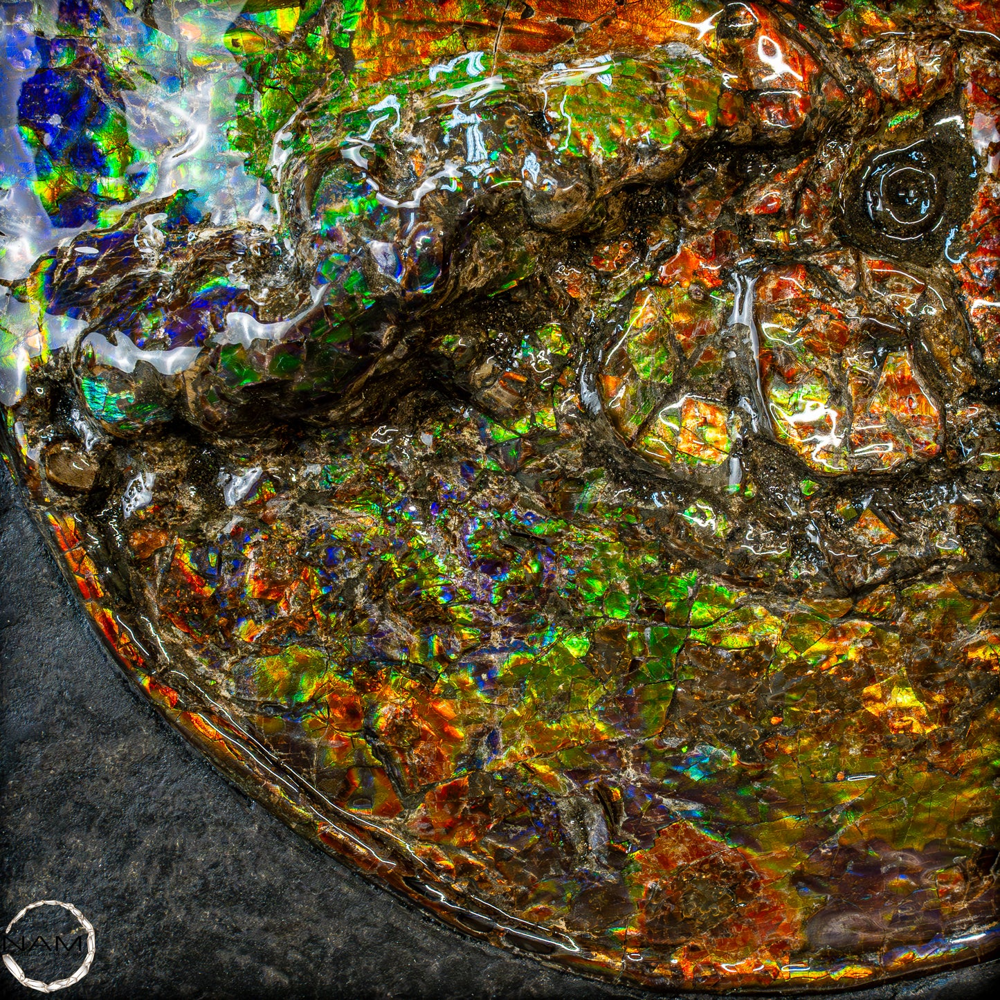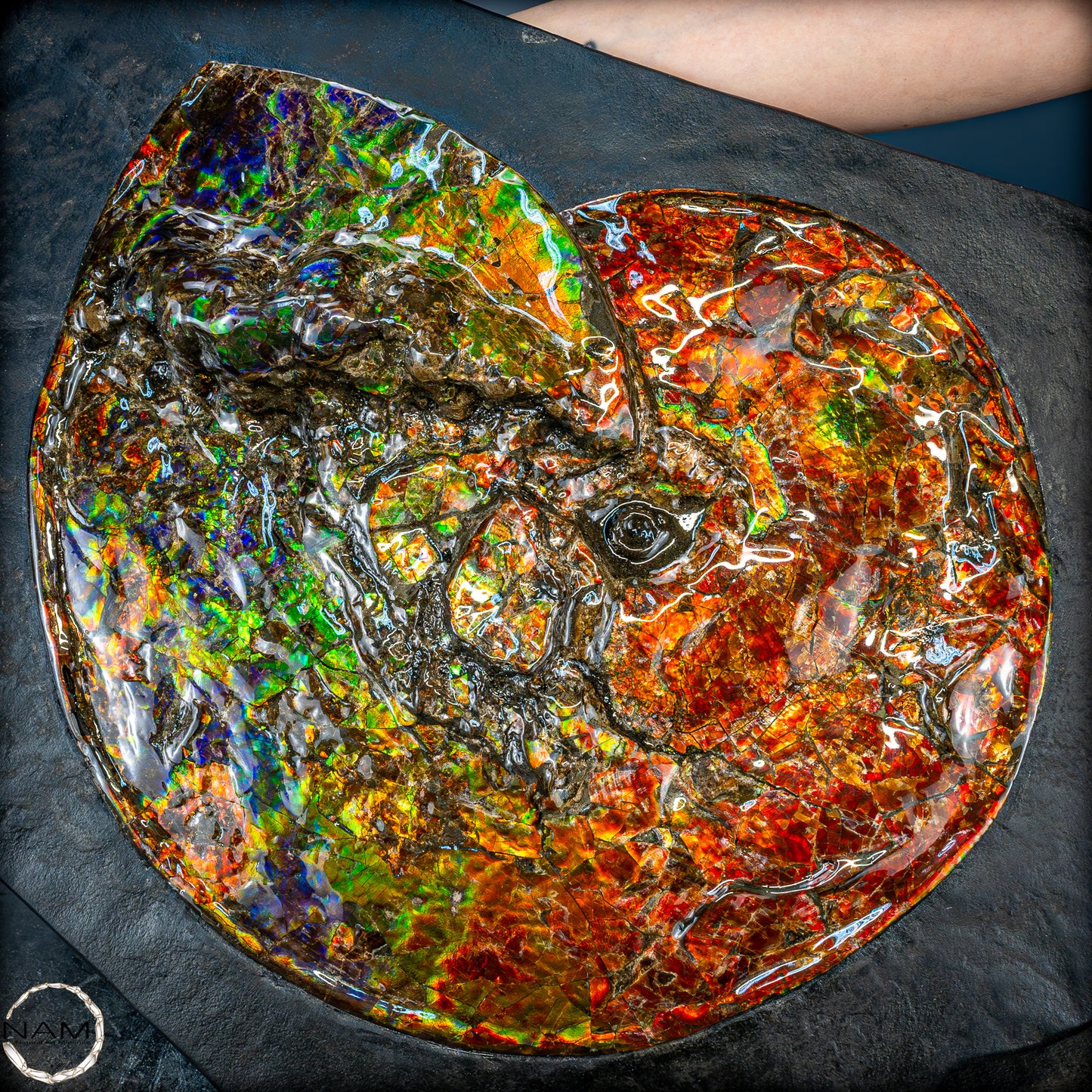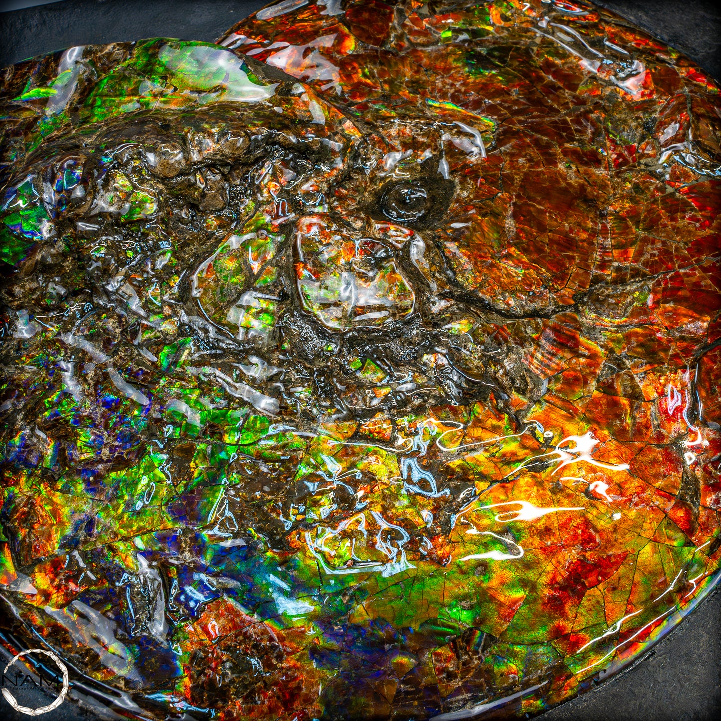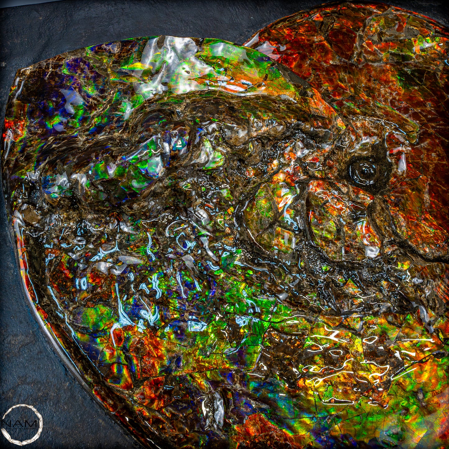 Dieser wunderschöne, opalisierende Ammonit stammt aus Kanada und ist ein außergewöhnlich seltenes Fundstück. Eingebettet in schieferähnliches Gestein, zeigt dieser Ammonit die einzigartigen und lebendigen Farben eines opalisierenden Steins, die durch die natürliche Chemie und die Alterung über Millionen von Jahren entstanden sind. Die Farben reichen von tiefem Rot, Grün und Blau bis hin zu goldenen und violetten Tönen, die das Stück zu einem wahren Meisterwerk der Natur machen.