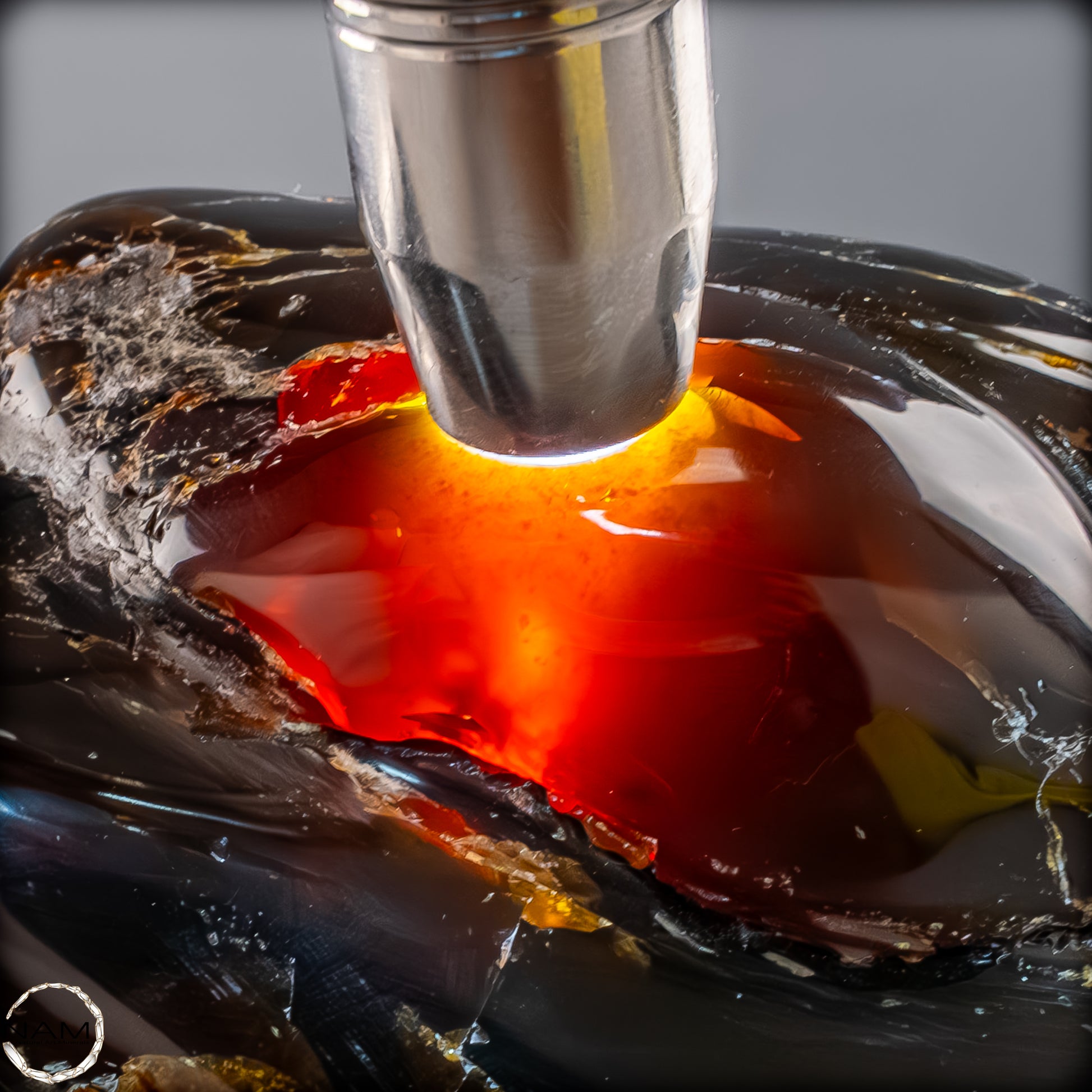 Unter normalem Licht zeigt der Bernstein eine matte, erdige Oberfläche mit deutlicher Kruste, wie sie typisch für jahrtausendealten, unverarbeiteten Bernstein ist. Doch sobald Licht in die offenen Bereiche des Steines fällt, leuchtet der Bernstein von innen heraus in intensiven, warmen Orange- und Honigtönen – ein klares Zeichen für echten, hochwertigen Naturbernstein.