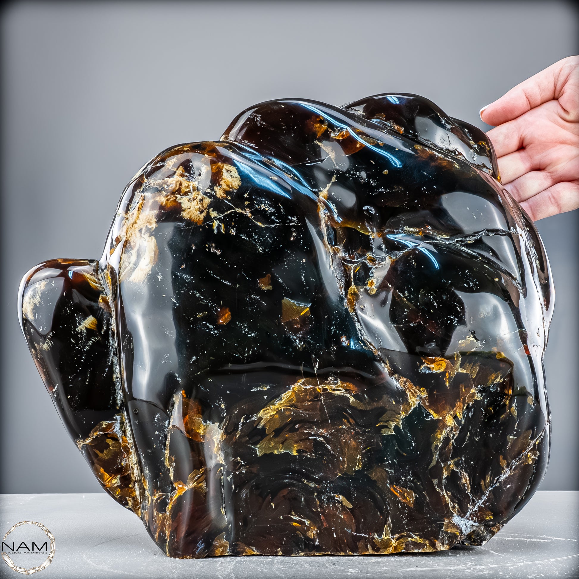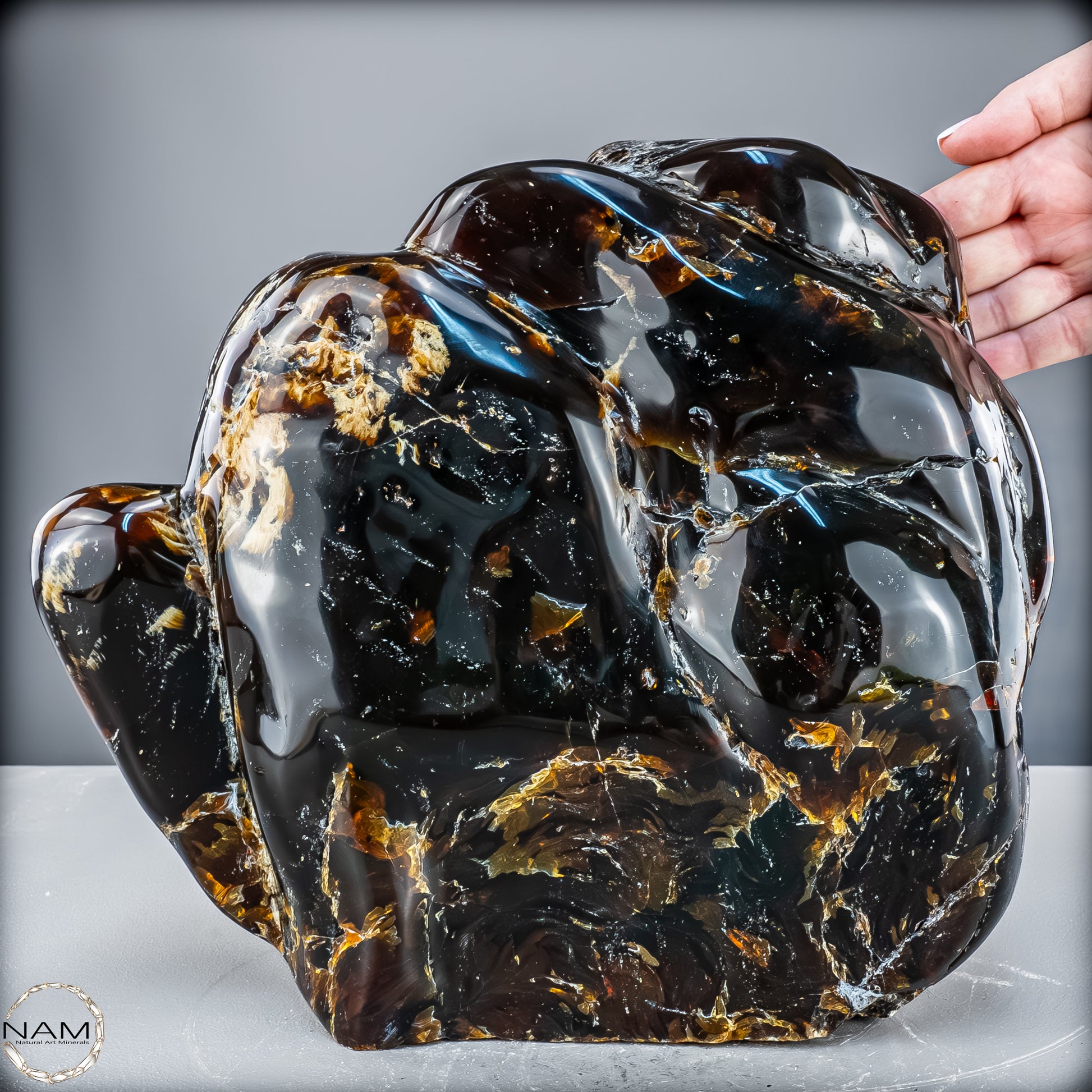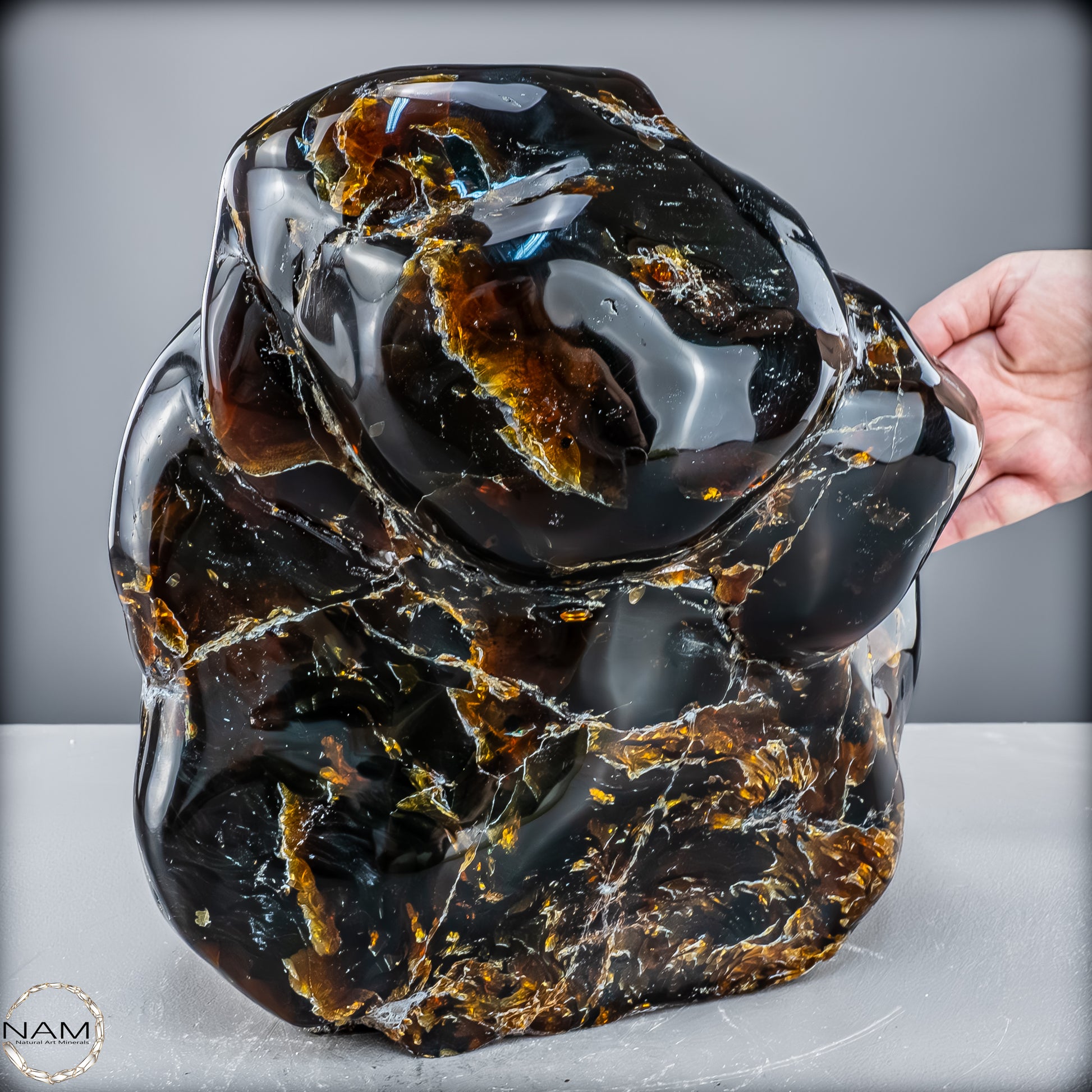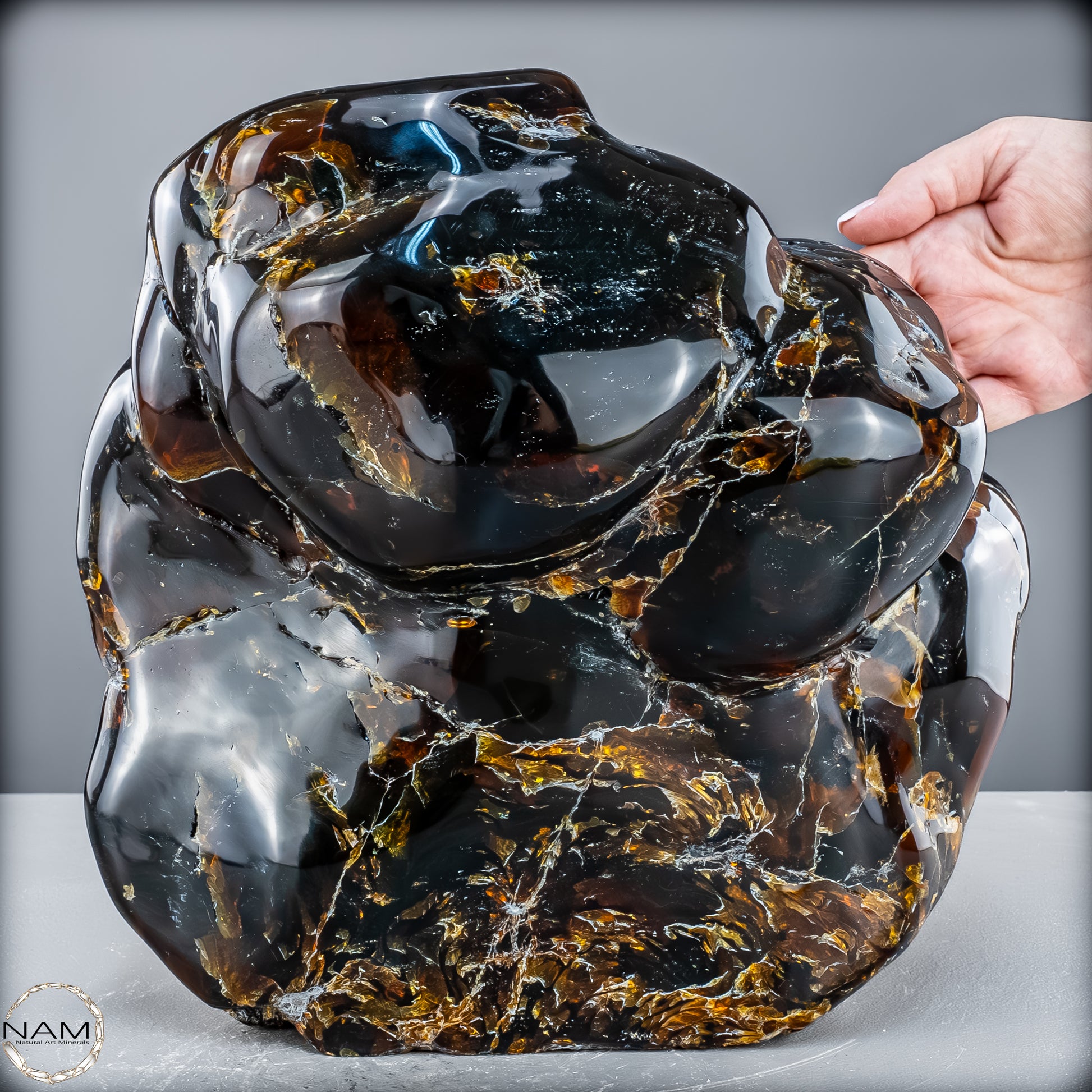 Die natürliche Form wurde nicht verändert – der Bernstein zeigt Knollenstruktur, Verwitterungsspuren und eine authentische Oberfläche, die seine Entstehungsgeschichte bewahrt. Gleichzeitig lassen einzelne offene Bereiche bereits die Reinheit und Tiefe des inneren Materials erkennen.