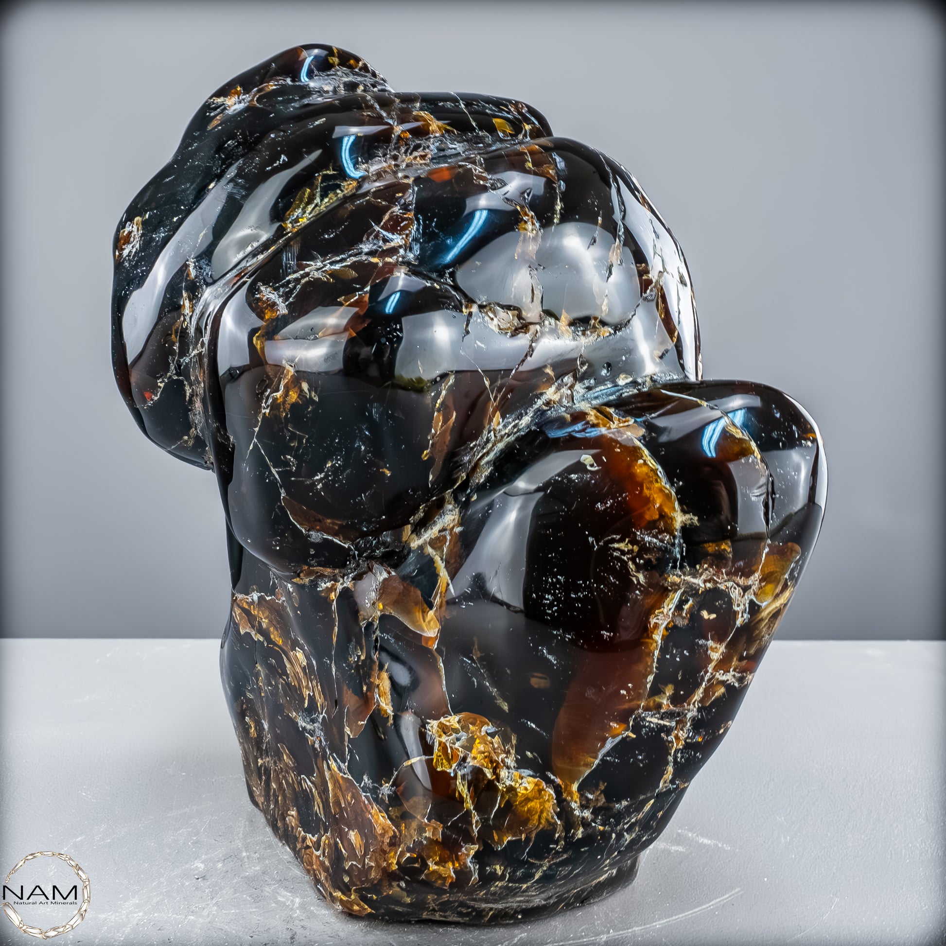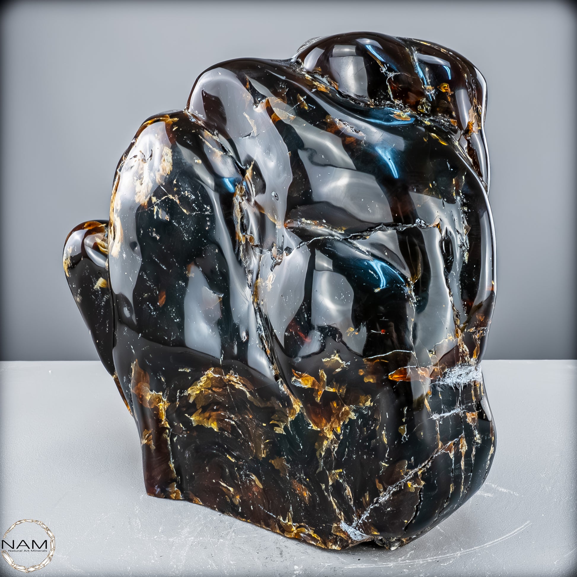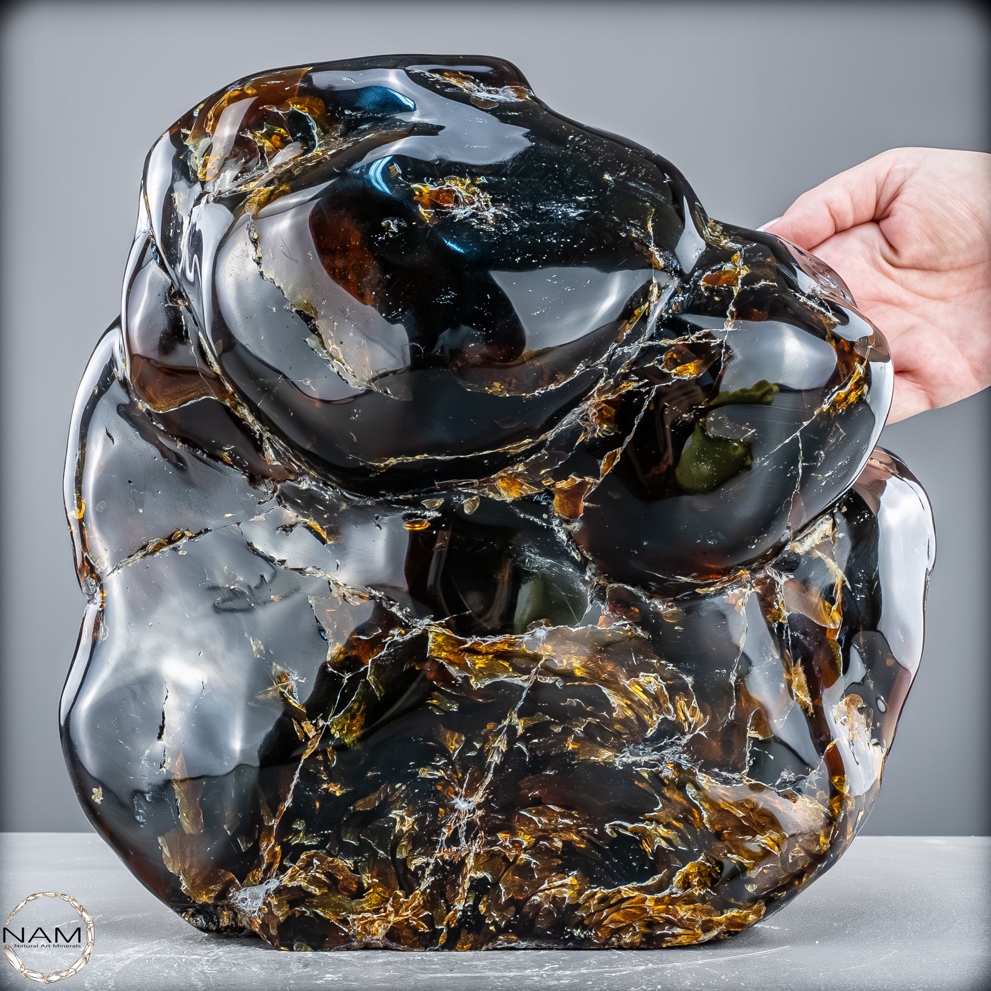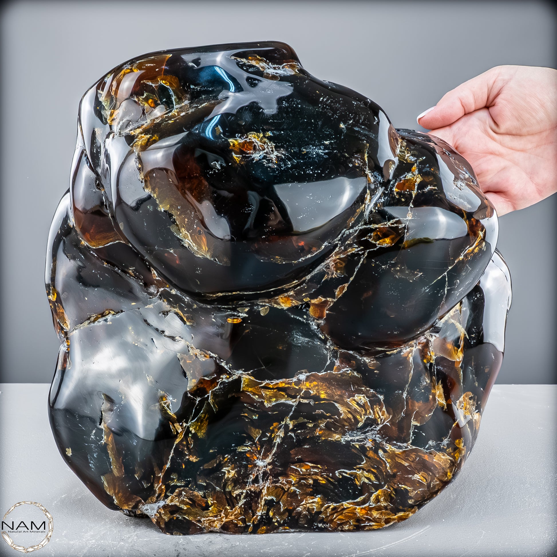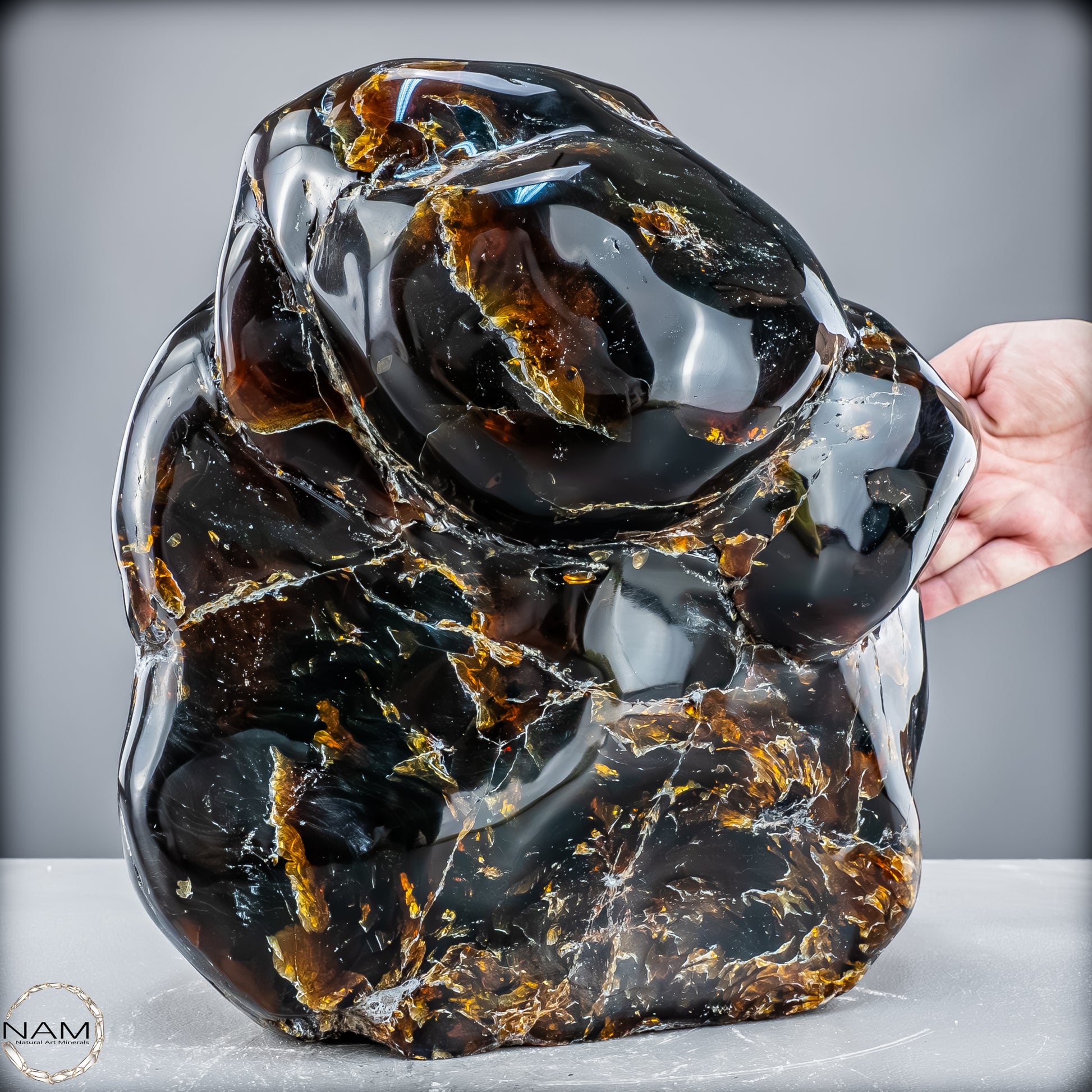 Die natürliche Form wurde nicht verändert – der Bernstein zeigt Knollenstruktur, Verwitterungsspuren und eine authentische Oberfläche, die seine Entstehungsgeschichte bewahrt. Gleichzeitig lassen einzelne offene Bereiche bereits die Reinheit und Tiefe des inneren Materials erkennen.