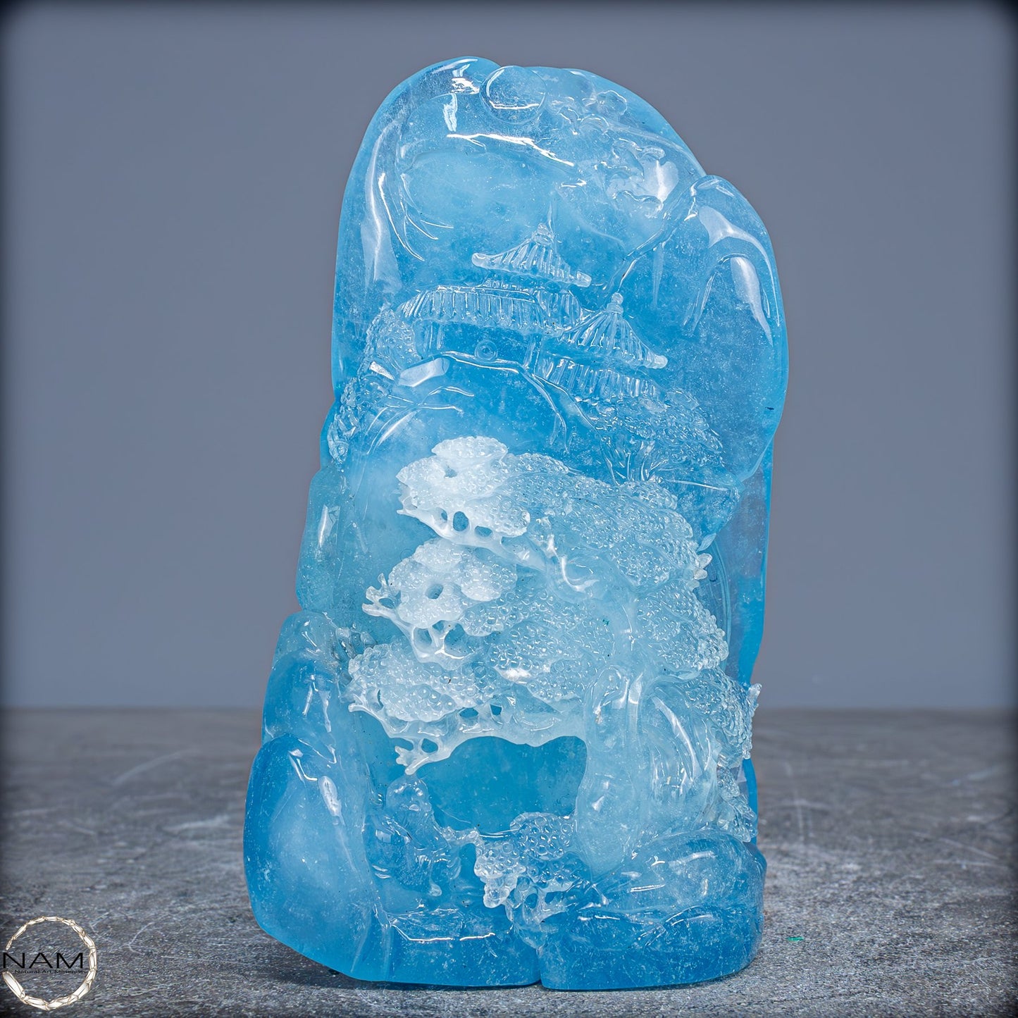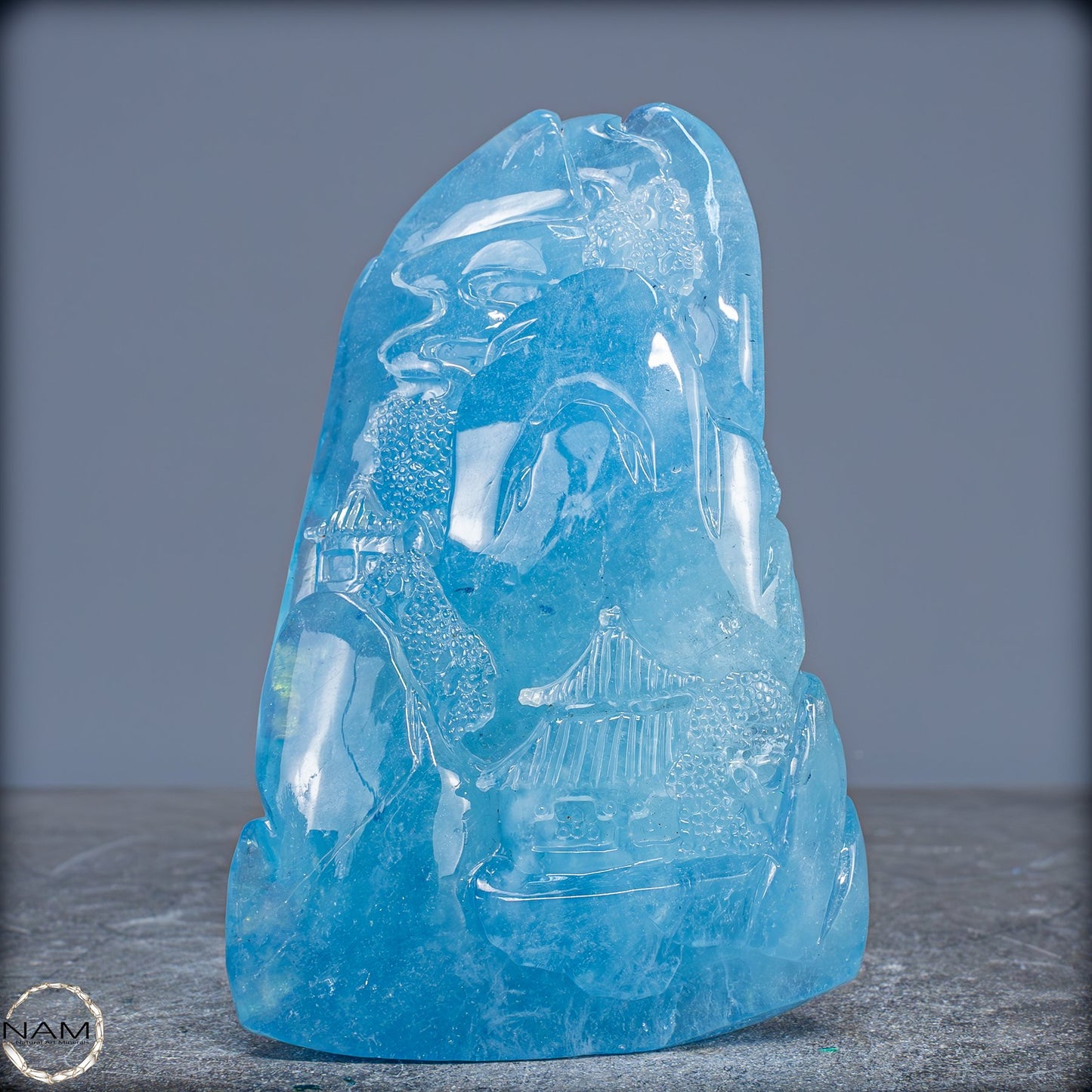 Aquamarin ist bekannt als der Stein der Gelassenheit und des Mutes, und diese besondere Schnitzerei verkörpert diese Eigenschaften in ihrer reinsten Form. Sie eignet sich perfekt als dekoratives Element in Ihrem Zuhause oder Büro und kann eine beruhigende und harmonische Atmosphäre schaffen. Die teils transparente Beschaffenheit verleiht der Schnitzerei eine zusätzliche Dimension und Tiefe, die sie zu einem echten Blickfang macht.