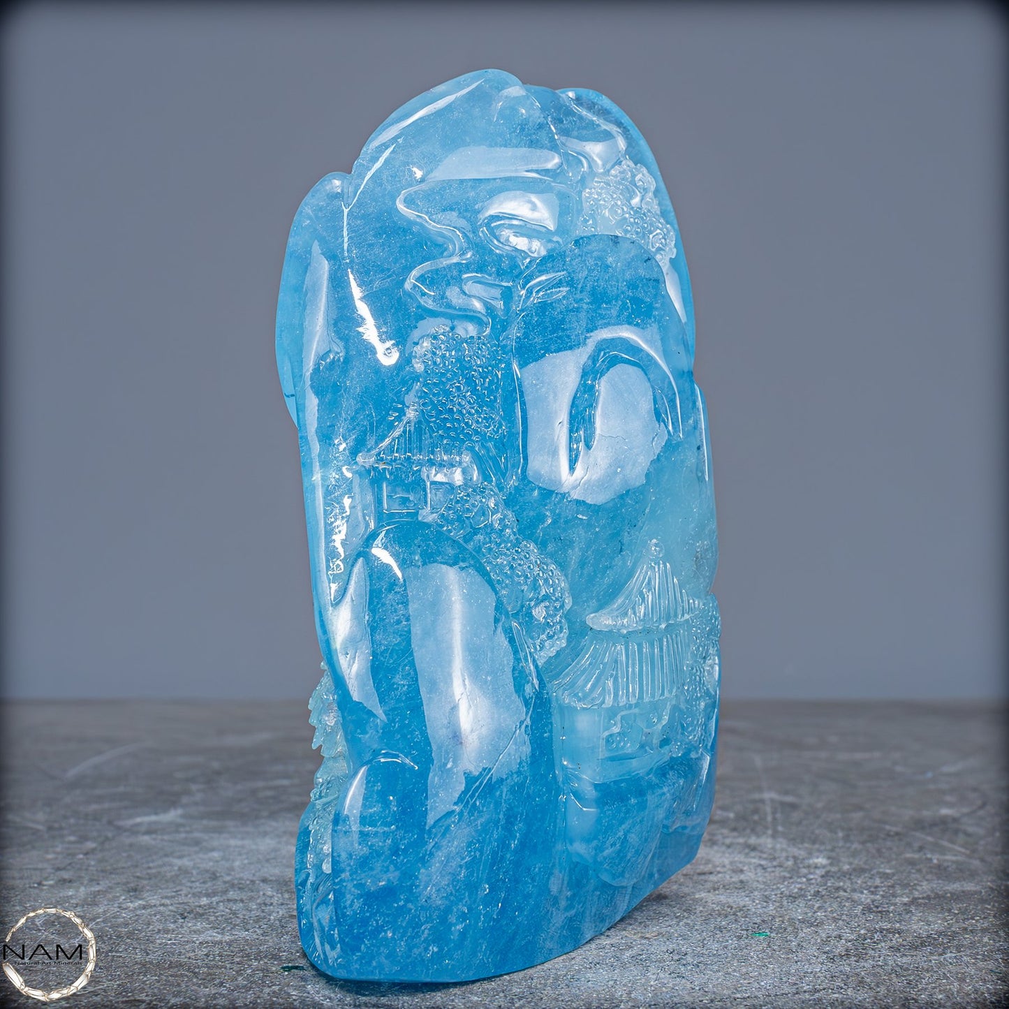 Erleben Sie die Schönheit und Eleganz dieser einzigartigen, natürlichen Aquamarin-Schnitzerei. Das Kunstwerk besticht durch seine zarte, teils transparente Struktur, die das Licht in einem sanften, aquamarinblauen Schimmer einfängt und reflektiert. Diese meisterhaft handgefertigte Schnitzerei zeigt detaillierte florale Motive und feine Linien, die die natürliche Klarheit und Reinheit des Aquamarins hervorheben.