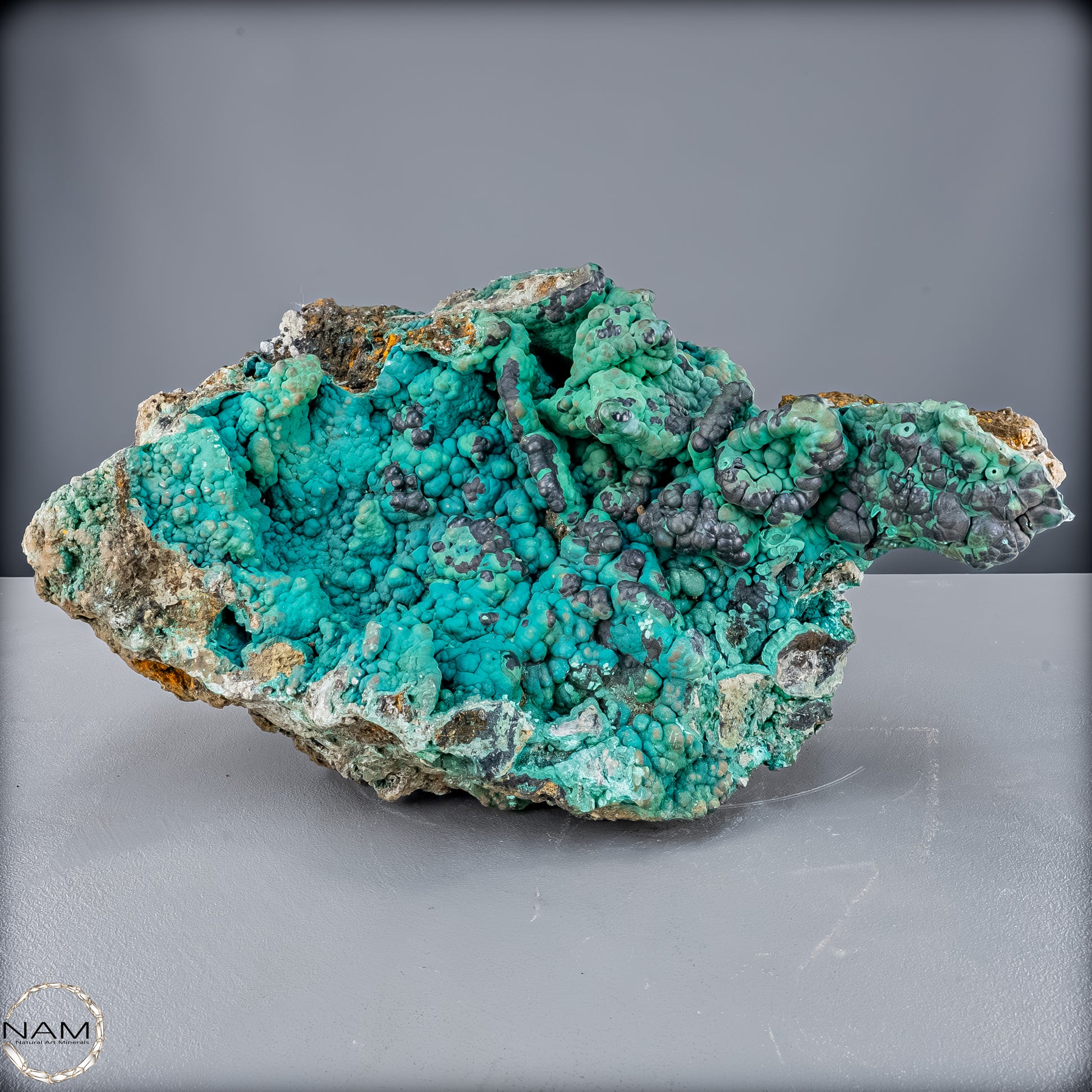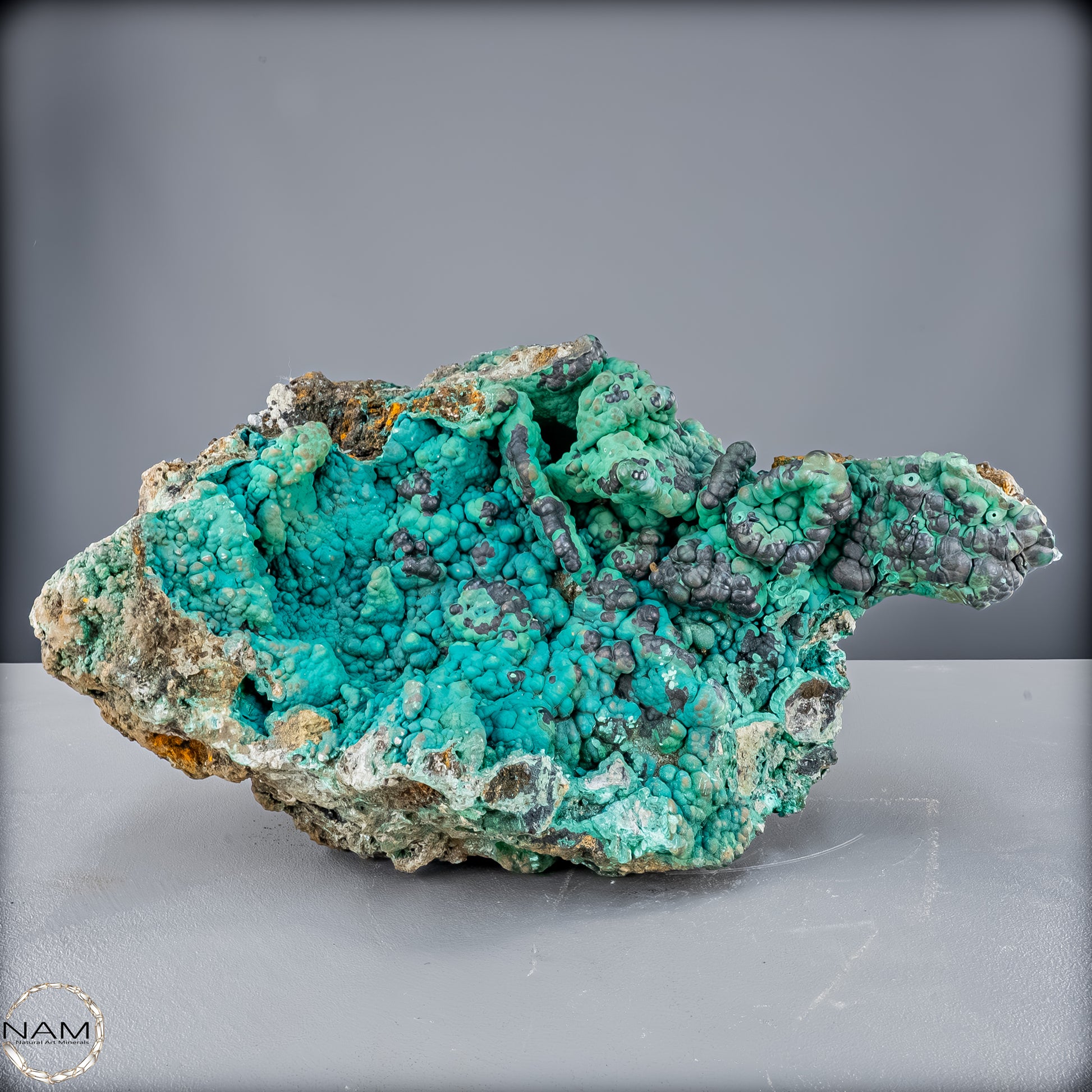Besonders interessant ist das natürliche Zusammenspiel mit Chrysokoll, der sich in vereinzelten Zonen durch seine etwas helleren bis bläulich-grünen Farbnuancen bemerkbar macht und dem Stück zusätzliche farbliche Tiefe und Vielfalt verleiht. Die beiden Kupfermineralien bilden gemeinsam ein harmonisches und kraftvolles Ensemble.