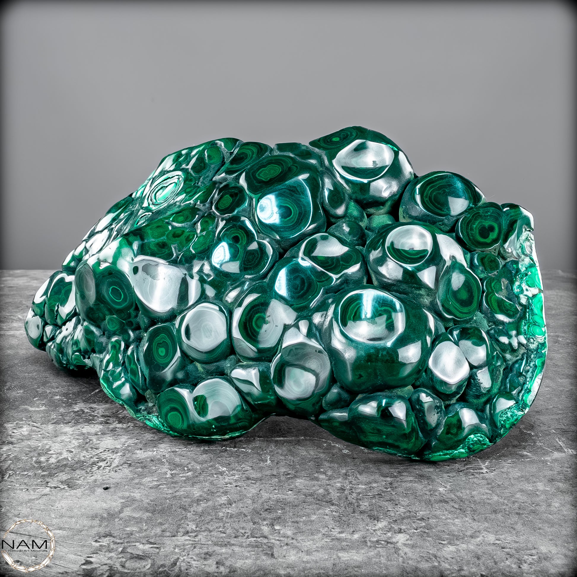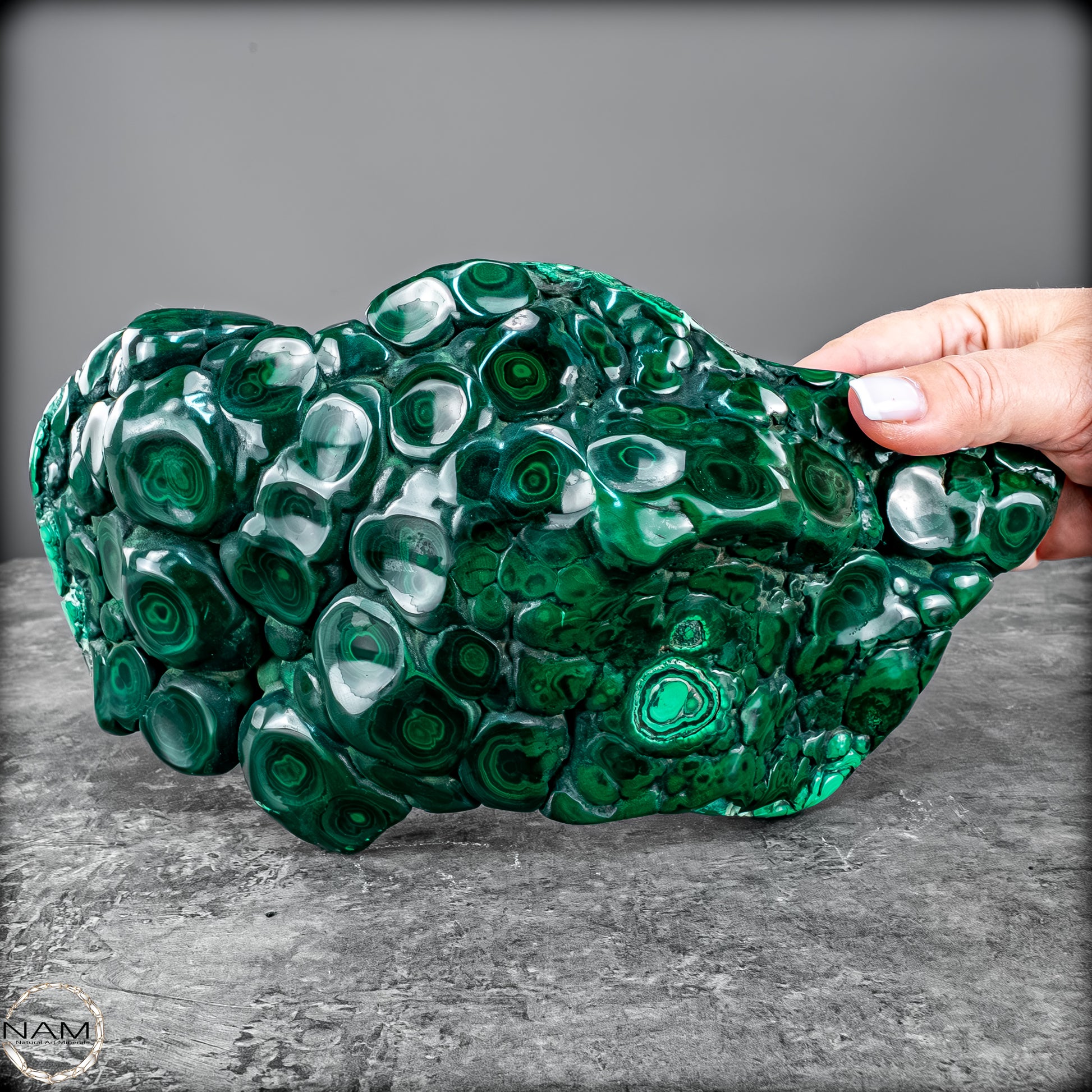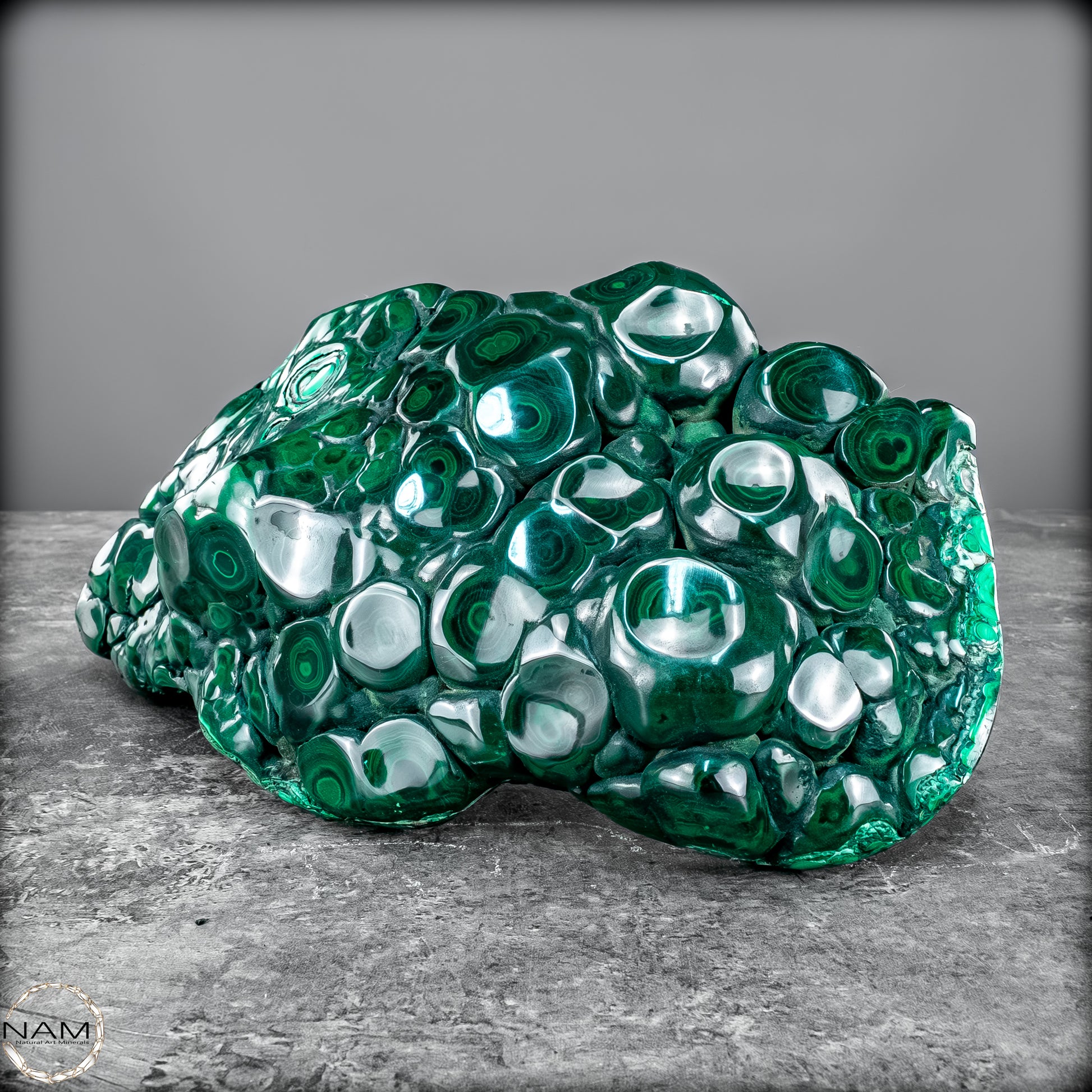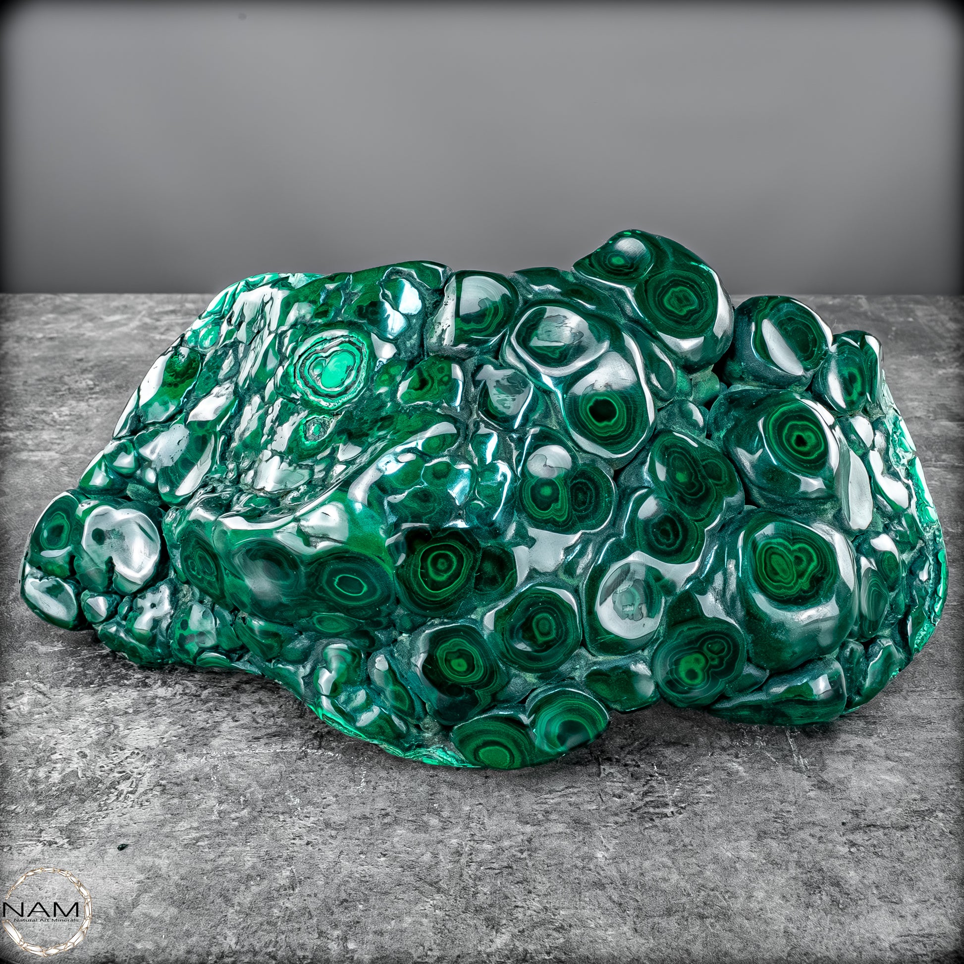 Diese eindrucksvolle Malachit-Stufe begeistert mit ihren leuchtend grünen, konzentrisch gebänderten Augenmustern und der charakteristischen, botryoidalen Oberfläche. Die plastische Struktur mit ihren glänzenden, gewölbten Rundungen erzeugt ein lebendiges Spiel aus Licht und Schatten auf der Oberfläche, während die feinen Farbübergänge von sattem Smaragdgrün bis zu hellen Türkistönen die Tiefe und Komplexität des Steins unterstreichen.
