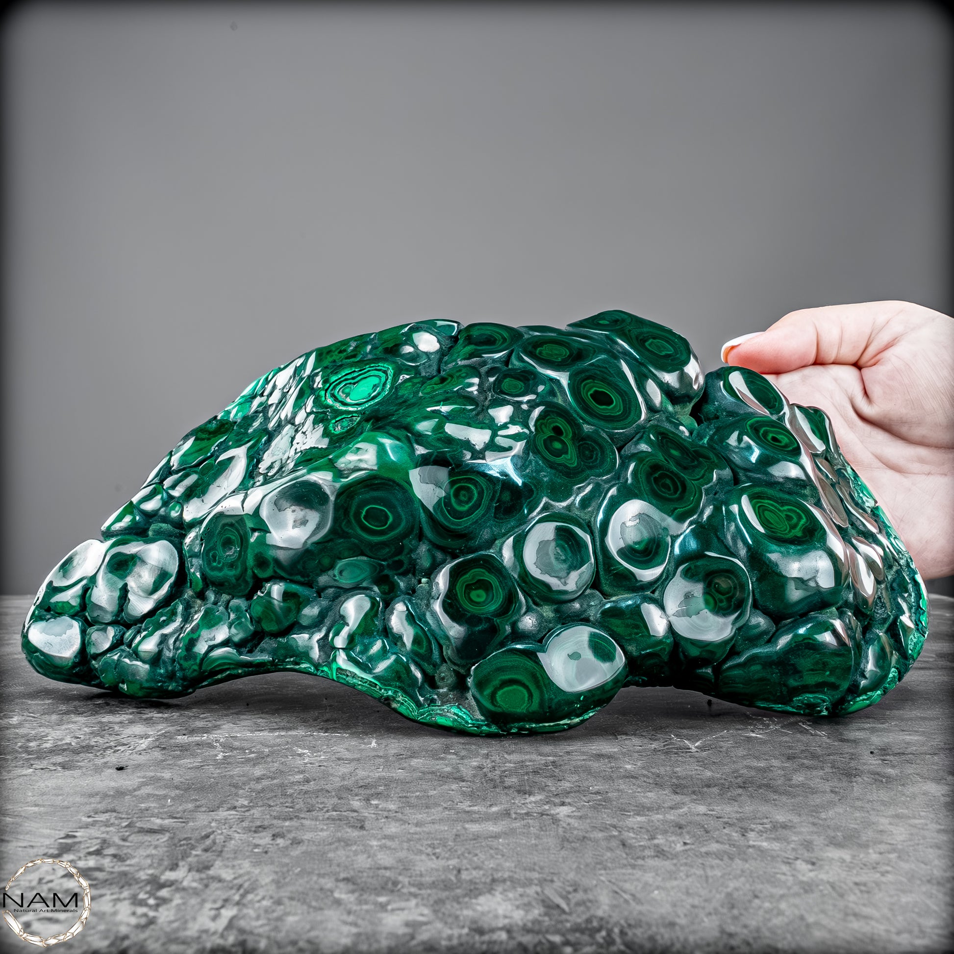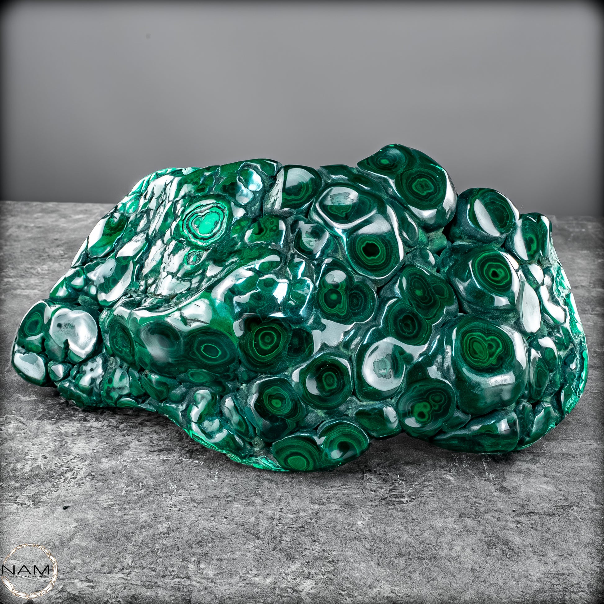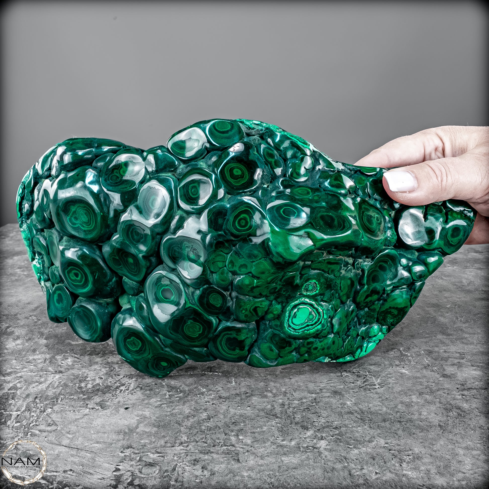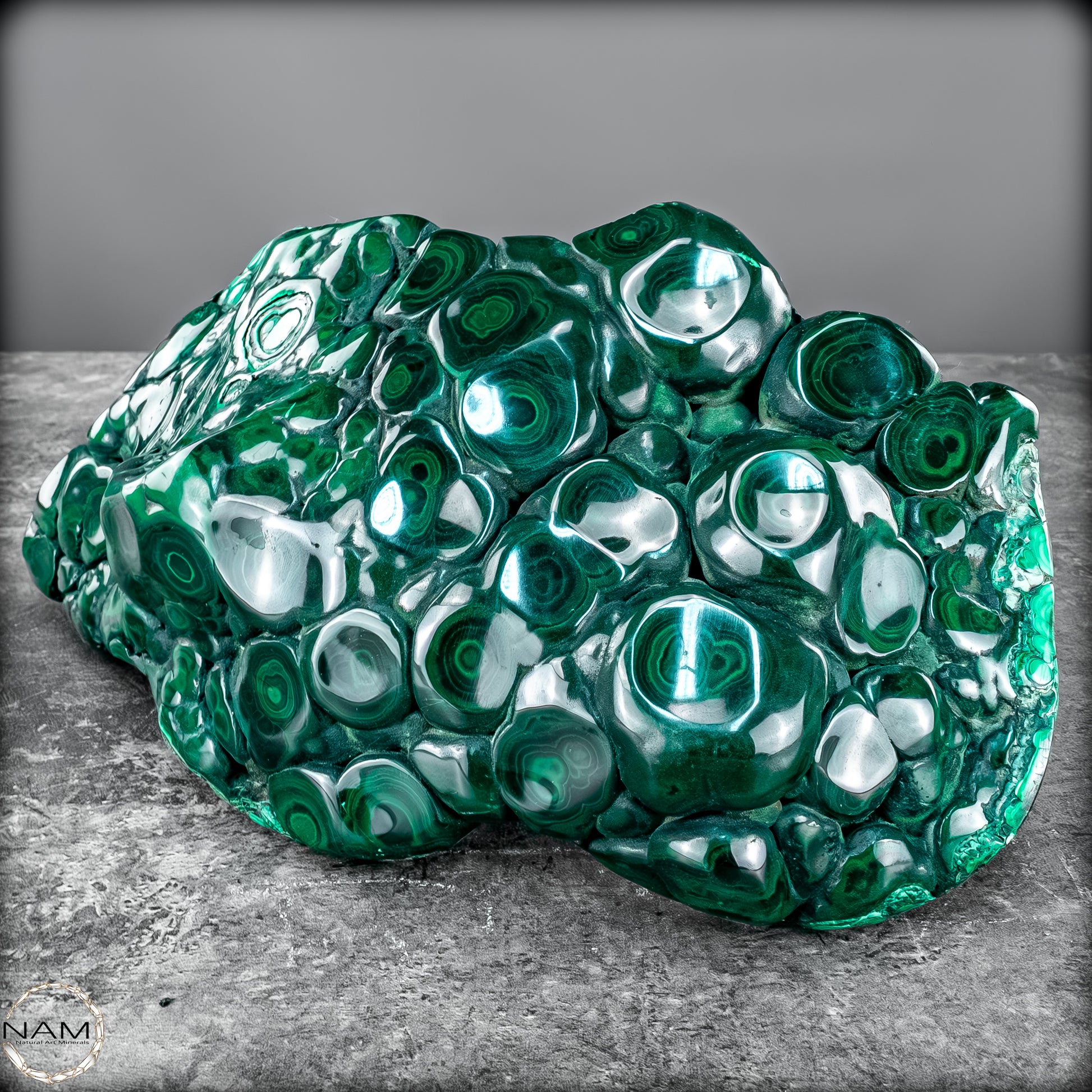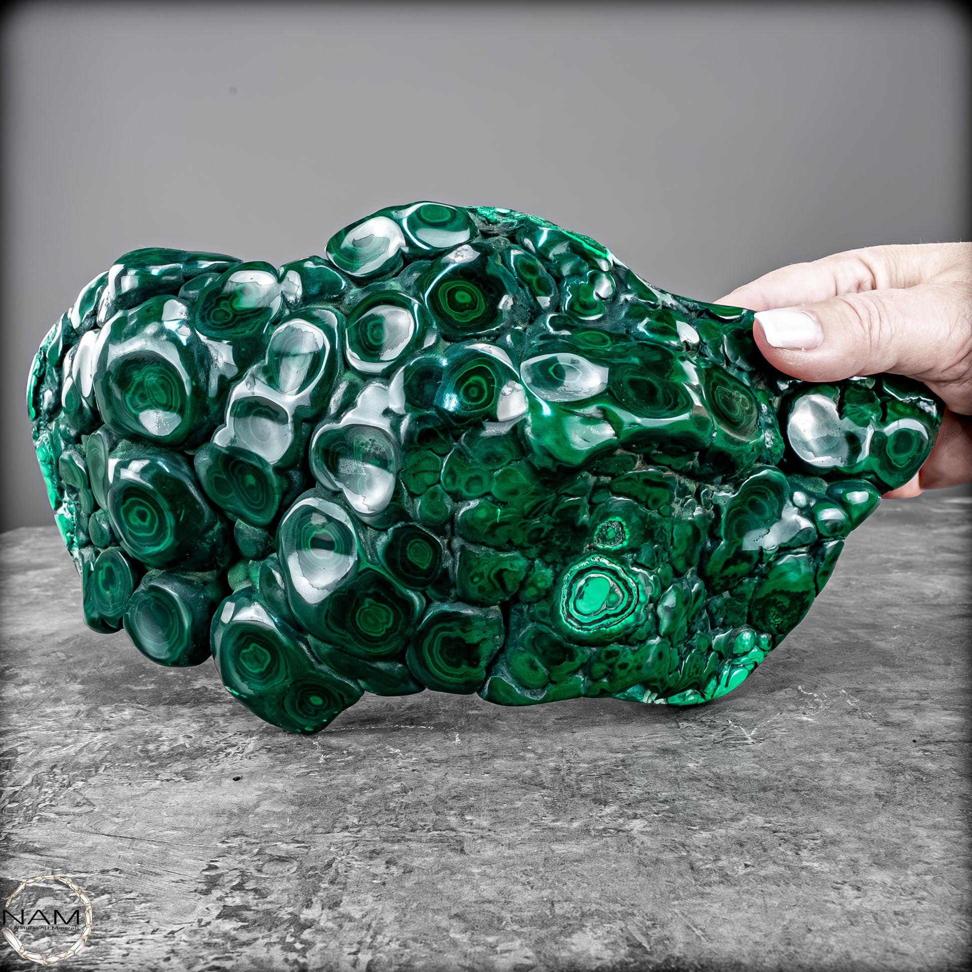 Diese eindrucksvolle Malachit-Stufe begeistert mit ihren leuchtend grünen, konzentrisch gebänderten Augenmustern und der charakteristischen, botryoidalen Oberfläche. Die plastische Struktur mit ihren glänzenden, gewölbten Rundungen erzeugt ein lebendiges Spiel aus Licht und Schatten auf der Oberfläche, während die feinen Farbübergänge von sattem Smaragdgrün bis zu hellen Türkistönen die Tiefe und Komplexität des Steins unterstreichen.