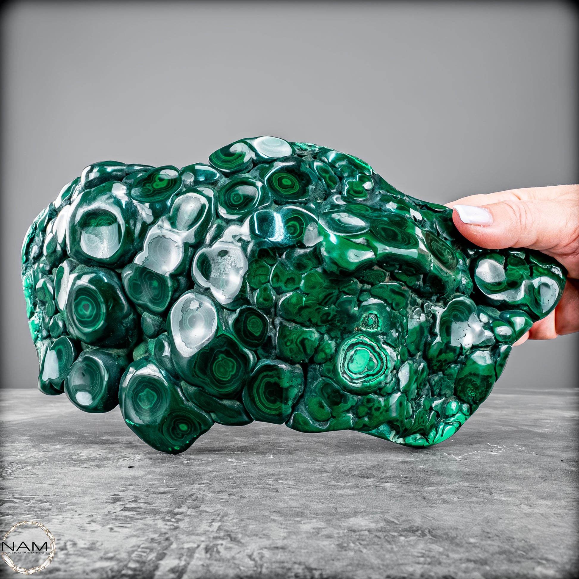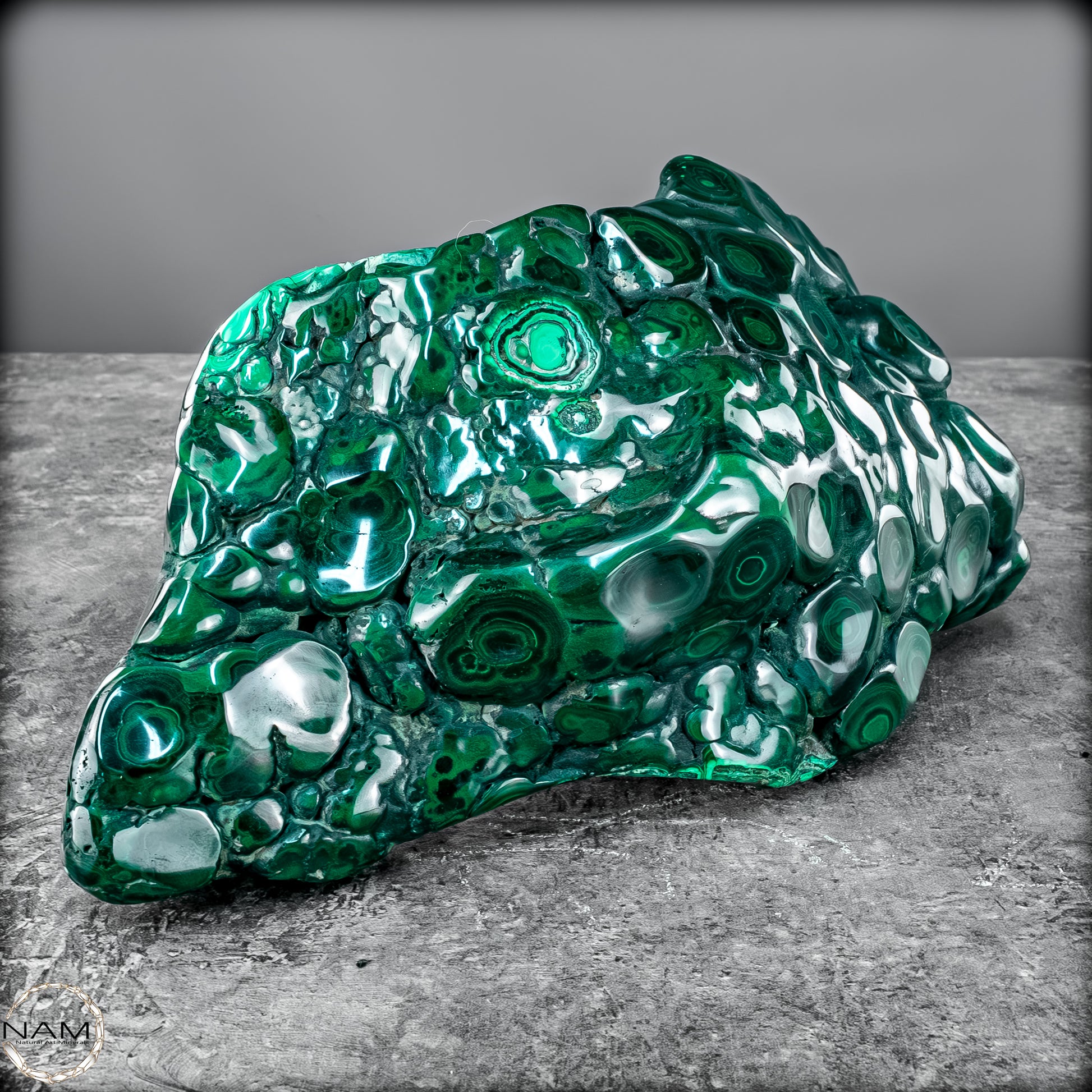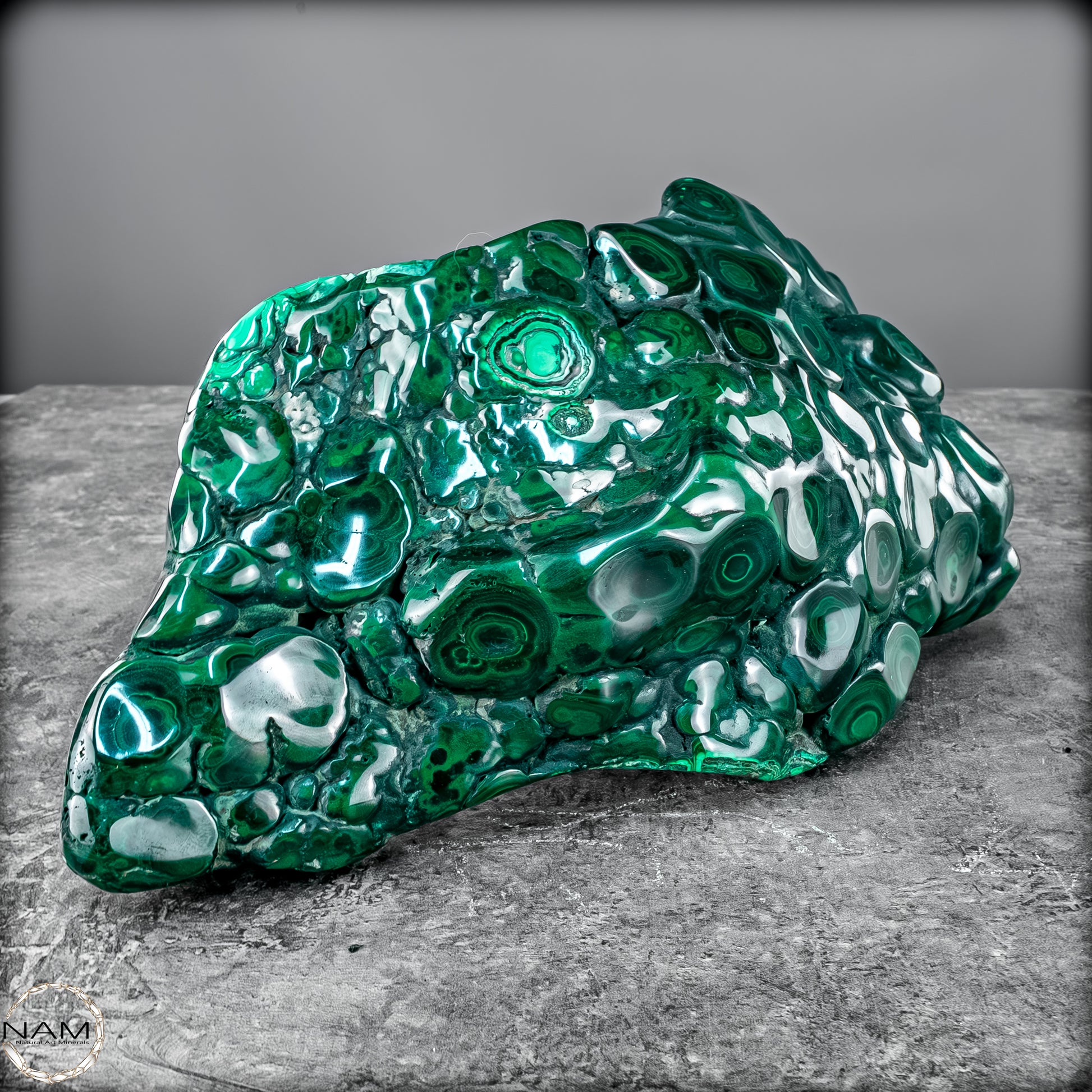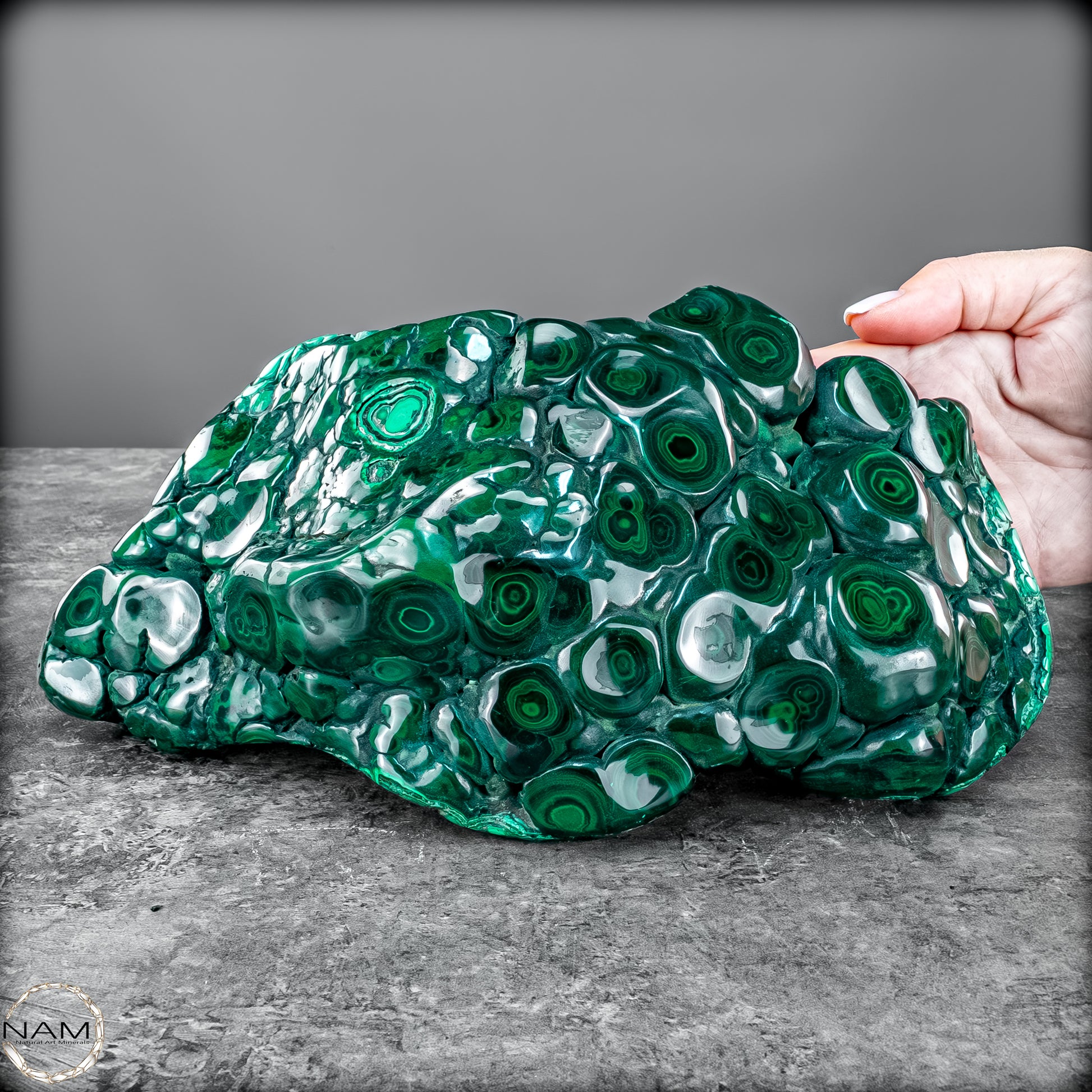 Diese eindrucksvolle Malachit-Stufe begeistert mit ihren leuchtend grünen, konzentrisch gebänderten Augenmustern und der charakteristischen, botryoidalen Oberfläche. Die plastische Struktur mit ihren glänzenden, gewölbten Rundungen erzeugt ein lebendiges Spiel aus Licht und Schatten auf der Oberfläche, während die feinen Farbübergänge von sattem Smaragdgrün bis zu hellen Türkistönen die Tiefe und Komplexität des Steins unterstreichen.