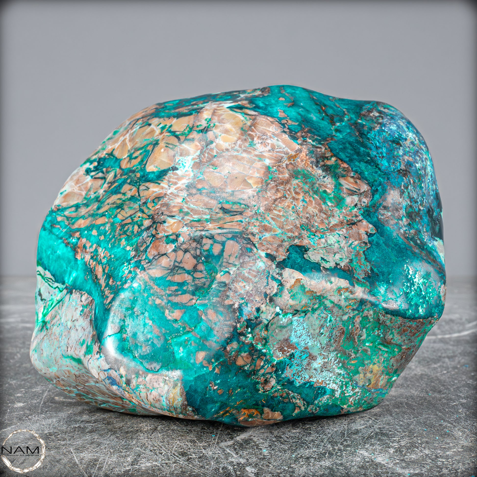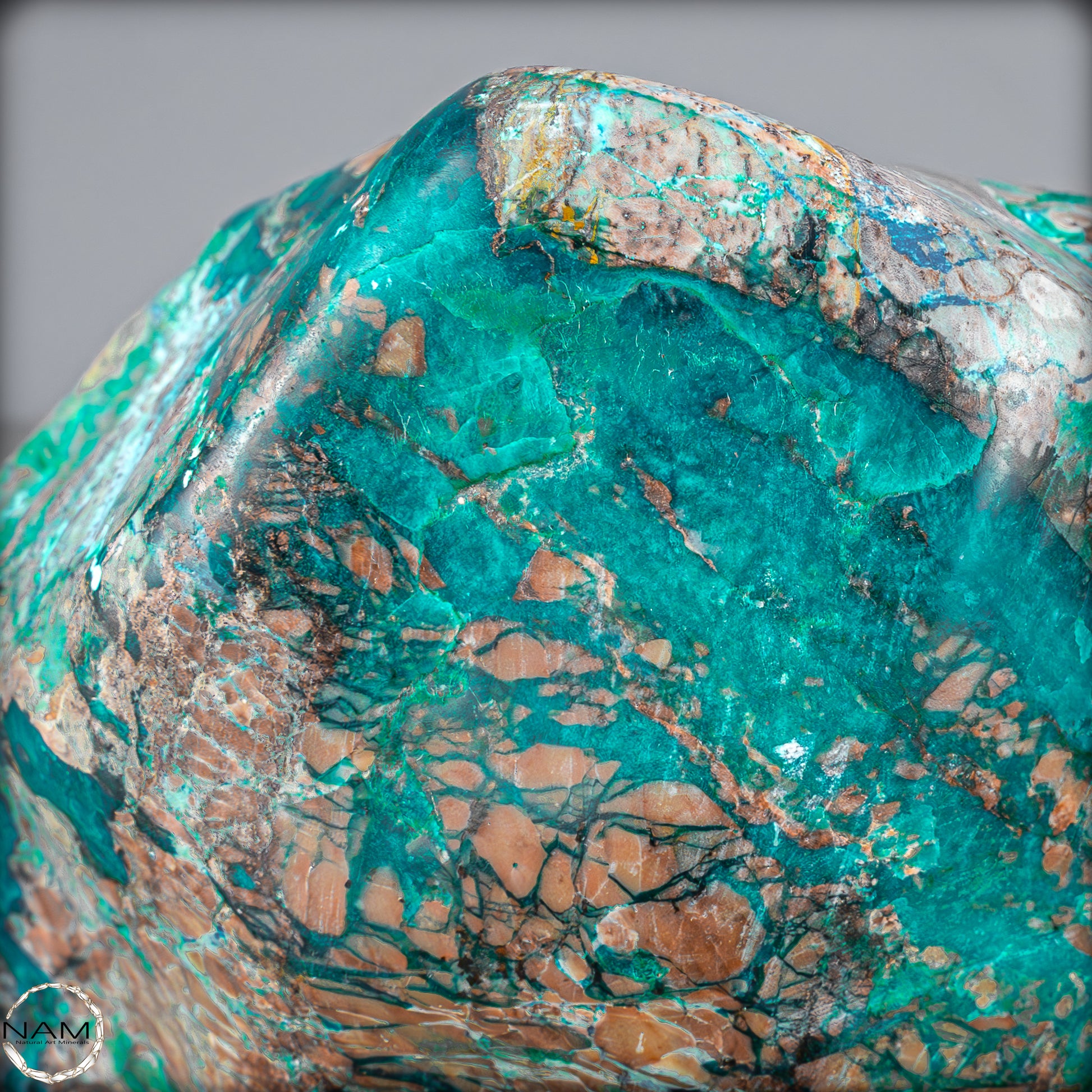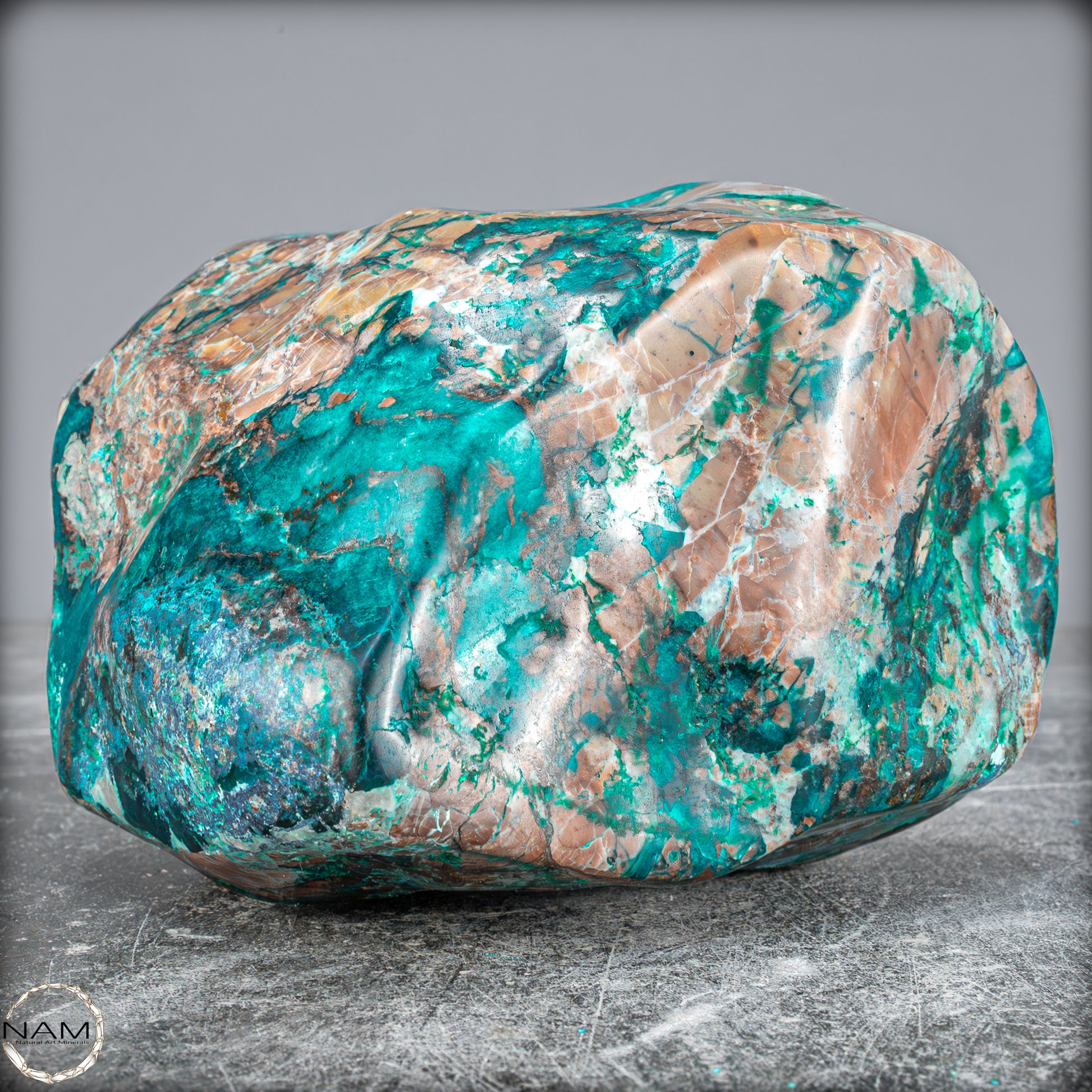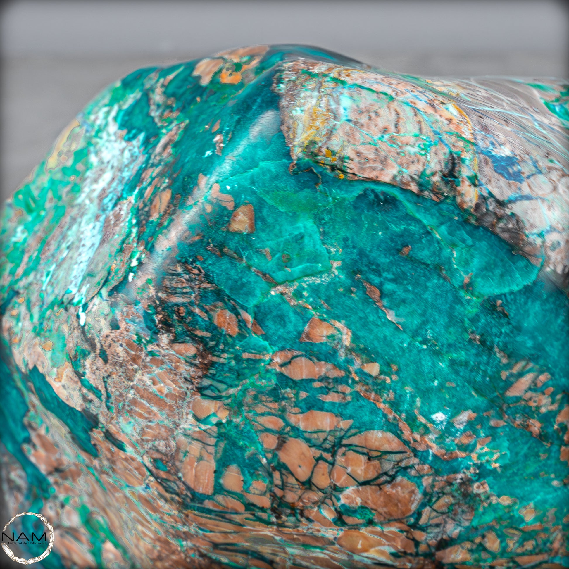 Diese eindrucksvolle Freiform präsentiert eine lebendige Kombination aus Türkisgrün, Brauntönen und hellen Kontrasten, die sich in einem faszinierenden Netz aus Adern, Einschlüssen und polierten Flächen über den gesamten Stein ziehen. Es handelt sich um eine natürlich gewachsene Verbindung aus Malachit, Chrysokoll, Dioptas und kupferhaltigem Muttergestein, die in dieser besonderen Form eine außergewöhnliche visuelle Tiefe entfaltet. Die smaragdgrünen Kristallbereiche des Dioptas ergänzen die weichen Blau- und Grüntöne von Chrysokoll und die satten, schimmernden Flächen des Malachits zu einem harmonischen Gesamtbild, das Naturkraft und Ästhetik vereint.
