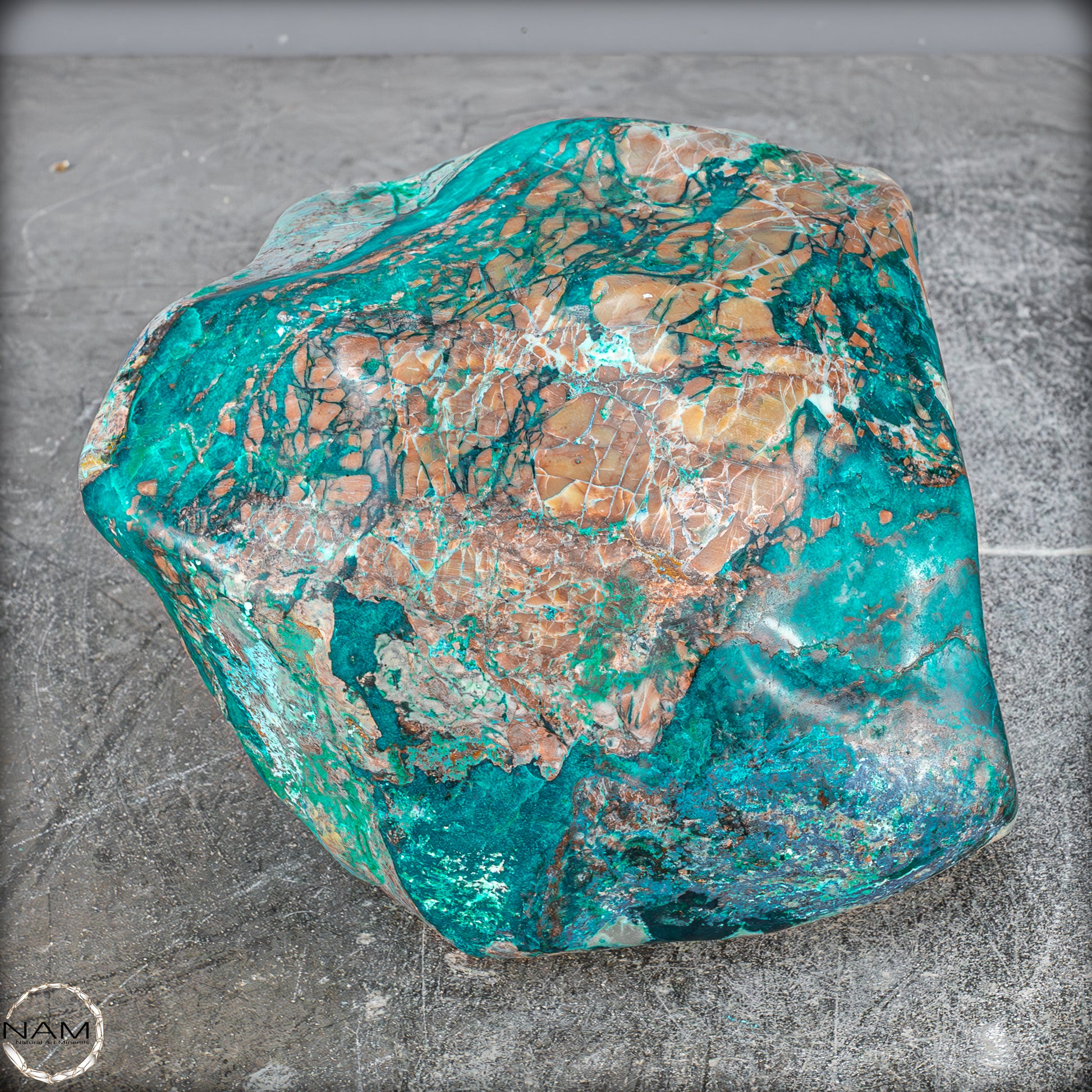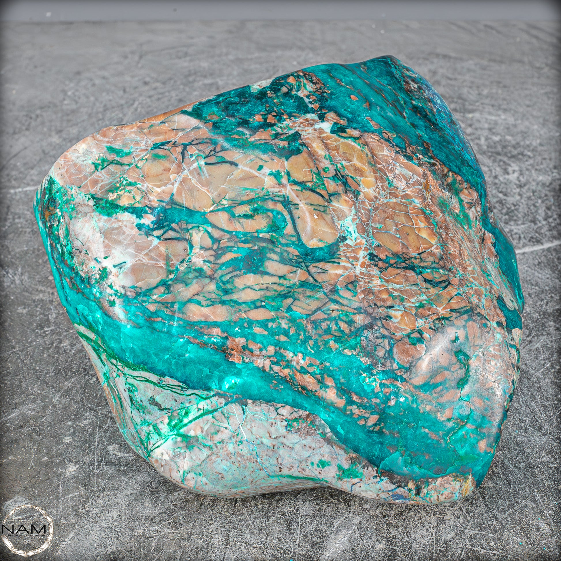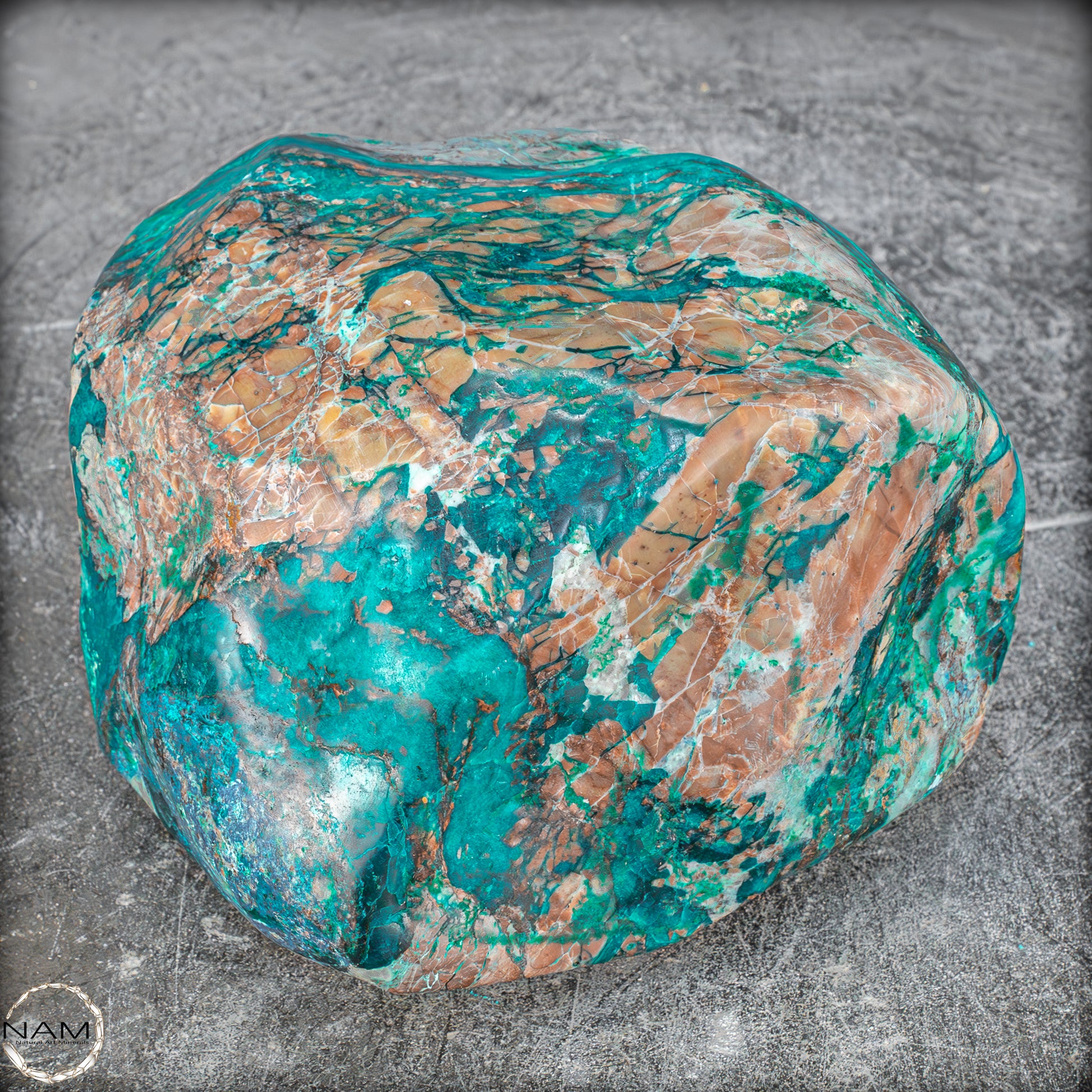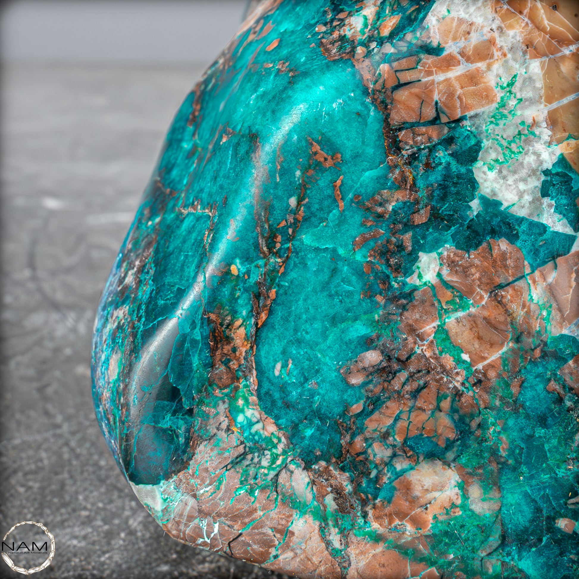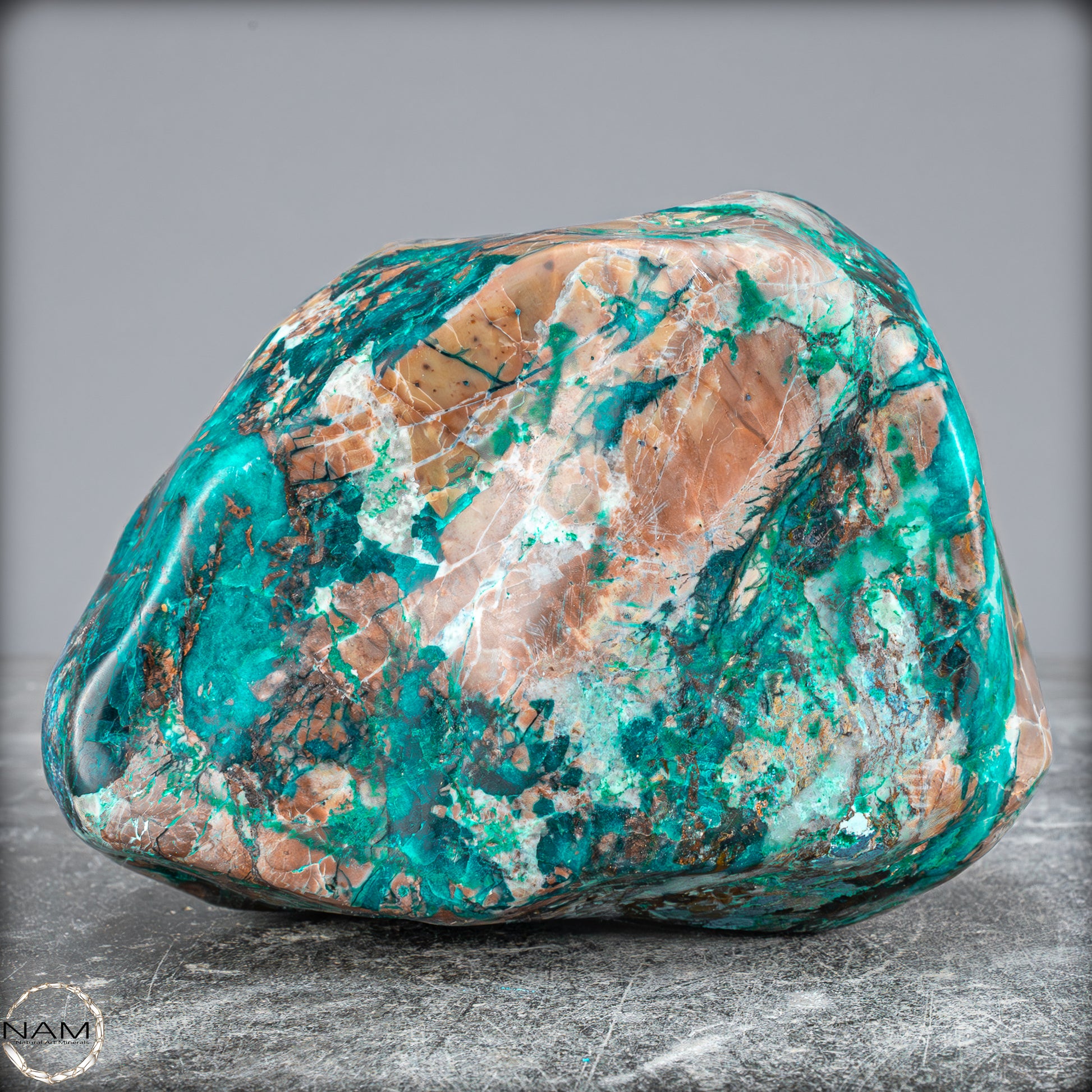 Diese eindrucksvolle Freiform präsentiert eine lebendige Kombination aus Türkisgrün, Brauntönen und hellen Kontrasten, die sich in einem faszinierenden Netz aus Adern, Einschlüssen und polierten Flächen über den gesamten Stein ziehen. Es handelt sich um eine natürlich gewachsene Verbindung aus Malachit, Chrysokoll, Dioptas und kupferhaltigem Muttergestein, die in dieser besonderen Form eine außergewöhnliche visuelle Tiefe entfaltet. Die smaragdgrünen Kristallbereiche des Dioptas ergänzen die weichen Blau- und Grüntöne von Chrysokoll und die satten, schimmernden Flächen des Malachits zu einem harmonischen Gesamtbild, das Naturkraft und Ästhetik vereint.