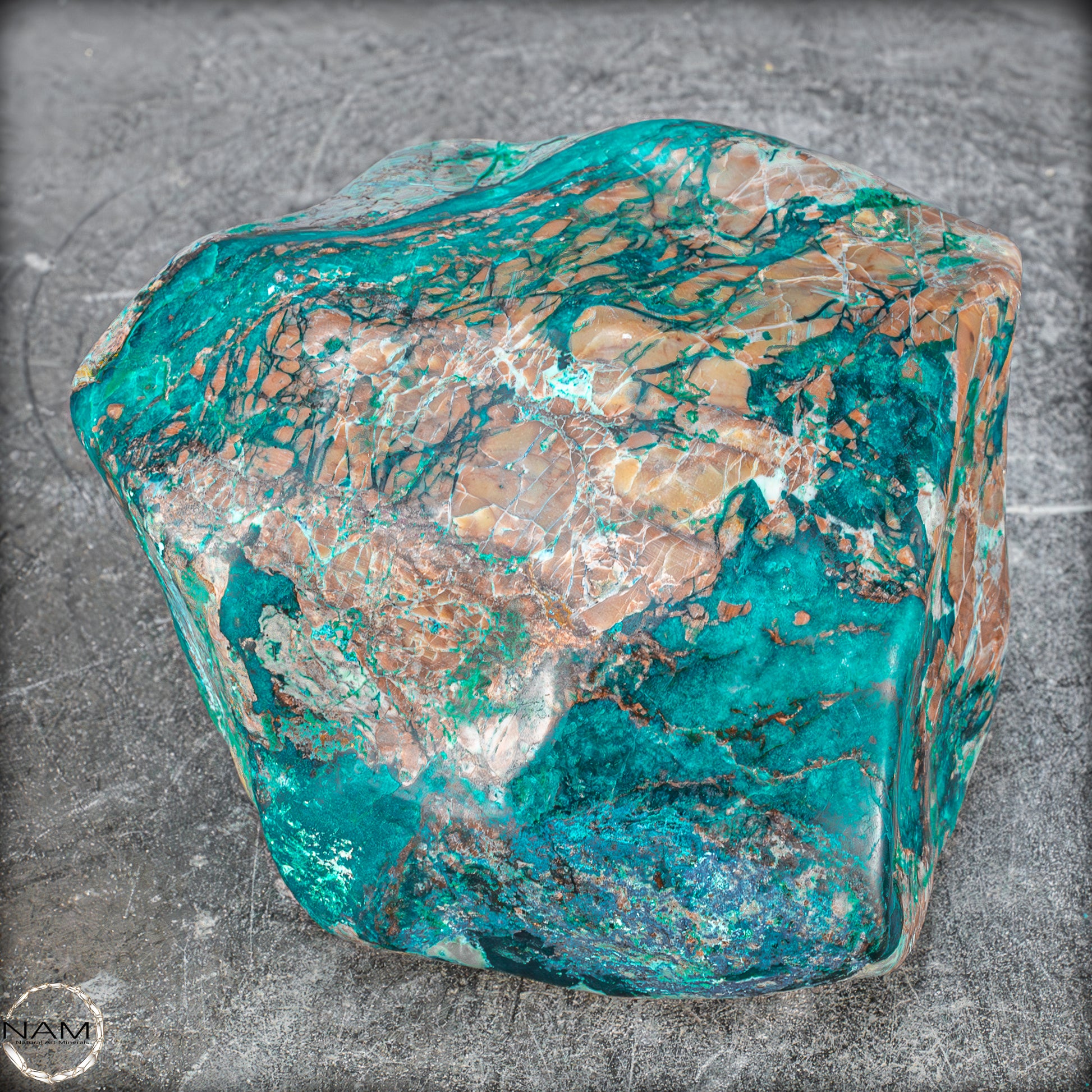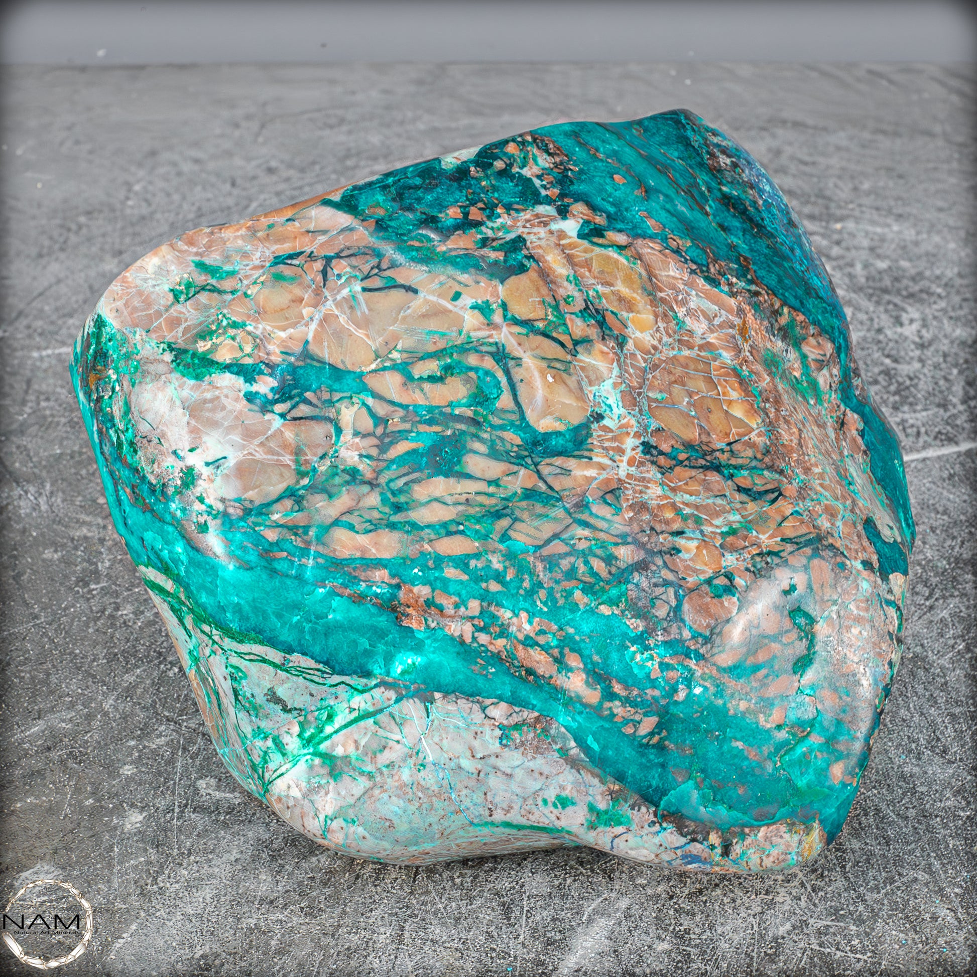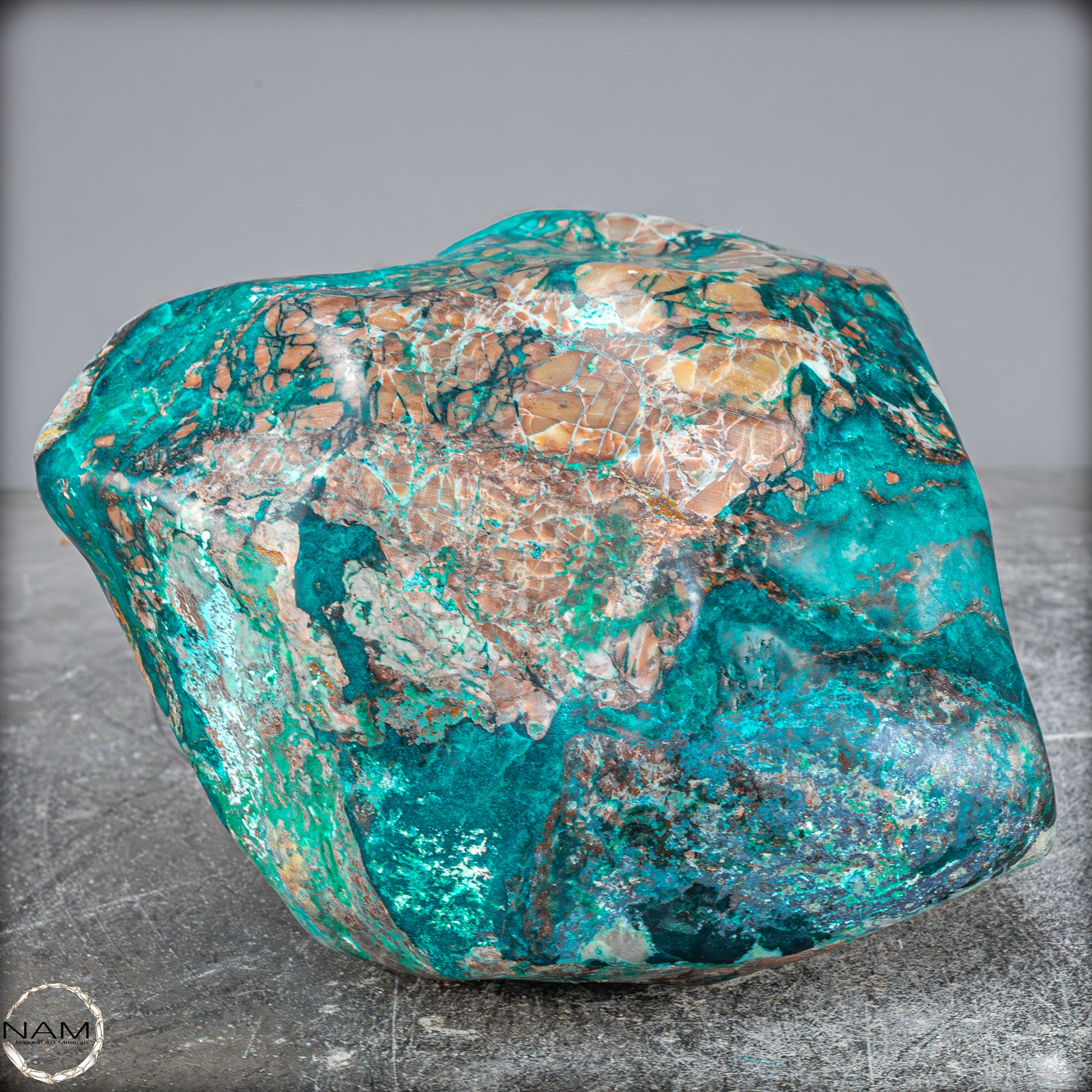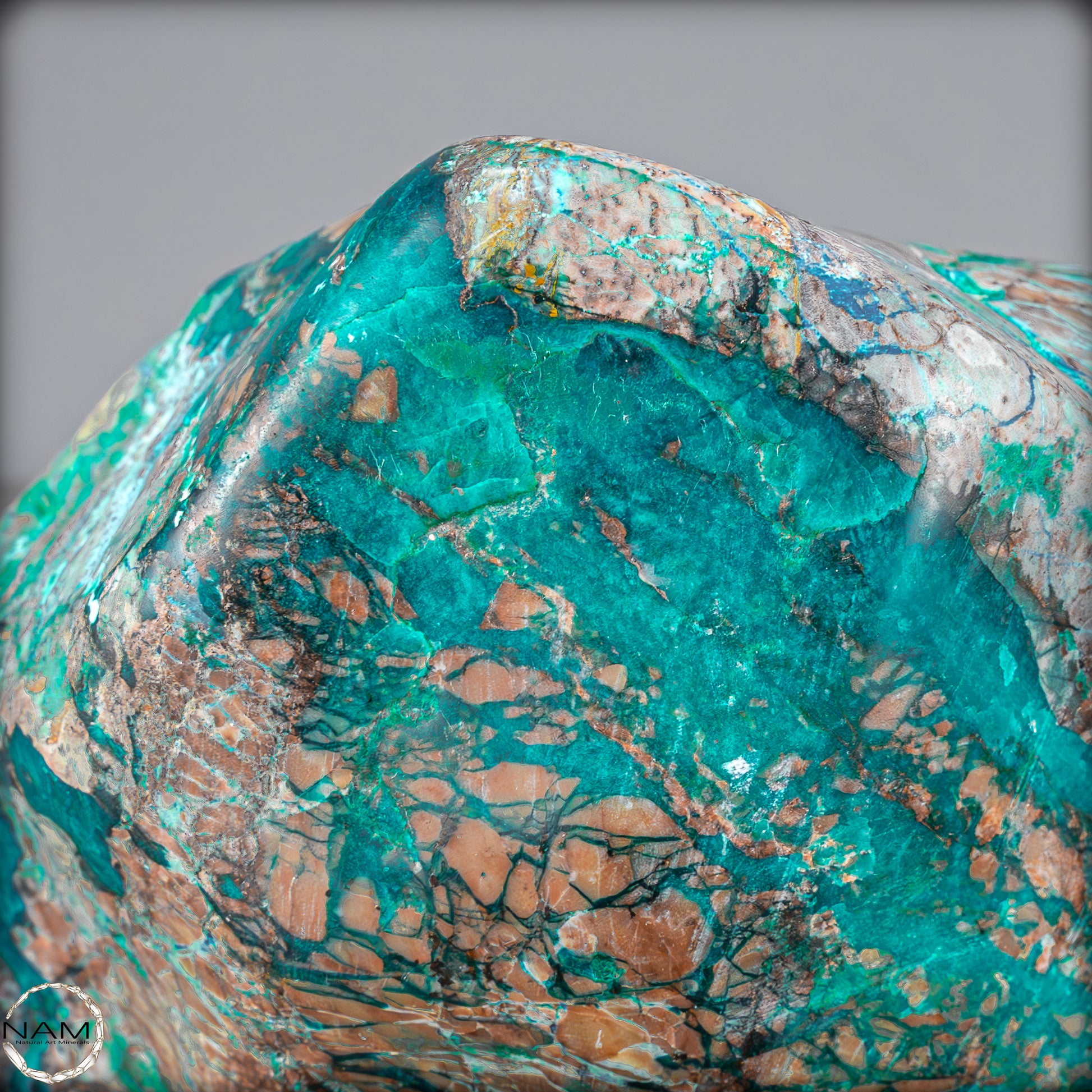 Diese eindrucksvolle Freiform präsentiert eine lebendige Kombination aus Türkisgrün, Brauntönen und hellen Kontrasten, die sich in einem faszinierenden Netz aus Adern, Einschlüssen und polierten Flächen über den gesamten Stein ziehen. Es handelt sich um eine natürlich gewachsene Verbindung aus Malachit, Chrysokoll, Dioptas und kupferhaltigem Muttergestein, die in dieser besonderen Form eine außergewöhnliche visuelle Tiefe entfaltet. Die smaragdgrünen Kristallbereiche des Dioptas ergänzen die weichen Blau- und Grüntöne von Chrysokoll und die satten, schimmernden Flächen des Malachits zu einem harmonischen Gesamtbild, das Naturkraft und Ästhetik vereint.
