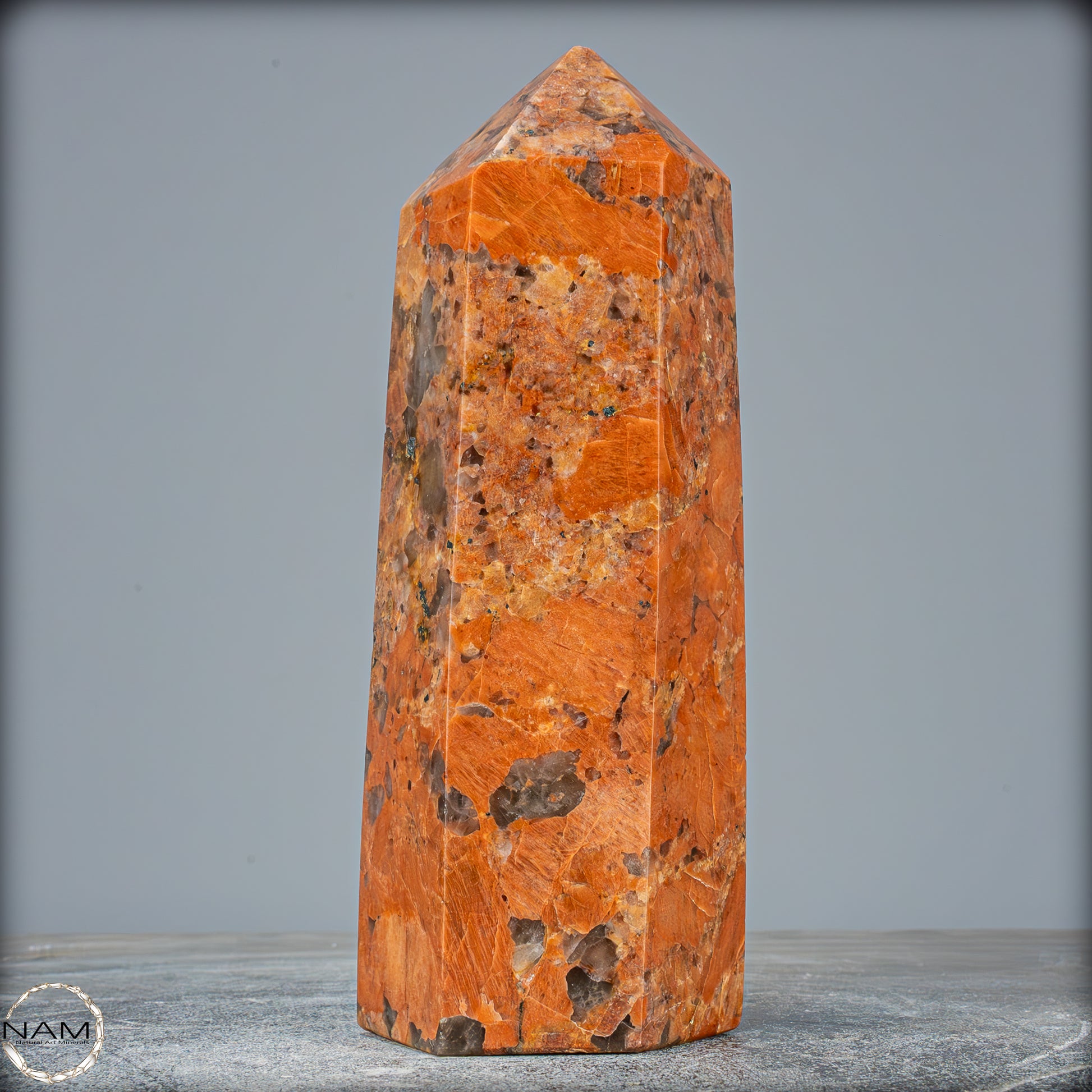Dieser charaktervolle Obelisk vereint feurig-rote Granatkristalle mit der sanften Eleganz von pfirsichfarbenem Microklin, auch bekannt als Pfirsich-Mondstein. Die polierte Oberfläche offenbart ein lebendiges Gefüge aus rötlich-orangenen Granateinschlüssen, eingebettet in eine feldspatreiche Matrix aus hellen, gräulichen und pfirsichfarbenen Tönen. Bei passendem Lichteinfall zeigt sich ein feiner Schimmer – ein typisches Merkmal des enthaltenen Microklins – das dem Stück zusätzliche Tiefe und Lebendigkeit verleiht.
