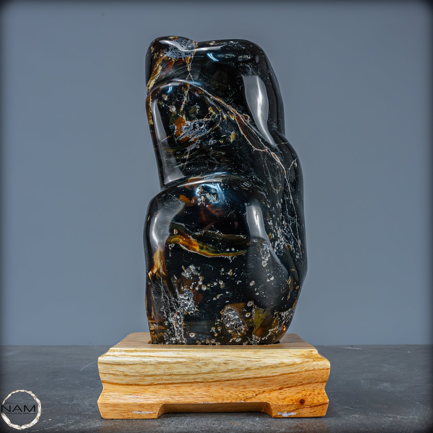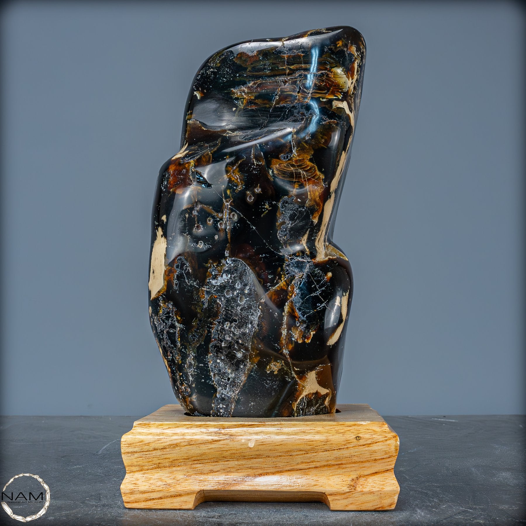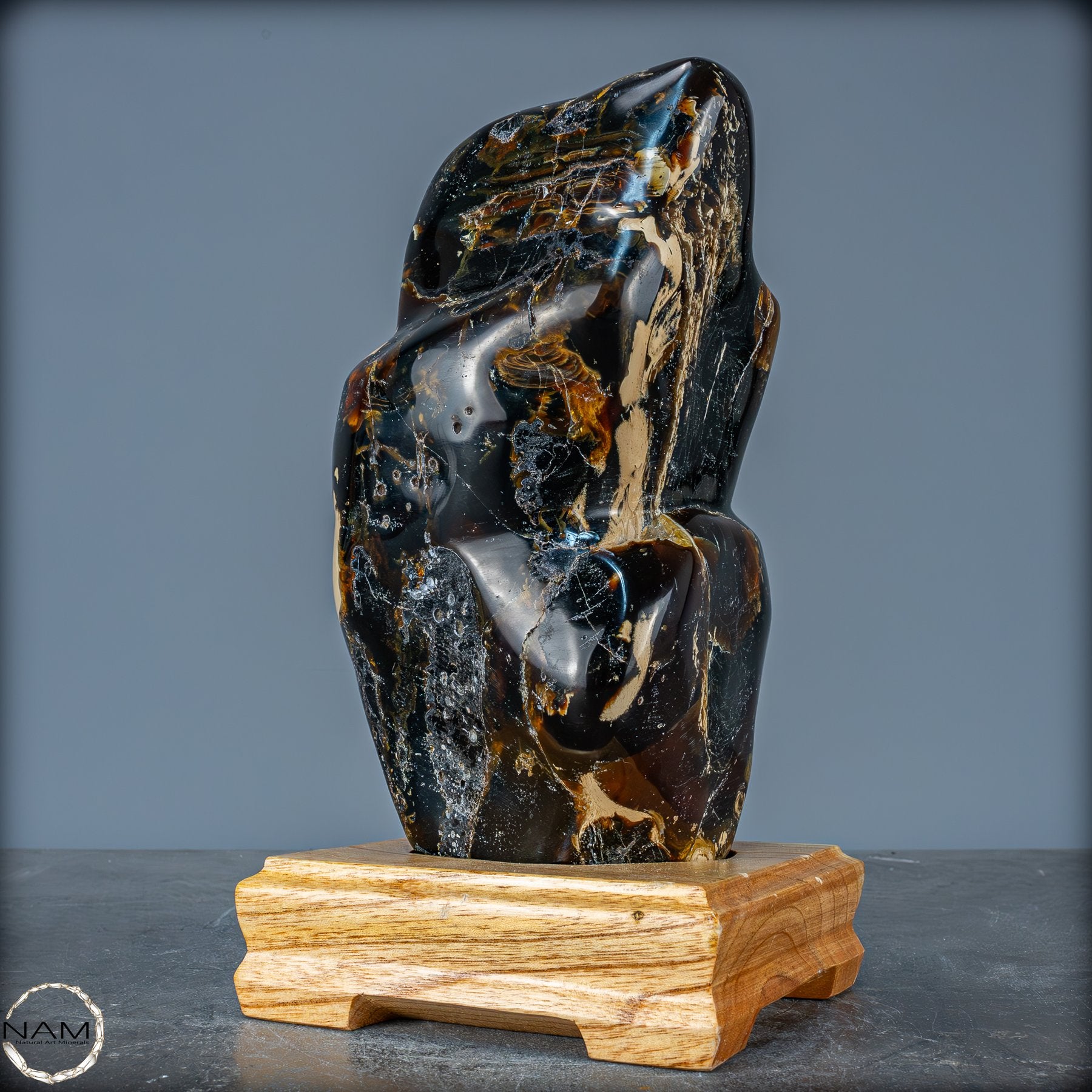 Dieses außergewöhnliche Stück ist ein polierter Bernstein aus Indonesien. Der Bernstein weist eine dunkle, grün-blaue bis schwarze Färbung auf, die in der Durchsicht ein beeindruckendes, feuriges Rot enthüllt. Dies ist ein charakteristisches Merkmal von indonesischem Bernstein, der häufig in satten, warmen Farben leuchtet, wenn Licht hindurchscheint.
