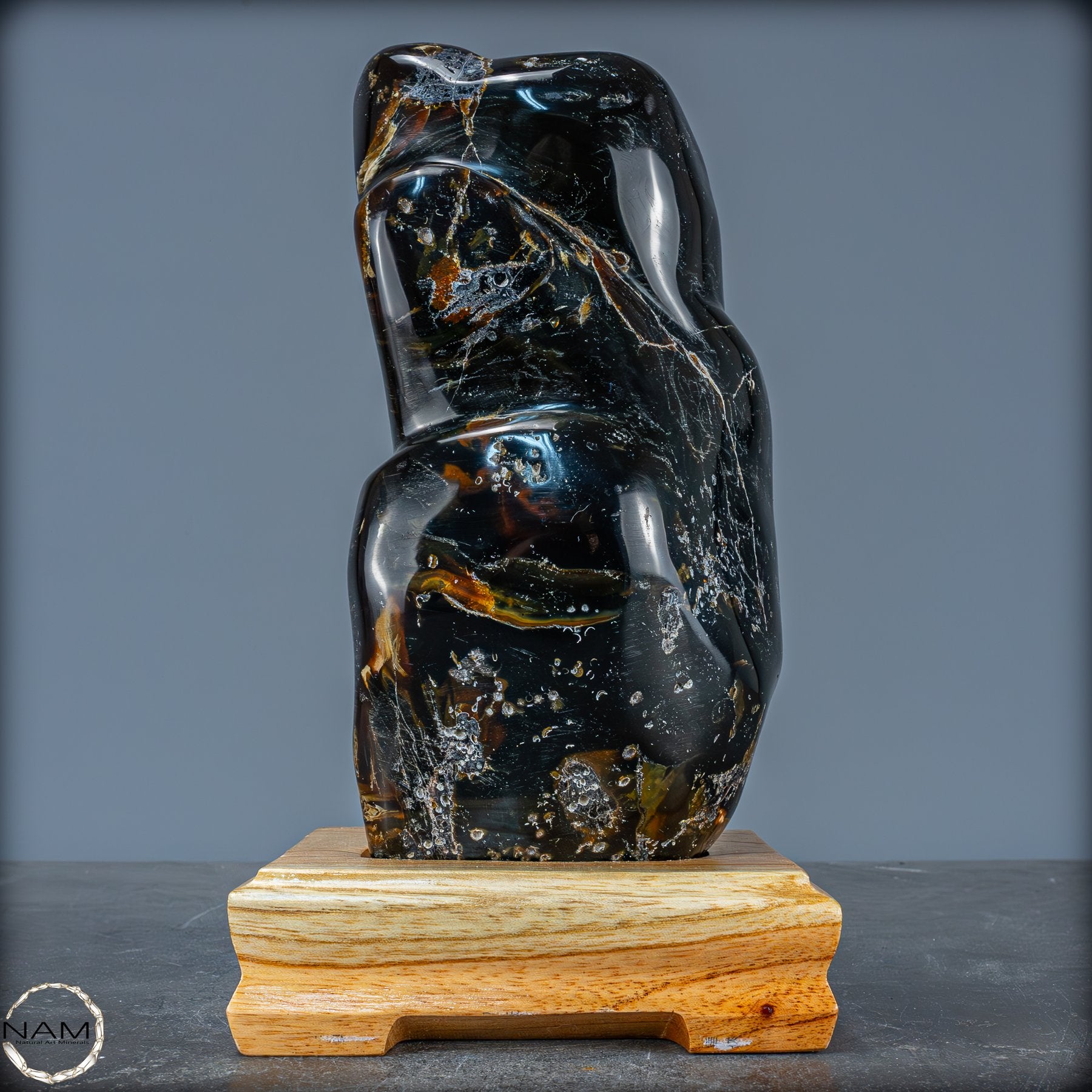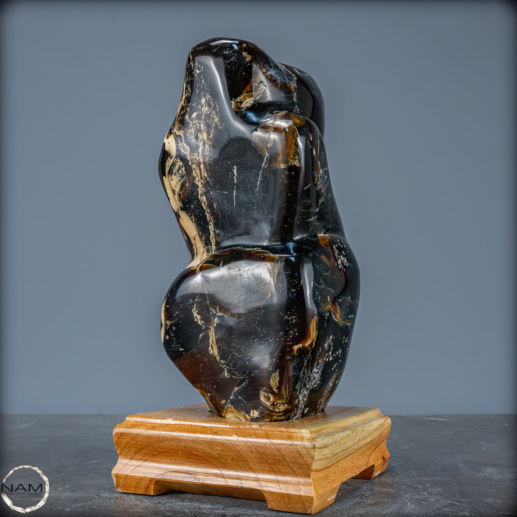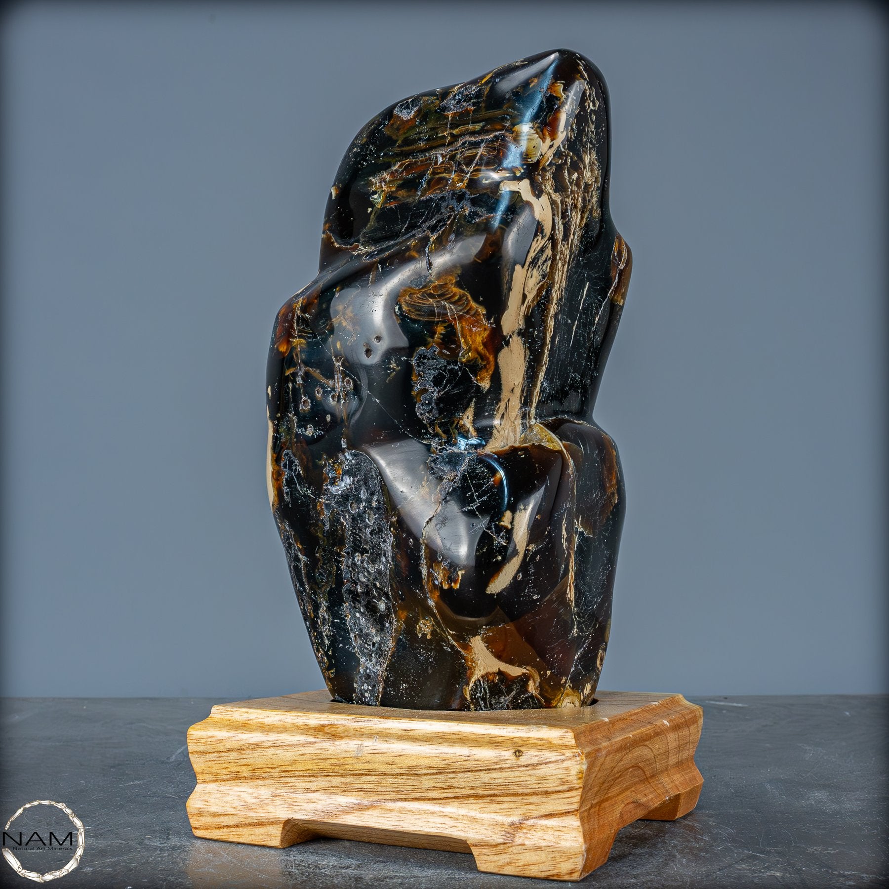 Dieses außergewöhnliche Stück ist ein polierter Bernstein aus Indonesien. Der Bernstein weist eine dunkle, grün-blaue bis schwarze Färbung auf, die in der Durchsicht ein beeindruckendes, feuriges Rot enthüllt. Dies ist ein charakteristisches Merkmal von indonesischem Bernstein, der häufig in satten, warmen Farben leuchtet, wenn Licht hindurchscheint.