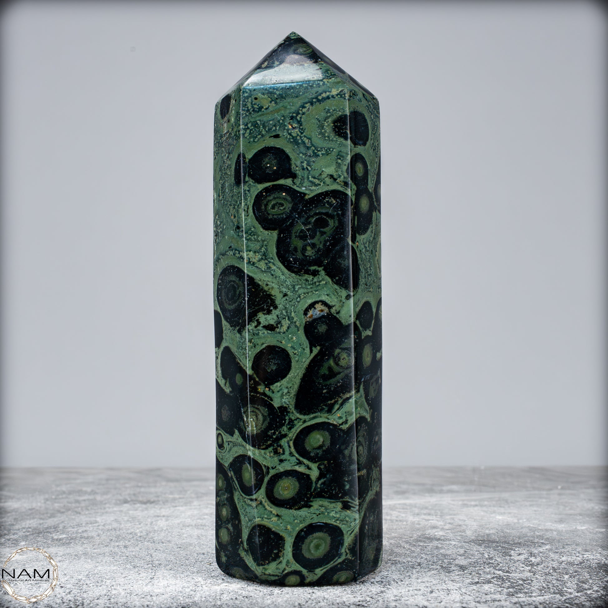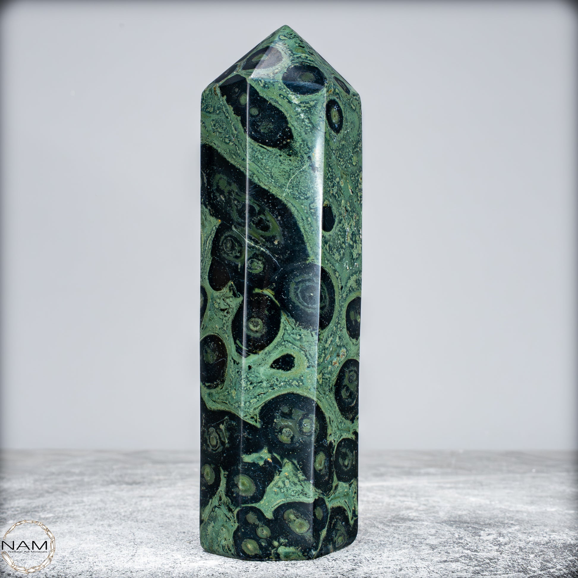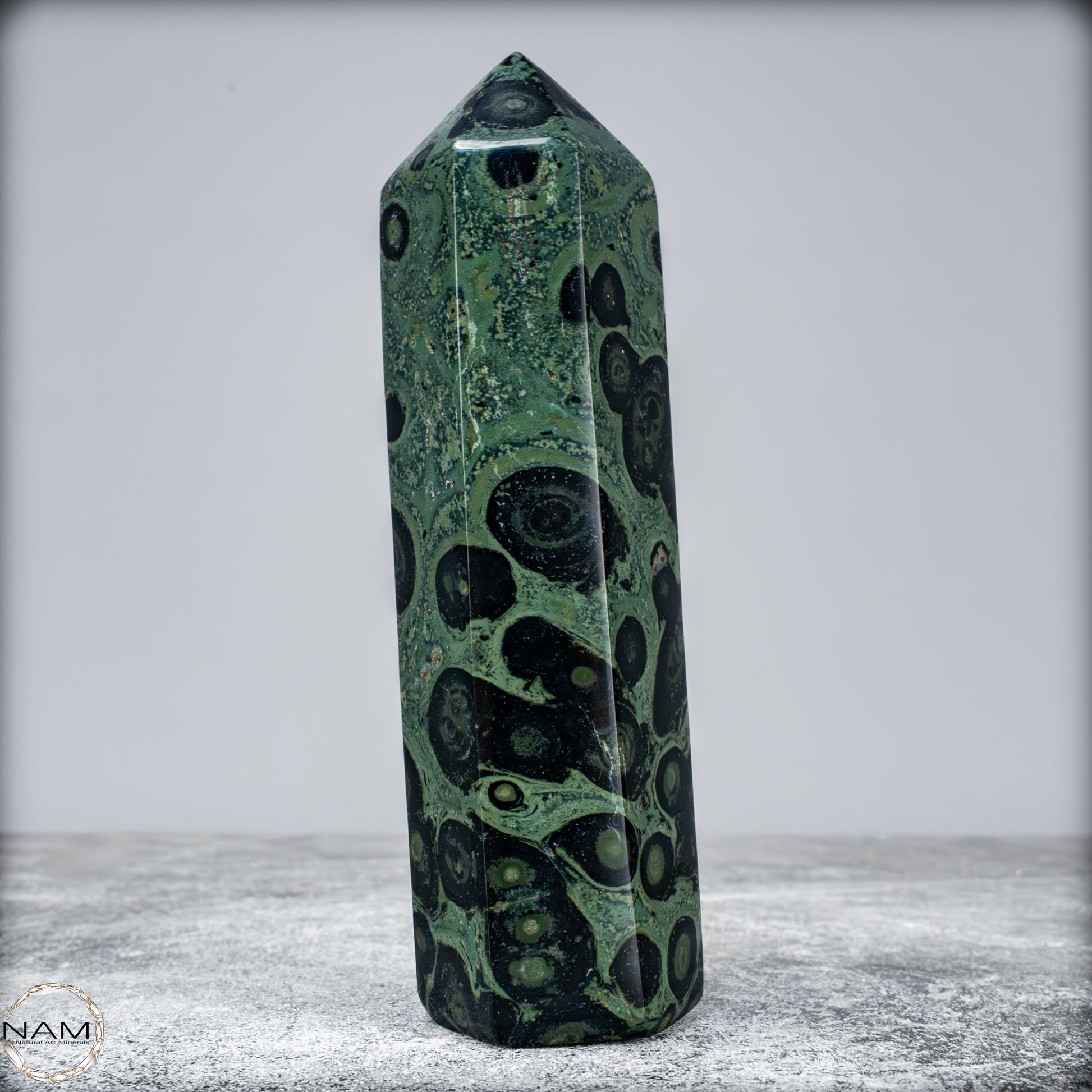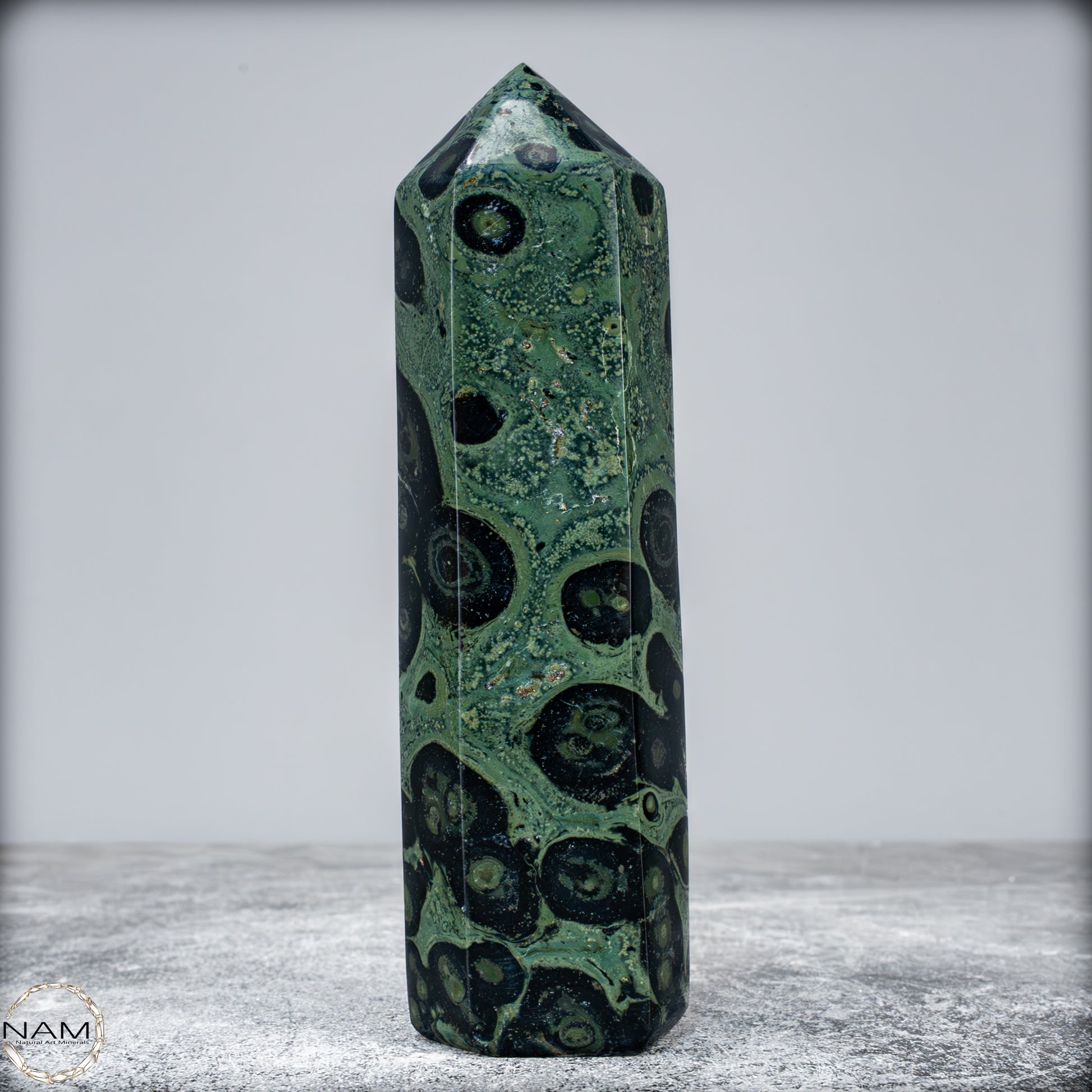 Kambaba-Jaspis, auch bekannt als Krokodilenjaspis, ist ein faszinierender Stein mit einer tiefgrünen bis fast schwarzen Farbgebung, durchzogen von auffälligen kreisförmigen Strukturen und dunklen Wirbeln. Die charakteristischen Muster wirken wie mikroskopische Fossilien, was nicht zufällig ist: Kambaba besteht teilweise aus fossilen Cyanobakterien, die über zwei Milliarden Jahre alt sind. Die gezeigte Turmform verleiht dem Stein eine kraftvolle, ausrichtende Präsenz und verstärkt seine energetische Wirkung durch die klare vertikale Struktur.