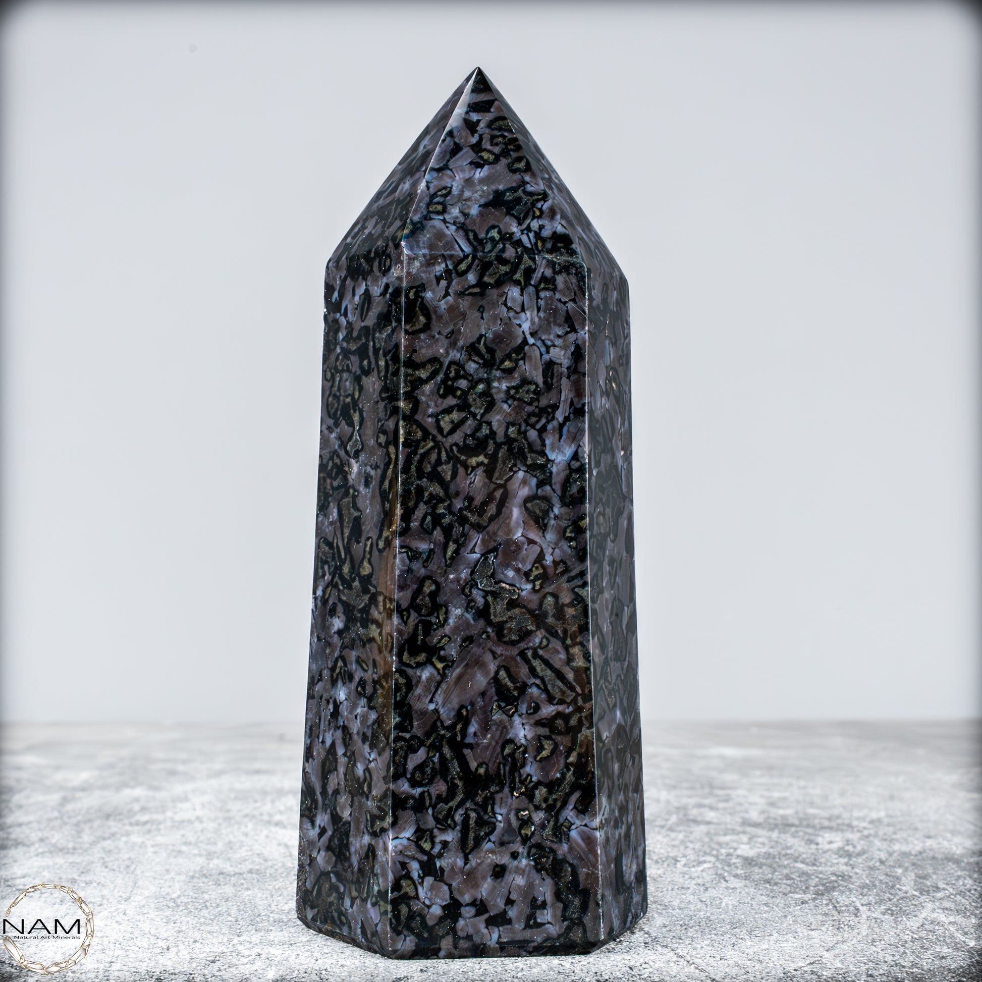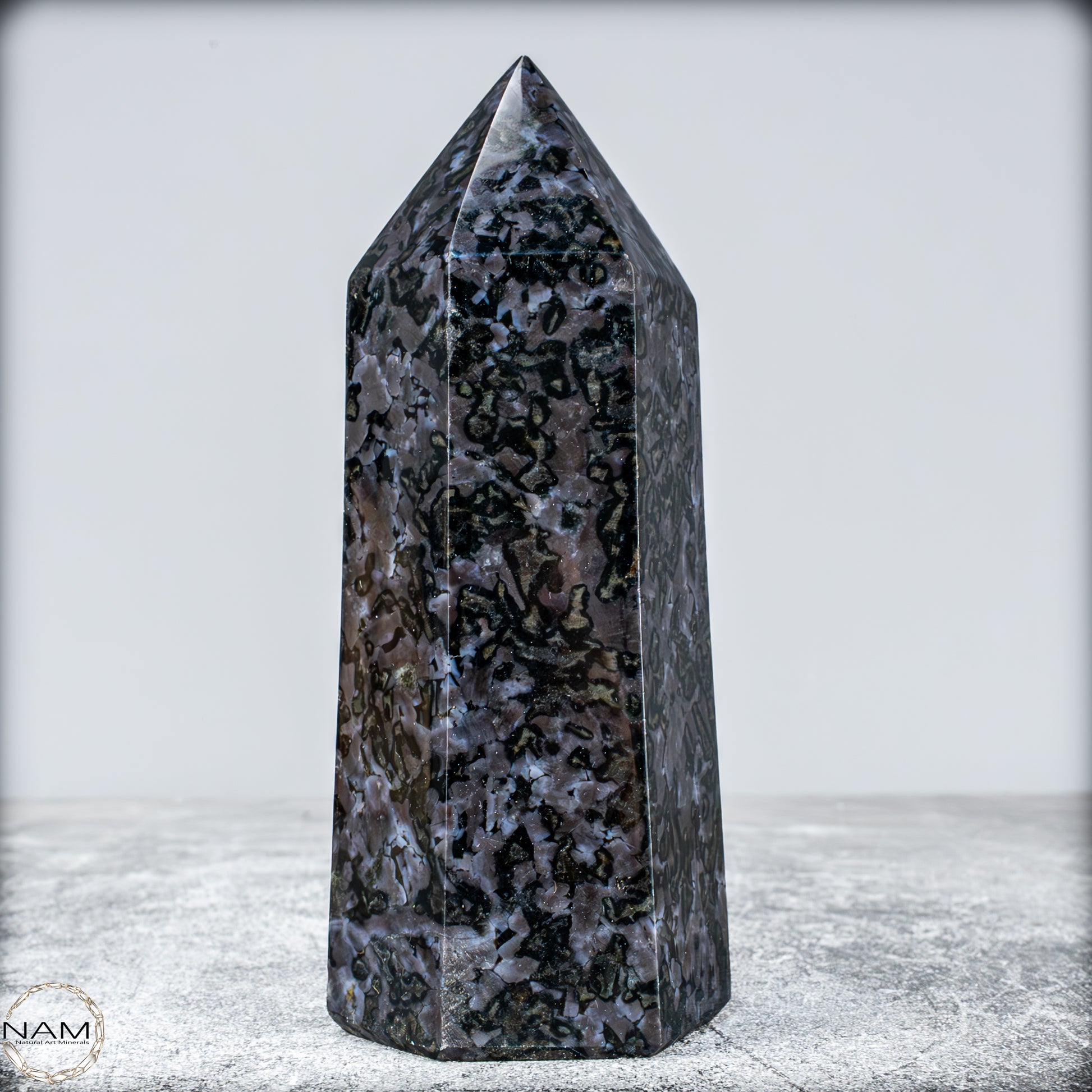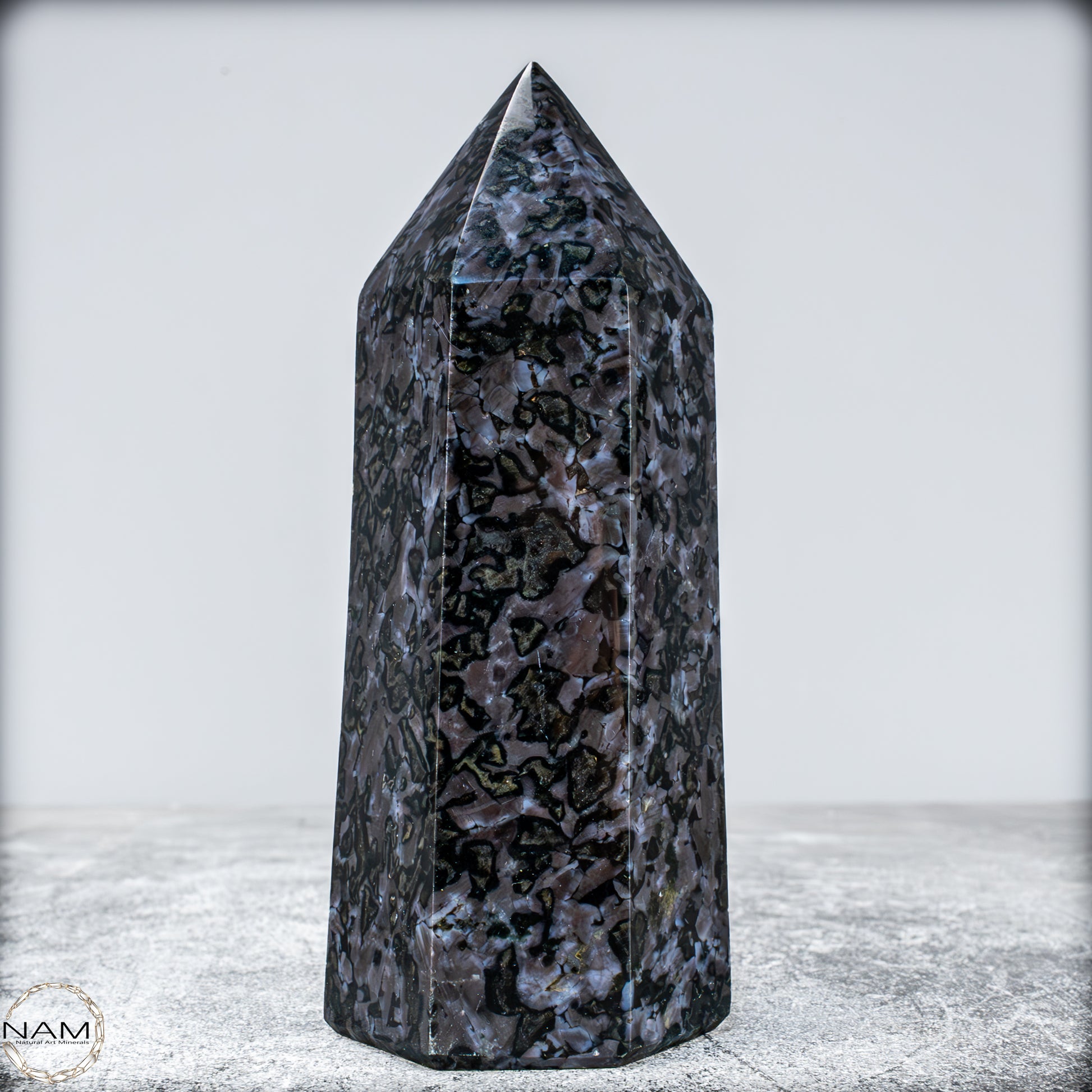 a, das ist ein wunderschöner Merlinite Obelisk, auch bekannt als Mystischer Merlinstein. Die charakteristischen Muster mit dunklen Adern und wolkigen, marmorierten Strukturen in Schwarz, Grau und Violett sind typisch für diesen Stein.