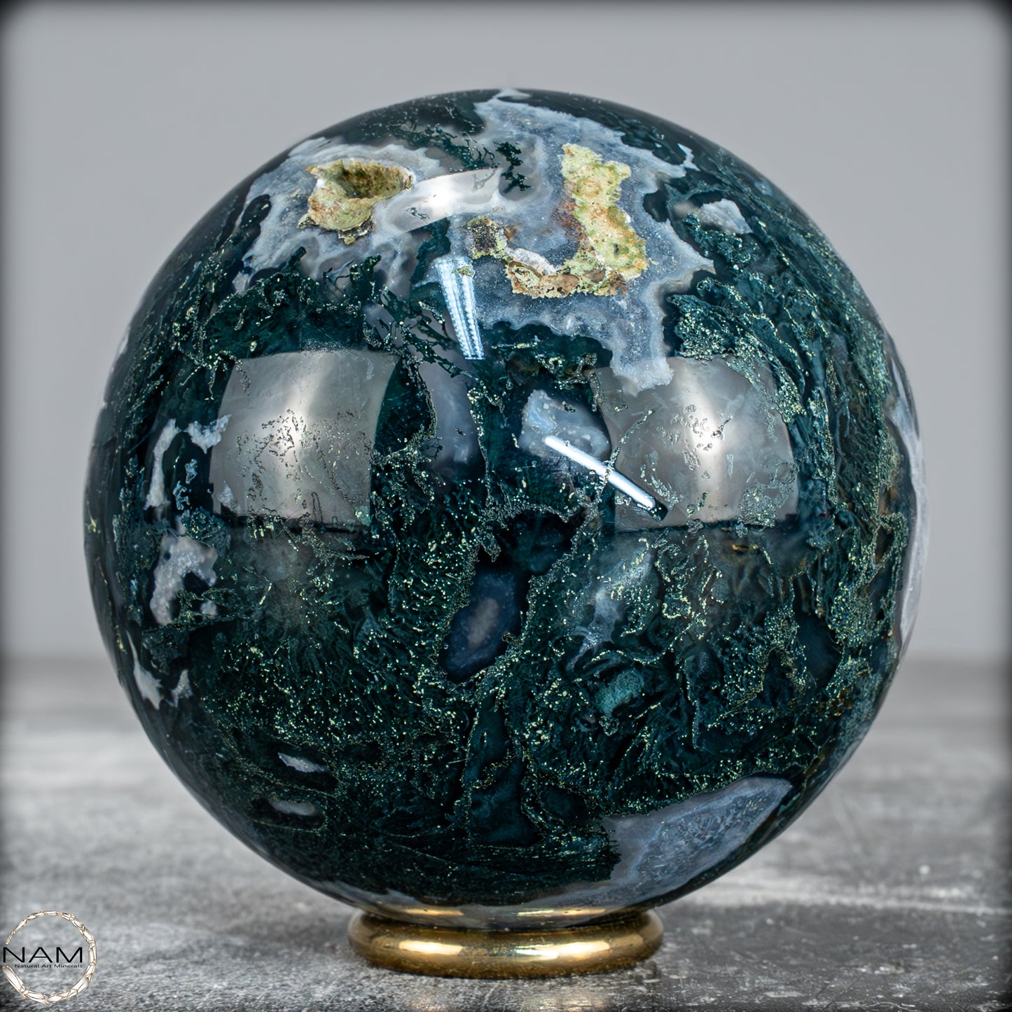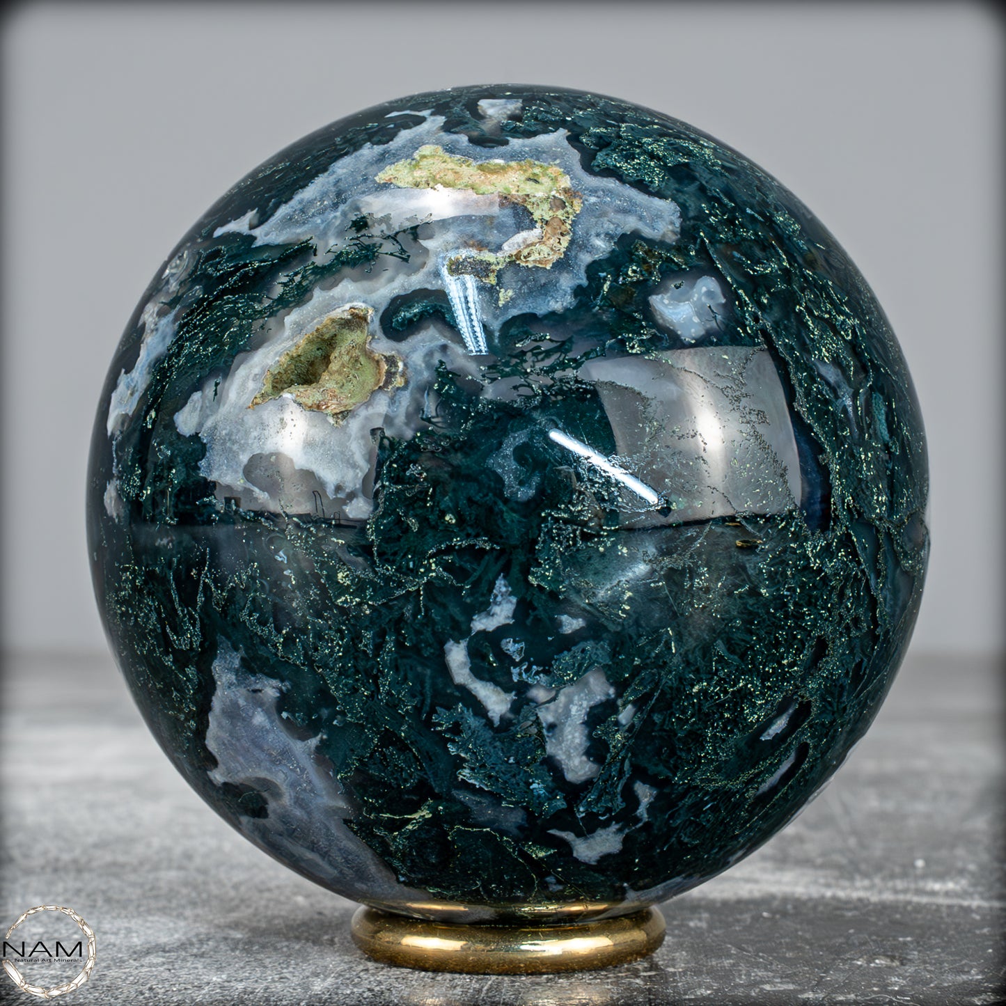 Eine einzigartige Kugel, die aus einem wunderschönen Kristall aus Moos-Achat geschnitzt ist, genannt Agata Sakura, was auf Japanisch 'Kirschblüten' bedeutet. Er zeichnet sich durch große Quarzkristalle mit einem grünen Ton und Achat-Einschlüssen im Inneren aus. Diese Formation kommt nicht sehr häufig vor, insbesondere nicht in grünem Ton. Der Achat im Inneren hat zentrale weiße Punkte, umgeben von einer dunkleren, schnell transparenten schwarzen Färbung. Eine weitere Eigenschaft dieses Kristallturms ist das Vorhandensein mehrerer Geoden, die Einblicke in die innere Kristallisation ermöglichen und einen faszinierenden visuellen Kontrast erzeugen.