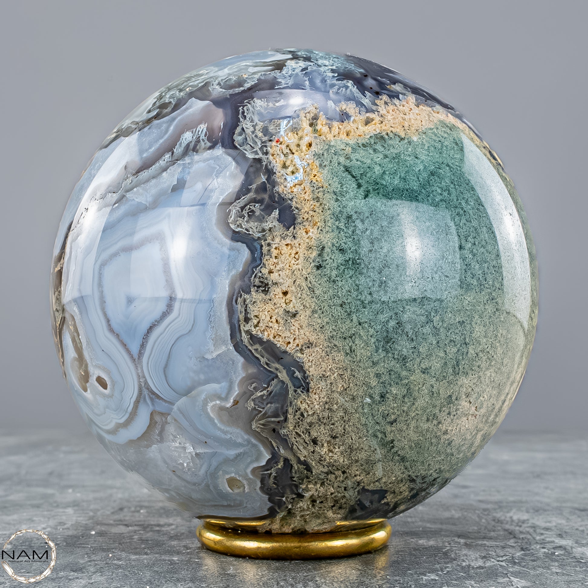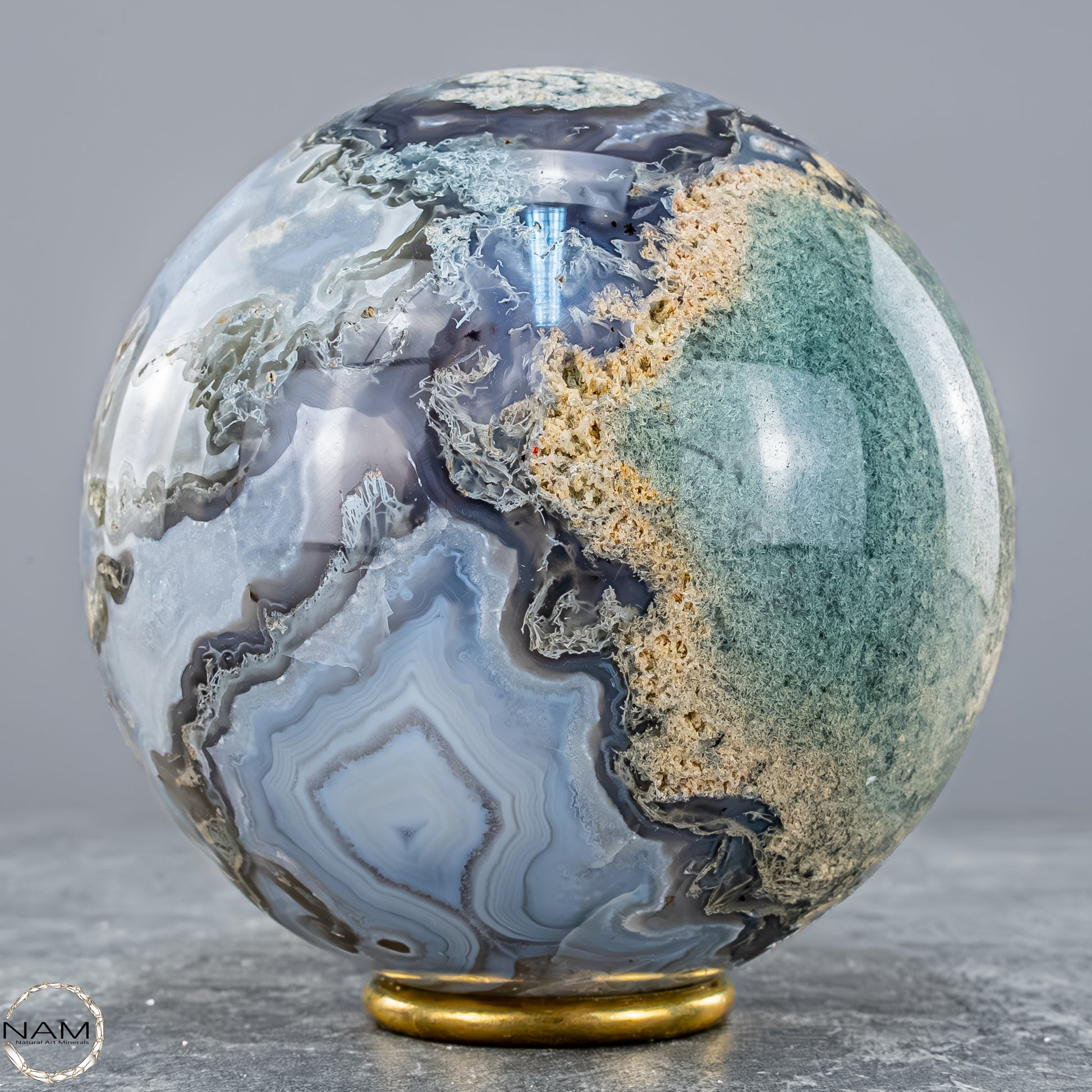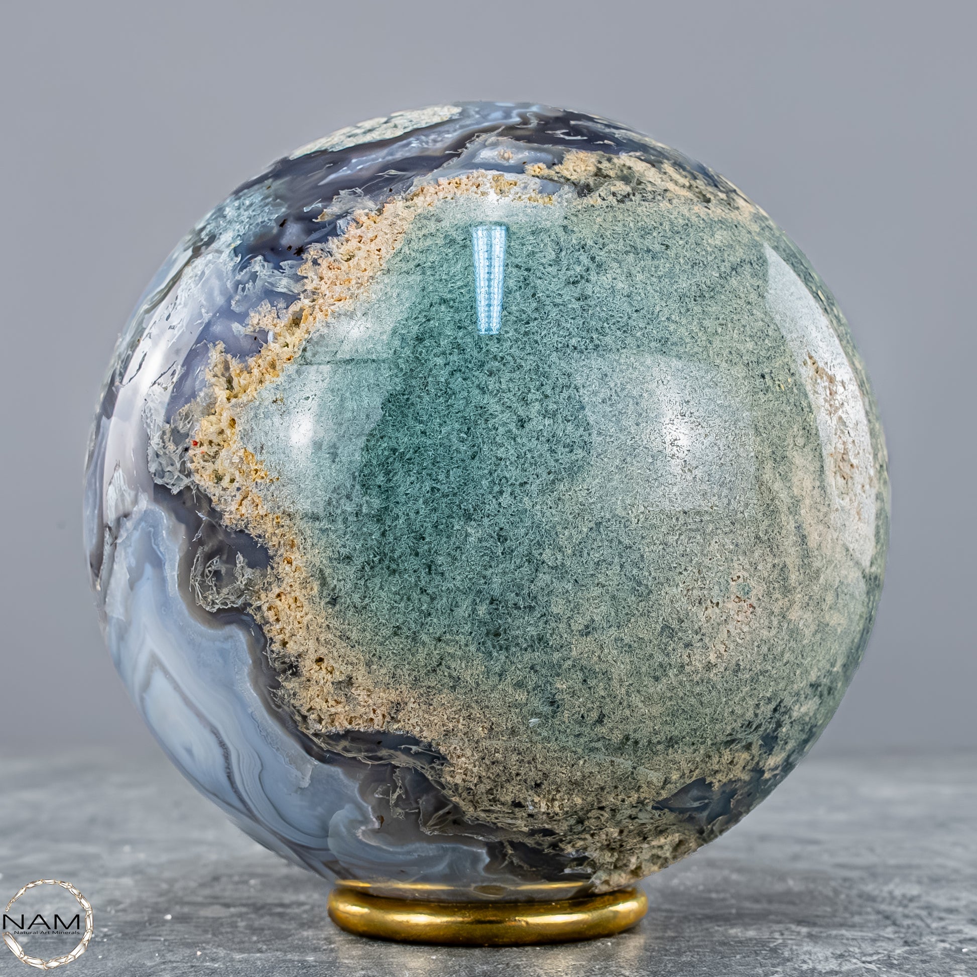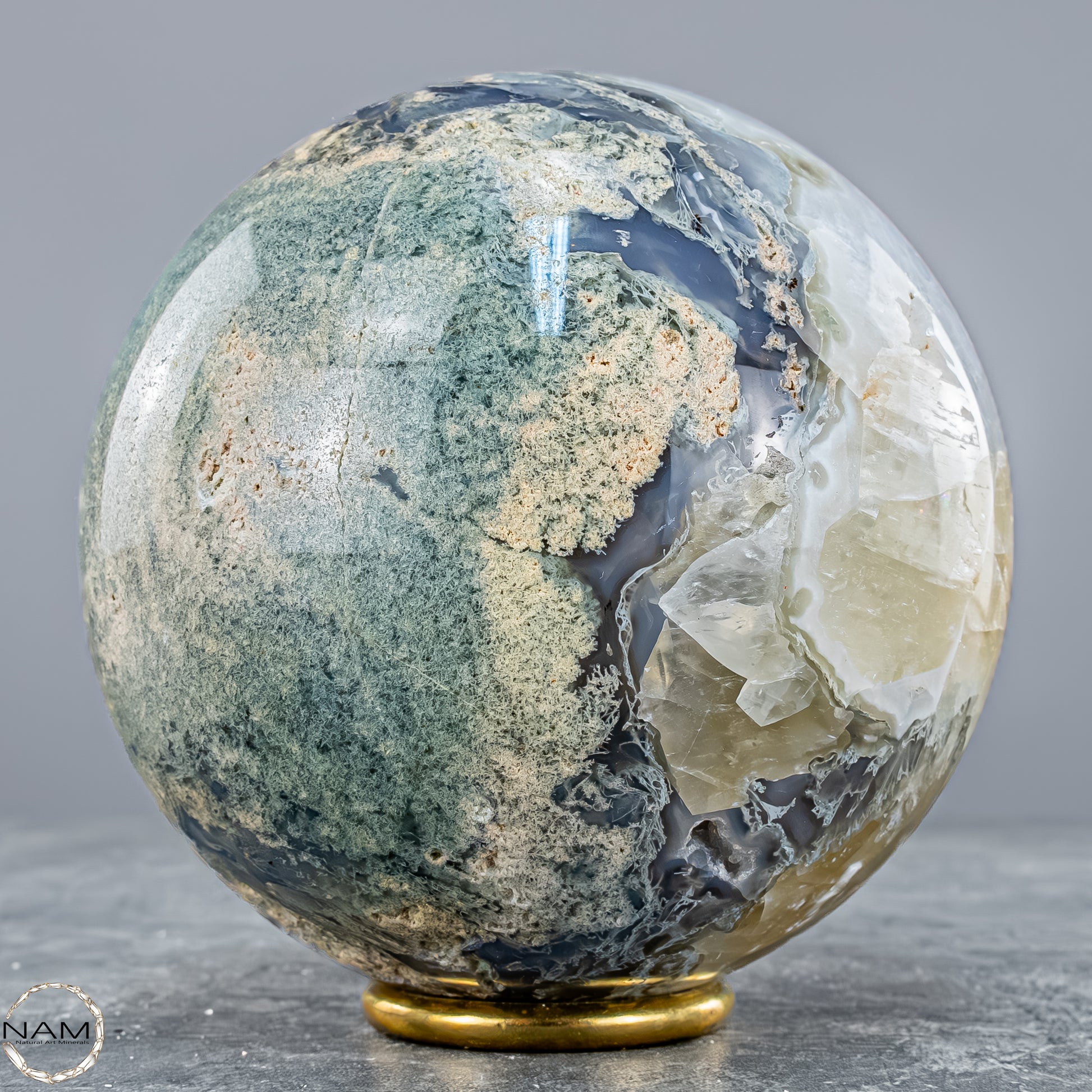 Eine einzigartige Kugel, der aus einem wunderschönen Kristall aus Moose-Achat geschnitzt ist, genannt Agata Sakura, was auf Japanisch 'Kirschblüten' bedeutet. Er zeichnet sich durch große Quarzkristalle mit einem grünlichen Ton und Achat-Einschlüssen im Inneren aus. Diese Formation ist nicht sehr häufig, besonders nicht in grünem Ton. Der Achat im Inneren hat zentrale weiße Punkte, umgeben von einer dunkleren, fast transparenten schwarzen Färbung. Eine weitere Eigenschaft dieses Kristallturms ist das Vorhandensein mehrerer Geoden, die Einblicke in die innere Kristallisation ermöglichen und einen faszinierenden visuellen Kontrast erzeugen.